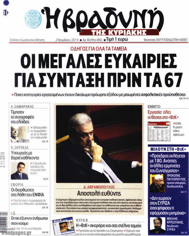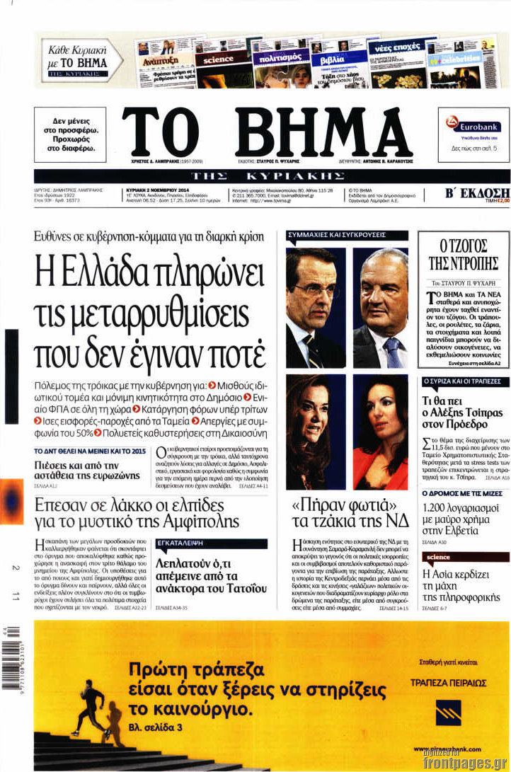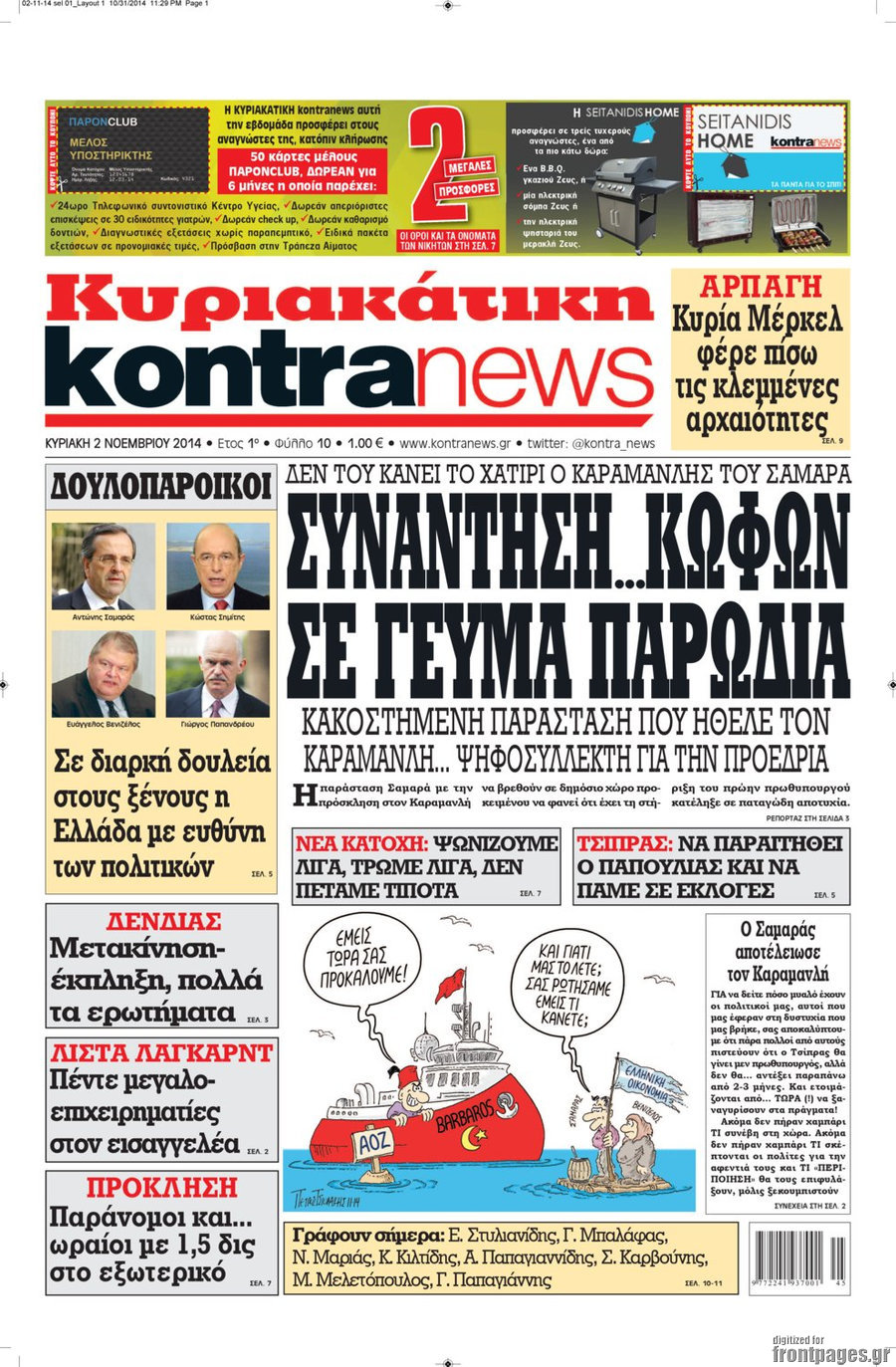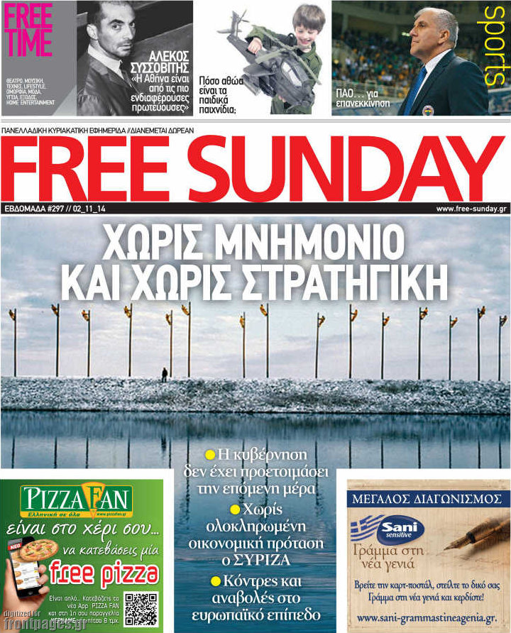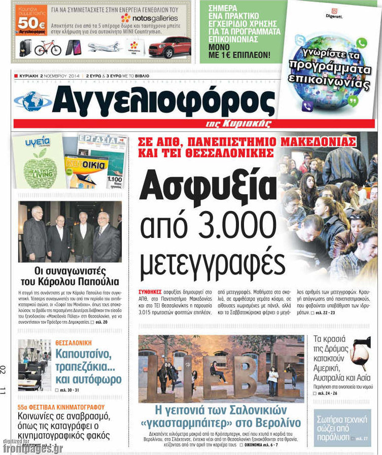 Οι πολιτικές εφημερίδες Enikos Newsroom 07:46, Κυριακή 02 Νοεμβρίου 2014 Media Οι πολιτικές εφημερίδες Διαβάστε τα πρωτοσέλιδα των πολιτικών εφημερίδων. ΠΟΛΙΤΙΚΕΣ ΕΦΗΜΕΡΙΔΕΣ ΠΡΩΤΟΣΕΛΙΔΑ Μοιράσου το: σχολίασε κι εσύ (0 σχόλια) Ακολουθήστε το enikos.gr στο Google News και μάθετε πρώτοι όλες τις ειδήσεις Δείτε όλες τις τελευταίες ειδήσεις από την Ελλάδα και τον Κόσμο στο enikos.gr Ειδήσεις Ροή Ειδήσεων 4 ώρες πριν Χριστούγεννα στα μπλόκα: Επιμένουν στις κινητοποιήσεις τους οι αγρότες – Ανοίγουν τα διόδια το Σαββατοκύριακο 4 ώρες πριν Ουκρανία: Η άνευ προηγουμένου επίθεση σε ρωσικό τάνκερ στη Μεσόγειο και το μήνυμα προς στον Πούτιν – Το «μακρύ χέρι» του Κιέβου 3 ώρες πριν Πούτιν: Τα μηνύματα σε Ευρώπη και ΝΑΤΟ από το μαραθώνιο «σόου» του – Η απαίτηση για «σεβασμό» και η ειρήνη «με τους όρους» της Μόσχας 4 ώρες πριν Τραμπ: Δεν αποκλείει την πιθανότητα ενός πολέμου στη Βενεζουέλα – «Ο Μαδούρο ξέρει καλύτερα από τον καθένα τι ακριβώς θέλω» 5 ώρες πριν Συνεχίζει να προκαλεί ο Μίτσκοσκι: «Για μένα το όνομα Μακεδονία είναι ιερό» 3 ώρες πριν Ανακαλύφθηκαν αρχαία χρυσά νομίσματα 2.200 ετών που απεικονίζουν τον θεό Απόλλωνα – Η άγνωστη σύνδεση με τον Φίλιππο Β΄ της Μακεδονίας 4 ώρες πριν Ύπνος: Μια κρυφή κατάσταση του εγκεφάλου πριν από τον ύπνο μπορεί να είναι το “κλειδί” για υψηλή ευφυΐα και δημιουργικότητα 5 ώρες πριν Αριθμολογία: Οι άνθρωποι που έχουν γεννηθεί αυτές τις 4 ημερομηνίες, συχνά παρεξηγούνται – «Η καλοσύνη τους κρύβει τεράστια δύναμη» 6 ώρες πριν Ξεχάστε το καθάρισμα το Σαββατοκύριακο: Ο «κανόνας των 20 λεπτών» που θα σας λύσει τα χέρια 39 δευτερόλεπτα πριν Εξάρχεια: Ένταση με μολότοφ, χημικά και κρότου λάμψης 16 λεπτά πριν ΗΠΑ: Τραγωδία στην Αλαμπάμα – Σκότωσε την δημοσιογράφο σύζυγό του και αυτοκτόνησε μπροστά στον 3χρονο γιο τους 31 λεπτά πριν Πρόταση γάμου στο ΣΕΦ κατά την διάρκεια του αγώνα Ολυμπιακός-Βιλερμπάν – Δείτε βίντεο 46 λεπτά πριν Euroleague: Επέστρεψε στις νίκες ο Ολυμπιακός, πήρε την ματσάρα της χρονιάς η Μπάρτσα – Τα αποτελέσματα και η βαθμολογία 1 ώρα πριν Συρία: Μαζικά πλήγματα των ΗΠΑ σε θέσεις του Ισλαμικού Κράτους – Χέγκσεθ: «Δεν είναι αρχή πολέμου, είναι μια δήλωση εκδίκησης» για το θάνατο των στρατιωτών μας ENIKOS NETWORK Το ΕΚΑΒ τιμήθηκε από την Ακαδημία Αθηνών για τα 40 χρόνια προσφοράς του Έχετε πραγματικά μεγάλη καρδιά; 10 χαρακτηριστικά όσων έχουν καλοσύνη Αναστολή μέτρων αναγκαστικής εκτέλεσης για κτηνοτρόφους που πλήττονται από την ευλογιά των αιγοπροβάτων Πλήρης επάρκεια προϊόντων στις λαϊκές της Αττικής, παρά τις αγροτικές κινητοποιήσεις – Τι απαντούν οι πωλητές Χαρτογραφώντας το «σημείο χωρίς επιστροφή»: Για πρώτη φορά αποκαλύπτεται με λεπτομέρεια το ακανθώδες όριο της ατμόσφαιρας τ... Η Google καταργεί τη λειτουργία «dark web report» – Πώς θα μπορούν οι χρήστες να διαγράφουν τα δεδομένα τους περισσότερα 22:42 , Παρασκευή 19 Δεκεμβρίου 2025 Γιώργος Γιαννόπουλος για “Το σόι σου”: “Είναι ευτυχία και ευλογία αυτή η σειρά” «Είναι ευτυχία και ευλογία η συγκυρία αυτής της σειράς», θα πει ο Γιώργος Γιαννόπουλος -ο αγαπ... 20:37 , Παρασκευή 19 Δεκεμβρίου 2025 Don’t Forget The Lyrics: Η Έλλη Κοκκίνου υποδέχεται 4 παίκτες που θα κάνουν τα πάντα για να μη χάσουν ούτε… μισή λέξη από τους στίχους Το «Don’t Forget The Lyrics» επιστρέφει απόψε, Παρασκευή 19 Δεκεμβρίου, στις 21:00 με νέο επει... 19:31 , Παρασκευή 19 Δεκεμβρίου 2025 GNTM: Απόψε ο μεγάλος τελικός για τους 4 φιναλίστ Έπειτα από μήνες γεμάτους μό