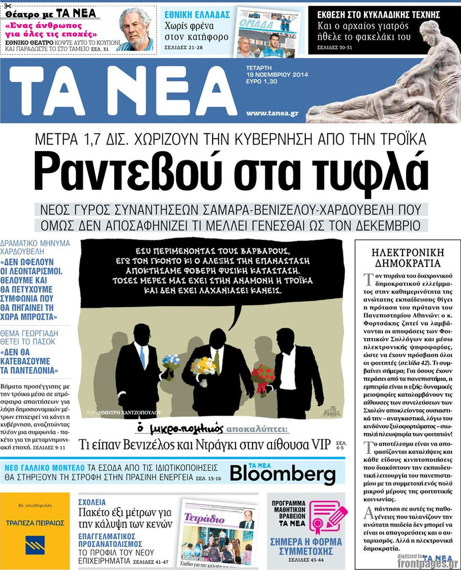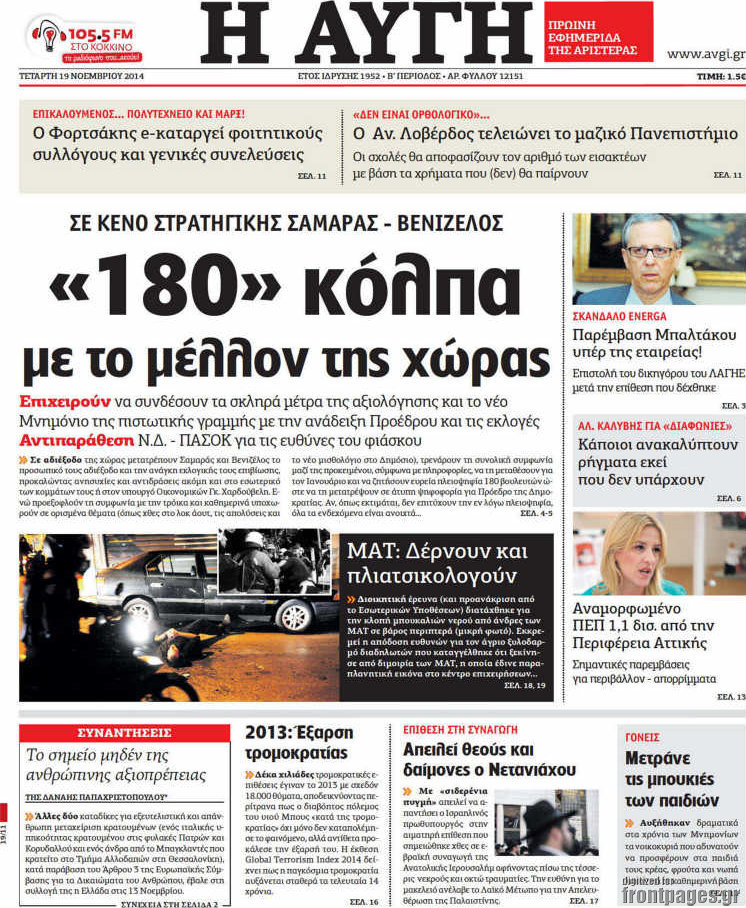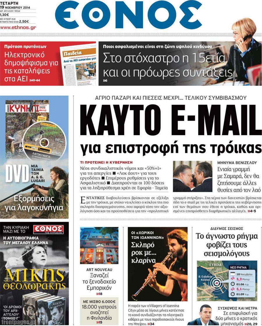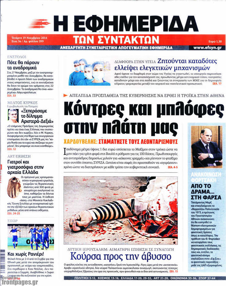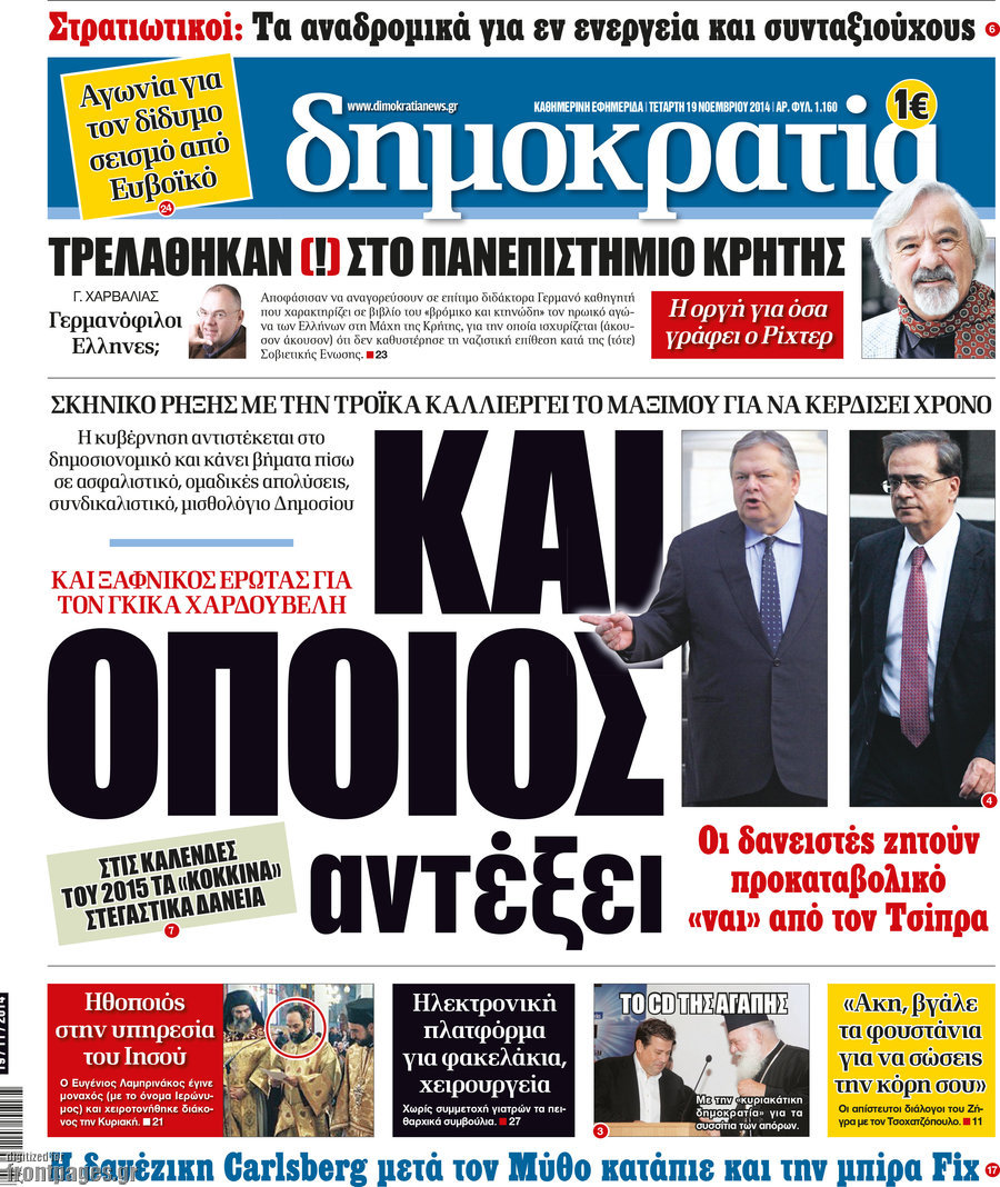 Οι πολιτικές εφημερίδες Enikos Newsroom 07:48, Τετάρτη 19 Νοεμβρίου 2014 Media Οι πολιτικές εφημερίδες Διαβάστε τα πρωτοσέλιδα των πολιτικών εφημερίδων: ΠΟΛΙΤΙΚΕΣ ΕΦΗΜΕΡΙΔΕΣ ΠΡΩΤΟΣΕΛΙΔΑ Μοιράσου το: σχολίασε κι εσύ (0 σχόλια) Ακολουθήστε το enikos.gr στο Google News και μάθετε πρώτοι όλες τις ειδήσεις Δείτε όλες τις τελευταίες ειδήσεις από την Ελλάδα και τον Κόσμο στο enikos.gr Ειδήσεις Ροή Ειδήσεων 2 ώρες πριν Κυριάκος Μητσοτάκης: «Κάποιοι αγρότες δεν αισθάνονται την ανάγκη να διαφωνήσουν με τις προτάσεις της κυβέρνησης, η Ευρώπη στέκεται στο πλευρό της Ουκρανίας» 7 ώρες πριν ΟΠΕΚΕΠΕ: Προφυλακιστέος ο φερόμενος αρχηγός και ο λογιστής της εγκληματικής οργάνωσης 8 ώρες πριν Αυξάνουν την πίεση προς την κυβέρνηση οι αγρότες: Κλείνουν παρακαμπτήριους και ανοίγουν διόδια – Τι θα γίνει τις γιορτές 8 ώρες πριν Φοινικούντα: Το Σάββατο απολογείται ο 30χρονος γιος γνωστού επιχειρηματία της Πλάκας που παραδόθηκε – Όσα είπε στους αστυνομικούς και ο ρόλος του στο έγκλημα 7 ώρες πριν ΑΕΚ – Κραϊόβα 3-2: Επική ανατροπή και πρόκριση στους «16» του Conference League η Ένωση 8 ώρες πριν Αρχαιολόγοι ανακάλυψαν ρωμαϊκά τεχνουργήματα από μια πόλη που δεν υπήρξε ποτέ – Τα τρία εντυπωσιακά κτίρια και ο αμφορέας με τις… σαρδέλες 9 ώρες πριν Ύπνος: Η απλή βραδινή ρουτίνα για να προστατεύσετε τα μαλλιά σας από το κρύο κατά τη διάρκεια του χειμώνα 10 ώρες πριν Manifesting: Πώς να συναντήσετε τον σύντροφο της ζωής σας, ανάλογα με τον μήνα γέννησής σας 2 ημέρες πριν 20 χρόνια τα Χριστούγεννα ξεκινούν στα Public με μεγάλη ποικιλία σε δώρα! 11 λεπτά πριν Φρίντριχ Μερτς: Χορήγηση άτοκου δανείου στην Ουκρανία συμφώνησαν τα κράτη – μέλη της ΕΕ 19 λεπτά πριν Απειλή για το Προϋπολογισμό τα ληξιπρόθεσμα χρέη των ιδιωτών προς την εφορία 19 λεπτά πριν Πέντε νεκροί σε πλήγματα των ΗΠΑ κατά δύο σκαφών που φέρεται να μετέφεραν ναρκωτικά στον Ανατολικό Ειρηνικό 27 λεπτά πριν ΕΥΔΑΠ: Αλλάζουν τα τιμολόγια του νερού 35 λεπτά πριν Οπτική ψευδαίσθηση: Μόνο αν έχεις αετίσια ματιά θα βρεις τον παπαγάλο σε 12 δευτερόλεπτα ENIKOS NETWORK Σε περίοδο αυξημένης δραστηριότητας η γρίπη στην Ελλάδα-Μέτρα προστασίας από τον ΕΟΔΥ Σκέφτεστε συνέχεια συζητήσεις που έχετε κάνει; Τι σημαίνει αυτό, σύμφωνα με ειδικό Στεγαστικό: Τι λέει η ΠΟΜΙΔΑ για τα νέα μέτρα που ανακοίνωσε ο Κυριάκος Μητσοτάκης Λαγκάρντ: Αισιόδοξη για την ανάπτυξη της Ευρωζώνης, αβέβαιη για τον πληθωρισμό Χαρτογραφώντας το «σημείο χωρίς επιστροφή»: Για πρώτη φορά αποκαλύπτεται με λεπτομέρεια το ακανθώδες όριο της ατμόσφαιρας τ... Η Google καταργεί τη λειτουργία «dark web report» – Πώς θα μπορούν οι χρήστες να διαγράφουν τα δεδομένα τους περισσότερα 05:48 , Παρασκευή 19 Δεκεμβρίου 2025 Οι οικονομικές εφημερίδες 19/12/2025 Διαβάστε τα πρωτοσέλιδα από τις οικονομικές εφημερίδες, σήμερα 19/12/2025. 05:43 , Παρασκευή 19 Δεκεμβρίου 2025 Οι αθλητικές εφημερίδες 19/12/2025 Διαβάστε τα πρωτοσέλιδα από τις αθλητικές εφημερίδες, σήμερα 19/12/2025. 05:38 , Παρασκευή 19 Δεκεμβρίου 2025 Οι πολιτικές εφημερίδες 19/12/2025 Διαβάστε τα πρωτοσέλιδα από τις πολιτικές εφημερίδες, σήμερα 19/12/2025. 02:50 , Παρασκευή 19 Δεκεμβρίου 2025 GNTM: «Κλείδωσαν» οι τέσσερις φιναλίστ – Μεγάλη ανατροπή στις τελευταίες αποχωρήσεις Για προτελευταία φορά εμφανίστηκαν στο πλατό του GNTM οι φιναλίστ του φετινού κύκλου, το βράδυ... ΤΕΛΕΥΤΑΙΕΣ ΕΙΔΗΣΕΙΣ 11 λεπτά πριν Φρίντριχ Μερτς: Χορήγηση άτοκου δανείου στην Ουκρανία... 19 λεπτά πριν Απειλή για το Προϋπολογισμό τα ληξιπρόθεσμα χρέη τω