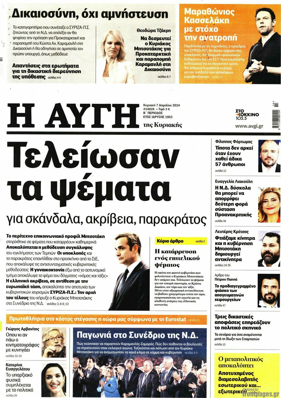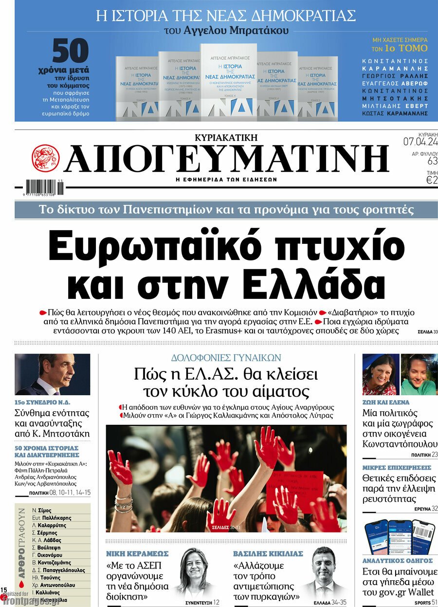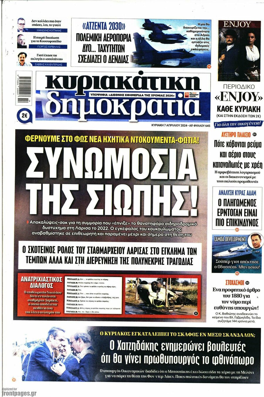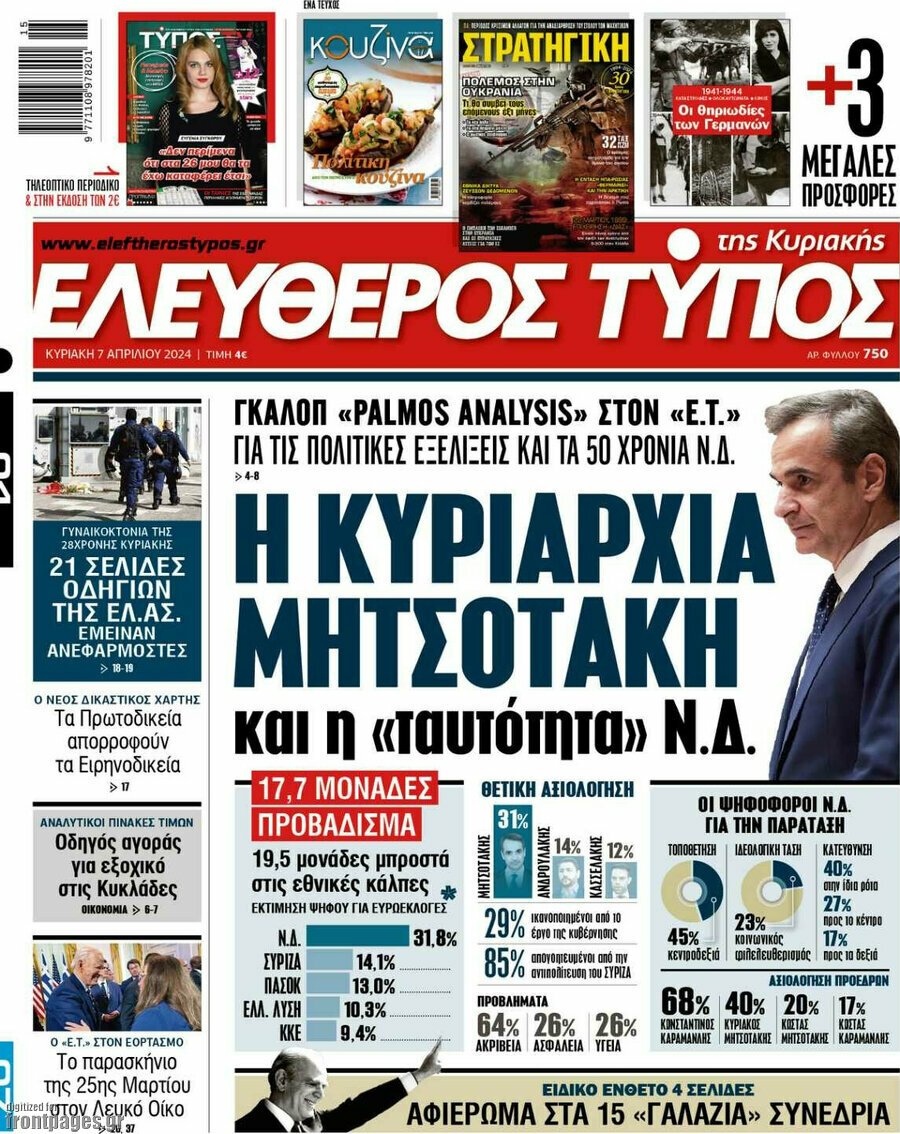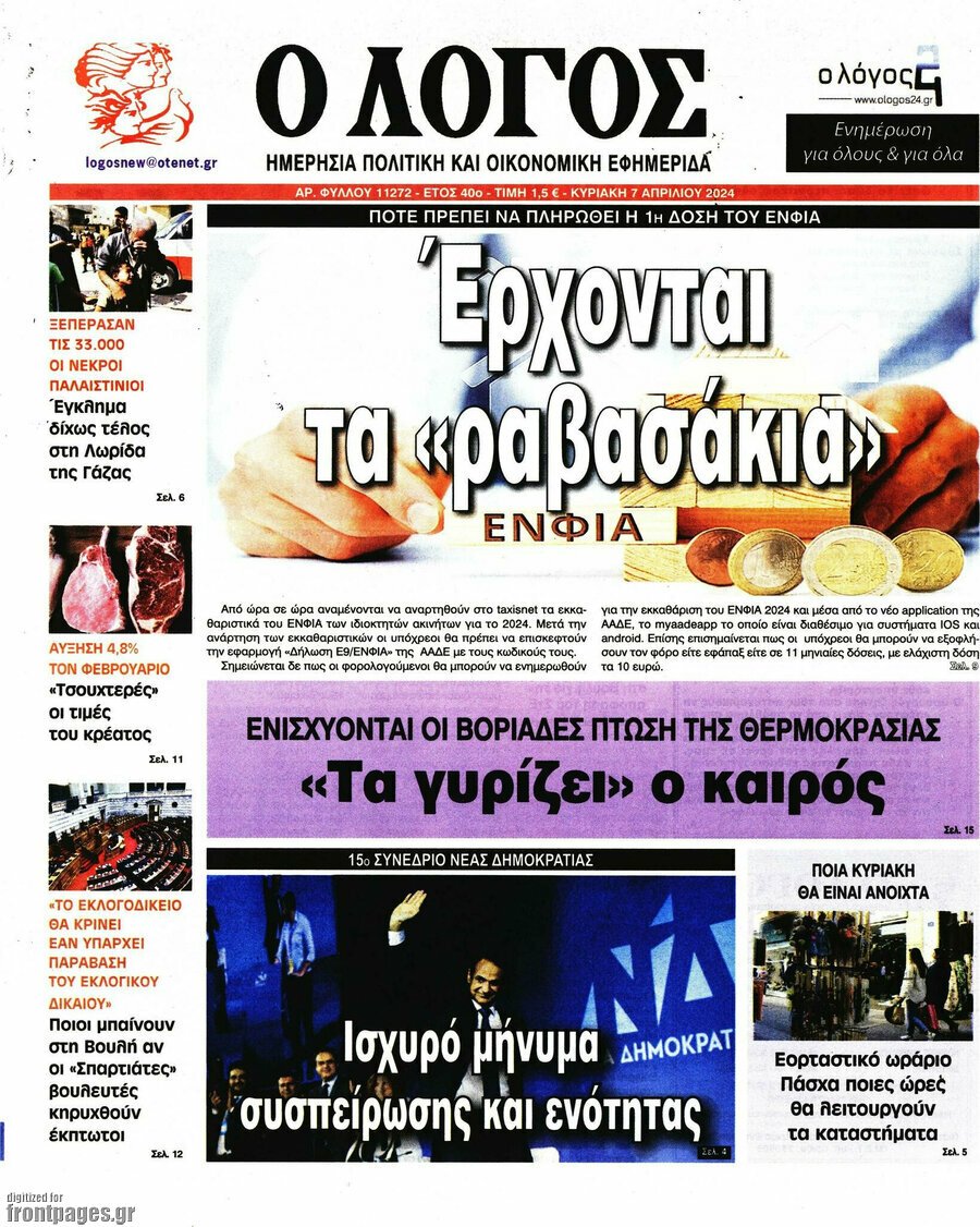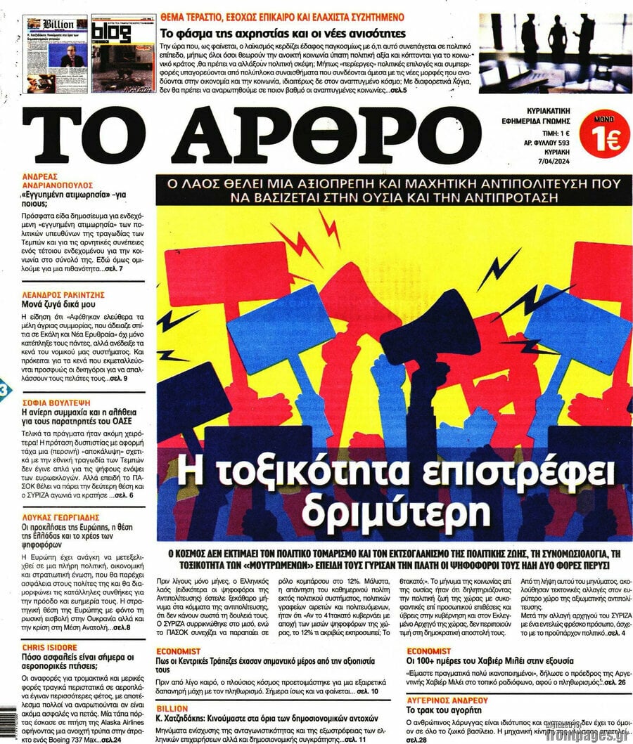 Οι πολιτικές εφημερίδες 7/4/2024 xrisikakif 06:40, Κυριακή 07 Απριλίου 2024 Media Διαβάστε τα πρωτοσέλιδα από τις πολιτικές εφημερίδες , σήμερα 7/4/2024. ΕΦΗΜΕΡΙΔΕΣ ΠΟΛΙΤΙΚΕΣ ΕΦΗΜΕΡΙΔΕΣ ΠΡΩΤΟΣΕΛΙΔΑ Μοιράσου το: σχολίασε κι εσύ (0 σχόλια) Ακολουθήστε το enikos.gr στο Google News και μάθετε πρώτοι όλες τις ειδήσεις Δείτε όλες τις τελευταίες ειδήσεις από την Ελλάδα και τον Κόσμο στο enikos.gr Ειδήσεις Ροή Ειδήσεων 3 ώρες πριν «Τεστ» υπομονής η χριστουγεννιάτικη έξοδος: Οι ουρές χιλιομέτρων και η απόφαση να ανοίξουν επιπλέον λωρίδες – Εν αναμονή των επόμενων κινήσεων των αγροτών 2 ώρες πριν Τραγωδία στην Τουρκία: Νεκρός ο αρχηγός του Γενικού Επιτελείου της Λιβύης – Συνετρίβη λίγο μετά την απογείωση το ιδιωτικό τζετ που τον μετέφερε – ΦΩΤΟ και ΒΙΝΤΕΟ 3 ώρες πριν Θάνατος 3χρονου στην Αλεξανδρούπολη: «Το παιδί είχε φάει το προηγούμενο βράδυ» υποστηρίζει η μητέρα του – Στο νοσοκομείο τα αδελφάκια του 3 ώρες πριν Σύλληψη 35χρονου στα Καλύβια: Πιθανή σχέση του με τον σεσημασμένο 37χρονο Κρητικό αναζητούν οι Αρχές – Τα συμβόλαια θανάτου και το σενάριο για νέο χτύπημα 6 ώρες πριν Ιλίσια: Διασωληνωμένος και σε σοβαρή κατάσταση ο συντηρητής του ασανσέρ – Πώς έγινε το ατύχημα στο σούπερ μάρκετ 3 ώρες πριν Ανακαλύφθηκε τεράστιος κυκλικός λαβύρινθος που «οδηγεί» στην… Αρχαία Ρώμη – Τα ευρήματα με «άρωμα« Κρήτης 4 ώρες πριν Ύπνος: Ειδικός μοιράζεται 6 απλές συνήθειες που θα σας βοηθήσουν να κοιμάστε πιο γρήγορα κάθε βράδυ 5 ώρες πριν Αριθμολογία: Οι άνθρωποι με αυτές τις 4 ημερομηνίες γέννησης, διαθέτουν ένα σπάνιο χάρισμα -«Διαβάζουν τις ψυχές των άλλων» 16 ώρες πριν Η Coca-Cola και ο Ελληνικός Ερυθρός Σταυρός μαζί αυτά τα Χριστούγεννα: Μια μεγάλη αγκαλιά για τους συνανθρώπους μας που έχουν ανάγκη 10 λεπτά πριν Λιόν: Ανακοινώθηκε ο δανεισμός του Έντρικ από την Ρεάλ Μαδρίτης 24 λεπτά πριν ΗΠΑ: Εντολές εκκένωσης σε περιοχές του Λος Άντζελες ενόψει καταιγίδας που ενδέχεται να προκαλέσει σαρωτικές πλημμύρες 40 λεπτά πριν Γκιμαράες – Σπόρτινγκ Λισαβόνας 1-4: Νίκη με σούπερ Ιωαννίδη – ΒΙΝΤΕΟ 1 ώρα πριν Αρχεία Επστάιν: «Ψεύτικη η κάρτα προς τον καταδικασμένο παιδεραστή Λάρι Νάσαρ» λέει το υπουργείο Δικαιοσύνης των ΗΠΑ 1 ώρα πριν ΟΠΕΚΕΠΕ: Νέα πληρωμή 25,3 εκατ. ευρώ σε 43.100 δικαιούχους ENIKOS NETWORK Πώς μας επηρεάζει η Χριστουγεννιάτικη μουσική; Τι μπορεί να σημαίνει αν δεν σας αρέσει Συμβουλές για να αποφευχθούν παιδικά ατυχήματα τα Χριστούγεννα Εορταστικό ωράριο: Ανοιχτά τα καταστήματα την τελευταία Κυριακή του χρόνου Αυξήσεις στις συντάξεις: Πόσα θα κερδίσετε από τον Ιανουάριο Ο Google Assistant θα παραμείνει λίγο περισσότερο για ορισμένους χρήστες Android Τεστ προσωπικότητας: Το βάζο που θα επιλέξετε αποκαλύπτει πώς λύνετε προβλήματα στη ζωή σας περισσότερα 23:21 , Τρίτη 23 Δεκεμβρίου 2025 Παρά Πέντε: Συγκίνηση και ενθουσιασμός στο «X» με το reunion – «Σαν να μην πέρασε μια μέρα…» Το «Παρά Πέντε» επέστρεψε το βράδυ της Τρίτης (23/12) με ένα επετειακό επεισόδιο. Η θρυλική σε... 23:12 , Τρίτη 23 Δεκεμβρίου 2025 Ο Χριστουγεννιάτικος Τηλεμαραθώνιος του ΑΝΤ1 συγκέντρωσε 3.330.000 ευρώ και θα στηρίξει 300.000 παιδιά Με μεγάλη επιτυχία, πραγματοποιήθηκε τη Δευτέρα 22 Δεκεμβρίου ο Χριστουγεννιάτικος Τηλεμαραθών... 22:25 , Τρίτη 23 Δεκεμβρίου 2025 Παρά Πέντε – Σμαράγδα Καρύδη: «Αυτή η σειρά έμεινε αγέραστη – Παιδιά που είναι 10 ετών, νομίζουν ότι το κάναμε τώρα» Τον Ιούνιο του 2007, έπειτα από δύο κύκλους, υψηλά νούμερα τηλεθέασης και 49 απολαυστικά επεισ... 
