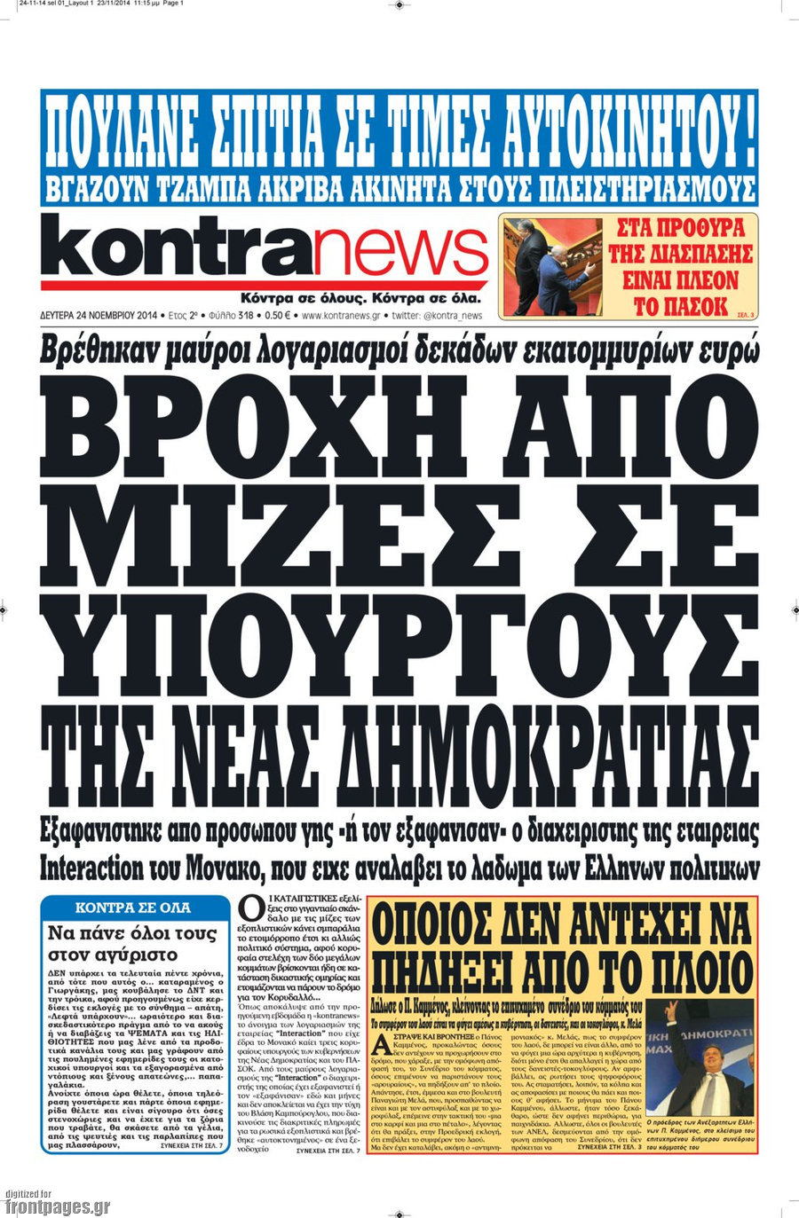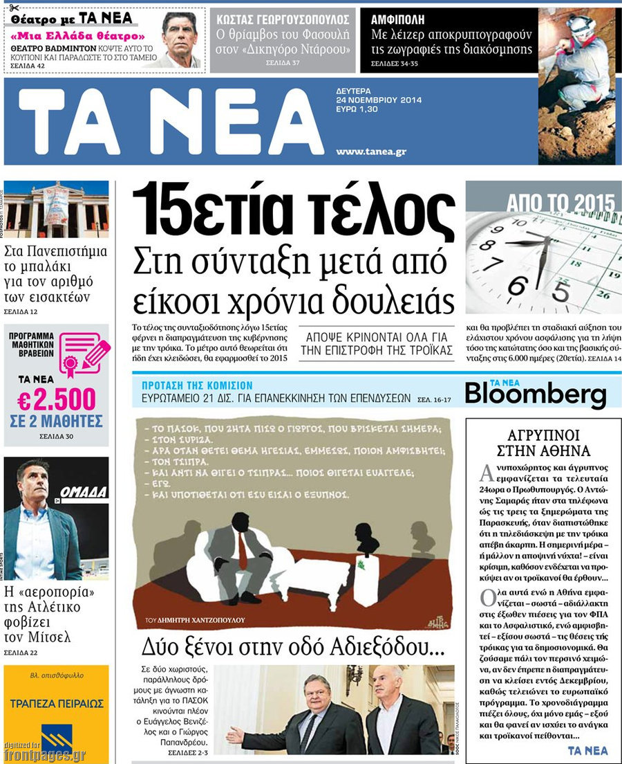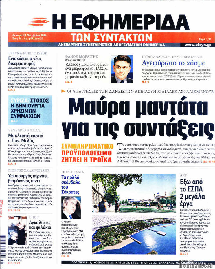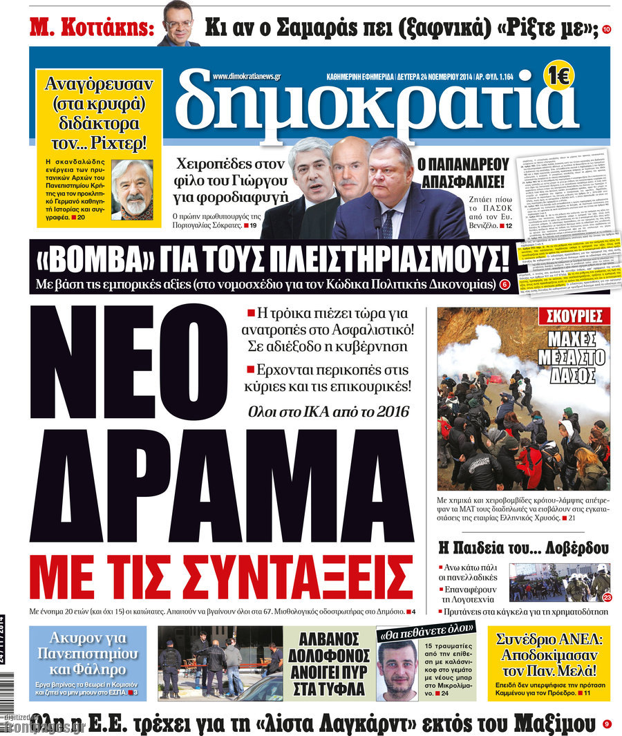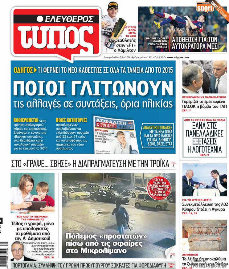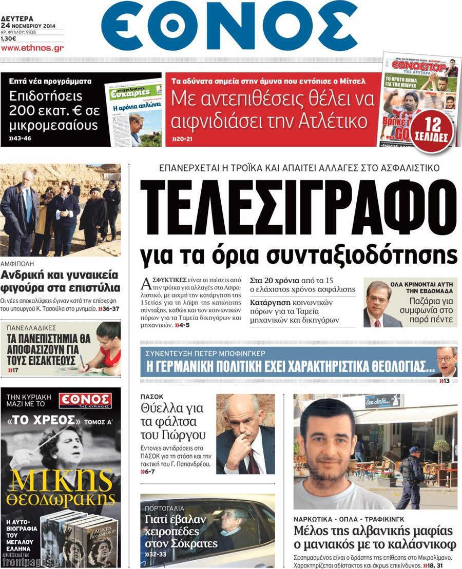 Οι πολιτικές εφημερίδες Enikos Newsroom 07:54, Δευτέρα 24 Νοεμβρίου 2014 Media Οι πολιτικές εφημερίδες Διαβάστε τα πρωτοσέλιδα των πολιτικών εφημερίδων: ΠΟΛΙΤΙΚΕΣ ΕΦΗΜΕΡΙΔΕΣ ΠΡΩΤΟΣΕΛΙΔΑ Μοιράσου το: σχολίασε κι εσύ (0 σχόλια) Ακολουθήστε το enikos.gr στο Google News και μάθετε πρώτοι όλες τις ειδήσεις Δείτε όλες τις τελευταίες ειδήσεις από την Ελλάδα και τον Κόσμο στο enikos.gr Ειδήσεις Ροή Ειδήσεων 1 ώρα πριν Γιορτές με μπλόκα για τους αγρότες: Ανοίγουν διόδια και μοιράζουν προϊόντα στους ταξιδιώτες 2 ώρες πριν Τα αρχεία του Έπσταϊν αποκαλύπτουν φωτογραφία του έκπτωτου πρίγκιπα Άντριου – Είναι ξαπλωμένος στην αγκαλιά 5 γυναικών 52 λεπτά πριν Νέες ταυτότητες: Μεγάλη αναμονή για ραντεβού στην Αττική – Τέλος τα ταξίδια εκτός Ελλάδος από τον Αύγουστο για όσους δεν έχουν αλλάξει 2 ώρες πριν Εξαφάνιση 33χρονου γιατρού στην Κρήτη: «Άναψα τα φώτα, τρόμαξε και άρχισε να τρέχει στα χωράφια» – Η τελευταία διαδρομή και η μαρτυρία «κλειδί» 3 ώρες πριν Ο «χάρτης» με τις αυξήσεις και τις φοροελαφρύνσεις του 2026 – Ποιοι και πόσα κερδίζουν 2 ώρες πριν Μία νέα «χρυσή» περίοδος αρχίζει για 3 ζώδια από σήμερα – «Μία αναπάντεχη ευκαιρία οδηγεί στην επιτυχία» 6 ώρες πριν Αυγά: Πόσα μπορείτε να τρώτε την ημέρα με ασφάλεια για μέγιστη πρόσληψη πρωτεΐνης 4 ώρες πριν Αρχαιολόγοι ανακάλυψαν σε χωράφι απεικόνιση 600 ετών ενός Αγίου – Τα στοιχεία που δείχνουν ότι μαρτύρησε 3 ώρες πριν Αγχώνεται για το χριστουγεννιάτικο δώρο που πήρε στην πλούσια σύντροφό του – «Φοβάμαι πως θα το βρει φθηνιάρικο, φοράει βραχιόλια Cartier» 4 λεπτά πριν Ινδία: Επτά ελέφαντες σκοτώθηκαν κατά τη σύγκρουση επιβατικού τρένου με κοπάδι 12 λεπτά πριν Βούλα: Συνελήφθη 24χρονος με 69 κιλά ακατέργαστης κάνναβης – Κυκλοφορούσε με κλεμμένο αυτοκίνητο 21 λεπτά πριν «Η αγάπη δεν χάνεται ποτέ»: Η μικρού μήκους ταινία κινουμένων σχεδίων που θέτει ερωτήματα για τη ζωή και τον θάνατο 29 λεπτά πριν Στέφανος Παπαδόπουλος: Η συνέντευξη μετά τη μήνυση στον Γιώργο Μαζωνάκη – «Δεν θέλω να τα βρούμε εξωδικαστικά» 36 λεπτά πριν Τραγωδία στην άσφαλτο στα Χανιά: Νεκρός 37χρονος οδηγός ΙΧ – Τον βρήκαν ώρες μετά το τροχαίο ENIKOS NETWORK Είστε μόνιμα απρόσεκτοι; 3 σημάδια που δείχνουν ότι μπορεί να είναι σύμπτωμα πάθησης Πόσα κιλά παίρνουμε πραγματικά τα Χριστούγεννα, σύμφωνα με την επιστήμη – Πώς να το αποτρέψουμε; Χριστούγεννα και Πρωτοχρονιά: Πώς αμείβονται όσοι εργαστούν e-ΕΦΚΑ και ΔΥΠΑ: Έρχονται νέες πληρωμές έως τις 24 Δεκεμβρίου – Ποιοι πάνε ταμείο Χαρτογραφώντας το «σημείο χωρίς επιστροφή»: Για πρώτη φορά αποκαλύπτεται με λεπτομέρεια το ακανθώδες όριο της ατμόσφαιρας τ... Η Google καταργεί τη λειτουργία «dark web report» – Πώς θα μπορούν οι χρήστες να διαγράφουν τα δεδομένα τους περισσότερα 11:41 , Σάββατο 20 Δεκεμβρίου 2025 «Η αγάπη δεν χάνεται ποτέ»: Η μικρού μήκους ταινία κινουμένων σχεδίων που θέτει ερωτήματα για τη ζωή και τον θάνατο Ο θάνατος είναι ένα από τα πιο σκληρά θέματα που καλείται να διαχειριστεί κάποιος στη διάρκεια... 09:30 , Σάββατο 20 Δεκεμβρίου 2025 «Porto Leone: Στη γειτονιά με τα κόκκινα φανάρια» – Ο Χρόνης αποκαλύπτει στην Αλεξάνδρα το μυστικό για το παιδί της Λένας Η μεγάλη δραματική σειρά του Apha «Porto Leone: Στη γειτονιά με τα κόκκινα φανάρια» μας μεταφέ... 08:14 , Σάββατο 20 Δεκεμβρίου 2025 Τρομεροί γονείς: Η Μαρία Καβογιάννη εισβάλλει στο σπίτι της οικογένειας Στεφανίδη Όσα θα δούμε στο νέο διπλό επεισόδιο της σειράς «Τρομεροί γονείς», σήμερα Σάββατο 20 Δε