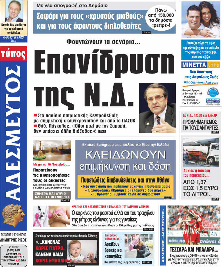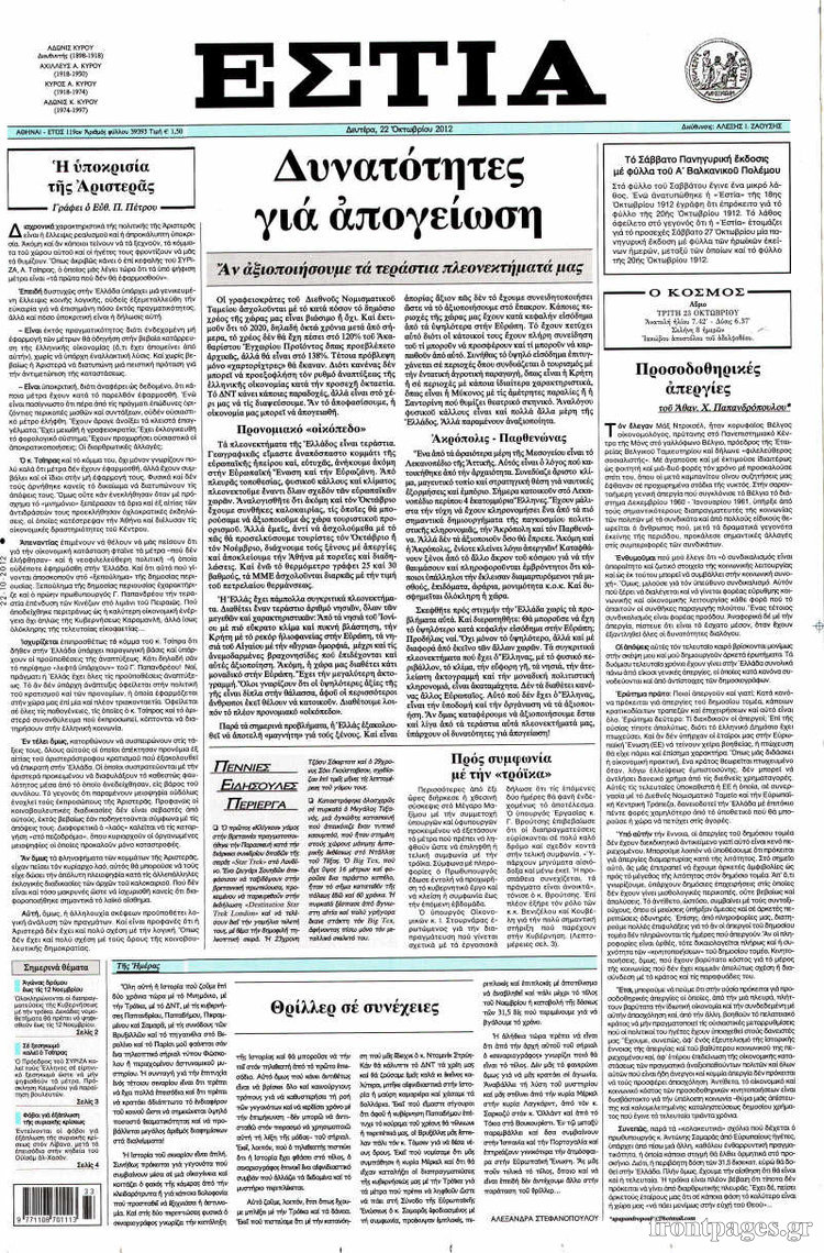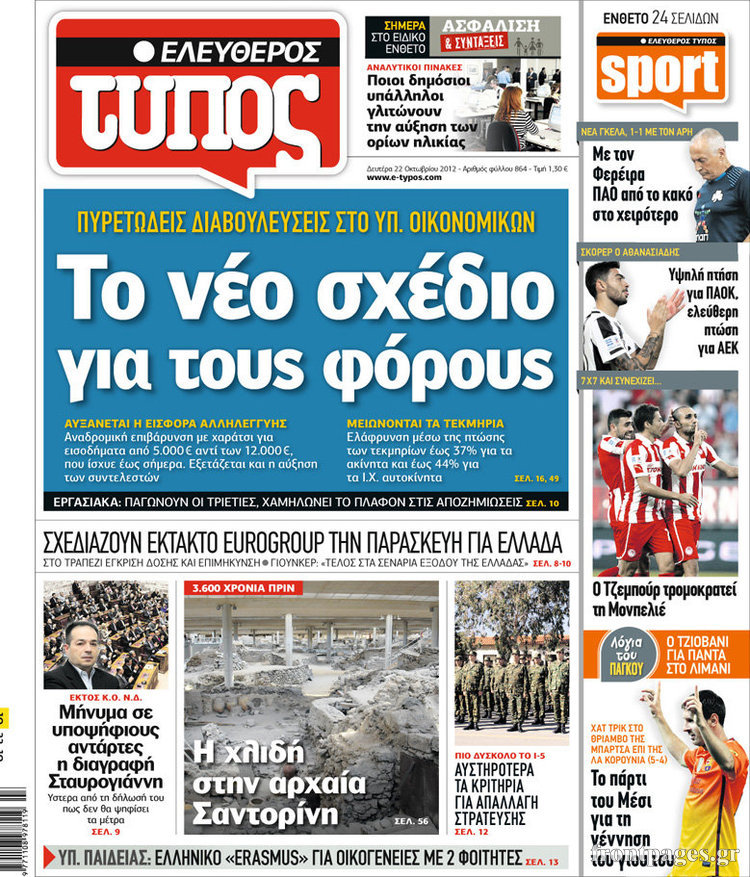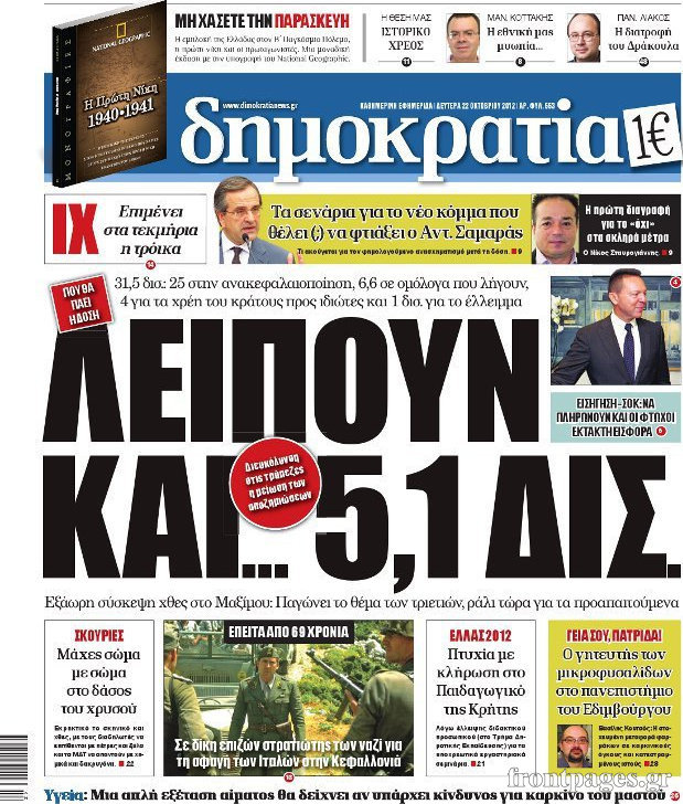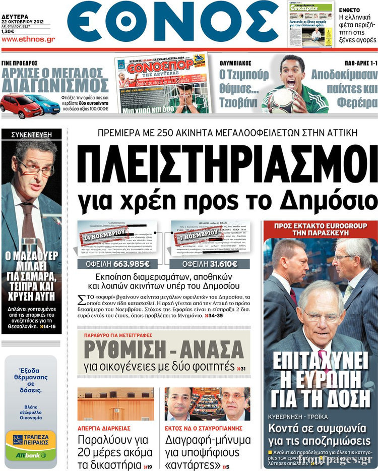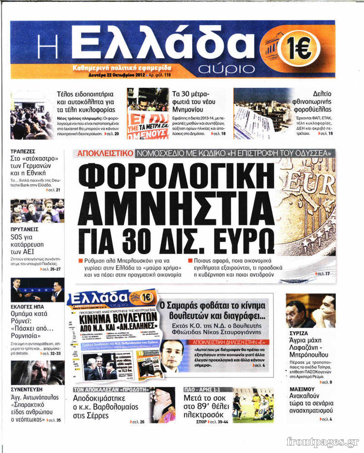 Οι πολιτικές εφημερίδες Enikos Newsroom 08:47, Δευτέρα 22 Οκτωβρίου 2012 Media Τα σημερινά πρωτοσέλιδα των πολιτικών εφημερίδων. ΕΦΗΜΕΡΙΔΕΣ ΠΟΛΙΤΙΚΕΣ ΕΦΗΜΕΡΙΔΕΣ ΠΟΛΙΤΙΚΗ ΠΡΩΤΟΣΕΛΙΔΑ Μοιράσου το: σχολίασε κι εσύ (0 σχόλια) Ακολουθήστε το enikos.gr στο Google News και μάθετε πρώτοι όλες τις ειδήσεις Δείτε όλες τις τελευταίες ειδήσεις από την Ελλάδα και τον Κόσμο στο enikos.gr Ειδήσεις Ροή Ειδήσεων 6 ώρες πριν Χριστούγεννα στα μπλόκα: Επιμένουν στις κινητοποιήσεις τους οι αγρότες – Ανοίγουν τα διόδια το Σαββατοκύριακο 7 ώρες πριν Ουκρανία: Η άνευ προηγουμένου επίθεση σε ρωσικό τάνκερ στη Μεσόγειο και το μήνυμα προς στον Πούτιν – Το «μακρύ χέρι» του Κιέβου 6 ώρες πριν Πούτιν: Τα μηνύματα σε Ευρώπη και ΝΑΤΟ από το μαραθώνιο «σόου» του – Η απαίτηση για «σεβασμό» και η ειρήνη «με τους όρους» της Μόσχας 7 ώρες πριν Τραμπ: Δεν αποκλείει την πιθανότητα ενός πολέμου στη Βενεζουέλα – «Ο Μαδούρο ξέρει καλύτερα από τον καθένα τι ακριβώς θέλω» 8 ώρες πριν Συνεχίζει να προκαλεί ο Μίτσκοσκι: «Για μένα το όνομα Μακεδονία είναι ιερό» 6 ώρες πριν Ανακαλύφθηκαν αρχαία χρυσά νομίσματα 2.200 ετών που απεικονίζουν τον θεό Απόλλωνα – Η άγνωστη σύνδεση με τον Φίλιππο Β΄ της Μακεδονίας 7 ώρες πριν Ύπνος: Μια κρυφή κατάσταση του εγκεφάλου πριν από τον ύπνο μπορεί να είναι το “κλειδί” για υψηλή ευφυΐα και δημιουργικότητα 8 ώρες πριν Αριθμολογία: Οι άνθρωποι που έχουν γεννηθεί αυτές τις 4 ημερομηνίες, συχνά παρεξηγούνται – «Η καλοσύνη τους κρύβει τεράστια δύναμη» 9 ώρες πριν Ξεχάστε το καθάρισμα το Σαββατοκύριακο: Ο «κανόνας των 20 λεπτών» που θα σας λύσει τα χέρια 13 λεπτά πριν Μοχάμεντ Σαλάχ: Ζήτησε «συγγνώμη» από τους συμπαίκτες του στη Λίβερπουλ για το ξέσπασμά του 28 λεπτά πριν Μάρκο Ρούμπιο: Ανθρωπιστική κατάπαυση του πυρός στο Σουδάν ζητά ο Αμερικανός υπουργός Εξωτερικών 43 λεπτά πριν Αγγελική Νικολούλη: Τα συλλυπητήρια για την απώλεια της Ειρήνης Μαρινάκη 57 λεπτά πριν Βολιβία: Μαζική διαδηλώσεις εναντίον της κατάργησης των επιδοτήσεων των τιμών των καυσίμων 1 ώρα πριν Φως στο Τούνελ: Έφτασε η ώρα της αλήθειας για την δολοφονία της χήρας του πρώην υπουργού στο Κολωνάκι ENIKOS NETWORK Το ΕΚΑΒ τιμήθηκε από την Ακαδημία Αθηνών για τα 40 χρόνια προσφοράς του Έχετε πραγματικά μεγάλη καρδιά; 10 χαρακτηριστικά όσων έχουν καλοσύνη Αναστολή μέτρων αναγκαστικής εκτέλεσης για κτηνοτρόφους που πλήττονται από την ευλογιά των αιγοπροβάτων Πλήρης επάρκεια προϊόντων στις λαϊκές της Αττικής, παρά τις αγροτικές κινητοποιήσεις – Τι απαντούν οι πωλητές Χαρτογραφώντας το «σημείο χωρίς επιστροφή»: Για πρώτη φορά αποκαλύπτεται με λεπτομέρεια το ακανθώδες όριο της ατμόσφαιρας τ... Η Google καταργεί τη λειτουργία «dark web report» – Πώς θα μπορούν οι χρήστες να διαγράφουν τα δεδομένα τους περισσότερα 04:20 , Σάββατο 20 Δεκεμβρίου 2025 Αγγελική Νικολούλη: Τα συλλυπητήρια για την απώλεια της Ειρήνης Μαρινάκη Τα συλληπητήρια στον πρόεδρο του Mega, τον Βαγγέλη Μαρινάκη, για την απώλεια της μητέρας του Ε... 02:50 , Σάββατο 20 Δεκεμβρίου 2025 GNTM: Η Ξένια Τσίρκοβα αναδείχθηκε μεγάλη νικήτρια και πήρε τις 50.000 ευρώ – Ποιος βρέθηκε σε απόσταση αναπνοής; Με φαντασμαγορικό τρόπο ολοκληρώθηκε το βράδυ της Παρασκευής ο μεγάλος τελικός του GNTM, μέσα ... 22:42 , Παρασκευή 19 Δεκεμβρίου 2025 Γιώργος Γιαννόπουλος για “Το σόι σου”: “Είναι ευτυχία και ευλογία αυτή η σειρά” «Είναι ευτυχία και ευλογία η συγκυρία αυτής της σειράς», θα πει ο Γιώργος Γιαννόπουλος -ο αγ
