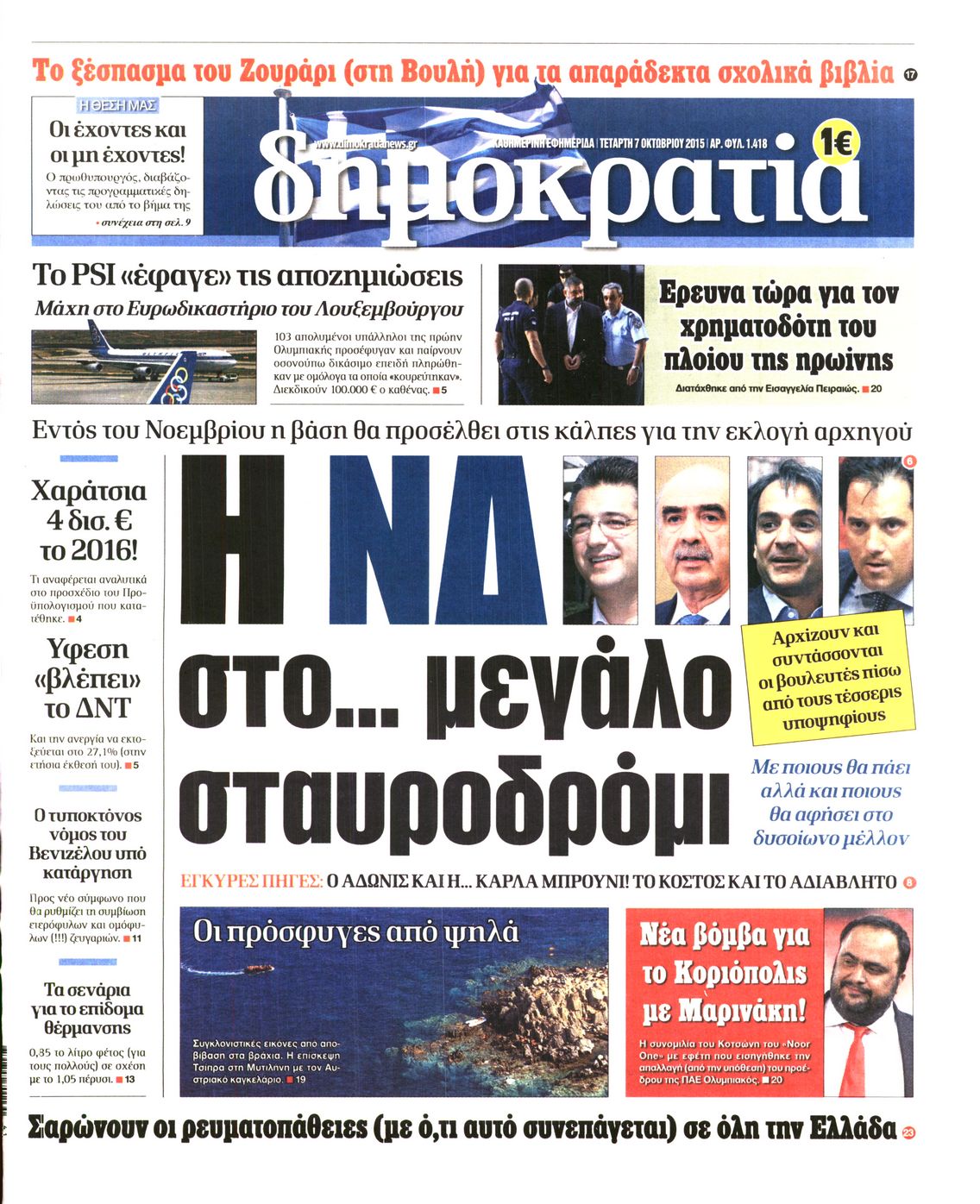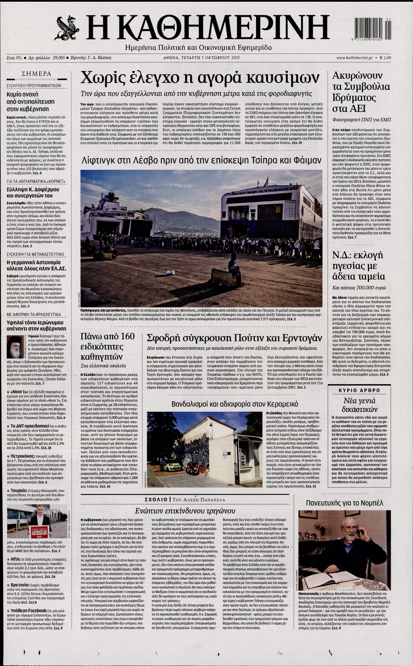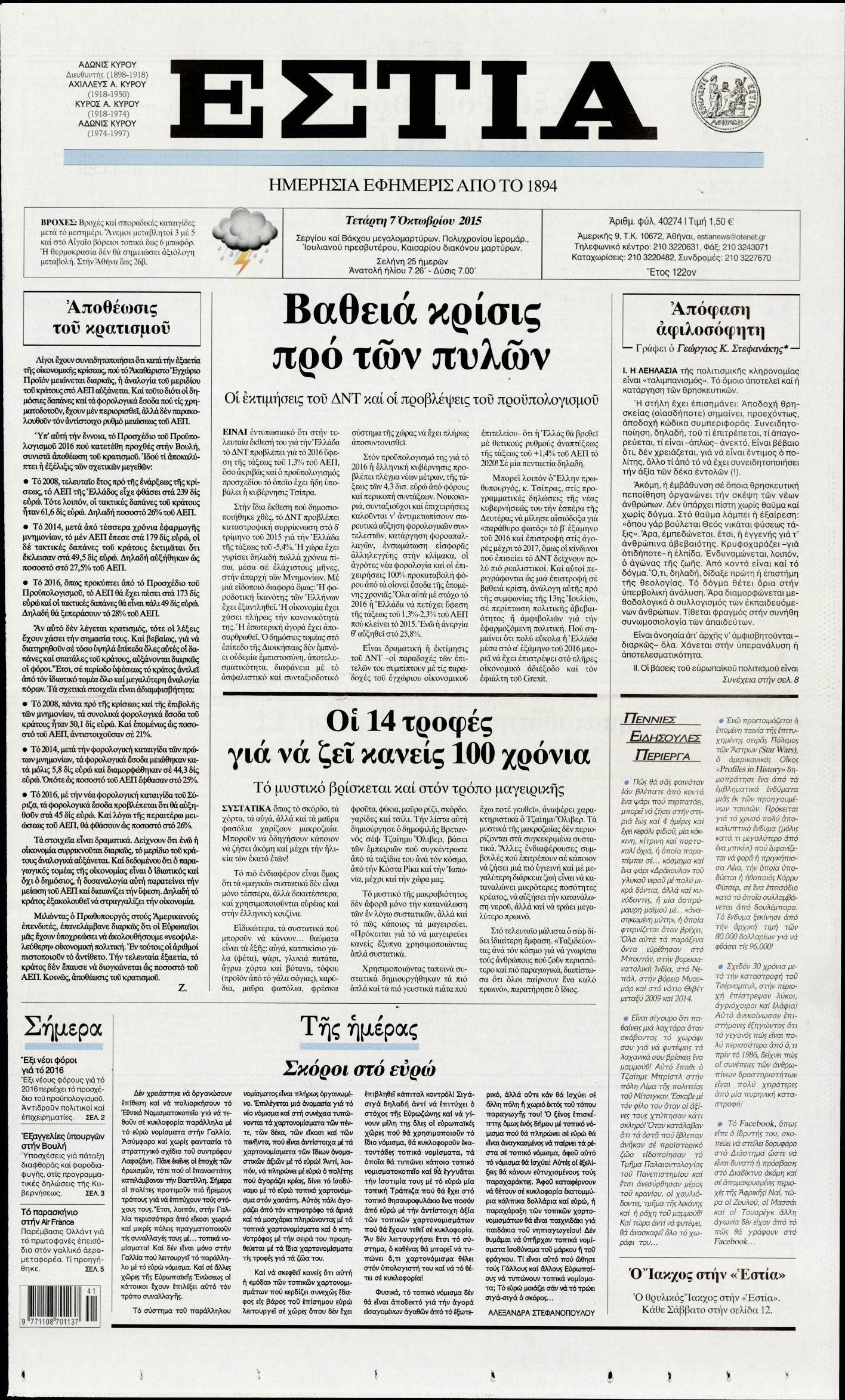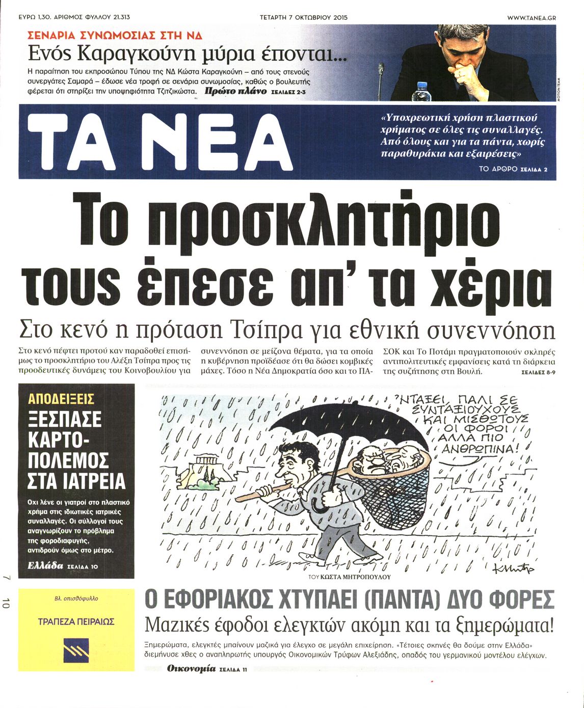 Οι πολιτικές εφημερίδες 7/10/2015 Enikos Newsroom 07:30, Τετάρτη 07 Οκτωβρίου 2015 Media Διαβάστε τα σημερινά πρωτοσέλιδα των πολιτικών εφημερίδων. ΠΟΛΙΤΙΚΕΣ ΕΦΗΜΕΡΙΔΕΣ ΠΡΩΤΟΣΕΛΙΔΑ Μοιράσου το: σχολίασε κι εσύ (0 σχόλια) Ακολουθήστε το enikos.gr στο Google News και μάθετε πρώτοι όλες τις ειδήσεις Δείτε όλες τις τελευταίες ειδήσεις από την Ελλάδα και τον Κόσμο στο enikos.gr Ειδήσεις Ροή Ειδήσεων 1 ώρα πριν Χριστούγεννα στα μπλόκα: Επιμένουν στις κινητοποιήσεις τους οι αγρότες – Ανοίγουν τα διόδια το Σαββατοκύριακο 1 ώρα πριν Ουκρανία: Η άνευ προηγουμένου επίθεση σε ρωσικό τάνκερ στη Μεσόγειο και το μήνυμα προς στον Πούτιν – Το «μακρύ χέρι» του Κιέβου 45 λεπτά πριν Πούτιν: Τα μηνύματα σε Ευρώπη και ΝΑΤΟ από το μαραθώνιο «σόου» του – Η απαίτηση για «σεβασμό» και η ειρήνη «με τους όρους» της Μόσχας 2 ώρες πριν Τραμπ: Δεν αποκλείει την πιθανότητα ενός πολέμου στη Βενεζουέλα – «Ο Μαδούρο ξέρει καλύτερα από τον καθένα τι ακριβώς θέλω» 2 ώρες πριν Συνεχίζει να προκαλεί ο Μίτσκοσκι: «Για μένα το όνομα Μακεδονία είναι ιερό» 46 λεπτά πριν Ανακαλύφθηκαν αρχαία χρυσά νομίσματα 2.200 ετών που απεικονίζουν τον θεό Απόλλωνα – Η άγνωστη σύνδεση με τον Φίλιππο Β΄ της Μακεδονίας 2 ώρες πριν Ύπνος: Μια κρυφή κατάσταση του εγκεφάλου πριν από τον ύπνο μπορεί να είναι το “κλειδί” για υψηλή ευφυΐα και δημιουργικότητα 3 ώρες πριν Αριθμολογία: Οι άνθρωποι που έχουν γεννηθεί αυτές τις 4 ημερομηνίες, συχνά παρεξηγούνται – «Η καλοσύνη τους κρύβει τεράστια δύναμη» 4 ώρες πριν Ξεχάστε το καθάρισμα το Σαββατοκύριακο: Ο «κανόνας των 20 λεπτών» που θα σας λύσει τα χέρια 8 λεπτά πριν Άνω Λιόσια: Πυροβολισμοί σε επιχείρηση με χαλιά – Εντοπίστηκαν 10 κάλυκες 15 λεπτά πριν Γάζα: Ισραηλινό πλήγμα σε σχολείο που είχαν καταφύγει εκτοπισμένοι – Τουλάχιστον έξι νεκροί 30 λεπτά πριν Ολυμπιακός – Βιλερμπάν 107-84: Επιστροφή στις νίκες με… προπόνηση 36 λεπτά πριν Νέος Κόσμος: Συνελήφθη 41χρονος με ένταλμα από την Τουρκία για εμπόριο ναρκωτικών και ληστεία 45 λεπτά πριν Πούτιν: Τα μηνύματα σε Ευρώπη και ΝΑΤΟ από το μαραθώνιο «σόου» του – Η απαίτηση για «σεβασμό» και η ειρήνη «με τους όρους» της Μόσχας ENIKOS NETWORK Το ΕΚΑΒ τιμήθηκε από την Ακαδημία Αθηνών για τα 40 χρόνια προσφοράς του Έχετε πραγματικά μεγάλη καρδιά; 10 χαρακτηριστικά όσων έχουν καλοσύνη Αναστολή μέτρων αναγκαστικής εκτέλεσης για κτηνοτρόφους που πλήττονται από την ευλογιά των αιγοπροβάτων Πλήρης επάρκεια προϊόντων στις λαϊκές της Αττικής, παρά τις αγροτικές κινητοποιήσεις – Τι απαντούν οι πωλητές Χαρτογραφώντας το «σημείο χωρίς επιστροφή»: Για πρώτη φορά αποκαλύπτεται με λεπτομέρεια το ακανθώδες όριο της ατμόσφαιρας τ... Η Google καταργεί τη λειτουργία «dark web report» – Πώς θα μπορούν οι χρήστες να διαγράφουν τα δεδομένα τους περισσότερα 22:42 , Παρασκευή 19 Δεκεμβρίου 2025 Γιώργος Γιαννόπουλος για “Το σόι σου”: “Είναι ευτυχία και ευλογία αυτή η σειρά” «Είναι ευτυχία και ευλογία η συγκυρία αυτής της σειράς», θα πει ο Γιώργος Γιαννόπουλος -ο αγαπ... 20:37 , Παρασκευή 19 Δεκεμβρίου 2025 Don’t Forget The Lyrics: Η Έλλη Κοκκίνου υποδέχεται 4 παίκτες που θα κάνουν τα πάντα για να μη χάσουν ούτε… μισή λέξη από τους στίχους Το «Don’t Forget The Lyrics» επιστρέφει απόψε, Παρασκευή 19 Δεκεμβρίου, στις 21:00 με νέο επει... 19:31 , Παρασκευή 19 Δεκεμβρίου 2025 GNTM: Απόψε ο μεγάλος τελικός για τους 4 φιναλίστ Έπειτα από μήνες γεμάτους μόδα, δημιουργία και έντονες αναμετρήσεις, το GNTM 2025 κορυφώνεται,... 18:11 , Παρασκευή 19 Δεκ
