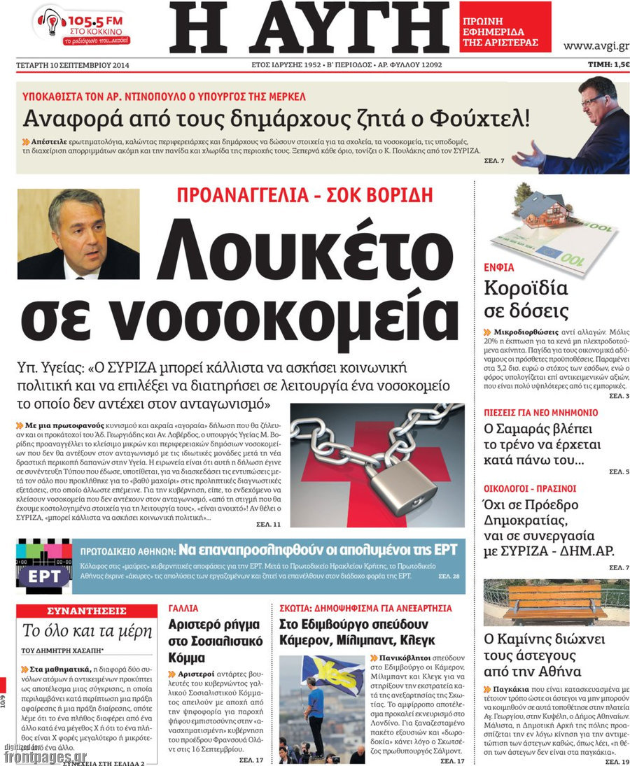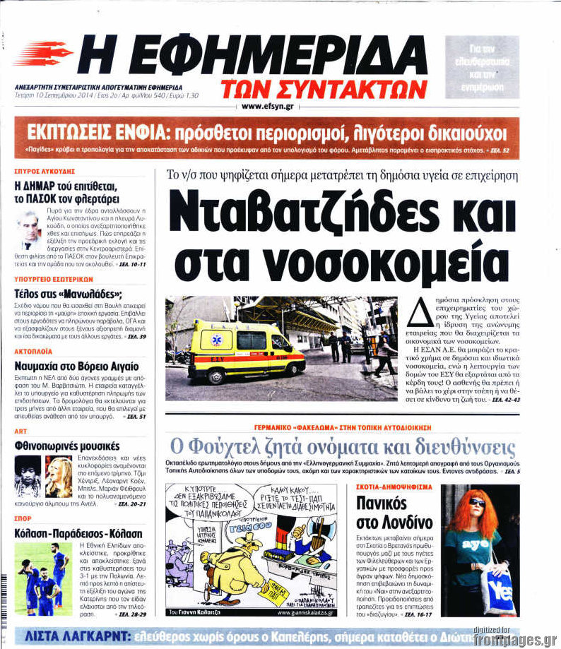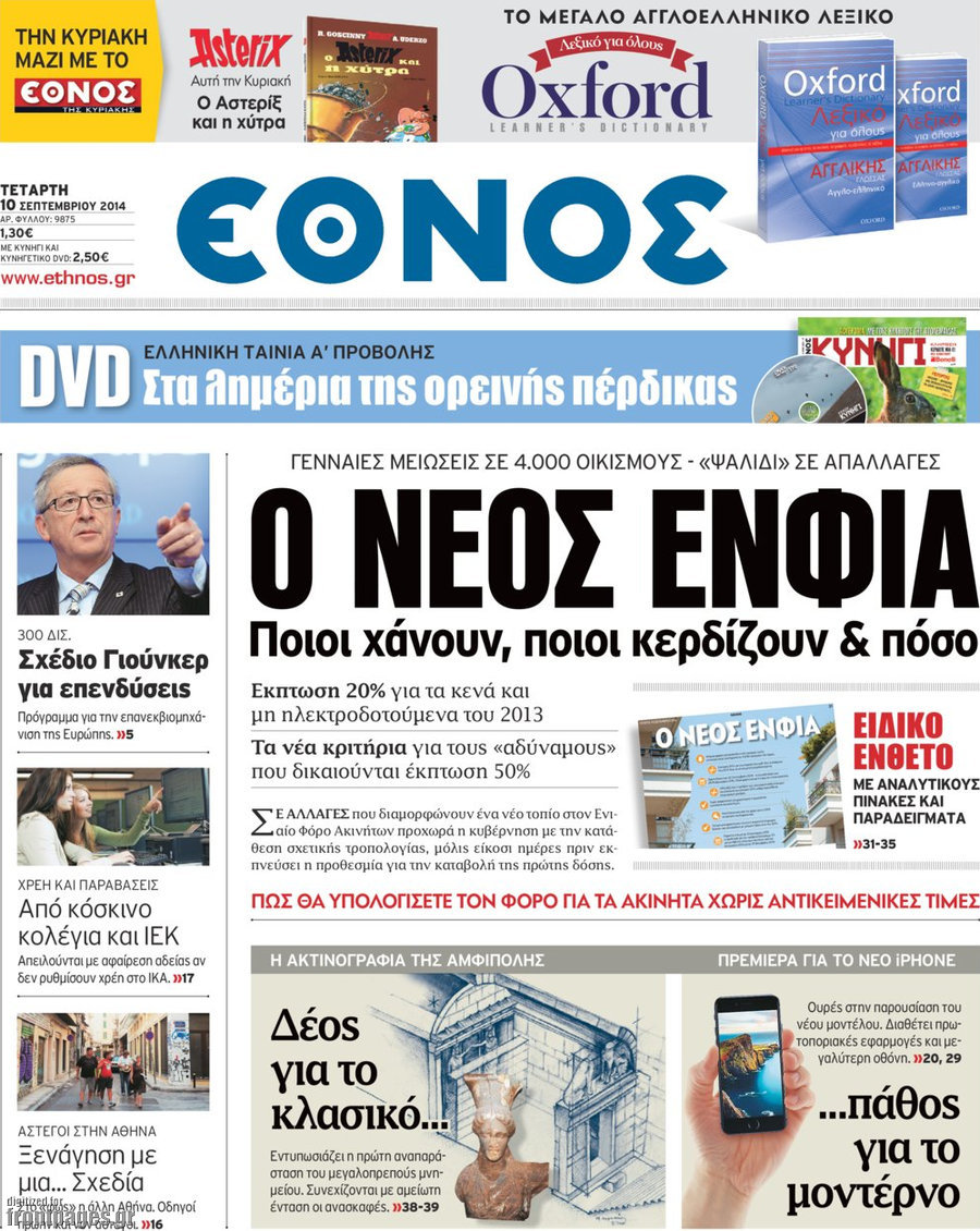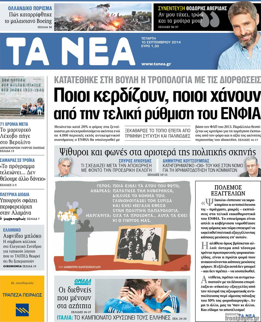 Οι πολιτικές εφημερίδες Enikos Newsroom 07:47, Τετάρτη 10 Σεπτεμβρίου 2014 Media Οι πολιτικές εφημερίδες Διαβάστε τα πρωτοσέλιδα των πολιτικών εφημερίδων: ΕΦΗΜΕΡΙΔΕΣ ΠΟΛΙΤΙΚΕΣ ΕΦΗΜΕΡΙΔΕΣ ΠΡΩΤΟΣΕΛΙΔΑ Μοιράσου το: σχολίασε κι εσύ (0 σχόλια) Ακολουθήστε το enikos.gr στο Google News και μάθετε πρώτοι όλες τις ειδήσεις Δείτε όλες τις τελευταίες ειδήσεις από την Ελλάδα και τον Κόσμο στο enikos.gr Ειδήσεις Ροή Ειδήσεων 7 λεπτά πριν Πώς δρούσε το κύκλωμα που διακινούσε ναρκωτικά σε σχολεία – Υπέβαλαν σε βασανιστήρια όσους δεν τηρούσαν τους «κανόνες πειθαρχίας» 30 λεπτά πριν Αγρότες: Γιορτές στα μπλόκα με ανοιχτά διόδια – Δικογραφία στα Ιωάννινα για το σήκωμα των μπαρών 4 ώρες πριν Αρχεία Έπσταϊν: Οι συγκλονιστικές φωτογραφίες – Ο Μάικλ Τζάκσον, ο Μικ Τζάγκερ και ο Κέβιν Σπέισι ανάμεσα στους διάσημους που απεικονίζονται 2 ώρες πριν Βέλγιο: Άγνωστοι έριξαν κόκκινη μπογιά στο προξενείο της Πολωνίας στις Βρυξέλλες 1 ώρα πριν ΕΛΑΣ: Συνελήφθησαν Υπαρχιπυροσβέστης και δύο ακόμη άτομα για κατοχή και διακίνηση ναρκωτικών ουσιών – Η καταγγελία και ο τιμοκατάλογος 42 λεπτά πριν Η τύχη χαμογελά σε 3 ζώδια έως τις 28 Δεκεμβρίου – «Προσέξτε τις επιλογές σας και η επιμονή σας θα ανταμειφθεί» 5 ώρες πριν Διαιτολόγος αποκαλύπτει 9 πρωινές συνήθειες που «λιώνουν» το κοιλιακό λίπος – «Υποστηρίζουν την υγιεινή απώλεια βάρους» 6 ώρες πριν Οι 7 φράσεις που δεν λένε ποτέ οι συναισθηματικά έξυπνοι άνθρωποι κατά τη διάρκεια ενός καβγά 8 ώρες πριν Enerwave: Το νέο «ρεύμα» στη λιανική ενέργειας που αλλάζει την εμπειρία του καταναλωτή 7 λεπτά πριν Πώς δρούσε το κύκλωμα που διακινούσε ναρκωτικά σε σχολεία – Υπέβαλαν σε βασανιστήρια όσους δεν τηρούσαν τους «κανόνες πειθαρχίας» 13 λεπτά πριν Φάμελλος: «Η πρόταση για τις εκλογές έχει να κάνει με το συμφέρον της χώρας» 24 λεπτά πριν Παναθηναϊκός: Στο… «μικροσκόπιο» ο Γένσεν της Μπρέντφορντ 30 λεπτά πριν Αγρότες: Γιορτές στα μπλόκα με ανοιχτά διόδια – Δικογραφία στα Ιωάννινα για το σήκωμα των μπαρών 34 λεπτά πριν Νίκος Γιαννόπουλος: «Όποιος με χαρακτηρίζει δημοσίως μέθυσο, προκλητικό ή οτιδήποτε άλλο θα κληθεί στις δικαστικές αίθουσες» ENIKOS NETWORK Η αποχή από την αναπαραγωγή παρατείνει τη ζωή στα ζώα, σύμφωνα με μελέτη – Τι ισχύει για τους ανθρώπους; Σημαντικές επαφές στις ΗΠΑ είχε ο υπουργός Υγείας Άδωνις Γεωργιάδης Τέλη κυκλοφορίας 2026: Προσοχή στην προθεσμία εξόφλησής τους – Πώς διαμορφώνονται τα πρόστιμα σε περίπτωση καθυστέρησης Επιτροπή Ανταγωνισμού: Στο μικροσκόπιο σχολικές τσάντες και επώνυμα brands – Τι ερευνάται Χαρτογραφώντας το «σημείο χωρίς επιστροφή»: Για πρώτη φορά αποκαλύπτεται με λεπτομέρεια το ακανθώδες όριο της ατμόσφαιρας τ... Η Google καταργεί τη λειτουργία «dark web report» – Πώς θα μπορούν οι χρήστες να διαγράφουν τα δεδομένα τους περισσότερα 14:04 , Σάββατο 20 Δεκεμβρίου 2025 Η Realnews αυτής της Κυριακής (21/12/2025) Με τίτλο: «Ασπίδα προστασίας για την Ελλάδα» κυκλοφορεί, αυτήν την Κυριακή, η Realnews. Σημαντ... 12:53 , Σάββατο 20 Δεκεμβρίου 2025 Να μ’ αγαπάς: Το παρελθόν έρχεται στο φως – Καταιγιστικές εξελίξεις στα τελευταία επεισόδια του 2025 Ο Άγγελος αποκαλύπτεται, η Φωτεινή ανησυχεί για τον Λευτέρη και η Ζωή έρχεται αντιμέτωπη με το... 11:41 , Σάββατο 20 Δεκεμβρίου 2025 «Η αγάπη δεν χάνεται ποτέ»: Η μικρού μήκους ταινία κινουμένων σχεδίων που θέτει ερωτήματα για τη ζωή και τον θάνατο Ο θάνατος είναι ένα από τα πιο σκληρά θέματα που καλείται να διαχειριστεί κάποιος στη δ
