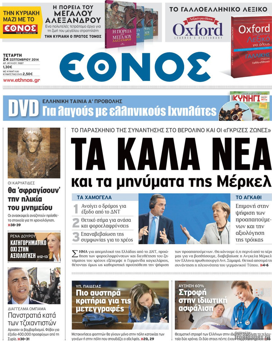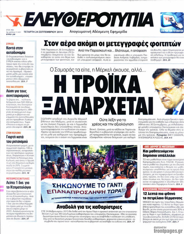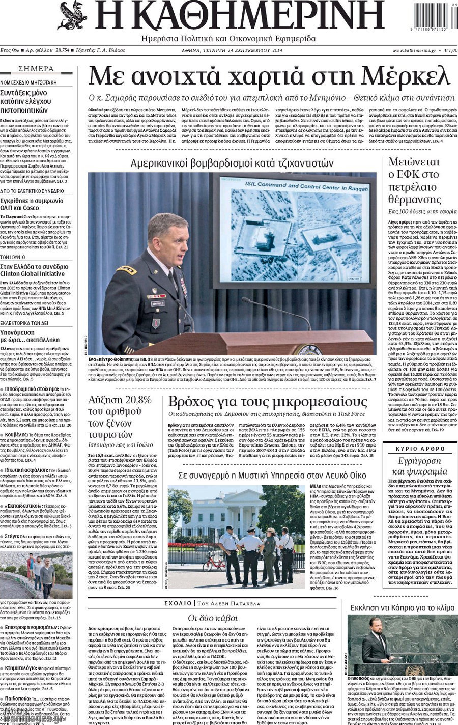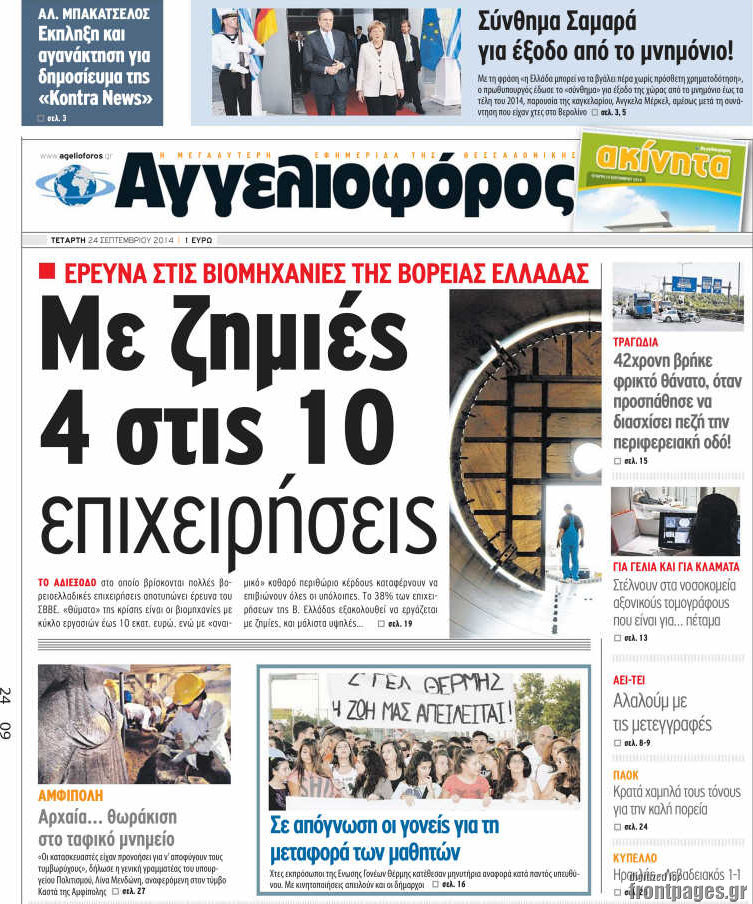 Οι πολιτικές εφημερίδες Enikos Newsroom 08:03, Τετάρτη 24 Σεπτεμβρίου 2014 Media Οι πολιτικές εφημερίδες Διαβάστε τα πρωτοσέλιδα των πολιτικών εφημερίδων: ΕΦΗΜΕΡΙΔΕΣ ΠΟΛΙΤΙΚΕΣ ΕΦΗΜΕΡΙΔΕΣ ΠΡΩΤΟΣΕΛΙΔΑ Μοιράσου το: σχολίασε κι εσύ (0 σχόλια) Ακολουθήστε το enikos.gr στο Google News και μάθετε πρώτοι όλες τις ειδήσεις Δείτε όλες τις τελευταίες ειδήσεις από την Ελλάδα και τον Κόσμο στο enikos.gr Ειδήσεις Ροή Ειδήσεων 2 ώρες πριν Χριστούγεννα στα μπλόκα: Επιμένουν στις κινητοποιήσεις τους οι αγρότες – Ανοίγουν τα διόδια το Σαββατοκύριακο 2 ώρες πριν Ουκρανία: Η άνευ προηγουμένου επίθεση σε ρωσικό τάνκερ στη Μεσόγειο και το μήνυμα προς στον Πούτιν – Το «μακρύ χέρι» του Κιέβου 1 ώρα πριν Πούτιν: Τα μηνύματα σε Ευρώπη και ΝΑΤΟ από το μαραθώνιο «σόου» του – Η απαίτηση για «σεβασμό» και η ειρήνη «με τους όρους» της Μόσχας 2 ώρες πριν Τραμπ: Δεν αποκλείει την πιθανότητα ενός πολέμου στη Βενεζουέλα – «Ο Μαδούρο ξέρει καλύτερα από τον καθένα τι ακριβώς θέλω» 3 ώρες πριν Συνεχίζει να προκαλεί ο Μίτσκοσκι: «Για μένα το όνομα Μακεδονία είναι ιερό» 1 ώρα πριν Ανακαλύφθηκαν αρχαία χρυσά νομίσματα 2.200 ετών που απεικονίζουν τον θεό Απόλλωνα – Η άγνωστη σύνδεση με τον Φίλιππο Β΄ της Μακεδονίας 2 ώρες πριν Ύπνος: Μια κρυφή κατάσταση του εγκεφάλου πριν από τον ύπνο μπορεί να είναι το “κλειδί” για υψηλή ευφυΐα και δημιουργικότητα 3 ώρες πριν Αριθμολογία: Οι άνθρωποι που έχουν γεννηθεί αυτές τις 4 ημερομηνίες, συχνά παρεξηγούνται – «Η καλοσύνη τους κρύβει τεράστια δύναμη» 4 ώρες πριν Ξεχάστε το καθάρισμα το Σαββατοκύριακο: Ο «κανόνας των 20 λεπτών» που θα σας λύσει τα χέρια 14 λεπτά πριν Βασίλης Σπανούλης: Δεν εμφανίστηκε ούτε ένας δημοσιογράφος στην συνέντευξη Τύπου – «Καλησπέρα στον… κανέναν», δείτε βίντεο 26 λεπτά πριν Πόλεμος στην Ουκρανία: Εφτά νεκροί από ρωσική πυραυλική επίθεση στο λιμάνι της Οδησσού 29 λεπτά πριν ΗΠΑ: Η κυβέρνηση του Ντόναλντ Τραμπ άρχισε να δημοσιοποιεί τα αρχεία Έπσταϊν 41 λεπτά πριν Σάμος: Άνοιξε το μπλόκο των αγροτών στον κόμβο Κοκκαρίου – Σε νέα συνεδρίαση θα καθορίσουν την στάση τους 49 λεπτά πριν Άνω Λιόσια: Πυροβολισμοί σε επιχείρηση με χαλιά – Εντοπίστηκαν 10 κάλυκες ENIKOS NETWORK Το ΕΚΑΒ τιμήθηκε από την Ακαδημία Αθηνών για τα 40 χρόνια προσφοράς του Έχετε πραγματικά μεγάλη καρδιά; 10 χαρακτηριστικά όσων έχουν καλοσύνη Αναστολή μέτρων αναγκαστικής εκτέλεσης για κτηνοτρόφους που πλήττονται από την ευλογιά των αιγοπροβάτων Πλήρης επάρκεια προϊόντων στις λαϊκές της Αττικής, παρά τις αγροτικές κινητοποιήσεις – Τι απαντούν οι πωλητές Χαρτογραφώντας το «σημείο χωρίς επιστροφή»: Για πρώτη φορά αποκαλύπτεται με λεπτομέρεια το ακανθώδες όριο της ατμόσφαιρας τ... Η Google καταργεί τη λειτουργία «dark web report» – Πώς θα μπορούν οι χρήστες να διαγράφουν τα δεδομένα τους περισσότερα 22:42 , Παρασκευή 19 Δεκεμβρίου 2025 Γιώργος Γιαννόπουλος για “Το σόι σου”: “Είναι ευτυχία και ευλογία αυτή η σειρά” «Είναι ευτυχία και ευλογία η συγκυρία αυτής της σειράς», θα πει ο Γιώργος Γιαννόπουλος -ο αγαπ... 20:37 , Παρασκευή 19 Δεκεμβρίου 2025 Don’t Forget The Lyrics: Η Έλλη Κοκκίνου υποδέχεται 4 παίκτες που θα κάνουν τα πάντα για να μη χάσουν ούτε… μισή λέξη από τους στίχους Το «Don’t Forget The Lyrics» επιστρέφει απόψε, Παρασκευή 19 Δεκεμβρίου, στις 21:00 με νέο επει... 19:31 , Παρασκευή 19 Δεκεμβρίου 2025 GNTM: Απόψε ο μεγάλος τελικός για τους 4 φιναλίστ Έπειτα από μήνες γεμάτους μόδα, δημιουργία και έντονες αναμετρήσεις, το GNTM 2025 κο