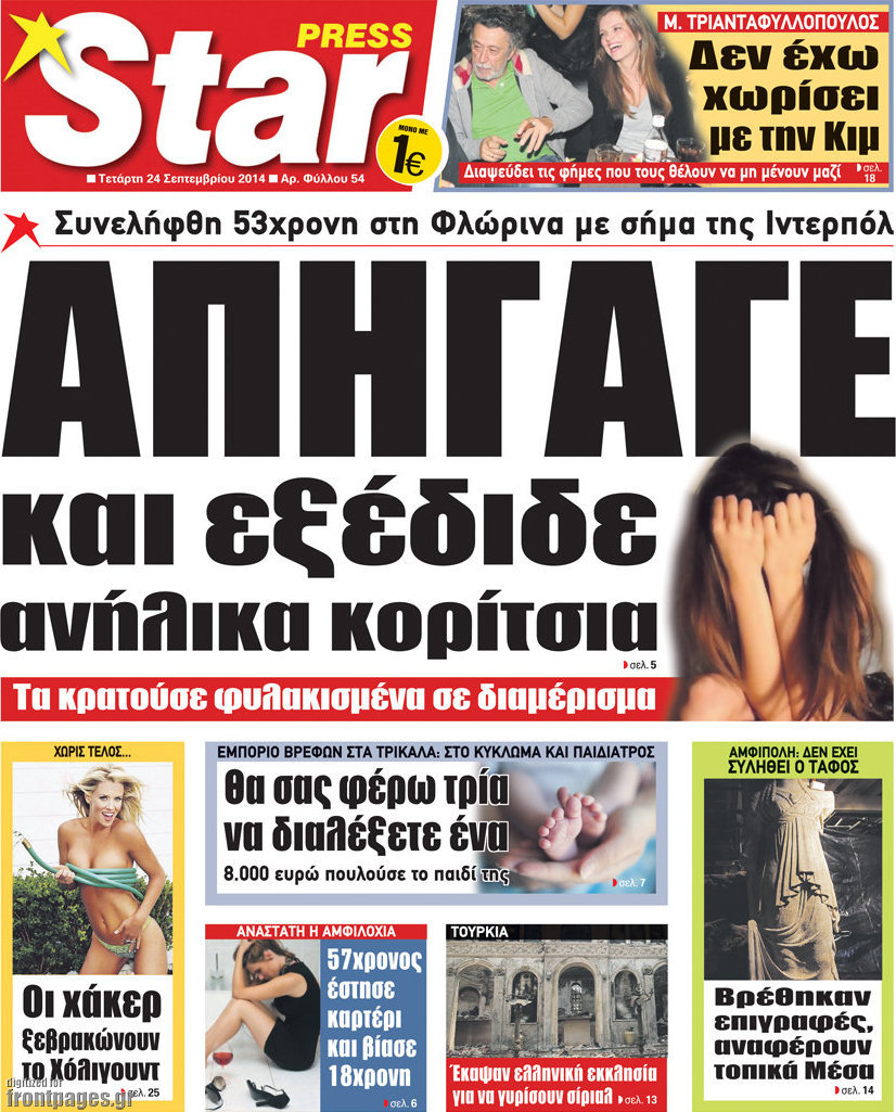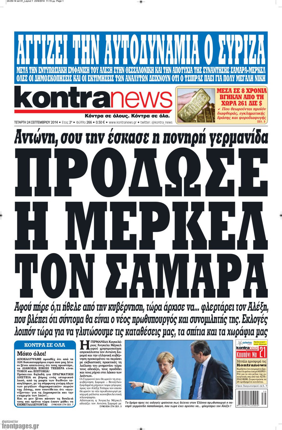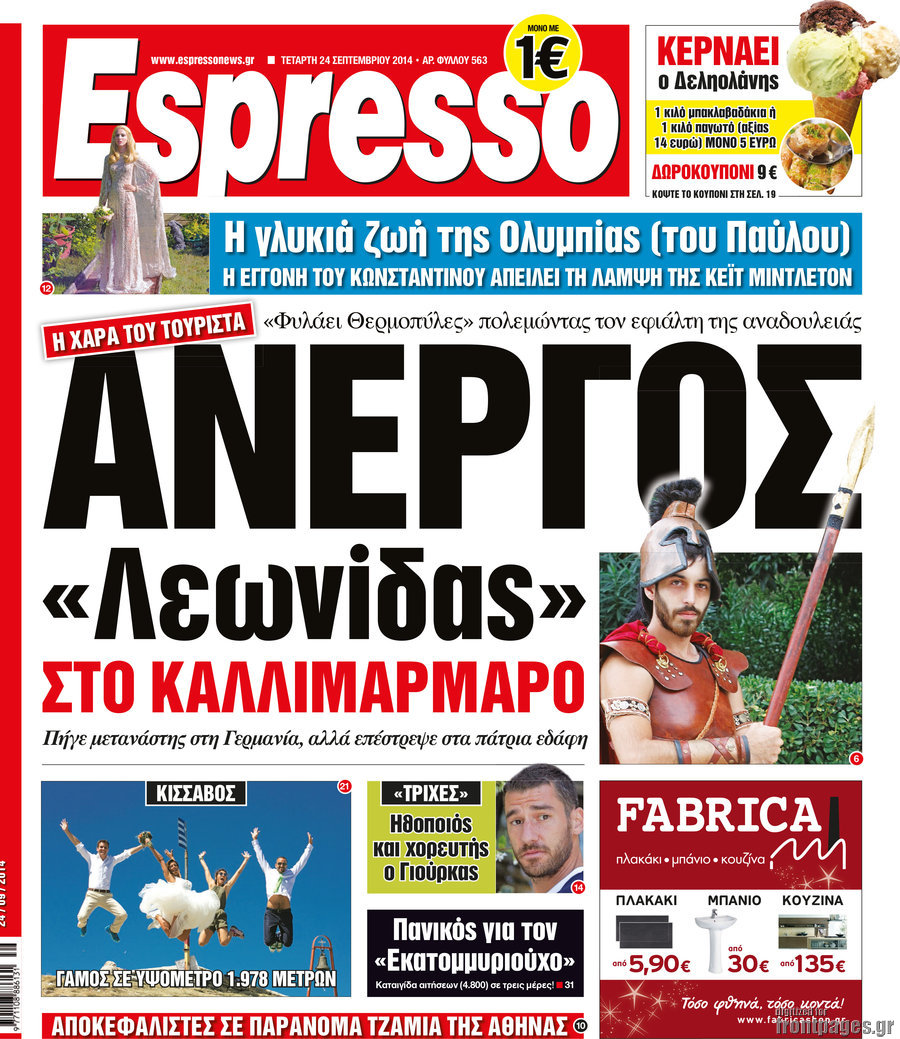 Οι πολιτικές εφημερίδες Enikos Newsroom 08:03, Τετάρτη 24 Σεπτεμβρίου 2014 Media Οι πολιτικές εφημερίδες Διαβάστε τα πρωτοσέλιδα των πολιτικών εφημερίδων: ΕΦΗΜΕΡΙΔΕΣ ΠΟΛΙΤΙΚΕΣ ΕΦΗΜΕΡΙΔΕΣ ΠΡΩΤΟΣΕΛΙΔΑ Μοιράσου το: σχολίασε κι εσύ (0 σχόλια) Ακολουθήστε το enikos.gr στο Google News και μάθετε πρώτοι όλες τις ειδήσεις Δείτε όλες τις τελευταίες ειδήσεις από την Ελλάδα και τον Κόσμο στο enikos.gr Ειδήσεις Ροή Ειδήσεων 2 ώρες πριν Χριστούγεννα στα μπλόκα: Επιμένουν στις κινητοποιήσεις τους οι αγρότες – Ανοίγουν τα διόδια το Σαββατοκύριακο 2 ώρες πριν Ουκρανία: Η άνευ προηγουμένου επίθεση σε ρωσικό τάνκερ στη Μεσόγειο και το μήνυμα προς στον Πούτιν – Το «μακρύ χέρι» του Κιέβου 1 ώρα πριν Πούτιν: Τα μηνύματα σε Ευρώπη και ΝΑΤΟ από το μαραθώνιο «σόου» του – Η απαίτηση για «σεβασμό» και η ειρήνη «με τους όρους» της Μόσχας 2 ώρες πριν Τραμπ: Δεν αποκλείει την πιθανότητα ενός πολέμου στη Βενεζουέλα – «Ο Μαδούρο ξέρει καλύτερα από τον καθένα τι ακριβώς θέλω» 3 ώρες πριν Συνεχίζει να προκαλεί ο Μίτσκοσκι: «Για μένα το όνομα Μακεδονία είναι ιερό» 1 ώρα πριν Ανακαλύφθηκαν αρχαία χρυσά νομίσματα 2.200 ετών που απεικονίζουν τον θεό Απόλλωνα – Η άγνωστη σύνδεση με τον Φίλιππο Β΄ της Μακεδονίας 2 ώρες πριν Ύπνος: Μια κρυφή κατάσταση του εγκεφάλου πριν από τον ύπνο μπορεί να είναι το “κλειδί” για υψηλή ευφυΐα και δημιουργικότητα 3 ώρες πριν Αριθμολογία: Οι άνθρωποι που έχουν γεννηθεί αυτές τις 4 ημερομηνίες, συχνά παρεξηγούνται – «Η καλοσύνη τους κρύβει τεράστια δύναμη» 4 ώρες πριν Ξεχάστε το καθάρισμα το Σαββατοκύριακο: Ο «κανόνας των 20 λεπτών» που θα σας λύσει τα χέρια 14 λεπτά πριν Βασίλης Σπανούλης: Δεν εμφανίστηκε ούτε ένας δημοσιογράφος στην συνέντευξη Τύπου – «Καλησπέρα στον… κανέναν», δείτε βίντεο 26 λεπτά πριν Πόλεμος στην Ουκρανία: Εφτά νεκροί από ρωσική πυραυλική επίθεση στο λιμάνι της Οδησσού 29 λεπτά πριν ΗΠΑ: Η κυβέρνηση του Ντόναλντ Τραμπ άρχισε να δημοσιοποιεί τα αρχεία Έπσταϊν 41 λεπτά πριν Σάμος: Άνοιξε το μπλόκο των αγροτών στον κόμβο Κοκκαρίου – Σε νέα συνεδρίαση θα καθορίσουν την στάση τους 49 λεπτά πριν Άνω Λιόσια: Πυροβολισμοί σε επιχείρηση με χαλιά – Εντοπίστηκαν 10 κάλυκες ENIKOS NETWORK Το ΕΚΑΒ τιμήθηκε από την Ακαδημία Αθηνών για τα 40 χρόνια προσφοράς του Έχετε πραγματικά μεγάλη καρδιά; 10 χαρακτηριστικά όσων έχουν καλοσύνη Αναστολή μέτρων αναγκαστικής εκτέλεσης για κτηνοτρόφους που πλήττονται από την ευλογιά των αιγοπροβάτων Πλήρης επάρκεια προϊόντων στις λαϊκές της Αττικής, παρά τις αγροτικές κινητοποιήσεις – Τι απαντούν οι πωλητές Χαρτογραφώντας το «σημείο χωρίς επιστροφή»: Για πρώτη φορά αποκαλύπτεται με λεπτομέρεια το ακανθώδες όριο της ατμόσφαιρας τ... Η Google καταργεί τη λειτουργία «dark web report» – Πώς θα μπορούν οι χρήστες να διαγράφουν τα δεδομένα τους περισσότερα 22:42 , Παρασκευή 19 Δεκεμβρίου 2025 Γιώργος Γιαννόπουλος για “Το σόι σου”: “Είναι ευτυχία και ευλογία αυτή η σειρά” «Είναι ευτυχία και ευλογία η συγκυρία αυτής της σειράς», θα πει ο Γιώργος Γιαννόπουλος -ο αγαπ... 20:37 , Παρασκευή 19 Δεκεμβρίου 2025 Don’t Forget The Lyrics: Η Έλλη Κοκκίνου υποδέχεται 4 παίκτες που θα κάνουν τα πάντα για να μη χάσουν ούτε… μισή λέξη από τους στίχους Το «Don’t Forget The Lyrics» επιστρέφει απόψε, Παρασκευή 19 Δεκεμβρίου, στις 21:00 με νέο επει... 19:31 , Παρασκευή 19 Δεκεμβρίου 2025 GNTM: Απόψε ο μεγάλος τελικός για τους 4 φιναλίστ Έπειτα από μήνες γεμάτους μόδα, δημιουργία και έντονες αναμετρήσεις, το GNTM 2025 κο