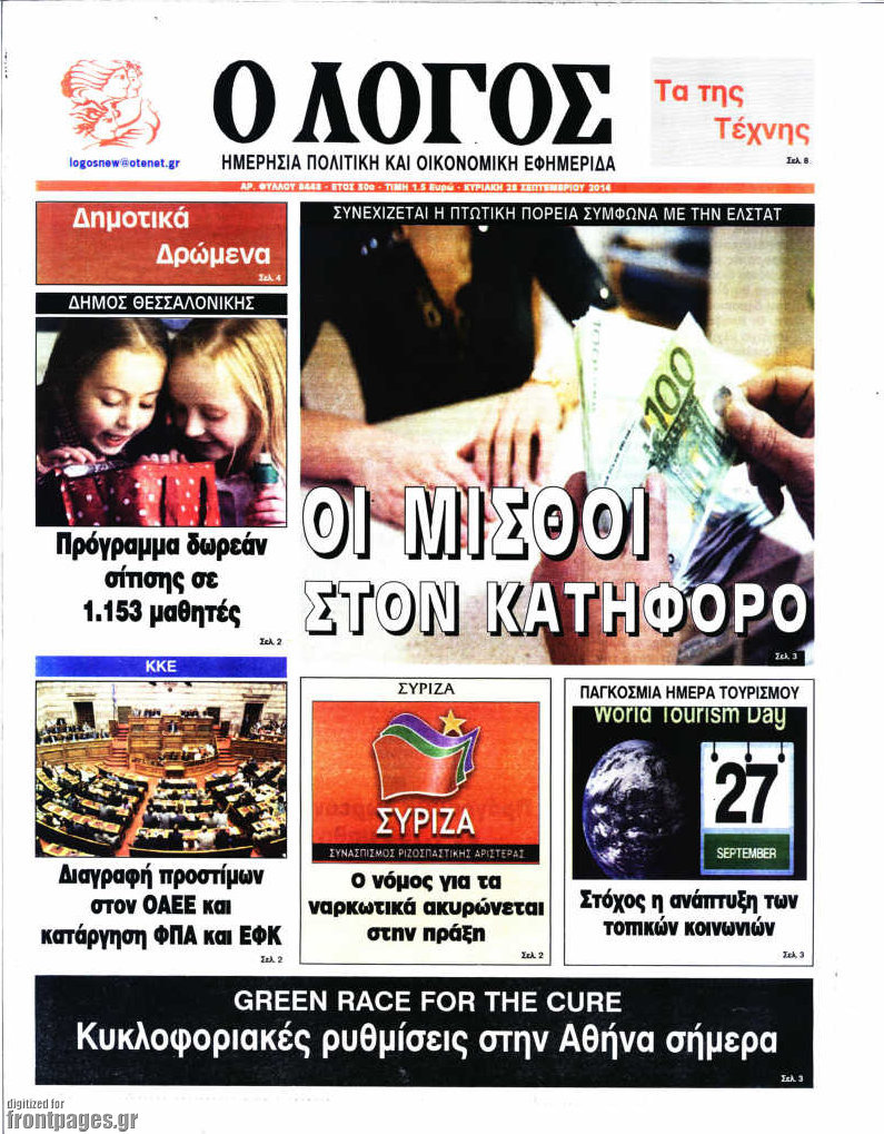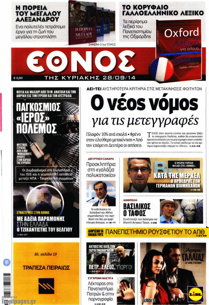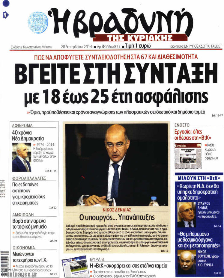 Οι πολιτικές εφημερίδες Enikos Newsroom 07:56, Κυριακή 28 Σεπτεμβρίου 2014 Media Οι πολιτικές εφημερίδες Διαβάστε τα πρωτοσέλιδα των πολιτικών εφημερίδων: ΠΟΛΙΤΙΚΕΣ ΕΦΗΜΕΡΙΔΕΣ ΠΡΩΤΟΣΕΛΙΔΑ Μοιράσου το: σχολίασε κι εσύ (0 σχόλια) Ακολουθήστε το enikos.gr στο Google News και μάθετε πρώτοι όλες τις ειδήσεις Δείτε όλες τις τελευταίες ειδήσεις από την Ελλάδα και τον Κόσμο στο enikos.gr Ειδήσεις Ροή Ειδήσεων 1 ώρα πριν Η κοινή διακήρυξη Ελλάδας – Κύπρου – Ισραήλ: Ενίσχυση αμυντικής συνεργασίας, δέσμευση για τον Great Sea Inteconnector – Τα μηνύματα της τριμερούς Συνόδου 54 λεπτά πριν Αγρότες: Bάζουν στην άκρη τα τρακτέρ ενόψει Χριστουγέννων, θέμα ασφαλείας εγείρει η αστυνομία – Οι αναδιατάξεις που θα γίνουν από την Τρίτη 1 ώρα πριν Νεκρός ο άνδρας που έπεσε στις ράγες του Ηλεκτρικού στα Κάτω Πατήσια 4 ώρες πριν Αλεξανδρούπολη: Μήνυση υπέβαλε ο παππούς του 3χρονου που πέθανε από ασιτία – Αναζητούνται οι δράστες που τον ξυλοκόπησαν 5 ώρες πριν Προκλήσεις: Έστειλαν πάλι οπλισμένα F-16 στο Αιγαίο οι Τούρκοι – Παραβιάσεις και αερομαχίες 41 λεπτά πριν Το «μαγικό» υλικό της Αρχαιότητας βρίσκεται ακόμα ανάμεσά μας – Η επιστήμη έλυσε το μυστήριο 3 ώρες πριν Αριθμολογία: Η λέξη που σας χαρακτηρίζει, με βάση την ημερομηνία γέννησής σας – «Είναι η αύρα που εκπέμπετε πριν καν μιλήσετε» 2 ώρες πριν Ύπνος: Γιατρός μοιράζεται τα σημάδια που δείχνουν ότι μπορεί να πάσχετε από «ορμονική αϋπνία» 3 ημέρες πριν Enerwave: Το νέο «ρεύμα» στη λιανική ενέργειας που αλλάζει την εμπειρία του καταναλωτή 9 λεπτά πριν Ολυμπιακός: Έως και τρεις εβδομάδες εκτός ο Λορέντσο Πιρόλα 23 λεπτά πριν Επεισόδιο ξυλοδαρμού με ρόπαλα στην Πάτρα – Συνελήφθη 40χρονος 34 λεπτά πριν Γιώργος Λιάγκας για την προσωπική ζωή του: «Είμαι λίγο πιο εξωστρεφής, γιατί μεγάλωσαν τα παιδιά» 41 λεπτά πριν Το «μαγικό» υλικό της Αρχαιότητας βρίσκεται ακόμα ανάμεσά μας – Η επιστήμη έλυσε το μυστήριο 45 λεπτά πριν Τσιάρας: Η κυβέρνηση έχει κάνει τα βήματα που έπρεπε για να βρεθούμε στο τραπέζι της συνεννόησης με τον αγροτικό κόσμο ENIKOS NETWORK Στέλνετε ακόμα Χριστουγεννιάτικες κάρτες; Τι μπορεί να δείχνει για την προσωπικότητά σας Ενεργειακή αναβάθμιση του νοσοκομείου Πατρών «Ο Άγιος Ανδρέας» ΔΕΔΔΗΕ: Τάσεις αποκλιμάκωσης των ρευματοκλοπών αλλά παραμένουν σε υψηλά επίπεδα – Τι δείχνουν τα τελευταία στοιχεία ΥΠΑΑΤ – Ελληνική Αναπτυξιακή Τράπεζα: Συμφωνία για 3 νέα χρηματοδοτικά εργαλεία με μόχλευση πόρων 365 εκατ. ευρώ Ο Google Assistant θα παραμείνει λίγο περισσότερο για ορισμένους χρήστες Android Τεστ προσωπικότητας: Το βάζο που θα επιλέξετε αποκαλύπτει πώς λύνετε προβλήματα στη ζωή σας περισσότερα 20:16 , Δευτέρα 22 Δεκεμβρίου 2025 «Το παιδί από την αρχή»: Special edition επεισόδια της επιτυχημένης σειράς αρχίζουν από σήμερα στην ΕΡΤ1 «Το παιδί», η ξεχωριστή σειρά της ΕΡΤ1 με στοιχεία μαύρης κωμωδίας, που φέρει την υπογραφή του... 19:41 , Δευτέρα 22 Δεκεμβρίου 2025 Porto Leone: Στη γειτονιά με τα κόκκινα φανάρια – Η Αλεξάνδρα ανακαλύπτει το μυστικό της Γαλήνης και της στήνει παγίδα Απόψε στις 22:30 στον Alpha η συγκλονιστική συνέχεια της δραματικής σειράς του Apha «Porto Leo... 19:16 , Δευτέρα 22 Δεκεμβρίου 2025 Άγιος έρωτας: Η Πετρούλα αφήνει την τελευταία της πνοή Καθηλώνει το προτελευταίο επεισόδιο της χρονιάς της σειράς “Άγιος Έρωτας” απόψε στ... 18:39 , Δευτέρα 22 Δεκεμβρίου 2025 Να μ’αγαπάς: Ο Θεόφιλος απειλεί να καταστρέψει τη Ζωή Σοκαριστικές αποκαλύψεις έρχονται στο νέο επεισόδιο της σειράς “Να μ΄