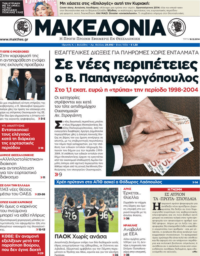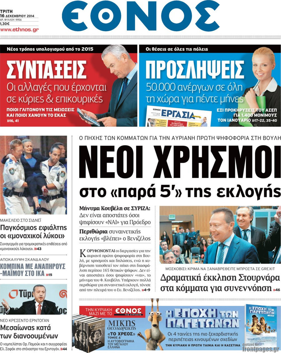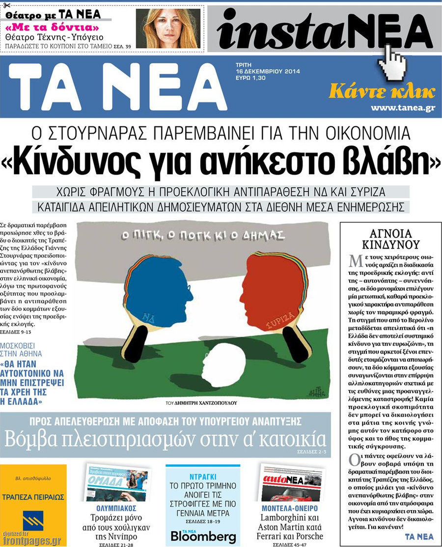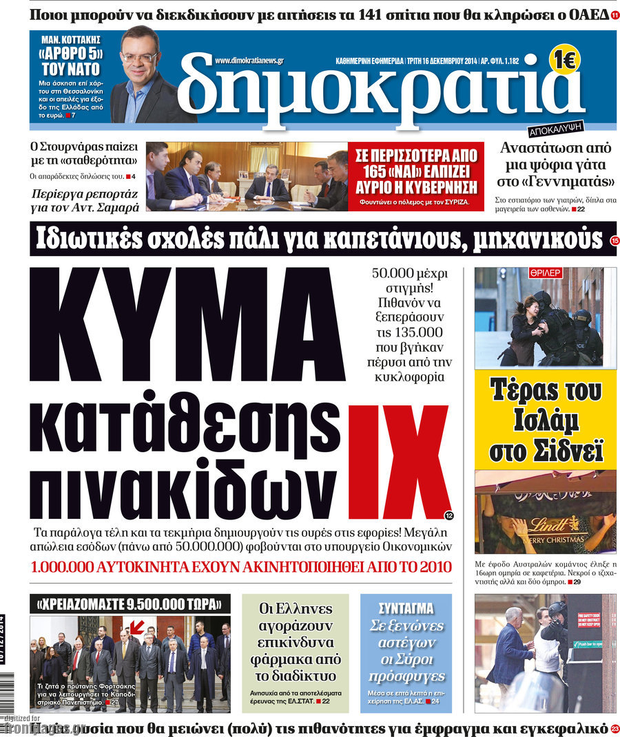 Οι πολιτικές εφημερίδες Enikos Newsroom 07:52, Τρίτη 16 Δεκεμβρίου 2014 Media Διαβάστε τα πρωτοσέλιδα των πολιτικών εφημερίδων: ΠΟΛΙΤΙΚΕΣ ΕΦΗΜΕΡΙΔΕΣ ΠΡΩΤΟΣΕΛΙΔΑ Μοιράσου το: σχολίασε κι εσύ (0 σχόλια) Ακολουθήστε το enikos.gr στο Google News και μάθετε πρώτοι όλες τις ειδήσεις Δείτε όλες τις τελευταίες ειδήσεις από την Ελλάδα και τον Κόσμο στο enikos.gr Ειδήσεις Ροή Ειδήσεων 2 ώρες πριν Υπόθεση Έπσταϊν: Το Υπουργείο Δικαιοσύνης δημοσιοποίησε μια σειρά από εξαιρετικά επεξεργασμένα αρχεία – «Λείπουν τα πιο σημαντικά έγγραφα», λένε οι Δημοκρατικοί 43 λεπτά πριν Ο «χάρτης» με τις αυξήσεις και τις φοροελαφρύνσεις του 2026 – Ποιοι και πόσα κερδίζουν 11 ώρες πριν Χριστούγεννα στα μπλόκα: Επιμένουν στις κινητοποιήσεις τους οι αγρότες – Ανοίγουν τα διόδια το Σαββατοκύριακο 2 ώρες πριν ΟΝΕΧ – MEGATUGS: Ξεκίνησε η ναυπήγηση ρυμουλκών στην Ελλάδα – Προθάλαμος πολεμικών πλοίων – Δείτε φωτογραφίες και βίντεο 2 ώρες πριν Καιρός: Αλλαγή σκηνικού σήμερα με βροχές και πτώση της θερμοκρασίας – Οι προβλέψεις των μετεωρολόγων για τα Χριστούγεννα 3 ώρες πριν Αυγά: Πόσα μπορείτε να τρώτε την ημέρα με ασφάλεια για μέγιστη πρόσληψη πρωτεΐνης 4 ώρες πριν Τα ζώδια σήμερα, Σάββατο 20 Δεκεμβρίου: Παρθένοι, το σύμπαν σας δίνει το κλειδί 3 ώρες πριν Οπτική ψευδαίσθηση: Μόνο αν είσαι ο Σέρλοκ Χολμς θα βρεις τον αριθμό «87» σε 7 δευτερόλεπτα 1 ώρα πριν Αρχαιολόγοι ανακάλυψαν σε χωράφι απεικόνιση 600 ετών ενός Αγίου – Τα στοιχεία που δείχνουν ότι μαρτύρησε 6 λεπτά πριν Ουκρανία: Drones έπληξαν εξέδρα πετρελαίου και πολεμικό πλοίο της Ρωσίας στην Κασπία 15 λεπτά πριν Παιδική υπέρταση: Μια σιωπηλή απειλή που αυξάνεται διεθνώς 16 λεπτά πριν Αγχώνεται για το χριστουγεννιάτικο δώρο που πήρε στην πλούσια σύντροφό του – «Φοβάμαι πως θα το βρει φθηνιάρικο, φοράει βραχιόλια Cartier» 22 λεπτά πριν Enerwave: Το νέο «ρεύμα» στη λιανική ενέργειας που αλλάζει την εμπειρία του καταναλωτή 27 λεπτά πριν Γιώργος Μαζωνάκης: Τη Δευτέρα η μήνυση του τραγουδιστή κατά του 22χρονου ENIKOS NETWORK Πόσα κιλά παίρνουμε πραγματικά τα Χριστούγεννα, σύμφωνα με την επιστήμη – Πώς να το αποτρέψουμε; Το δημοφιλές ρόφημα που αυξάνει την πίεση πιο γρήγορα και από το αλάτι Mega χριστουγεννιάτικη φορολοταρία: «Κλείδωσε» η ημερομηνία για την κλήρωση – Ερωτήσεις και απαντήσεις Αναστολή μέτρων αναγκαστικής εκτέλεσης για κτηνοτρόφους που πλήττονται από την ευλογιά των αιγοπροβάτων Χαρτογραφώντας το «σημείο χωρίς επιστροφή»: Για πρώτη φορά αποκαλύπτεται με λεπτομέρεια το ακανθώδες όριο της ατμόσφαιρας τ... Η Google καταργεί τη λειτουργία «dark web report» – Πώς θα μπορούν οι χρήστες να διαγράφουν τα δεδομένα τους περισσότερα 08:14 , Σάββατο 20 Δεκεμβρίου 2025 Τρομεροί γονείς: Η Μαρία Καβογιάννη εισβάλλει στο σπίτι της οικογένειας Στεφανίδη Όσα θα δούμε στο νέο διπλό επεισόδιο της σειράς «Τρομεροί γονείς», σήμερα Σάββατο 20 Δεκεμβρίο... 05:48 , Σάββατο 20 Δεκεμβρίου 2025 Οι οικονομικές εφημερίδες 20/12/2025 Διαβάστε τα πρωτοσέλιδα από τις οικονομικές εφημερίδες, σήμερα 20/12/2025. 05:43 , Σάββατο 20 Δεκεμβρίου 2025 Οι αθλητικές εφημερίδες 20/12/2025 Διαβάστε τα πρωτοσέλιδα από τις αθλητικές εφημερίδες, σήμερα 20/12/2025. 05:38 , Σάββατο 20 Δεκεμβρίου 2025 Οι πολιτικές εφημερίδες 20/12/2025 Διαβάστε τα πρωτοσέλιδα από τις πολιτικές εφημερίδες, σήμερα 20/12/2025. ΤΕΛΕΥΤΑΙΕΣ ΕΙΔΗΣΕΙΣ 6 λεπτά πριν Ουκρανία: Drones έπληξαν εξέδρα πετρελαίου και πολεμικό... 15 λεπτά πριν Παιδική υπέρταση: Μια σιωπηλή απειλή που αυξάνεται... 16 λεπτ