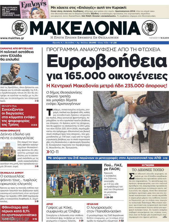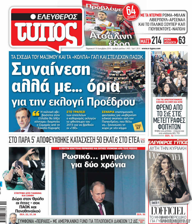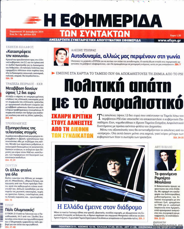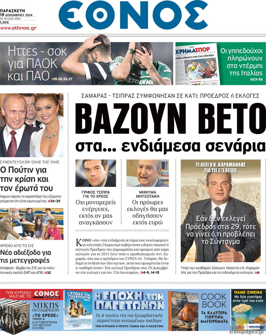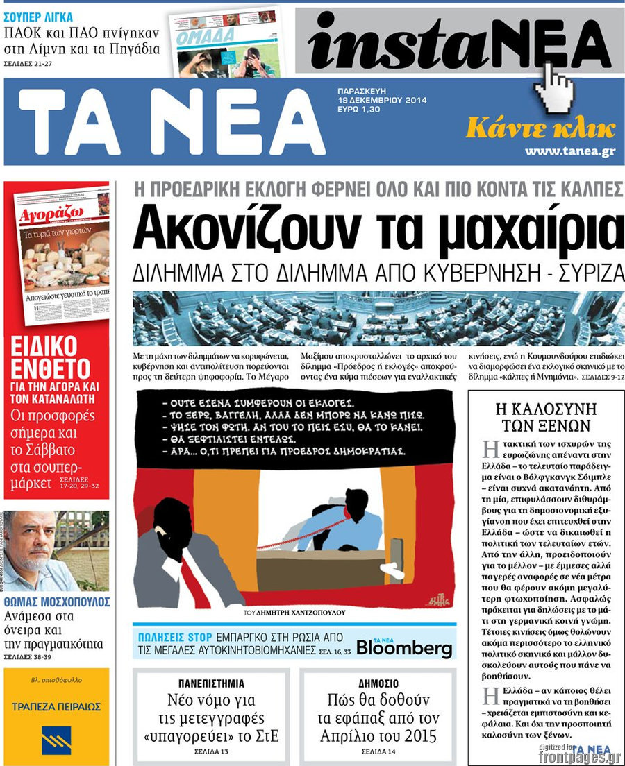 Οι πολιτικές εφημερίδες Enikos Newsroom 07:43, Παρασκευή 19 Δεκεμβρίου 2014 Media Διαβάστε τα πρωτοσέλιδα των πολιτικών εφημερίδων: ΠΟΛΙΤΙΚΕΣ ΕΦΗΜΕΡΙΔΕΣ ΠΡΩΤΟΣΕΛΙΔΑ Μοιράσου το: σχολίασε κι εσύ (0 σχόλια) Ακολουθήστε το enikos.gr στο Google News και μάθετε πρώτοι όλες τις ειδήσεις Δείτε όλες τις τελευταίες ειδήσεις από την Ελλάδα και τον Κόσμο στο enikos.gr Ειδήσεις Ροή Ειδήσεων 1 ώρα πριν Πώς δρούσε το κύκλωμα που διακινούσε ναρκωτικά σε σχολεία – Υπέβαλαν σε βασανιστήρια όσους δεν τηρούσαν τους «κανόνες πειθαρχίας» 2 ώρες πριν Αγρότες: Γιορτές στα μπλόκα με ανοιχτά διόδια – Δικογραφία στα Ιωάννινα για το σήκωμα των μπαρών 5 ώρες πριν Αρχεία Έπσταϊν: Οι συγκλονιστικές φωτογραφίες – Ο Μάικλ Τζάκσον, ο Μικ Τζάγκερ και ο Κέβιν Σπέισι ανάμεσα στους διάσημους που απεικονίζονται 21 λεπτά πριν NBC: Ο Νετανιάχου σχεδιάζει να ενημερώσει τον Τραμπ για πιθανά νέα πλήγματα εναντίον του Ιράν 31 λεπτά πριν Αττική: Εξαρθρώθηκε εγκληματική οργάνωση που έκλεβε οχήματα, τα παραποιούσε και τα μεταπωλούσε σε πολίτες – Πώς δρούσε το κύκλωμα 2 ώρες πριν Η τύχη χαμογελά σε 3 ζώδια έως τις 28 Δεκεμβρίου – «Προσέξτε τις επιλογές σας και η επιμονή σας θα ανταμειφθεί» 6 ώρες πριν Διαιτολόγος αποκαλύπτει 9 πρωινές συνήθειες που «λιώνουν» το κοιλιακό λίπος – «Υποστηρίζουν την υγιεινή απώλεια βάρους» 3 ώρες πριν Μία ανεκμετάλλευτη πηγή θα μπορούσε να προσφέρει ανεξάντλητη ενέργεια – Οι επιστήμονες ίσως γνωρίζουν πώς να την ξεκλειδώσουν 9 ώρες πριν Enerwave: Το νέο «ρεύμα» στη λιανική ενέργειας που αλλάζει την εμπειρία του καταναλωτή 2 λεπτά πριν Νιούκαστλ – Τσέλσι 2-2: Αλύγιστοι οι Λονδρέζοι 13 λεπτά πριν Μικαέλα Μπέντχαους: Ο πρώτος άνθρωπος σε αναπηρικό αμαξίδιο που ταξίδεψε στο διάστημα – ΒΙΝΤΕΟ 21 λεπτά πριν NBC: Ο Νετανιάχου σχεδιάζει να ενημερώσει τον Τραμπ για πιθανά νέα πλήγματα εναντίον του Ιράν 31 λεπτά πριν Αττική: Εξαρθρώθηκε εγκληματική οργάνωση που έκλεβε οχήματα, τα παραποιούσε και τα μεταπωλούσε σε πολίτες – Πώς δρούσε το κύκλωμα 39 λεπτά πριν Κωνσταντίνος Αργυρός: «Δεν θέλω να ασχοληθώ με την πολιτική σε αυτή τη φάση – Μου έχουν γίνει προτάσεις» ENIKOS NETWORK Γιατί πρέπει να ζητάμε χάρες; Ποιο είναι το φαινόμενο Ben Franklin που κάνει τους άλλους να μας συμπαθούν Η αποχή από την αναπαραγωγή παρατείνει τη ζωή στα ζώα, σύμφωνα με μελέτη – Τι ισχύει για τους ανθρώπους; Στα ύψη ο χρυσός – Νέο ρεκόρ στην τιμή της λίρας, πόσο πωλείται Τέλη κυκλοφορίας 2026: Προσοχή στην προθεσμία εξόφλησής τους – Πώς διαμορφώνονται τα πρόστιμα σε περίπτωση καθυστέρησης Χαρτογραφώντας το «σημείο χωρίς επιστροφή»: Για πρώτη φορά αποκαλύπτεται με λεπτομέρεια το ακανθώδες όριο της ατμόσφαιρας τ... Η Google καταργεί τη λειτουργία «dark web report» – Πώς θα μπορούν οι χρήστες να διαγράφουν τα δεδομένα τους περισσότερα 14:04 , Σάββατο 20 Δεκεμβρίου 2025 Η Realnews αυτής της Κυριακής (21/12/2025) Με τίτλο: «Ασπίδα προστασίας για την Ελλάδα» κυκλοφορεί, αυτήν την Κυριακή, η Realnews. Σημαντ... 12:53 , Σάββατο 20 Δεκεμβρίου 2025 Να μ’ αγαπάς: Το παρελθόν έρχεται στο φως – Καταιγιστικές εξελίξεις στα τελευταία επεισόδια του 2025 Ο Άγγελος αποκαλύπτεται, η Φωτεινή ανησυχεί για τον Λευτέρη και η Ζωή έρχεται αντιμέτωπη με το... 11:41 , Σάββατο 20 Δεκεμβρίου 2025 «Η αγάπη δεν χάνεται ποτέ»: Η μικρού μήκους ταινία κινουμένων σχεδίων που θέτει ερωτήματα για τη ζωή και τον θάνατο Ο θάνατος είναι ένα από τα πιο σκληρά θέματα που καλείται να διαχειριστεί κάποιος στη διάρκεια... 09:30 