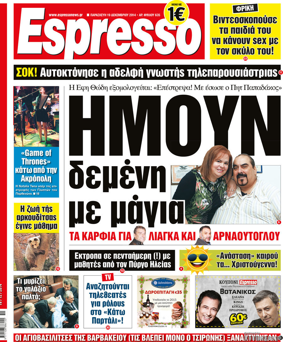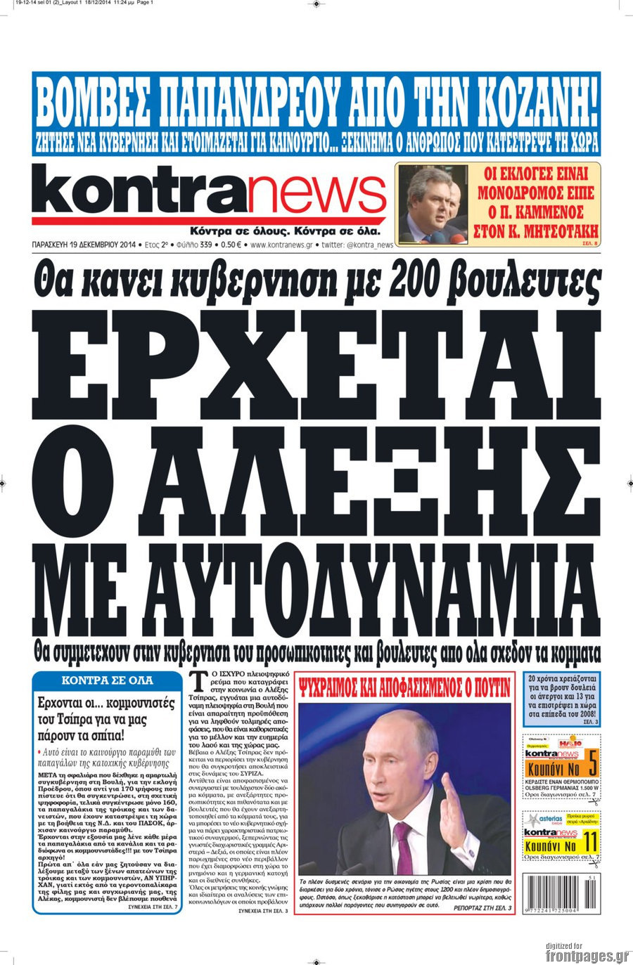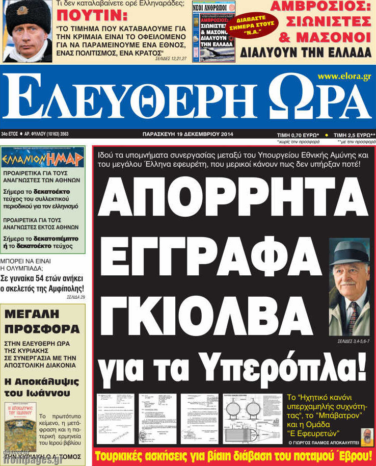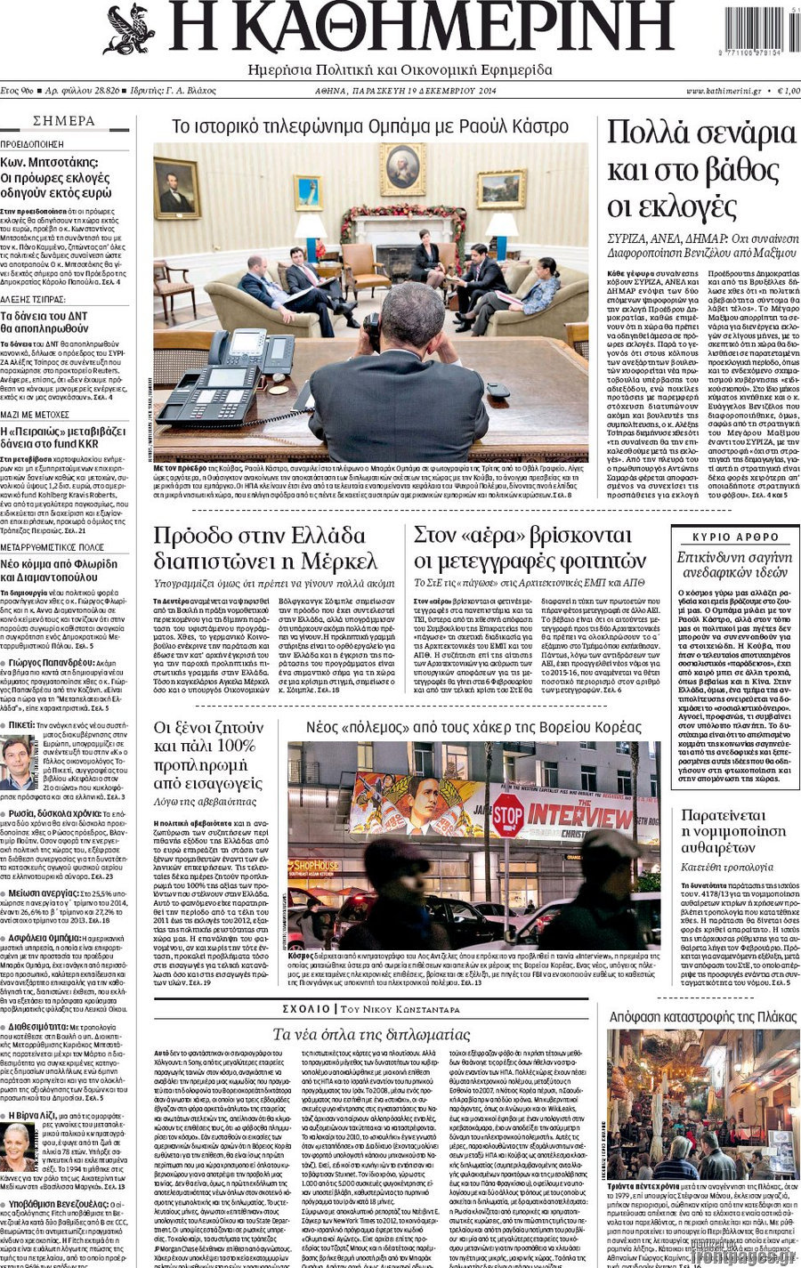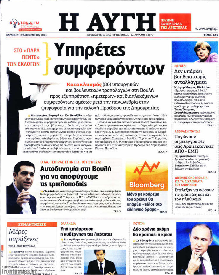 Οι πολιτικές εφημερίδες Enikos Newsroom 07:43, Παρασκευή 19 Δεκεμβρίου 2014 Media Διαβάστε τα πρωτοσέλιδα των πολιτικών εφημερίδων: ΠΟΛΙΤΙΚΕΣ ΕΦΗΜΕΡΙΔΕΣ ΠΡΩΤΟΣΕΛΙΔΑ Μοιράσου το: σχολίασε κι εσύ (0 σχόλια) Ακολουθήστε το enikos.gr στο Google News και μάθετε πρώτοι όλες τις ειδήσεις Δείτε όλες τις τελευταίες ειδήσεις από την Ελλάδα και τον Κόσμο στο enikos.gr Ειδήσεις Ροή Ειδήσεων 1 ώρα πριν Πώς δρούσε το κύκλωμα που διακινούσε ναρκωτικά σε σχολεία – Υπέβαλαν σε βασανιστήρια όσους δεν τηρούσαν τους «κανόνες πειθαρχίας» 2 ώρες πριν Αγρότες: Γιορτές στα μπλόκα με ανοιχτά διόδια – Δικογραφία στα Ιωάννινα για το σήκωμα των μπαρών 5 ώρες πριν Αρχεία Έπσταϊν: Οι συγκλονιστικές φωτογραφίες – Ο Μάικλ Τζάκσον, ο Μικ Τζάγκερ και ο Κέβιν Σπέισι ανάμεσα στους διάσημους που απεικονίζονται 21 λεπτά πριν NBC: Ο Νετανιάχου σχεδιάζει να ενημερώσει τον Τραμπ για πιθανά νέα πλήγματα εναντίον του Ιράν 31 λεπτά πριν Αττική: Εξαρθρώθηκε εγκληματική οργάνωση που έκλεβε οχήματα, τα παραποιούσε και τα μεταπωλούσε σε πολίτες – Πώς δρούσε το κύκλωμα 2 ώρες πριν Η τύχη χαμογελά σε 3 ζώδια έως τις 28 Δεκεμβρίου – «Προσέξτε τις επιλογές σας και η επιμονή σας θα ανταμειφθεί» 6 ώρες πριν Διαιτολόγος αποκαλύπτει 9 πρωινές συνήθειες που «λιώνουν» το κοιλιακό λίπος – «Υποστηρίζουν την υγιεινή απώλεια βάρους» 3 ώρες πριν Μία ανεκμετάλλευτη πηγή θα μπορούσε να προσφέρει ανεξάντλητη ενέργεια – Οι επιστήμονες ίσως γνωρίζουν πώς να την ξεκλειδώσουν 9 ώρες πριν Enerwave: Το νέο «ρεύμα» στη λιανική ενέργειας που αλλάζει την εμπειρία του καταναλωτή 2 λεπτά πριν Νιούκαστλ – Τσέλσι 2-2: Αλύγιστοι οι Λονδρέζοι 13 λεπτά πριν Μικαέλα Μπέντχαους: Ο πρώτος άνθρωπος σε αναπηρικό αμαξίδιο που ταξίδεψε στο διάστημα – ΒΙΝΤΕΟ 21 λεπτά πριν NBC: Ο Νετανιάχου σχεδιάζει να ενημερώσει τον Τραμπ για πιθανά νέα πλήγματα εναντίον του Ιράν 31 λεπτά πριν Αττική: Εξαρθρώθηκε εγκληματική οργάνωση που έκλεβε οχήματα, τα παραποιούσε και τα μεταπωλούσε σε πολίτες – Πώς δρούσε το κύκλωμα 39 λεπτά πριν Κωνσταντίνος Αργυρός: «Δεν θέλω να ασχοληθώ με την πολιτική σε αυτή τη φάση – Μου έχουν γίνει προτάσεις» ENIKOS NETWORK Γιατί πρέπει να ζητάμε χάρες; Ποιο είναι το φαινόμενο Ben Franklin που κάνει τους άλλους να μας συμπαθούν Η αποχή από την αναπαραγωγή παρατείνει τη ζωή στα ζώα, σύμφωνα με μελέτη – Τι ισχύει για τους ανθρώπους; Στα ύψη ο χρυσός – Νέο ρεκόρ στην τιμή της λίρας, πόσο πωλείται Τέλη κυκλοφορίας 2026: Προσοχή στην προθεσμία εξόφλησής τους – Πώς διαμορφώνονται τα πρόστιμα σε περίπτωση καθυστέρησης Χαρτογραφώντας το «σημείο χωρίς επιστροφή»: Για πρώτη φορά αποκαλύπτεται με λεπτομέρεια το ακανθώδες όριο της ατμόσφαιρας τ... Η Google καταργεί τη λειτουργία «dark web report» – Πώς θα μπορούν οι χρήστες να διαγράφουν τα δεδομένα τους περισσότερα 14:04 , Σάββατο 20 Δεκεμβρίου 2025 Η Realnews αυτής της Κυριακής (21/12/2025) Με τίτλο: «Ασπίδα προστασίας για την Ελλάδα» κυκλοφορεί, αυτήν την Κυριακή, η Realnews. Σημαντ... 12:53 , Σάββατο 20 Δεκεμβρίου 2025 Να μ’ αγαπάς: Το παρελθόν έρχεται στο φως – Καταιγιστικές εξελίξεις στα τελευταία επεισόδια του 2025 Ο Άγγελος αποκαλύπτεται, η Φωτεινή ανησυχεί για τον Λευτέρη και η Ζωή έρχεται αντιμέτωπη με το... 11:41 , Σάββατο 20 Δεκεμβρίου 2025 «Η αγάπη δεν χάνεται ποτέ»: Η μικρού μήκους ταινία κινουμένων σχεδίων που θέτει ερωτήματα για τη ζωή και τον θάνατο Ο θάνατος είναι ένα από τα πιο σκληρά θέματα που καλείται να διαχειριστεί κάποιος στη διάρκεια... 09:30 