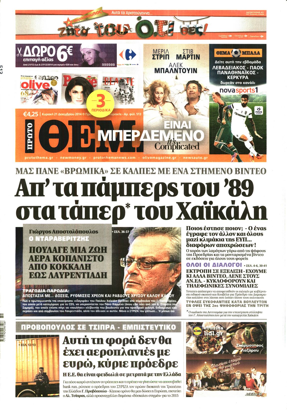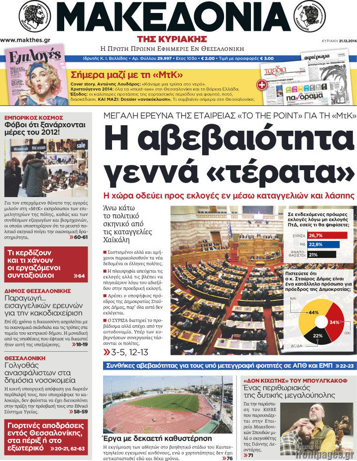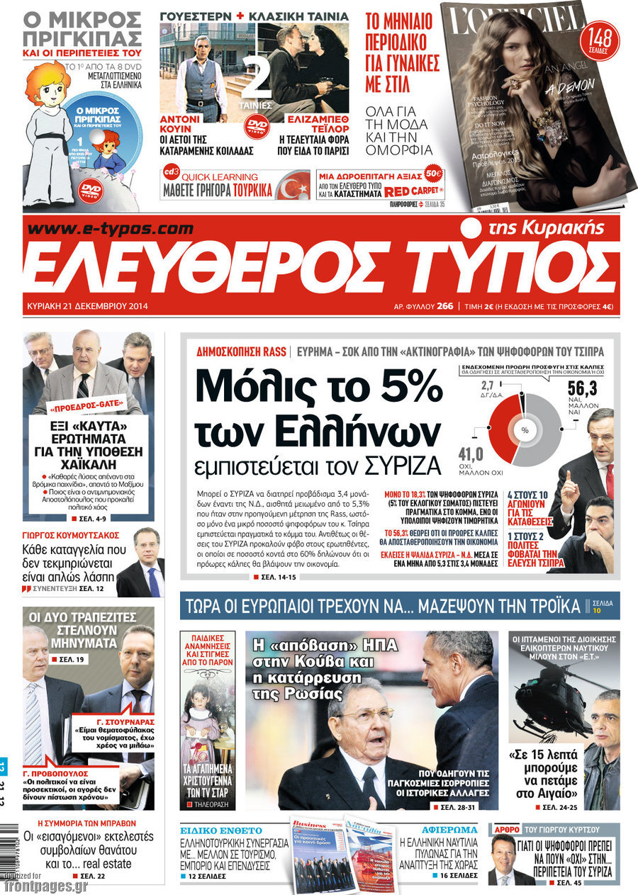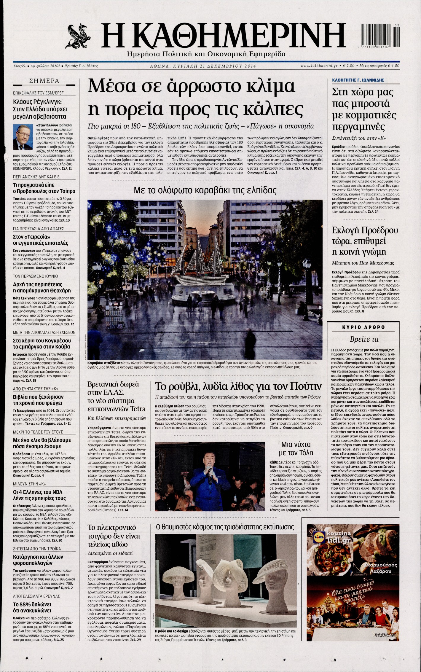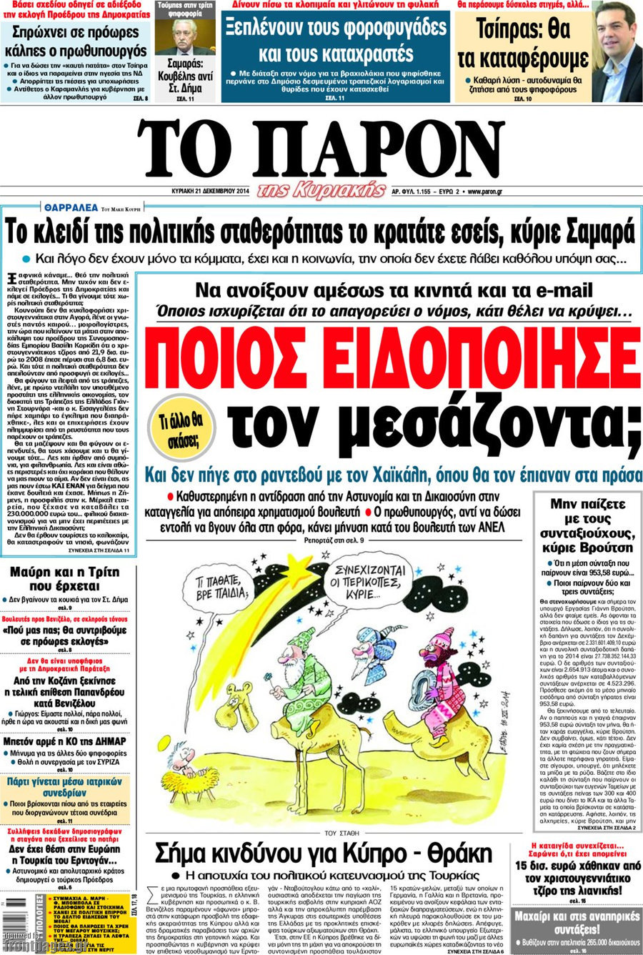 Οι πολιτικές εφημερίδες Enikos Newsroom 07:30, Κυριακή 21 Δεκεμβρίου 2014 Media Διαβάστε τα πρωτοσέλιδα των πολιτικών εφημερίδων: ΕΞΩΦΥΛΛΑ ΕΦΗΜΕΡΙΔΕΣ ΠΟΛΙΤΙΚΕΣ ΕΦΗΜΕΡΙΔΕΣ ΠΡΩΤΟΣΕΛΙΔΑ Μοιράσου το: σχολίασε κι εσύ (0 σχόλια) Ακολουθήστε το enikos.gr στο Google News και μάθετε πρώτοι όλες τις ειδήσεις Δείτε όλες τις τελευταίες ειδήσεις από την Ελλάδα και τον Κόσμο στο enikos.gr Ειδήσεις Ροή Ειδήσεων 42 λεπτά πριν Μητσοτάκης σε αγρότες: Είμαστε ανοιχτοί στον διάλογο, αλλά όχι στο παράλογο – Η διεκδίκηση αιτημάτων οφείλει να γίνεται με σεβασμό στο κοινωνικό σύνολο 58 λεπτά πριν Γρίπη: «Καμπανάκι» από τους επιστήμονες για έξαρση κρουσμάτων στις γιορτές – Ποιοι κινδυνεύουν και πώς προστατευόμαστε 2 ώρες πριν Γαλλία: Έτοιμοι για Χριστούγεννα στους δρόμους οι αγρότες – «Οι δεσμεύσεις της κυβέρνησης δεν είναι αρκετές» 2 ώρες πριν Φοροδιαφυγή και «κενό ΦΠΑ»: Πώς τα ψηφιακά εργαλεία έφεραν δισεκατομμύρια στα ταμεία του Δημοσίου 3 ώρες πριν Τζορτζ Κλούνεϊ: Πέθανε η αδελφή του, Άντα Ζάιντλερ – «Η ηρωίδα μου» 52 λεπτά πριν Τα άστρα ευνοούν σκανδαλωδώς 4 ζώδια – «Εμφανίζονται ξαφνικά ευκαιρίες γιατί αποφασίζετε να αφήσετε πίσω το παρελθόν» 2 ώρες πριν Οι γονείς της θέλουν να έχουν πρόσβαση στον τραπεζικό της λογαριασμό – «Επιμένουν πως στις οικογένειες δεν υπάρχουν μυστικά» 2 ώρες πριν Αρχαιολόγοι ανακάλυψαν κάτι που δεν περίμεναν: Τα μαθηματικά υπήρχαν πριν από τους αριθμούς – Το μυστικό που κρύβεται πίσω από περίεργα αγγεία 8.000 ετών 1 ημέρα πριν Enerwave: Το νέο «ρεύμα» στη λιανική ενέργειας που αλλάζει την εμπειρία του καταναλωτή 10 λεπτά πριν Νέα περιστατικά κατανάλωσης αλκοόλ από ανηλίκους στην Κρήτη: Δύο παιδιά στο νοσοκομείο – 3 συλλήψεις 18 λεπτά πριν Τηλεθέαση (20/12): Πρωτιά για το The Voice στην prime time – Τα ποσοστά στο δυναμικό και στο γενικό σύνολο 23 λεπτά πριν Συναγερμός στην Σκύρο – Ακυβέρνητο δεξαμενόπλοιο λόγω μπλακ άουτ 26 λεπτά πριν Σοκ στις Πινακάτες: Νεκρός ο πρόεδρος του χωριού Νίκος Παππάς – Κατέρρευσε μπροστά στη σύζυγο και τα παιδιά του 34 λεπτά πριν Πώς «ακούγονται» το Δέλτα του Αξιού και η λίμνη Ορεστιάδα; Οι πρώτες ηχογραφήσεις των επιστημόνων δείχνουν κάτι απρόσμενο ENIKOS NETWORK Άσκηση: η «ασπίδα» του εγκεφάλου απέναντι στη γήρανση Έχετε καταρροή και φαγούρα στα μάτια στις γιορτές; Μπορεί να ευθύνεται το σύνδρομο χριστουγεννιάτικου δέντρου Ανοιχτά τα καταστήματα σήμερα – Μέχρι τι ώρα μπορείτε να κάνετε τις αγορές σας Πρωτοχρονιά 2026: Πόσο θα κοστίσει φέτος η βασιλόπιτα – Οι τιμές σε ζαχαροπλαστεία, φούρνους και σούπερ μάρκετ Χαρτογραφώντας το «σημείο χωρίς επιστροφή»: Για πρώτη φορά αποκαλύπτεται με λεπτομέρεια το ακανθώδες όριο της ατμόσφαιρας τ... Η Google καταργεί τη λειτουργία «dark web report» – Πώς θα μπορούν οι χρήστες να διαγράφουν τα δεδομένα τους περισσότερα 09:43 , Κυριακή 21 Δεκεμβρίου 2025 Το λάθος στην ταινία Die Hard που άφησε άναυδους τους θαυμαστές του Μπρους Γουίλις Ένας φανατικός των ταινιών άφησε άναυδους τους θαυμαστές του Die Hard, επισημαίνοντας τρία βασ... 08:13 , Κυριακή 21 Δεκεμβρίου 2025 Άγιος έρωτας: Ένας καταστροφικός σεισμός χτυπά τη Στέρνα Καταιγιστικές είναι οι εξελίξεις στα δυο τελευταία, συγκλονιστικά επεισόδια του 2025 της σειρά... 08:00 , Κυριακή 21 Δεκεμβρίου 2025 Σήμερα με τη Realnews: Ό,τι και αν αγοράσεις, σκανάρεις και κερδίζεις! Σήμερα με τη Realnews: Ό,τι και αν αγοράσεις, σκανάρεις και κερδίζεις! Με το PADU app, το κορυ... 07:00 , Κυριακή 21 Δεκεμβρίου 2025 Σήμερα με τη Realnews: Inst