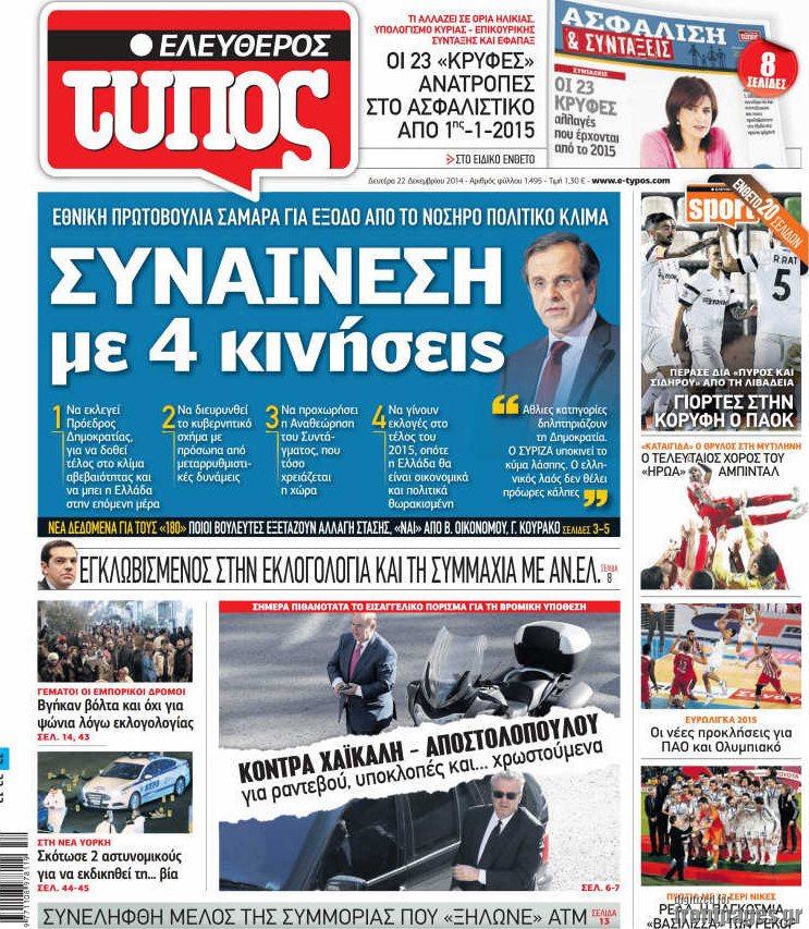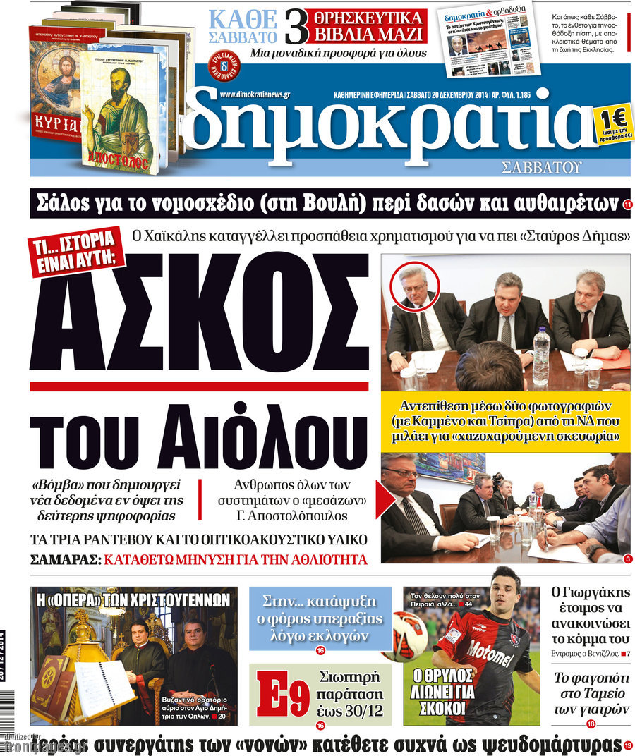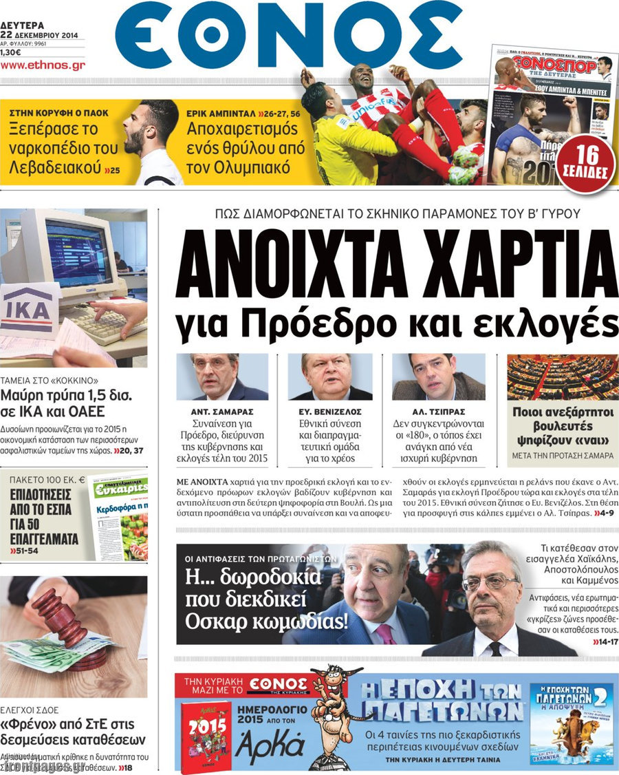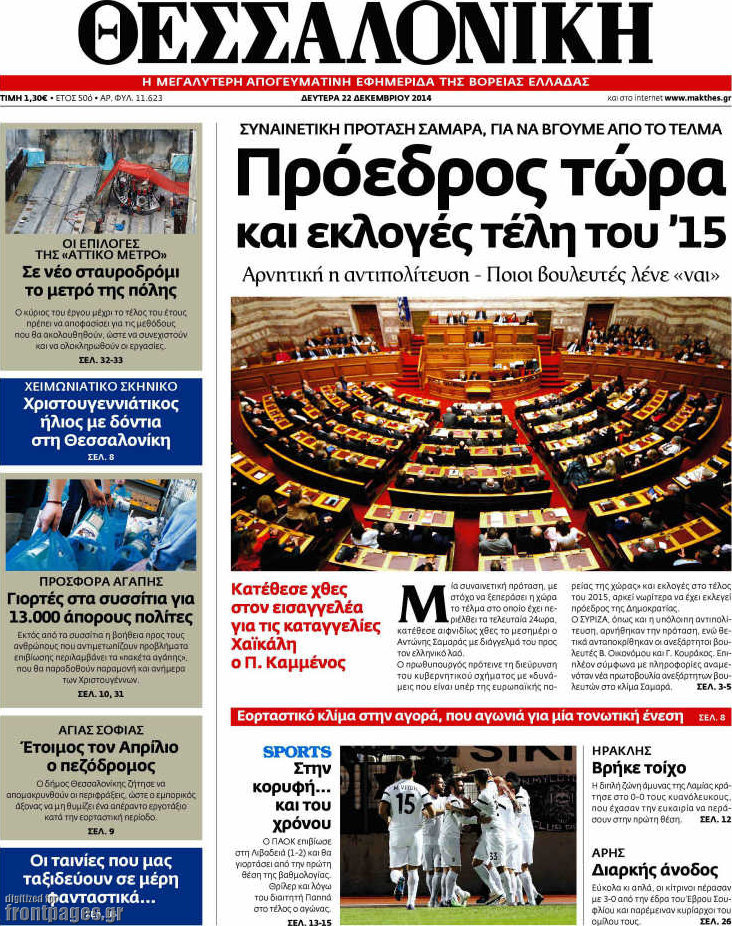 Οι πολιτικές εφημερίδες Enikos Newsroom 08:04, Δευτέρα 22 Δεκεμβρίου 2014 Media Διαβάστε τα πρωτοσέλιδα των πολιτικών εφημερίδων: ΠΟΛΙΤΙΚΕΣ ΕΦΗΜΕΡΙΔΕΣ ΠΡΩΤΟΣΕΛΙΔΑ Μοιράσου το: σχολίασε κι εσύ (0 σχόλια) Ακολουθήστε το enikos.gr στο Google News και μάθετε πρώτοι όλες τις ειδήσεις Δείτε όλες τις τελευταίες ειδήσεις από την Ελλάδα και τον Κόσμο στο enikos.gr Ειδήσεις Ροή Ειδήσεων 3 ώρες πριν Αυξάνουν την πίεση προς την κυβέρνηση οι αγρότες: Κλείνουν παρακαμπτήριους και ανοίγουν διόδια – Τι θα γίνει τις γιορτές 2 ώρες πριν ΟΠΕΚΕΠΕ: Προφυλακιστέος ο φερόμενος αρχηγός και ο λογιστής της εγκληματικής οργάνωσης 3 ώρες πριν Φοινικούντα: Το Σάββατο απολογείται ο 30χρονος γιος γνωστού επιχειρηματία της Πλάκας που παραδόθηκε – Όσα είπε στους αστυνομικούς και ο ρόλος του στο έγκλημα 2 ώρες πριν Μπορεί ο Μαδούρο να αντέξει τον αποκλεισμό του Τραμπ; Τι θα χρειαστεί η Ουάσινγκτον για να τον ανατρέψει 4 ώρες πριν Πρίγκιπας Ουίλιαμ – Κέιτ: Η νέα οικογενειακή φωτογραφία για τις Χριστουγεννιάτικες κάρτες του 2025 4 ώρες πριν Ύπνος: Η απλή βραδινή ρουτίνα για να προστατεύσετε τα μαλλιά σας από το κρύο κατά τη διάρκεια του χειμώνα 5 ώρες πριν Manifesting: Πώς να συναντήσετε τον σύντροφο της ζωής σας, ανάλογα με τον μήνα γέννησής σας 2 ημέρες πριν 20 χρόνια τα Χριστούγεννα ξεκινούν στα Public με μεγάλη ποικιλία σε δώρα! 3 ώρες πριν Αρχαιολόγοι ανακάλυψαν ρωμαϊκά τεχνουργήματα από μια πόλη που δεν υπήρξε ποτέ – Τα τρία εντυπωσιακά κτίρια και ο αμφορέας με τις… σαρδέλες 8 λεπτά πριν ΟΗΕ: Την εκλογή του νέου ύπατου αρμοστή για τους Πρόσφυγες Μπαρχάμ Άχμεντ Σαλίχ χαιρέτησε ο Αντόνιο Γκουτέρες 12 λεπτά πριν Σύνοδος Κορυφής στις Βρυξέλλες: Ακόμη πιο κοντά σε διέξοδο για τη χρηματοδότηση της Ουκρανίας 20 λεπτά πριν ΟΗΕ: Iστορική επίσκεψη του Συμβουλίου Ασφαλείας στη Δαμασκό – Mήνυμα Ελλάδας για συμπερίληψη και λογοδοσία 27 λεπτά πριν Νέος πρέσβης της Μεγάλης Βρετανίας στις ΗΠΑ ο Κρίστιαν Τέρνερ 31 λεπτά πριν Conference League: Με Νόα, Ντρίτα, Άλκμααρ ή Τσέλιε στους «16» η ΑΕΚ ENIKOS NETWORK Σε περίοδο αυξημένης δραστηριότητας η γρίπη στην Ελλάδα-Μέτρα προστασίας από τον ΕΟΔΥ Σκέφτεστε συνέχεια συζητήσεις που έχετε κάνει; Τι σημαίνει αυτό, σύμφωνα με ειδικό Στεγαστικό: Τι λέει η ΠΟΜΙΔΑ για τα νέα μέτρα που ανακοίνωσε ο Κυριάκος Μητσοτάκης Λαγκάρντ: Αισιόδοξη για την ανάπτυξη της Ευρωζώνης, αβέβαιη για τον πληθωρισμό Χαρτογραφώντας το «σημείο χωρίς επιστροφή»: Για πρώτη φορά αποκαλύπτεται με λεπτομέρεια το ακανθώδες όριο της ατμόσφαιρας τ... Η Google καταργεί τη λειτουργία «dark web report» – Πώς θα μπορούν οι χρήστες να διαγράφουν τα δεδομένα τους περισσότερα 17:45 , Πέμπτη 18 Δεκεμβρίου 2025 ROUK ZOUK: Εορταστικό επεισόδιο με καλεσμένους τους πρωταγωνιστές του «Γιατί ρε πατέρα» Το Σάββατο 20 Δεκεμβρίου στις 21:00, η Ζέτα Μακρυπούλια υποδέχεται εκλεκτούς ηθοποιούς που όλο... 17:20 , Πέμπτη 18 Δεκεμβρίου 2025 Άγιος έρωτας: Η Χριστίνα εξομολογείται στον πατέρα Νικόλαο, απόψε στις 21:00 στον Alpha Η Νότα αποφασίζει να εκδικηθεί τον Πέτρο και τον Στέφανο, για χάρη του Λούη, όμως τα πράγματα ... 16:50 , Πέμπτη 18 Δεκεμβρίου 2025 Να μ’ αγαπάς: Ζωή και Φωτεινή συμφιλιώνονται ως μάνα με κόρη, απόψε στις 20:00 Η ταυτότητα του Άγγελου αποκαλύπτεται στο νέο επεισόδιο της σειράς “Να μ’ αγαπάς... 15:52 , Πέμπτη 18 Δεκεμβρίου 2025 Το Σπίτι Δίπλα Στο Ποτάμι: Το καθηλωτικό τελευταίο επεισόδιο για το 2025 απόψε στις 22:30 Καθηλώνει το σημερινό επεισόδιο της σειράς “Το Σπίτι Δίπλα Στο Ποτάμι” πο