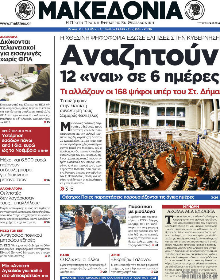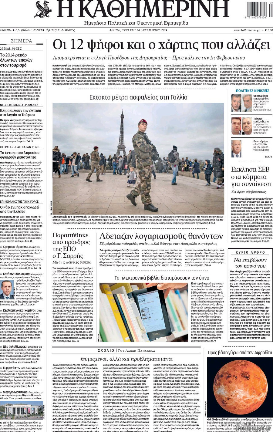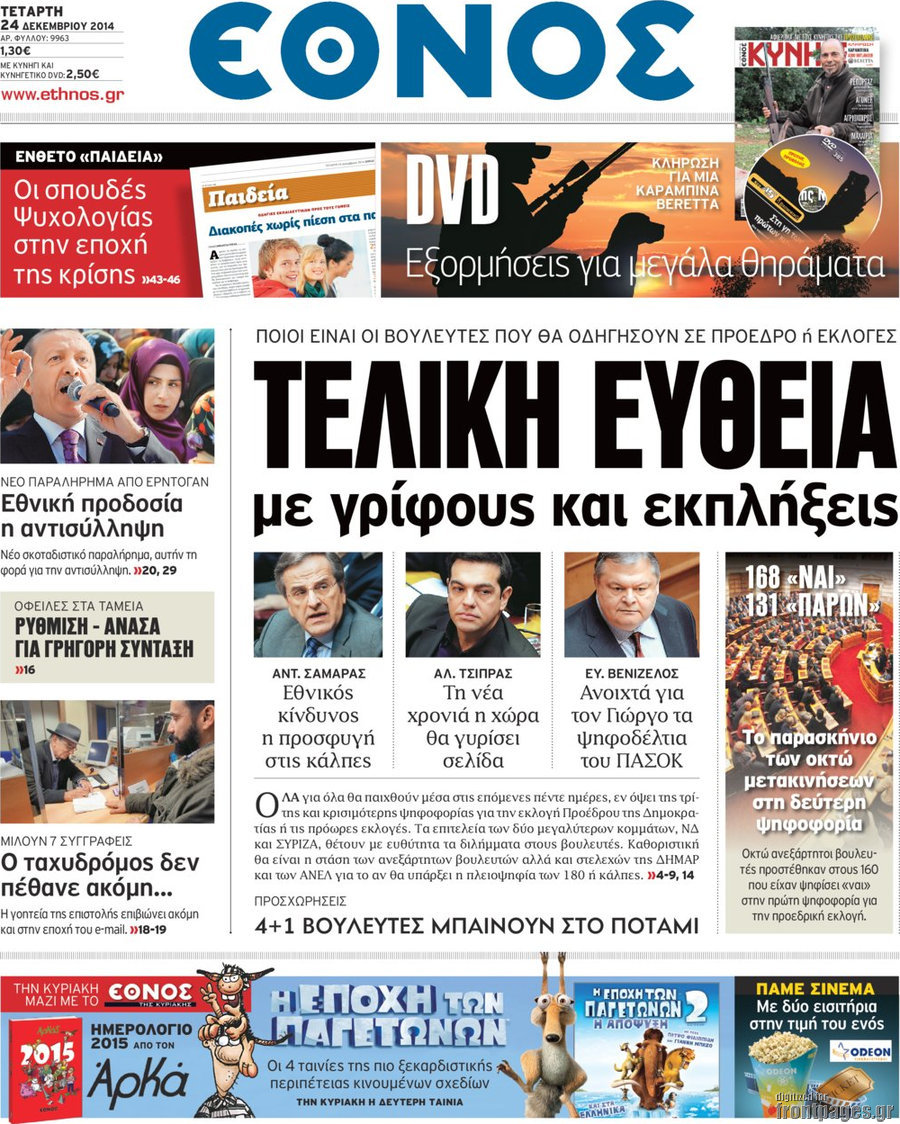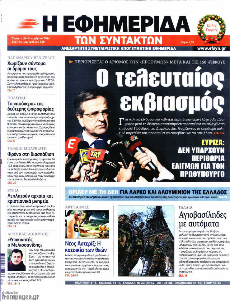 Οι πολιτικές εφημερίδες Enikos Newsroom 07:48, Τετάρτη 24 Δεκεμβρίου 2014 Media Διαβάστε τα πρωτοσέλιδα των πολιτικών εφημερίδων: ΠΟΛΙΤΙΚΕΣ ΕΦΗΜΕΡΙΔΕΣ ΠΡΩΤΟΣΕΛΙΔΑ Μοιράσου το: σχολίασε κι εσύ (0 σχόλια) Ακολουθήστε το enikos.gr στο Google News και μάθετε πρώτοι όλες τις ειδήσεις Δείτε όλες τις τελευταίες ειδήσεις από την Ελλάδα και τον Κόσμο στο enikos.gr Ειδήσεις Ροή Ειδήσεων 17 λεπτά πριν Αγρότες από το μπλόκο Νίκαιας κλείνουν τη Δευτέρα τις σήραγγες των Τεμπών για τα φορτηγά – Τι αποφάσισαν 4 ώρες πριν Μητσοτάκης σε αγρότες: Είμαστε ανοιχτοί στον διάλογο, αλλά όχι στο παράλογο – Η διεκδίκηση αιτημάτων οφείλει να γίνεται με σεβασμό στο κοινωνικό σύνολο 3 ώρες πριν Κηφισιά: Δύο συλλήψεις για ληστεία με λεία 180.000 ευρώ – Βίντεο ντοκουμέντα από τη δράση των συλληφθέντων 2 ώρες πριν Ρωσία: Δεν προετοιμάζεται συνάντηση Αμερικανών, Ρώσων και Ουκρανών απεσταλμένων, ανακοίνωσε το Κρεμλίνο 5 ώρες πριν Η οικογενειακή διαμάχη των Μπέκαμ: Το block από τον Μπρούκλιν και η απόφαση να περάσει τα Χριστούγεννα με τους δισεκατομμυριούχους γονείς της συζύγου του 4 ώρες πριν Τα άστρα ευνοούν σκανδαλωδώς 4 ζώδια – «Εμφανίζονται ξαφνικά ευκαιρίες γιατί αποφασίζετε να αφήσετε πίσω το παρελθόν» 3 ώρες πριν Προπονήτρια γυμναστικής που έχασε 9 κιλά αποκαλύπτει: «Αυτοί είναι οι 5 παράγοντες που εμποδίζουν την απώλεια βάρους» 2 ώρες πριν Οι άνθρωποι που στρώνουν το κρεβάτι τους κάθε πρωί, διαθέτουν αυτές τις 8 κρυφές δυνάμεις 1 ημέρα πριν Enerwave: Το νέο «ρεύμα» στη λιανική ενέργειας που αλλάζει την εμπειρία του καταναλωτή 4 λεπτά πριν Θεσσαλονίκη: Οι αγρότες δεν άνοιξαν τις μπάρες στα διόδια του Ωραιοκάστρου, μοιράζουν όσπρια και κηπευτικά – Κλειστή η εθνική στα Μάλγαρα 12 λεπτά πριν Ολυμπιακός και Μεντιλίμπαρ «έδωσαν τα χέρια» έως το 2027 17 λεπτά πριν Αγρότες από το μπλόκο Νίκαιας κλείνουν τη Δευτέρα τις σήραγγες των Τεμπών για τα φορτηγά – Τι αποφάσισαν 20 λεπτά πριν Άκης Σκέρτσος: Τι έγινε τελικά με την Έκθεση Πισσαρίδη; 28 λεπτά πριν Αττική: Σε ποια σημεία εγκαταστάθηκαν οι πρώτες «έξυπνες κάμερες» – Πώς θα στέλνονται τα πρόστιμα ENIKOS NETWORK Ο εγκέφαλός μας ξεπερνά ακόμα σε εξυπνάδα το ΑΙ – Ποιο είναι αυτό στο οποίο είμαστε καλύτεροι Φοράτε ψηλοτάκουνα παπούτσια; Ποδίατροι συμβουλεύουν πόσο ψηλά επιτρέπεται να είναι και πώς να τα επιλέξετε Η επόμενη ημέρα για τις ελληνικές τράπεζες -Τι λένε κορυφαία στελέχη του κλάδου Χριστουγεννιάτικο τραπέζι: Πόσο θα αγοράσετε φέτος τη γαλοπούλα και το μοσχάρι – Πού κυμαίνονται οι τιμές για μελομακάρονα ... Χαρτογραφώντας το «σημείο χωρίς επιστροφή»: Για πρώτη φορά αποκαλύπτεται με λεπτομέρεια το ακανθώδες όριο της ατμόσφαιρας τ... Η Google καταργεί τη λειτουργία «dark web report» – Πώς θα μπορούν οι χρήστες να διαγράφουν τα δεδομένα τους περισσότερα 09:43 , Κυριακή 21 Δεκεμβρίου 2025 Το λάθος στην ταινία Die Hard που άφησε άναυδους τους θαυμαστές του Μπρους Γουίλις Ένας φανατικός των ταινιών άφησε άναυδους τους θαυμαστές του Die Hard, επισημαίνοντας τρία βασ... 08:13 , Κυριακή 21 Δεκεμβρίου 2025 Άγιος έρωτας: Ένας καταστροφικός σεισμός χτυπά τη Στέρνα Καταιγιστικές είναι οι εξελίξεις στα δυο τελευταία, συγκλονιστικά επεισόδια του 2025 της σειρά... 08:00 , Κυριακή 21 Δεκεμβρίου 2025 Σήμερα με τη Realnews: Ό,τι και αν αγοράσεις, σκανάρεις και κερδίζεις! Σήμερα με τη Realnews: Ό,τι και αν αγοράσεις, σκανάρεις και κερδίζεις! Με το PADU app, το κορυ... 07:00 , Κυριακή 21 Δεκεμβρίου 2025 Σήμερα με τη Realnews: Instyle, μαζί Drive και R