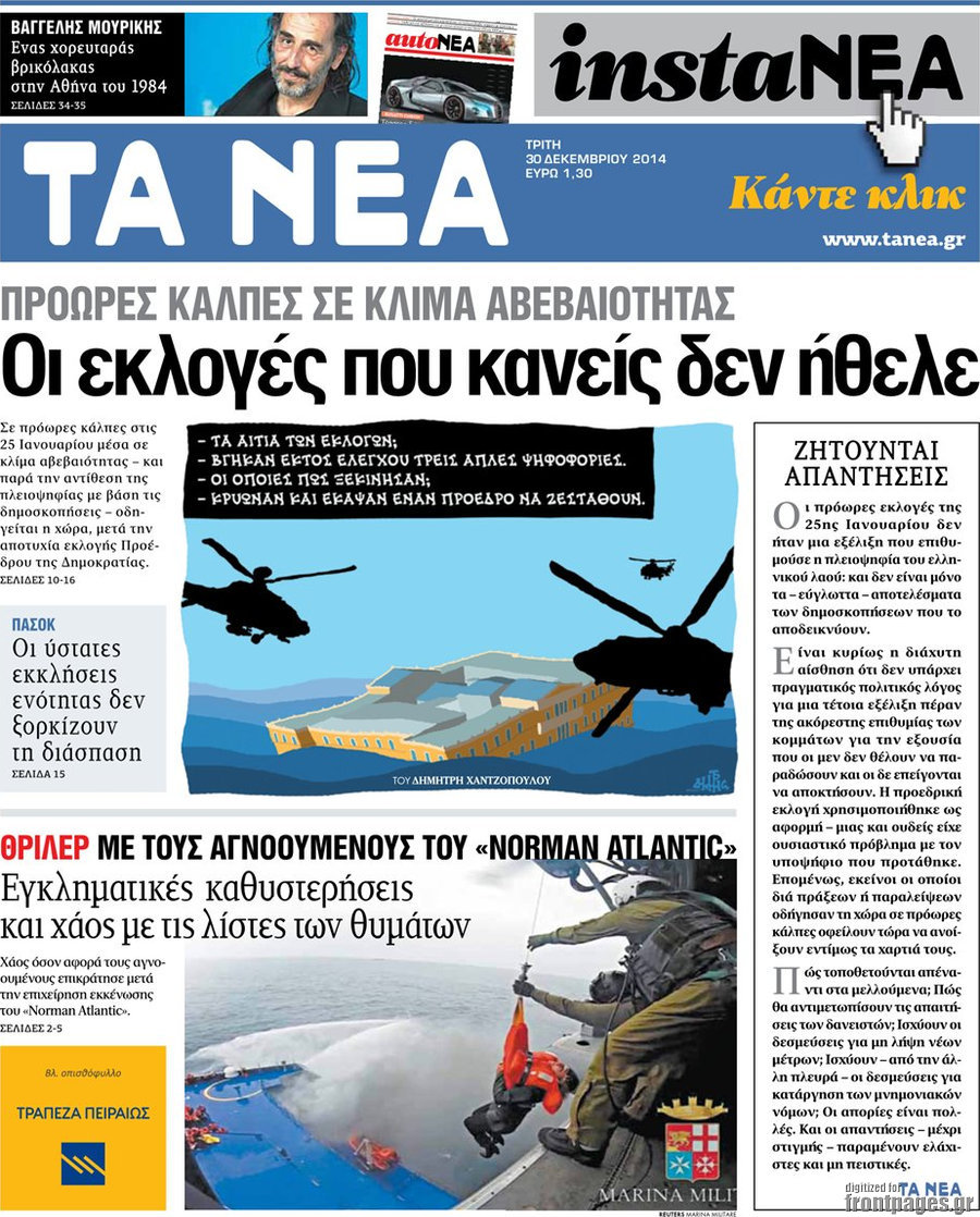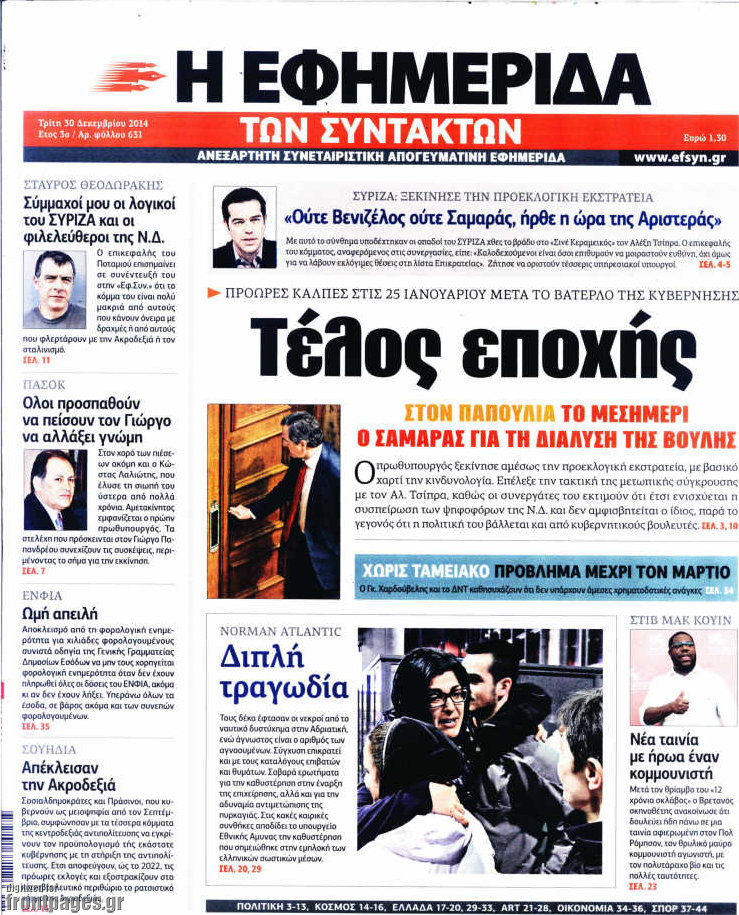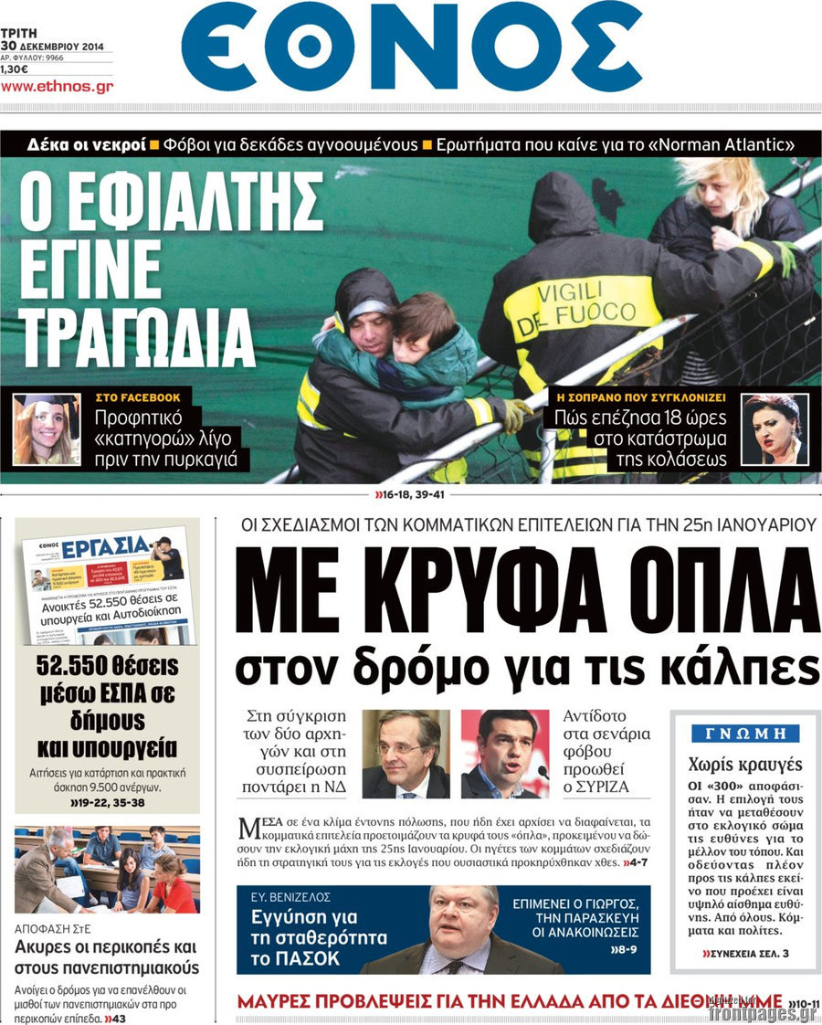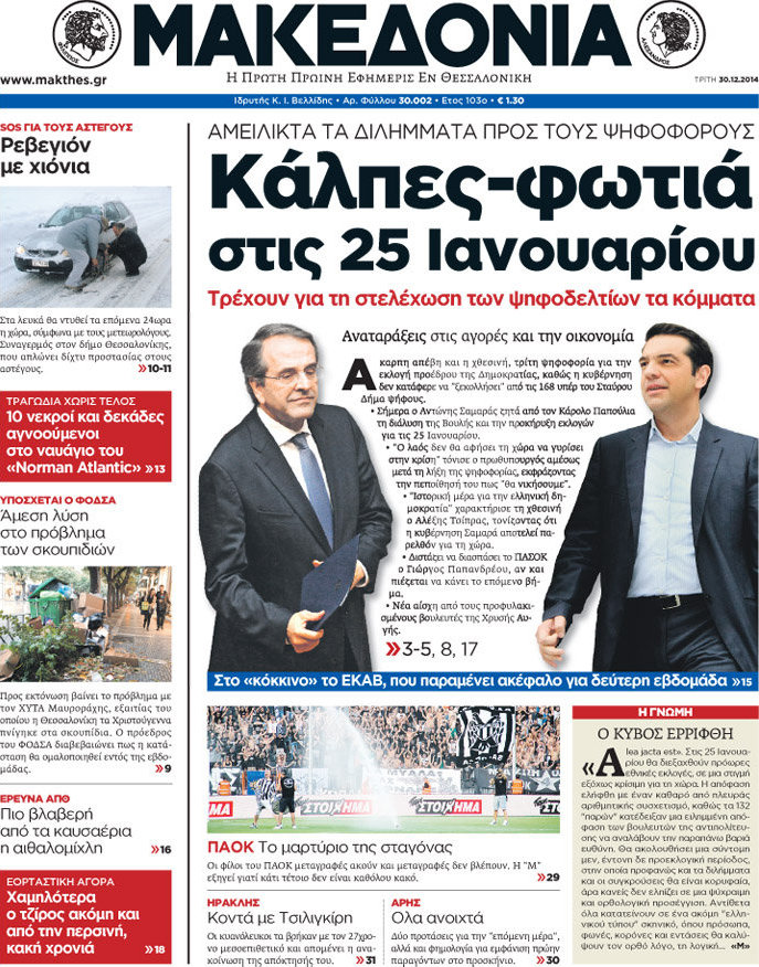 Οι πολιτικές εφημερίδες Enikos Newsroom 07:55, Τρίτη 30 Δεκεμβρίου 2014 Media Διαβάστε τα πρωτοσέλιδα των πολιτικών εφημερίδων: ΠΟΛΙΤΙΚΕΣ ΕΦΗΜΕΡΙΔΕΣ ΠΡΩΤΟΣΕΛΙΔΑ Μοιράσου το: σχολίασε κι εσύ (0 σχόλια) Ακολουθήστε το enikos.gr στο Google News και μάθετε πρώτοι όλες τις ειδήσεις Δείτε όλες τις τελευταίες ειδήσεις από την Ελλάδα και τον Κόσμο στο enikos.gr Ειδήσεις Ροή Ειδήσεων 2 ώρες πριν Μπλόκα: Οι αγρότες σηκώνουν τις μπάρες σε διόδια για τους εκδρομείς των Χριστουγέννων και μοιράζουν προϊόντα – Βίντεο 2 ώρες πριν Τσιάρας προς αγρότες: Τα μπλόκα και τα πείσματα δεν ωφελούν – Οι λύσεις περνούν μέσα από τον διάλογο 3 ώρες πριν Αρχεία Έπσταϊν: Οι συγκλονιστικές φωτογραφίες – Ο Μάικλ Τζάκσον, ο Μικ Τζάγκερ και ο Κέβιν Σπέισι ανάμεσα στους διάσημους που απεικονίζονται 57 λεπτά πριν Μαθητές διακινούσαν κοκαΐνη και χασίς σε σχολείο της Αττικής – 12 συλλήψεις 1 ώρα πριν Βέλγιο: Άγνωστοι έριξαν κόκκινη μπογιά στο προξενείο της Πολωνίας στις Βρυξέλλες 5 ώρες πριν Μία νέα «χρυσή» περίοδος αρχίζει για 3 ζώδια από σήμερα – «Μία αναπάντεχη ευκαιρία οδηγεί στην επιτυχία» 4 ώρες πριν Διαιτολόγος αποκαλύπτει 9 πρωινές συνήθειες που «λιώνουν» το κοιλιακό λίπος – «Υποστηρίζουν την υγιεινή απώλεια βάρους» 4 ώρες πριν Οι 7 φράσεις που δεν λένε ποτέ οι συναισθηματικά έξυπνοι άνθρωποι κατά τη διάρκεια ενός καβγά 7 ώρες πριν Enerwave: Το νέο «ρεύμα» στη λιανική ενέργειας που αλλάζει την εμπειρία του καταναλωτή 6 λεπτά πριν Μαρινάκης στον Realfm 97,8: Η κυβέρνηση σέβεται κάθε λογική διεκδίκηση των αγροτών, αλλά και το αίτημα των πολιτών να μην ταλαιπωρούνται 12 λεπτά πριν O Πάντερ MVP της 17ης αγωνιστικής στην Euroleague 21 λεπτά πριν Πέθανε η τραγουδίστρια Κλαούντια Ντελμέρ 28 λεπτά πριν Μία ανεκμετάλλευτη πηγή θα μπορούσε να προσφέρει ανεξάντλητη ενέργεια – Οι επιστήμονες ίσως γνωρίζουν πώς να την ξεκλειδώσουν 37 λεπτά πριν Θεσσαλονίκη: Ανήλικος που είχε εξαφανιστεί βρέθηκε στο σπίτι Τούρκων μετά από αστυνομική επιχείρηση ENIKOS NETWORK Η αποχή από την αναπαραγωγή παρατείνει τη ζωή στα ζώα, σύμφωνα με μελέτη – Τι ισχύει για τους ανθρώπους; Σημαντικές επαφές στις ΗΠΑ είχε ο υπουργός Υγείας Άδωνις Γεωργιάδης Ευλογιά αιγοπροβάτων: Παρατεταμένη επιζωοτία, αυστηρά μέτρα – Τι ισχύει για τον εμβολιασμό και την ανασύσταση του ζωικού κε... Τσιάρας προς αγρότες: Έχει ικανοποιηθεί το 74% των αιτημάτων – Τα μπλόκα και τα πείσματα δεν ωφελούν Χαρτογραφώντας το «σημείο χωρίς επιστροφή»: Για πρώτη φορά αποκαλύπτεται με λεπτομέρεια το ακανθώδες όριο της ατμόσφαιρας τ... Η Google καταργεί τη λειτουργία «dark web report» – Πώς θα μπορούν οι χρήστες να διαγράφουν τα δεδομένα τους περισσότερα 14:04 , Σάββατο 20 Δεκεμβρίου 2025 Η Realnews αυτής της Κυριακής (21/12/2025) Με τίτλο: «Ασπίδα προστασίας για την Ελλάδα» κυκλοφορεί, αυτήν την Κυριακή, η Realnews. Σημαντ... 12:53 , Σάββατο 20 Δεκεμβρίου 2025 Να μ’ αγαπάς: Το παρελθόν έρχεται στο φως – Καταιγιστικές εξελίξεις στα τελευταία επεισόδια του 2025 Ο Άγγελος αποκαλύπτεται, η Φωτεινή ανησυχεί για τον Λευτέρη και η Ζωή έρχεται αντιμέτωπη με το... 11:41 , Σάββατο 20 Δεκεμβρίου 2025 «Η αγάπη δεν χάνεται ποτέ»: Η μικρού μήκους ταινία κινουμένων σχεδίων που θέτει ερωτήματα για τη ζωή και τον θάνατο Ο θάνατος είναι ένα από τα πιο σκληρά θέματα που καλείται να διαχειριστεί κάποιος στη διάρκεια... 09:30 , Σάββατο 20 Δεκεμβρίου 2025 «Porto Leone: Στη γειτονιά με τα κόκκινα φανάρια» – Ο Χρόνης αποκαλύπτει στην Αλεξάνδρα το μυστικό για το παιδί τ