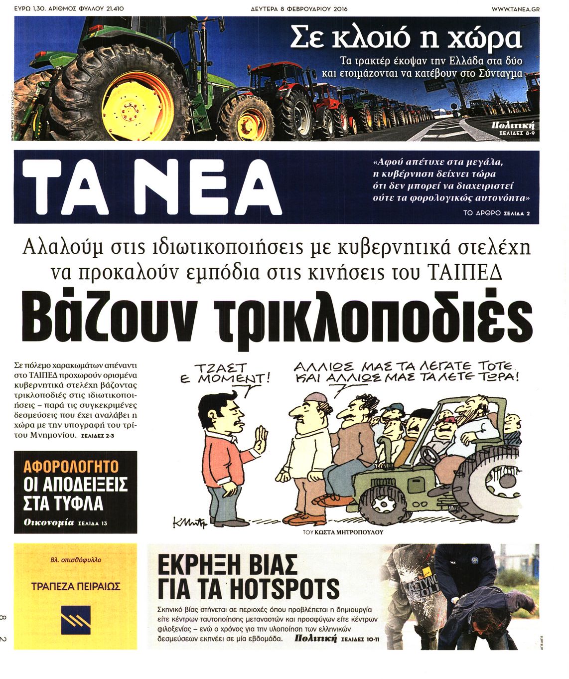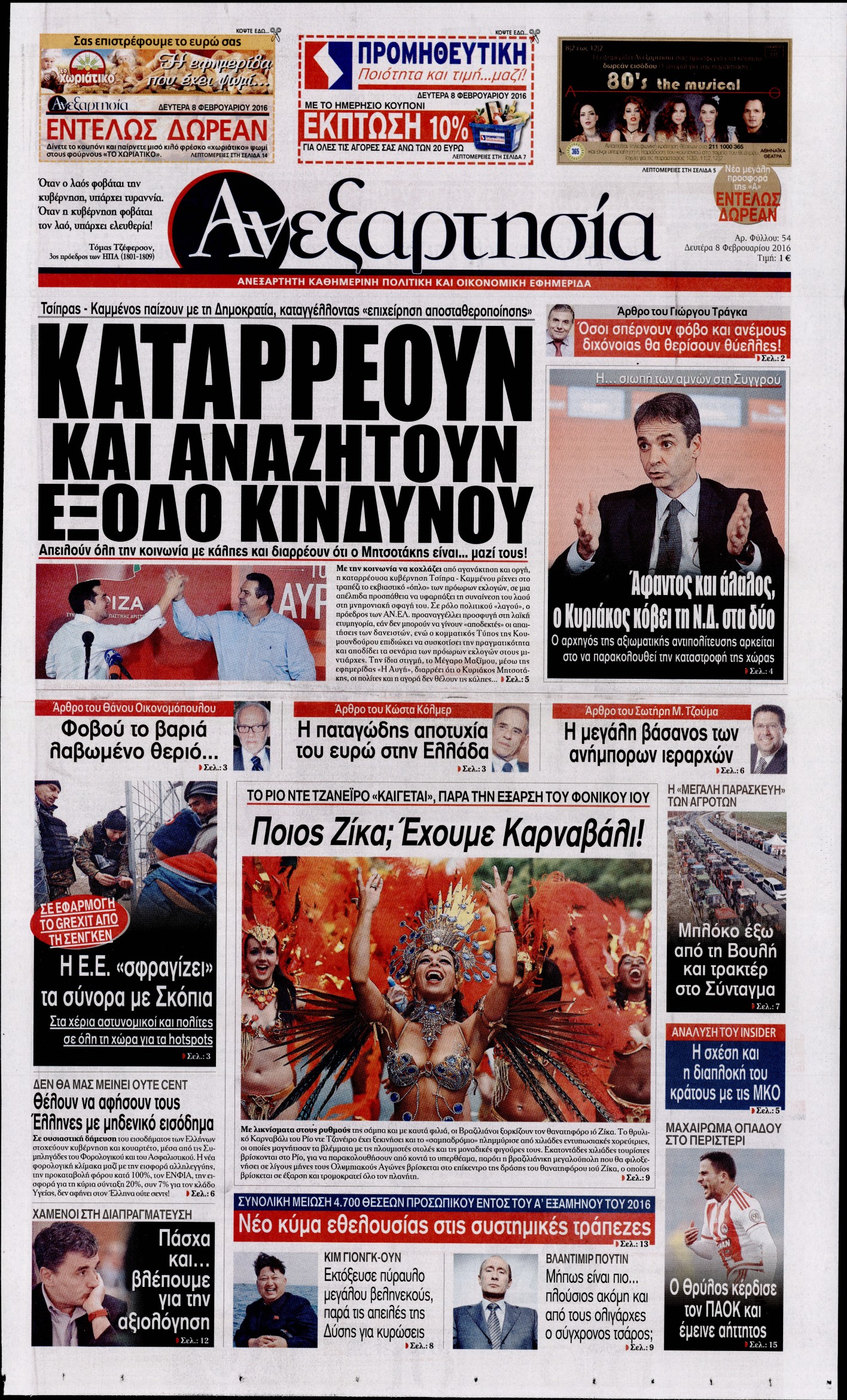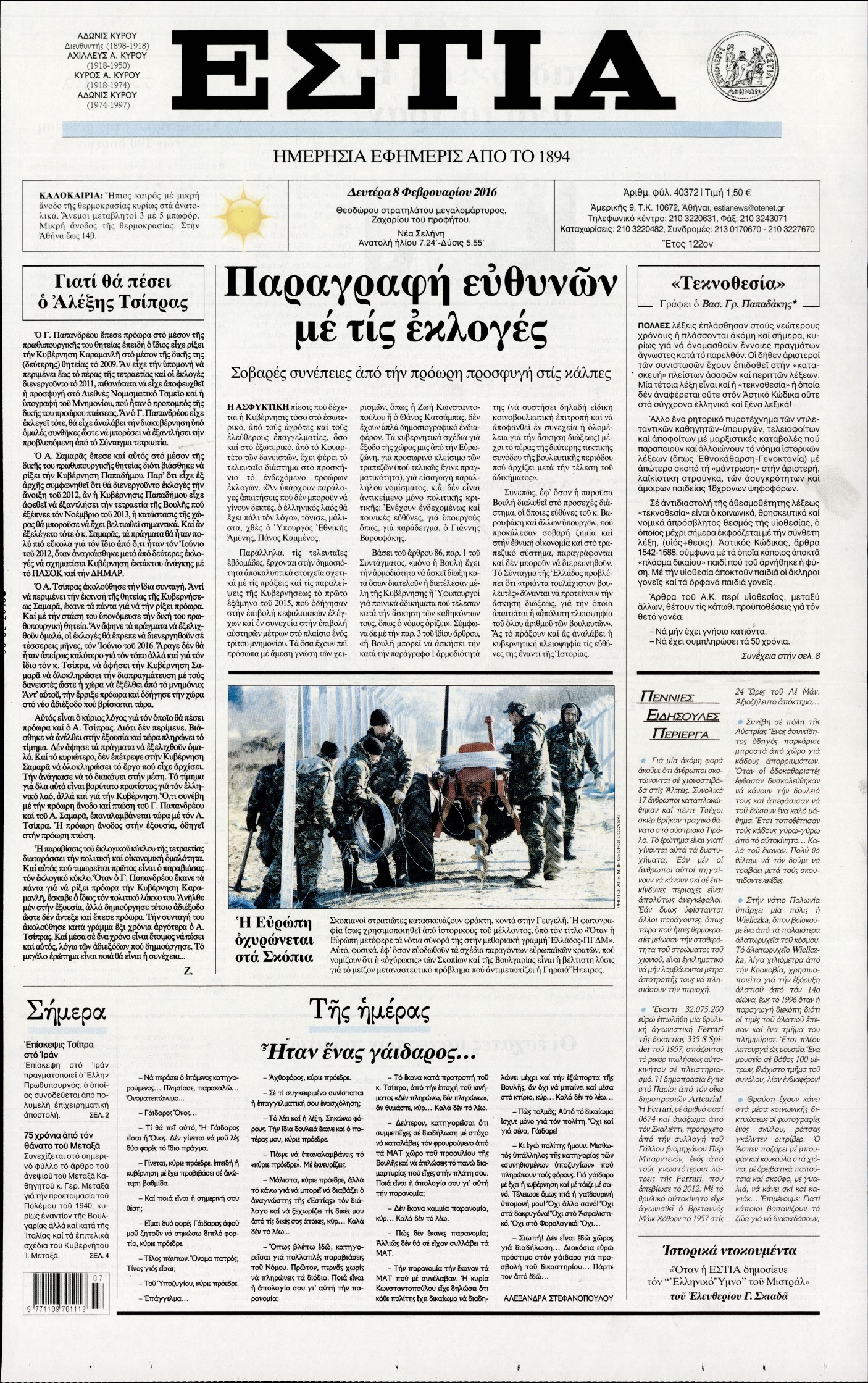 Οι πολιτικές εφημερίδες 8-2-2016 Enikos Newsroom 06:10, Δευτέρα 08 Φεβρουαρίου 2016 Media Διαβάστε τα σημερινά πρωτοσέλιδα των πολιτικών εφημερίδων: ΠΟΛΙΤΙΚΕΣ ΕΦΗΜΕΡΙΔΕΣ ΠΡΩΤΟΣΕΛΙΔΑ Μοιράσου το: σχολίασε κι εσύ (0 σχόλια) Ακολουθήστε το enikos.gr στο Google News και μάθετε πρώτοι όλες τις ειδήσεις Δείτε όλες τις τελευταίες ειδήσεις από την Ελλάδα και τον Κόσμο στο enikos.gr Ειδήσεις Ροή Ειδήσεων 4 ώρες πριν Χριστούγεννα στα μπλόκα: Επιμένουν στις κινητοποιήσεις τους οι αγρότες – Ανοίγουν τα διόδια το Σαββατοκύριακο 4 ώρες πριν Ουκρανία: Η άνευ προηγουμένου επίθεση σε ρωσικό τάνκερ στη Μεσόγειο και το μήνυμα προς στον Πούτιν – Το «μακρύ χέρι» του Κιέβου 3 ώρες πριν Πούτιν: Τα μηνύματα σε Ευρώπη και ΝΑΤΟ από το μαραθώνιο «σόου» του – Η απαίτηση για «σεβασμό» και η ειρήνη «με τους όρους» της Μόσχας 4 ώρες πριν Τραμπ: Δεν αποκλείει την πιθανότητα ενός πολέμου στη Βενεζουέλα – «Ο Μαδούρο ξέρει καλύτερα από τον καθένα τι ακριβώς θέλω» 5 ώρες πριν Συνεχίζει να προκαλεί ο Μίτσκοσκι: «Για μένα το όνομα Μακεδονία είναι ιερό» 3 ώρες πριν Ανακαλύφθηκαν αρχαία χρυσά νομίσματα 2.200 ετών που απεικονίζουν τον θεό Απόλλωνα – Η άγνωστη σύνδεση με τον Φίλιππο Β΄ της Μακεδονίας 4 ώρες πριν Ύπνος: Μια κρυφή κατάσταση του εγκεφάλου πριν από τον ύπνο μπορεί να είναι το “κλειδί” για υψηλή ευφυΐα και δημιουργικότητα 5 ώρες πριν Αριθμολογία: Οι άνθρωποι που έχουν γεννηθεί αυτές τις 4 ημερομηνίες, συχνά παρεξηγούνται – «Η καλοσύνη τους κρύβει τεράστια δύναμη» 6 ώρες πριν Ξεχάστε το καθάρισμα το Σαββατοκύριακο: Ο «κανόνας των 20 λεπτών» που θα σας λύσει τα χέρια 14 λεπτά πριν Εξάρχεια: Ένταση με μολότοφ, χημικά και κρότου λάμψης 30 λεπτά πριν ΗΠΑ: Τραγωδία στην Αλαμπάμα – Σκότωσε την δημοσιογράφο σύζυγό του και αυτοκτόνησε μπροστά στον 3χρονο γιο τους 44 λεπτά πριν Πρόταση γάμου στο ΣΕΦ κατά την διάρκεια του αγώνα Ολυμπιακός-Βιλερμπάν – Δείτε βίντεο 59 λεπτά πριν Euroleague: Επέστρεψε στις νίκες ο Ολυμπιακός, πήρε την ματσάρα της χρονιάς η Μπάρτσα – Τα αποτελέσματα και η βαθμολογία 1 ώρα πριν Συρία: Μαζικά πλήγματα των ΗΠΑ σε θέσεις του Ισλαμικού Κράτους – Χέγκσεθ: «Δεν είναι αρχή πολέμου, είναι μια δήλωση εκδίκησης» για το θάνατο των στρατιωτών μας ENIKOS NETWORK Το ΕΚΑΒ τιμήθηκε από την Ακαδημία Αθηνών για τα 40 χρόνια προσφοράς του Έχετε πραγματικά μεγάλη καρδιά; 10 χαρακτηριστικά όσων έχουν καλοσύνη Αναστολή μέτρων αναγκαστικής εκτέλεσης για κτηνοτρόφους που πλήττονται από την ευλογιά των αιγοπροβάτων Πλήρης επάρκεια προϊόντων στις λαϊκές της Αττικής, παρά τις αγροτικές κινητοποιήσεις – Τι απαντούν οι πωλητές Χαρτογραφώντας το «σημείο χωρίς επιστροφή»: Για πρώτη φορά αποκαλύπτεται με λεπτομέρεια το ακανθώδες όριο της ατμόσφαιρας τ... Η Google καταργεί τη λειτουργία «dark web report» – Πώς θα μπορούν οι χρήστες να διαγράφουν τα δεδομένα τους περισσότερα 22:42 , Παρασκευή 19 Δεκεμβρίου 2025 Γιώργος Γιαννόπουλος για “Το σόι σου”: “Είναι ευτυχία και ευλογία αυτή η σειρά” «Είναι ευτυχία και ευλογία η συγκυρία αυτής της σειράς», θα πει ο Γιώργος Γιαννόπουλος -ο αγαπ... 20:37 , Παρασκευή 19 Δεκεμβρίου 2025 Don’t Forget The Lyrics: Η Έλλη Κοκκίνου υποδέχεται 4 παίκτες που θα κάνουν τα πάντα για να μη χάσουν ούτε… μισή λέξη από τους στίχους Το «Don’t Forget The Lyrics» επιστρέφει απόψε, Παρασκευή 19 Δεκεμβρίου, στις 21:00 με νέο επει... 19:31 , Παρασκευή 19 Δεκεμβρίου 2025 GNTM: Απόψε ο μεγάλος τελικός για τους 4 φιναλίστ Έπειτα από μήνες γεμάτους μόδα, δημιουργία κ