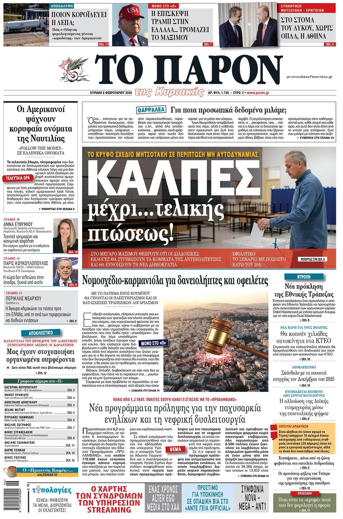 Διαβάστε τα πρωτοσέλιδα από τις πολιτικές εφημερίδες, σήμερα 8/2/2026.