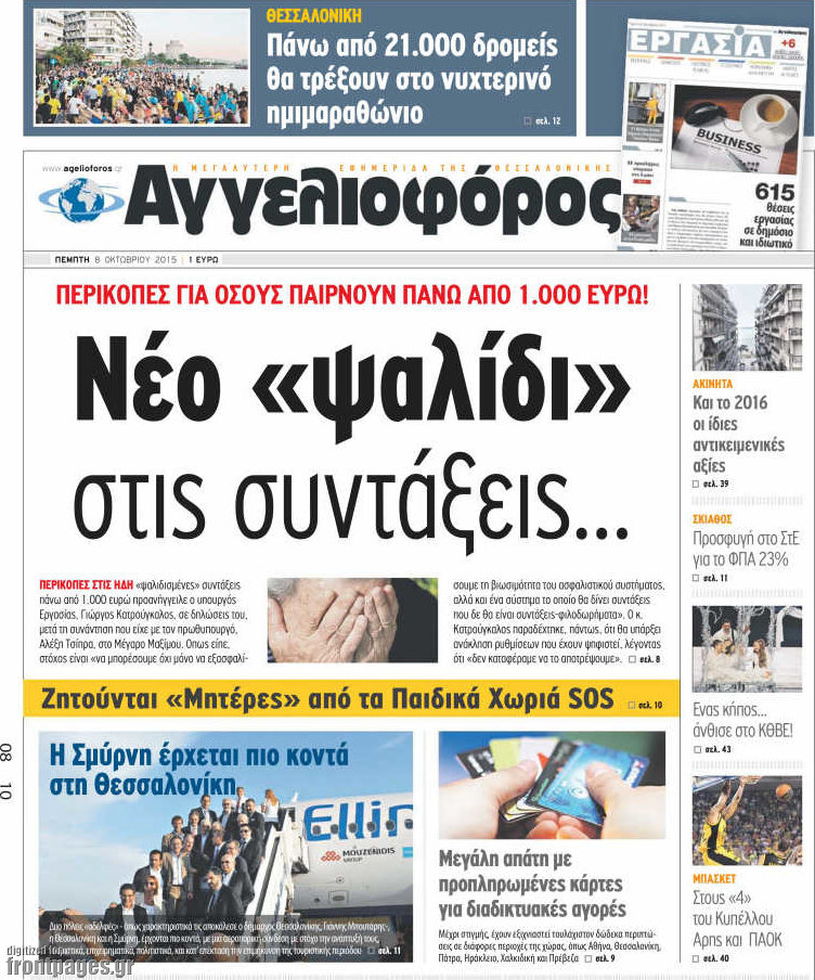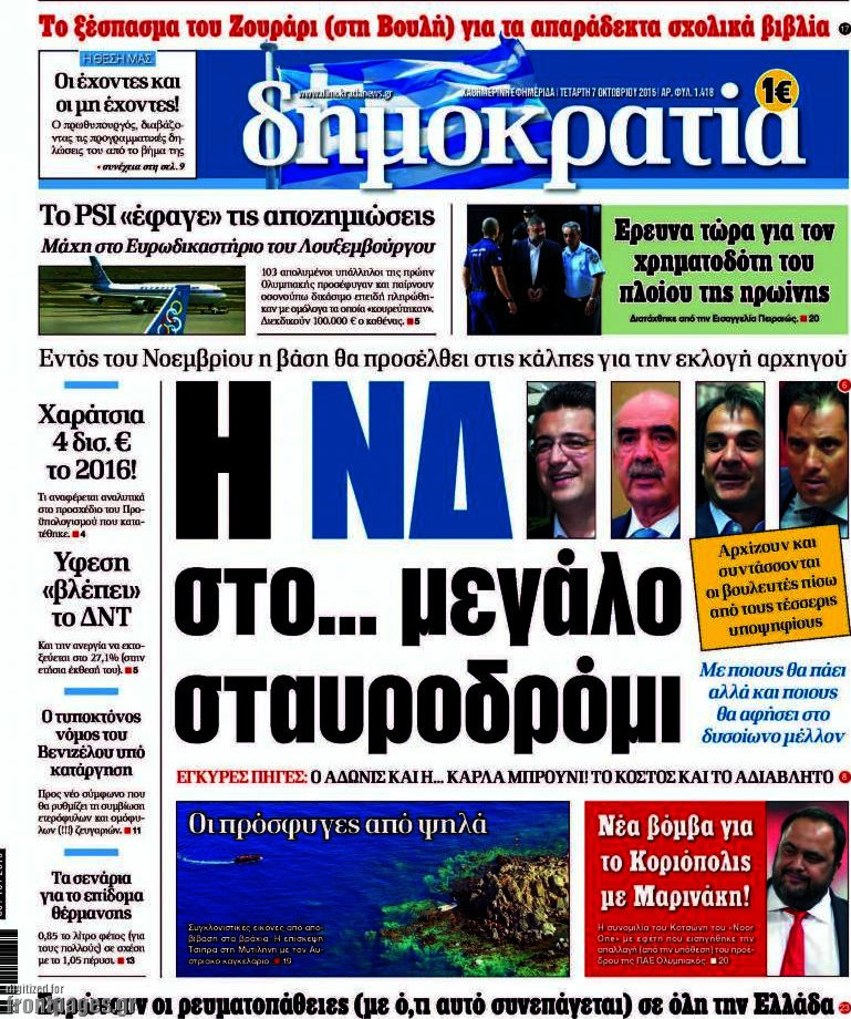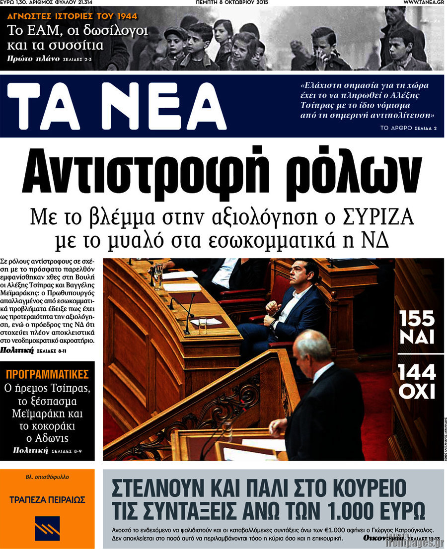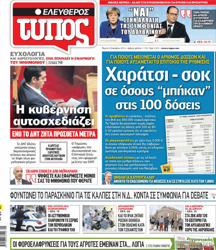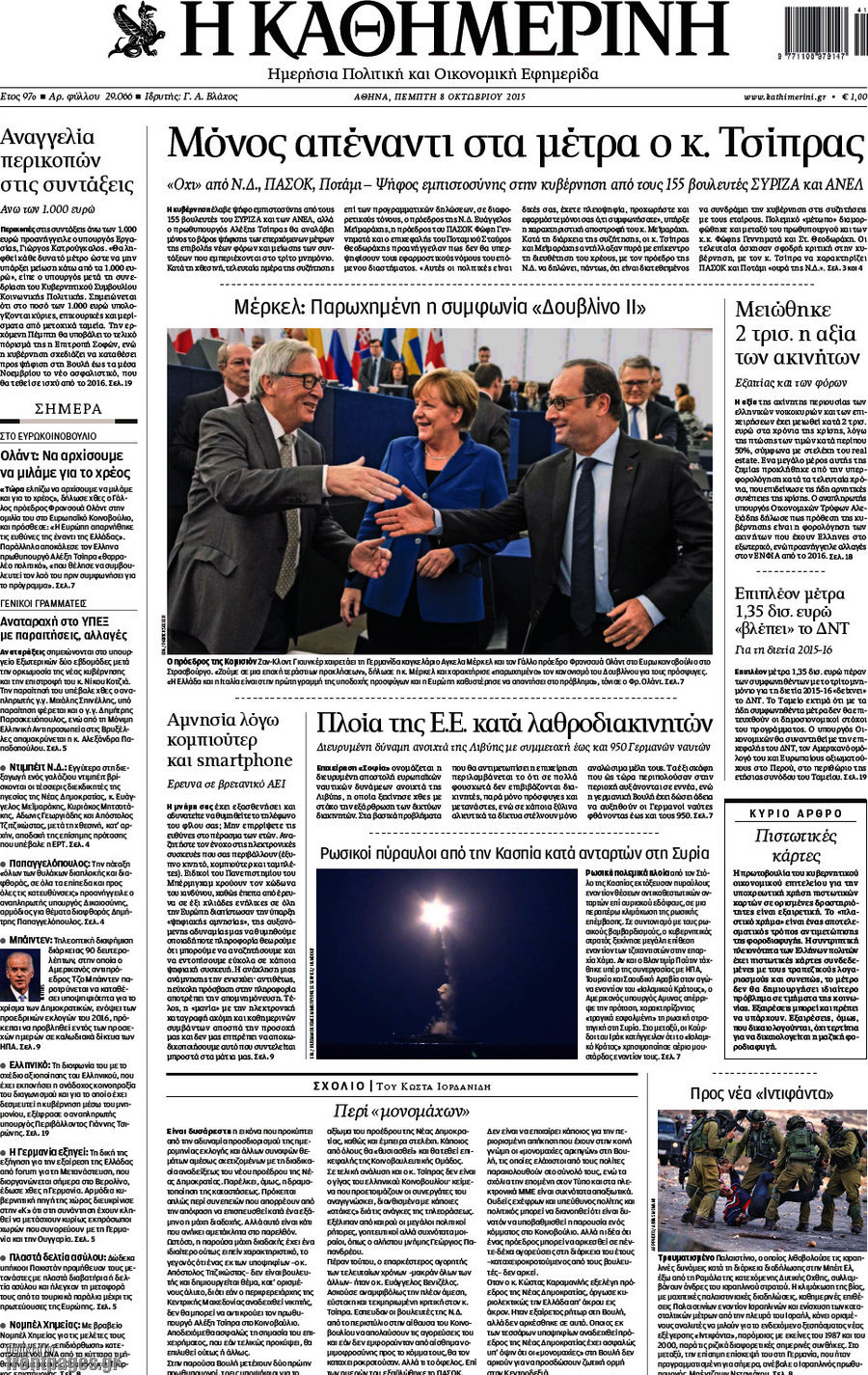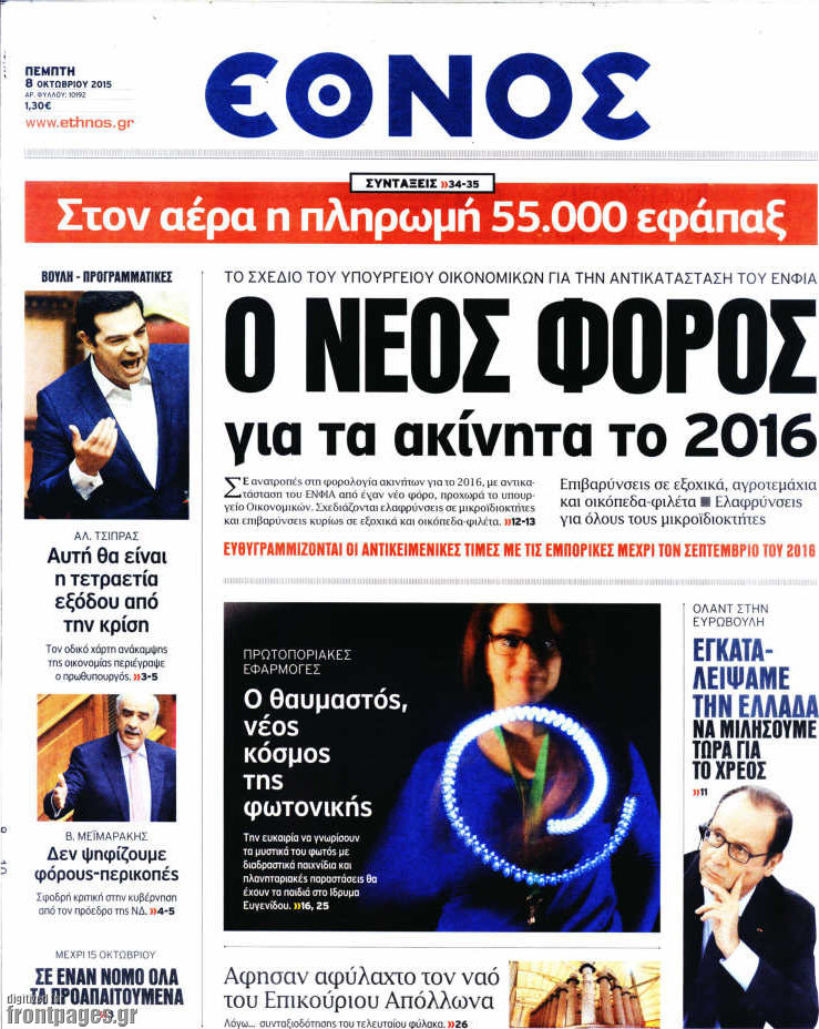 Οι πολιτικές εφημερίδες 8/10/2015 Enikos Newsroom 07:43, Πέμπτη 08 Οκτωβρίου 2015 Media Διαβάστε τα σημερινά πρωτοσέλιδα των πολιτικών εφημερίδων: ΠΟΛΙΤΙΚΕΣ ΕΦΗΜΕΡΙΔΕΣ ΠΡΩΤΟΣΕΛΙΔΑ Μοιράσου το: σχολίασε κι εσύ (0 σχόλια) Ακολουθήστε το enikos.gr στο Google News και μάθετε πρώτοι όλες τις ειδήσεις Δείτε όλες τις τελευταίες ειδήσεις από την Ελλάδα και τον Κόσμο στο enikos.gr Ειδήσεις Ροή Ειδήσεων 1 ώρα πριν Πώς δρούσε το κύκλωμα που διακινούσε ναρκωτικά σε σχολεία – Υπέβαλαν σε βασανιστήρια όσους δεν τηρούσαν τους «κανόνες πειθαρχίας» 2 ώρες πριν Αγρότες: Γιορτές στα μπλόκα με ανοιχτά διόδια – Δικογραφία στα Ιωάννινα για το σήκωμα των μπαρών 5 ώρες πριν Αρχεία Έπσταϊν: Οι συγκλονιστικές φωτογραφίες – Ο Μάικλ Τζάκσον, ο Μικ Τζάγκερ και ο Κέβιν Σπέισι ανάμεσα στους διάσημους που απεικονίζονται 20 λεπτά πριν NBC: Ο Νετανιάχου σχεδιάζει να ενημερώσει τον Τραμπ για πιθανά νέα πλήγματα εναντίον του Ιράν 30 λεπτά πριν Αττική: Εξαρθρώθηκε εγκληματική οργάνωση που έκλεβε οχήματα, τα παραποιούσε και τα μεταπωλούσε σε πολίτες – Πώς δρούσε το κύκλωμα 2 ώρες πριν Η τύχη χαμογελά σε 3 ζώδια έως τις 28 Δεκεμβρίου – «Προσέξτε τις επιλογές σας και η επιμονή σας θα ανταμειφθεί» 6 ώρες πριν Διαιτολόγος αποκαλύπτει 9 πρωινές συνήθειες που «λιώνουν» το κοιλιακό λίπος – «Υποστηρίζουν την υγιεινή απώλεια βάρους» 3 ώρες πριν Μία ανεκμετάλλευτη πηγή θα μπορούσε να προσφέρει ανεξάντλητη ενέργεια – Οι επιστήμονες ίσως γνωρίζουν πώς να την ξεκλειδώσουν 9 ώρες πριν Enerwave: Το νέο «ρεύμα» στη λιανική ενέργειας που αλλάζει την εμπειρία του καταναλωτή 1 λεπτό πριν Νιούκαστλ – Τσέλσι 2-2: Αλύγιστοι οι Λονδρέζοι 12 λεπτά πριν Μικαέλα Μπέντχαους: Ο πρώτος άνθρωπος σε αναπηρικό αμαξίδιο που ταξίδεψε στο διάστημα – ΒΙΝΤΕΟ 20 λεπτά πριν NBC: Ο Νετανιάχου σχεδιάζει να ενημερώσει τον Τραμπ για πιθανά νέα πλήγματα εναντίον του Ιράν 30 λεπτά πριν Αττική: Εξαρθρώθηκε εγκληματική οργάνωση που έκλεβε οχήματα, τα παραποιούσε και τα μεταπωλούσε σε πολίτες – Πώς δρούσε το κύκλωμα 38 λεπτά πριν Κωνσταντίνος Αργυρός: «Δεν θέλω να ασχοληθώ με την πολιτική σε αυτή τη φάση – Μου έχουν γίνει προτάσεις» ENIKOS NETWORK Γιατί πρέπει να ζητάμε χάρες; Ποιο είναι το φαινόμενο Ben Franklin που κάνει τους άλλους να μας συμπαθούν Η αποχή από την αναπαραγωγή παρατείνει τη ζωή στα ζώα, σύμφωνα με μελέτη – Τι ισχύει για τους ανθρώπους; Στα ύψη ο χρυσός – Νέο ρεκόρ στην τιμή της λίρας, πόσο πωλείται Τέλη κυκλοφορίας 2026: Προσοχή στην προθεσμία εξόφλησής τους – Πώς διαμορφώνονται τα πρόστιμα σε περίπτωση καθυστέρησης Χαρτογραφώντας το «σημείο χωρίς επιστροφή»: Για πρώτη φορά αποκαλύπτεται με λεπτομέρεια το ακανθώδες όριο της ατμόσφαιρας τ... Η Google καταργεί τη λειτουργία «dark web report» – Πώς θα μπορούν οι χρήστες να διαγράφουν τα δεδομένα τους περισσότερα 14:04 , Σάββατο 20 Δεκεμβρίου 2025 Η Realnews αυτής της Κυριακής (21/12/2025) Με τίτλο: «Ασπίδα προστασίας για την Ελλάδα» κυκλοφορεί, αυτήν την Κυριακή, η Realnews. Σημαντ... 12:53 , Σάββατο 20 Δεκεμβρίου 2025 Να μ’ αγαπάς: Το παρελθόν έρχεται στο φως – Καταιγιστικές εξελίξεις στα τελευταία επεισόδια του 2025 Ο Άγγελος αποκαλύπτεται, η Φωτεινή ανησυχεί για τον Λευτέρη και η Ζωή έρχεται αντιμέτωπη με το... 11:41 , Σάββατο 20 Δεκεμβρίου 2025 «Η αγάπη δεν χάνεται ποτέ»: Η μικρού μήκους ταινία κινουμένων σχεδίων που θέτει ερωτήματα για τη ζωή και τον θάνατο Ο θάνατος είναι ένα από τα πιο σκληρά θέματα που καλείται να διαχειριστεί κάποιος στη διά