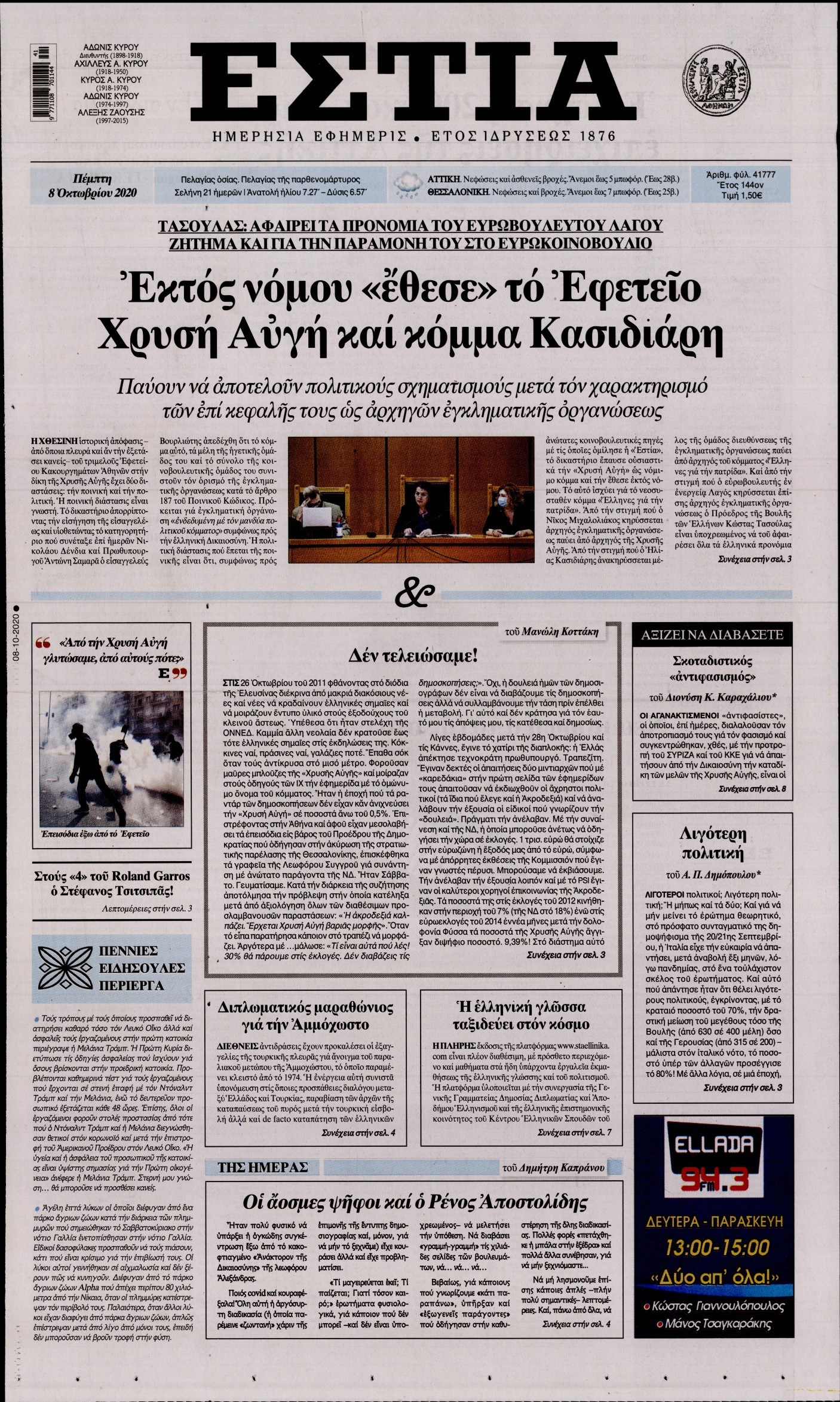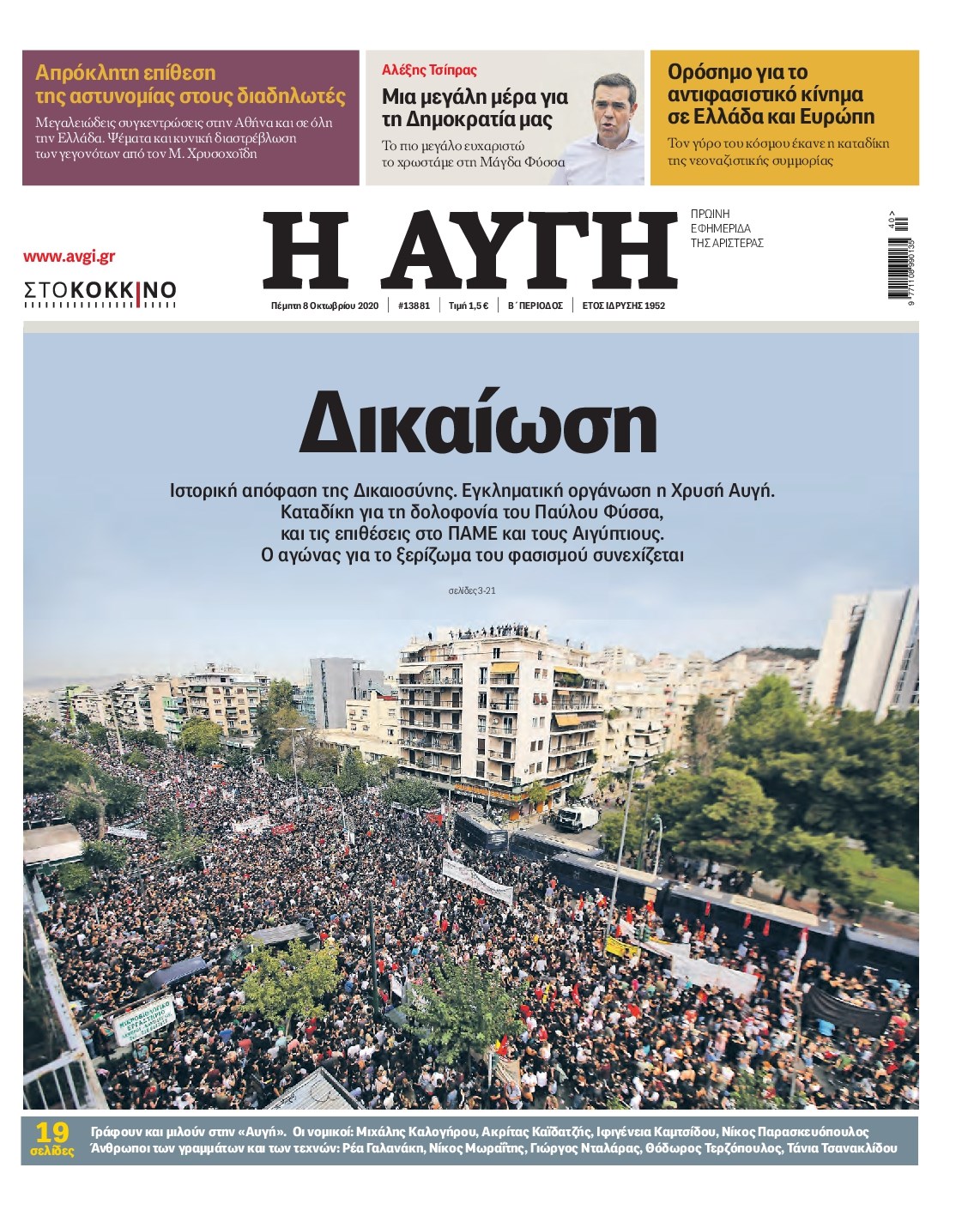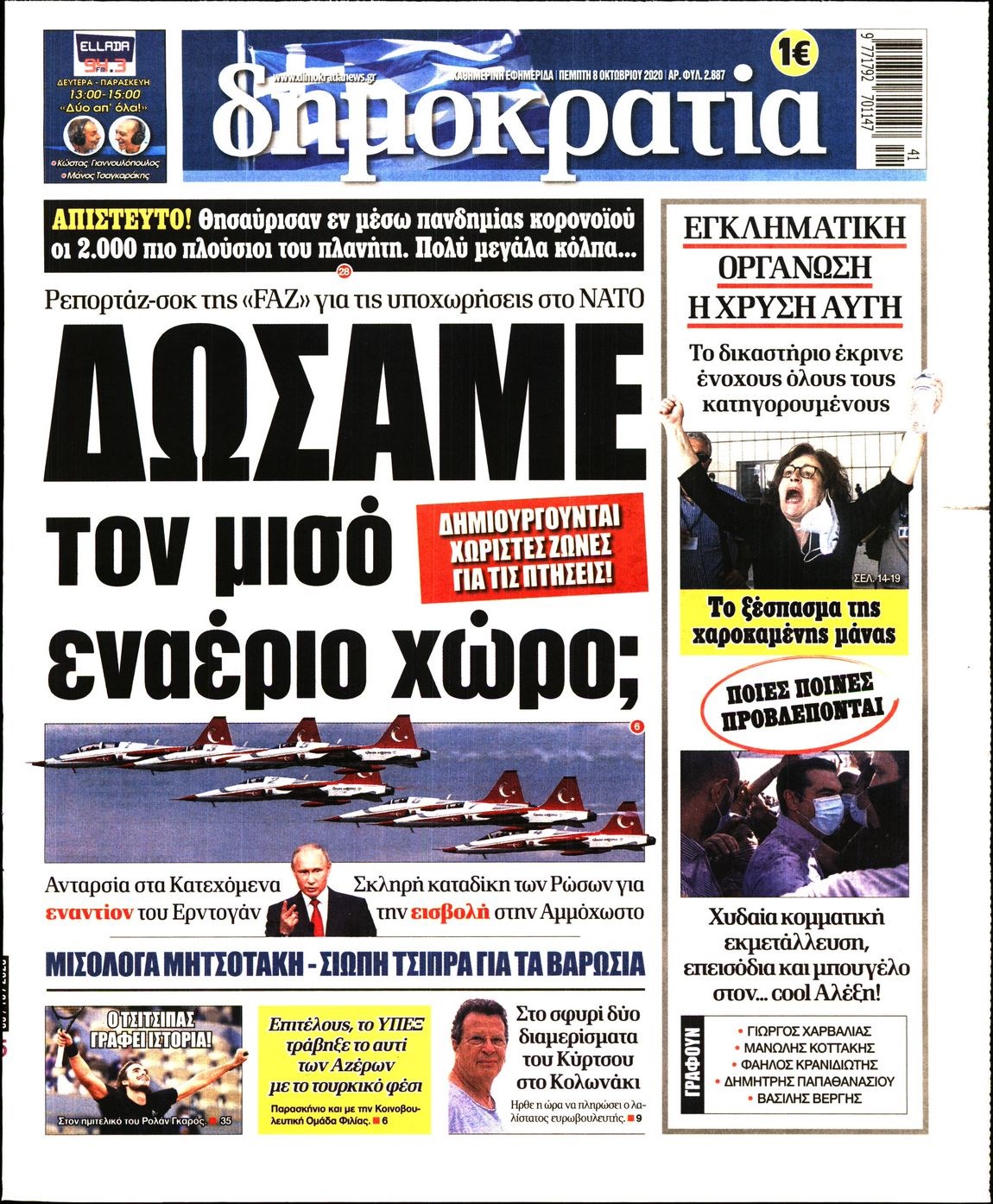 Οι πολιτικές εφημερίδες 8/10/2020 Διονύσης Νίκκας 06:09, Πέμπτη 08 Οκτωβρίου 2020 Media Διαβάστε τα πρωτοσέλιδα των πολιτικών εφημερίδων… ΠΟΛΙΤΙΚΕΣ ΕΦΗΜΕΡΙΔΕΣ ΠΡΩΤΟΣΕΛΙΔΑ Μοιράσου το: σχολίασε κι εσύ (0 σχόλια) Ακολουθήστε το enikos.gr στο Google News και μάθετε πρώτοι όλες τις ειδήσεις Δείτε όλες τις τελευταίες ειδήσεις από την Ελλάδα και τον Κόσμο στο enikos.gr Ειδήσεις Ροή Ειδήσεων 2 ώρες πριν Μπλόκα: Οι αγρότες σηκώνουν τις μπάρες σε διόδια για τους εκδρομείς των Χριστουγέννων και μοιράζουν προϊόντα – Βίντεο 2 ώρες πριν Τσιάρας προς αγρότες: Τα μπλόκα και τα πείσματα δεν ωφελούν – Οι λύσεις περνούν μέσα από τον διάλογο 3 ώρες πριν Αρχεία Έπσταϊν: Οι συγκλονιστικές φωτογραφίες – Ο Μάικλ Τζάκσον, ο Μικ Τζάγκερ και ο Κέβιν Σπέισι ανάμεσα στους διάσημους που απεικονίζονται 54 λεπτά πριν Μαθητές διακινούσαν κοκαΐνη και χασίς σε σχολείο της Αττικής – 12 συλλήψεις 60 λεπτά πριν Βέλγιο: Άγνωστοι έριξαν κόκκινη μπογιά στο προξενείο της Πολωνίας στις Βρυξέλλες 5 ώρες πριν Μία νέα «χρυσή» περίοδος αρχίζει για 3 ζώδια από σήμερα – «Μία αναπάντεχη ευκαιρία οδηγεί στην επιτυχία» 3 ώρες πριν Διαιτολόγος αποκαλύπτει 9 πρωινές συνήθειες που «λιώνουν» το κοιλιακό λίπος – «Υποστηρίζουν την υγιεινή απώλεια βάρους» 4 ώρες πριν Οι 7 φράσεις που δεν λένε ποτέ οι συναισθηματικά έξυπνοι άνθρωποι κατά τη διάρκεια ενός καβγά 6 ώρες πριν Enerwave: Το νέο «ρεύμα» στη λιανική ενέργειας που αλλάζει την εμπειρία του καταναλωτή 3 λεπτά πριν Μαρινάκης στον Realfm 97,8: Η κυβέρνηση σέβεται κάθε λογική διεκδίκηση των αγροτών, αλλά και το αίτημα των πολιτών να μην ταλαιπωρούνται 9 λεπτά πριν O Πάντερ MVP της 17ης αγωνιστικής στην Euroleague 18 λεπτά πριν Πέθανε η τραγουδίστρια Κλαούντια Ντελμέρ 25 λεπτά πριν Μία ανεκμετάλλευτη πηγή θα μπορούσε να προσφέρει ανεξάντλητη ενέργεια – Οι επιστήμονες ίσως γνωρίζουν πώς να την ξεκλειδώσουν 34 λεπτά πριν Θεσσαλονίκη: Ανήλικος που είχε εξαφανιστεί βρέθηκε στο σπίτι Τούρκων μετά από αστυνομική επιχείρηση ENIKOS NETWORK Η αποχή από την αναπαραγωγή παρατείνει τη ζωή στα ζώα, σύμφωνα με μελέτη – Τι ισχύει για τους ανθρώπους; Σημαντικές επαφές στις ΗΠΑ είχε ο υπουργός Υγείας Άδωνις Γεωργιάδης Ευλογιά αιγοπροβάτων: Παρατεταμένη επιζωοτία, αυστηρά μέτρα – Τι ισχύει για τον εμβολιασμό και την ανασύσταση του ζωικού κε... Τσιάρας προς αγρότες: Έχει ικανοποιηθεί το 74% των αιτημάτων – Τα μπλόκα και τα πείσματα δεν ωφελούν Χαρτογραφώντας το «σημείο χωρίς επιστροφή»: Για πρώτη φορά αποκαλύπτεται με λεπτομέρεια το ακανθώδες όριο της ατμόσφαιρας τ... Η Google καταργεί τη λειτουργία «dark web report» – Πώς θα μπορούν οι χρήστες να διαγράφουν τα δεδομένα τους περισσότερα 14:04 , Σάββατο 20 Δεκεμβρίου 2025 Η Realnews αυτής της Κυριακής (21/12/2025) Με τίτλο: «Ασπίδα προστασίας για την Ελλάδα» κυκλοφορεί, αυτήν την Κυριακή, η Realnews. Σημαντ... 12:53 , Σάββατο 20 Δεκεμβρίου 2025 Να μ’ αγαπάς: Το παρελθόν έρχεται στο φως – Καταιγιστικές εξελίξεις στα τελευταία επεισόδια του 2025 Ο Άγγελος αποκαλύπτεται, η Φωτεινή ανησυχεί για τον Λευτέρη και η Ζωή έρχεται αντιμέτωπη με το... 11:41 , Σάββατο 20 Δεκεμβρίου 2025 «Η αγάπη δεν χάνεται ποτέ»: Η μικρού μήκους ταινία κινουμένων σχεδίων που θέτει ερωτήματα για τη ζωή και τον θάνατο Ο θάνατος είναι ένα από τα πιο σκληρά θέματα που καλείται να διαχειριστεί κάποιος στη διάρκεια... 09:30 , Σάββατο 20 Δεκεμβρίου 2025 «Porto Leone: Στη γειτονιά με τα κόκκινα φανάρια» – Ο Χρόνης αποκαλύπτει στην Αλεξάνδρα το μυστι