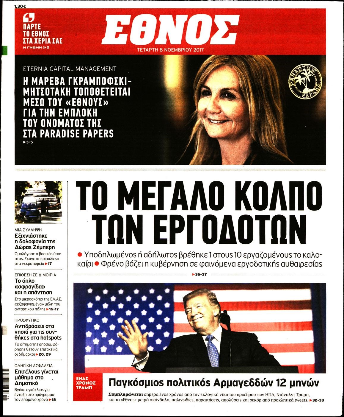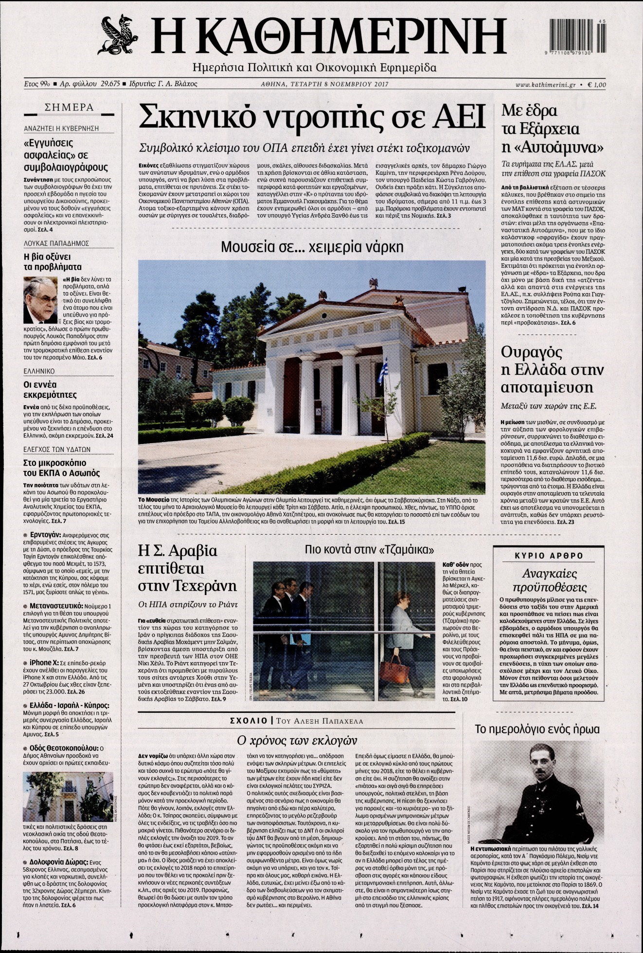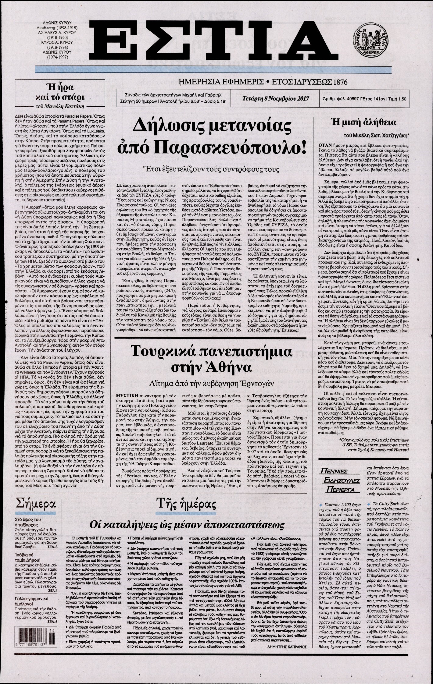 Οι πολιτικές εφημερίδες 8/11/2017 Enikos Newsroom 07:36, Τετάρτη 08 Νοεμβρίου 2017 Media Διαβάστε τα σημερινά πρωτοσέλιδα των πολιτικών εφημερίδων: ΠΟΛΙΤΙΚΕΣ ΕΦΗΜΕΡΙΔΕΣ ΠΡΩΤΟΣΕΛΙΔΑ Μοιράσου το: σχολίασε κι εσύ (0 σχόλια) Ακολουθήστε το enikos.gr στο Google News και μάθετε πρώτοι όλες τις ειδήσεις Δείτε όλες τις τελευταίες ειδήσεις από την Ελλάδα και τον Κόσμο στο enikos.gr Ειδήσεις Ροή Ειδήσεων 3 λεπτά πριν Υπόθεση Έπσταϊν: Το Υπουργείο Δικαιοσύνης δημοσιοποίησε μια σειρά από εξαιρετικά επεξεργασμένα αρχεία – «Λείπουν τα πιο σημαντικά έγγραφα», λένε οι Δημοκρατικοί 9 ώρες πριν Χριστούγεννα στα μπλόκα: Επιμένουν στις κινητοποιήσεις τους οι αγρότες – Ανοίγουν τα διόδια το Σαββατοκύριακο 2 ώρες πριν Σαρωτικοί οι έλεγχοι στους δρόμους ενόψει εορτών – Μπλόκα της τροχαίας σε κεντρικές αρτηρίες της Αττικής 9 ώρες πριν Πούτιν: Τα μηνύματα σε Ευρώπη και ΝΑΤΟ από το μαραθώνιο «σόου» του – Η απαίτηση για «σεβασμό» και η ειρήνη «με τους όρους» της Μόσχας 8 ώρες πριν Άνω Λιόσια: Πυροβολισμοί σε επιχείρηση με χαλιά – Εντοπίστηκαν 10 κάλυκες 2 ώρες πριν Αυγά: Πόσα μπορείτε να τρώτε την ημέρα με ασφάλεια για μέγιστη πρόσληψη πρωτεΐνης 2 ώρες πριν Τα ζώδια σήμερα, Σάββατο 20 Δεκεμβρίου: Παρθένοι, το σύμπαν σας δίνει το κλειδί 9 ώρες πριν Ανακαλύφθηκαν αρχαία χρυσά νομίσματα 2.200 ετών που απεικονίζουν τον θεό Απόλλωνα – Η άγνωστη σύνδεση με τον Φίλιππο Β΄ της Μακεδονίας 2 ώρες πριν Οπτική ψευδαίσθηση: Μόνο αν είσαι ο Σέρλοκ Χολμς θα βρεις τον αριθμό «87» σε 7 δευτερόλεπτα 3 λεπτά πριν Υπόθεση Έπσταϊν: Το Υπουργείο Δικαιοσύνης δημοσιοποίησε μια σειρά από εξαιρετικά επεξεργασμένα αρχεία – «Λείπουν τα πιο σημαντικά έγγραφα», λένε οι Δημοκρατικοί 5 λεπτά πριν Καιρός: Αλλαγή σκηνικού σήμερα με βροχές και πτώση της θερμοκρασίας – Οι προβλέψεις των μετεωρολόγων για τα Χριστούγεννα 13 λεπτά πριν ΟΝΕΧ – MEGATUGS: Ξεκίνησε η ναυπήγηση ρυμουλκών στην Ελλάδα – Προθάλαμος πολεμικών πλοίων – Δείτε φωτογραφίες και βίντεο 22 λεπτά πριν Φοινικούντα: Σήμερα απολογείται ο 30χρονος γιος γνωστού επιχειρηματία της Πλάκας 30 λεπτά πριν Οι αθλητικές μεταδόσεις 20/12/2025 ENIKOS NETWORK Πρέπει να αποδέχεστε ή να απορρίπτετε όλα τα cookies; Ένας ειδικός εξηγεί Η αγαπημένη λιχουδιά των πόνι που μπορεί να ενισχύσει όραση, εγκέφαλο και ανοσοποιητικό Αναστολή μέτρων αναγκαστικής εκτέλεσης για κτηνοτρόφους που πλήττονται από την ευλογιά των αιγοπροβάτων Πλήρης επάρκεια προϊόντων στις λαϊκές της Αττικής, παρά τις αγροτικές κινητοποιήσεις – Τι απαντούν οι πωλητές Χαρτογραφώντας το «σημείο χωρίς επιστροφή»: Για πρώτη φορά αποκαλύπτεται με λεπτομέρεια το ακανθώδες όριο της ατμόσφαιρας τ... Η Google καταργεί τη λειτουργία «dark web report» – Πώς θα μπορούν οι χρήστες να διαγράφουν τα δεδομένα τους περισσότερα 05:48 , Σάββατο 20 Δεκεμβρίου 2025 Οι οικονομικές εφημερίδες 20/12/2025 Διαβάστε τα πρωτοσέλιδα από τις οικονομικές εφημερίδες, σήμερα 20/12/2025. 05:43 , Σάββατο 20 Δεκεμβρίου 2025 Οι αθλητικές εφημερίδες 20/12/2025 Διαβάστε τα πρωτοσέλιδα από τις αθλητικές εφημερίδες, σήμερα 20/12/2025. 05:38 , Σάββατο 20 Δεκεμβρίου 2025 Οι πολιτικές εφημερίδες 20/12/2025 Διαβάστε τα πρωτοσέλιδα από τις πολιτικές εφημερίδες, σήμερα 20/12/2025. 04:20 , Σάββατο 20 Δεκεμβρίου 2025 Αγγελική Νικολούλη: Τα συλλυπητήρια για την απώλεια της Ειρήνης Μαρινάκη Τα συλληπητήρια στον πρόεδρο του Mega, τον Βαγγέλη Μαρινάκη, για την απώλεια της μητέρας του Ε... ΤΕΛΕΥΤΑΙΕΣ ΕΙΔΗΣΕΙΣ 3 λεπτά πριν Υπόθεση Έπσταϊν: Το Υπουρ