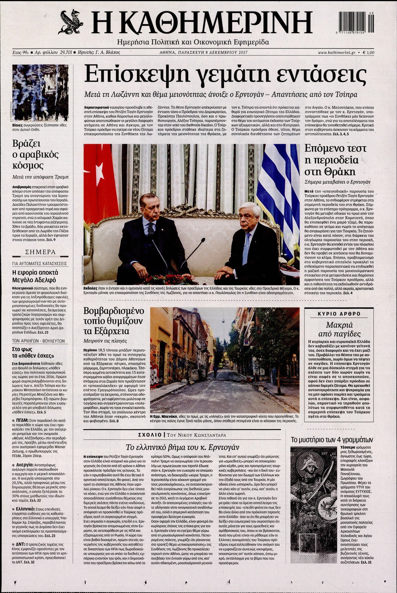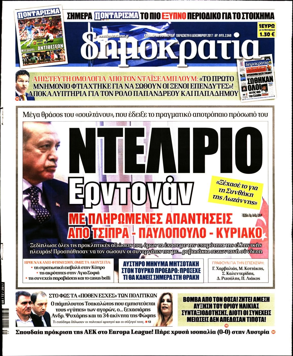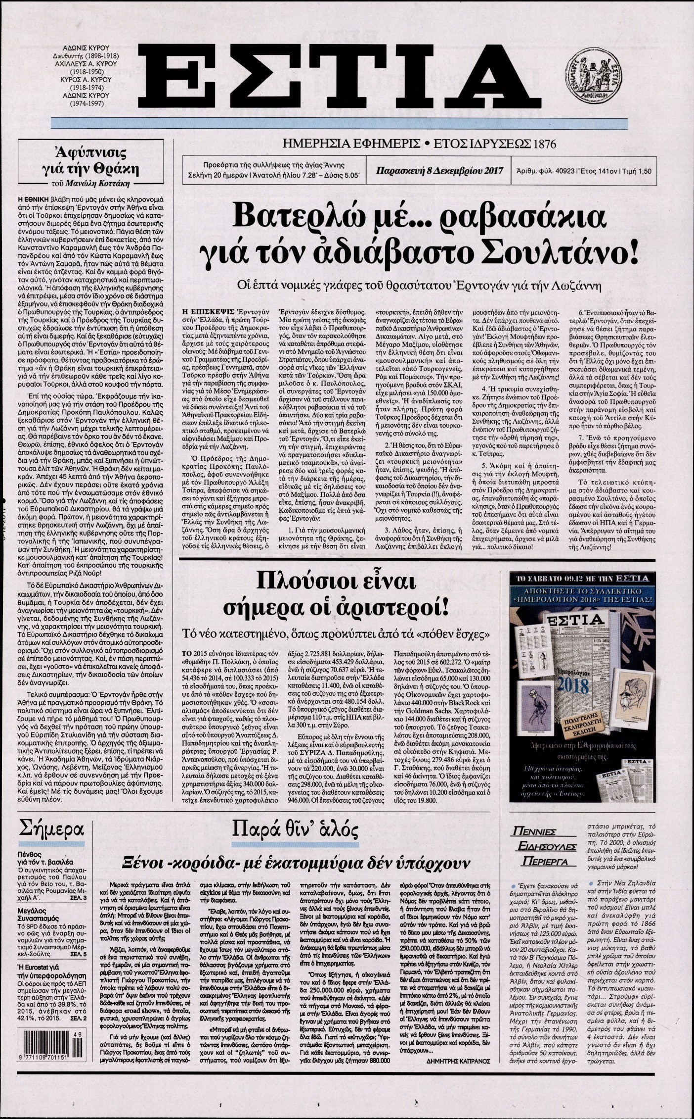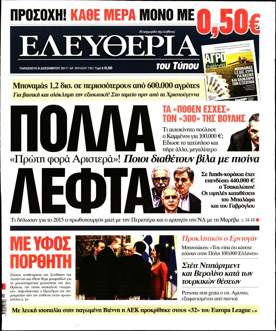 Οι πολιτικές εφημερίδες 8/12/2017 Enikos Newsroom 07:50, Παρασκευή 08 Δεκεμβρίου 2017 Media Διαβάστε τα σημερινά πρωτοσέλιδα των πολιτικών εφημερίδων: ΠΟΛΙΤΙΚΕΣ ΕΦΗΜΕΡΙΔΕΣ ΠΡΩΤΟΣΕΛΙΔΑ Μοιράσου το: σχολίασε κι εσύ (0 σχόλια) Ακολουθήστε το enikos.gr στο Google News και μάθετε πρώτοι όλες τις ειδήσεις Δείτε όλες τις τελευταίες ειδήσεις από την Ελλάδα και τον Κόσμο στο enikos.gr Ειδήσεις Ροή Ειδήσεων 1 ώρα πριν Χριστούγεννα στα μπλόκα: Επιμένουν στις κινητοποιήσεις τους οι αγρότες – Ανοίγουν τα διόδια το Σαββατοκύριακο 2 ώρες πριν Ουκρανία: Η άνευ προηγουμένου επίθεση σε ρωσικό τάνκερ στη Μεσόγειο και το μήνυμα προς στον Πούτιν – Το «μακρύ χέρι» του Κιέβου 1 ώρα πριν Πούτιν: Τα μηνύματα σε Ευρώπη και ΝΑΤΟ από το μαραθώνιο «σόου» του – Η απαίτηση για «σεβασμό» και η ειρήνη «με τους όρους» της Μόσχας 2 ώρες πριν Τραμπ: Δεν αποκλείει την πιθανότητα ενός πολέμου στη Βενεζουέλα – «Ο Μαδούρο ξέρει καλύτερα από τον καθένα τι ακριβώς θέλω» 3 ώρες πριν Συνεχίζει να προκαλεί ο Μίτσκοσκι: «Για μένα το όνομα Μακεδονία είναι ιερό» 1 ώρα πριν Ανακαλύφθηκαν αρχαία χρυσά νομίσματα 2.200 ετών που απεικονίζουν τον θεό Απόλλωνα – Η άγνωστη σύνδεση με τον Φίλιππο Β΄ της Μακεδονίας 2 ώρες πριν Ύπνος: Μια κρυφή κατάσταση του εγκεφάλου πριν από τον ύπνο μπορεί να είναι το “κλειδί” για υψηλή ευφυΐα και δημιουργικότητα 3 ώρες πριν Αριθμολογία: Οι άνθρωποι που έχουν γεννηθεί αυτές τις 4 ημερομηνίες, συχνά παρεξηγούνται – «Η καλοσύνη τους κρύβει τεράστια δύναμη» 4 ώρες πριν Ξεχάστε το καθάρισμα το Σαββατοκύριακο: Ο «κανόνας των 20 λεπτών» που θα σας λύσει τα χέρια 5 λεπτά πριν Πόλεμος στην Ουκρανία: Εφτά νεκροί από ρωσική πυραυλική επίθεση στο λιμάνι της Οδησσού 9 λεπτά πριν ΗΠΑ: Η κυβέρνηση του Ντόναλντ Τραμπ άρχισε να δημοσιοποιεί τα αρχεία Έπσταϊν 21 λεπτά πριν Σάμος: Άνοιξε το μπλόκο των αγροτών στον κόμβο Κοκκαρίου – Σε νέα συνεδρίαση θα καθορίσουν την στάση τους 29 λεπτά πριν Άνω Λιόσια: Πυροβολισμοί σε επιχείρηση με χαλιά – Εντοπίστηκαν 10 κάλυκες 36 λεπτά πριν Γάζα: Ισραηλινό πλήγμα σε σχολείο που είχαν καταφύγει εκτοπισμένοι – Τουλάχιστον έξι νεκροί ENIKOS NETWORK Το ΕΚΑΒ τιμήθηκε από την Ακαδημία Αθηνών για τα 40 χρόνια προσφοράς του Έχετε πραγματικά μεγάλη καρδιά; 10 χαρακτηριστικά όσων έχουν καλοσύνη Αναστολή μέτρων αναγκαστικής εκτέλεσης για κτηνοτρόφους που πλήττονται από την ευλογιά των αιγοπροβάτων Πλήρης επάρκεια προϊόντων στις λαϊκές της Αττικής, παρά τις αγροτικές κινητοποιήσεις – Τι απαντούν οι πωλητές Χαρτογραφώντας το «σημείο χωρίς επιστροφή»: Για πρώτη φορά αποκαλύπτεται με λεπτομέρεια το ακανθώδες όριο της ατμόσφαιρας τ... Η Google καταργεί τη λειτουργία «dark web report» – Πώς θα μπορούν οι χρήστες να διαγράφουν τα δεδομένα τους περισσότερα 22:42 , Παρασκευή 19 Δεκεμβρίου 2025 Γιώργος Γιαννόπουλος για “Το σόι σου”: “Είναι ευτυχία και ευλογία αυτή η σειρά” «Είναι ευτυχία και ευλογία η συγκυρία αυτής της σειράς», θα πει ο Γιώργος Γιαννόπουλος -ο αγαπ... 20:37 , Παρασκευή 19 Δεκεμβρίου 2025 Don’t Forget The Lyrics: Η Έλλη Κοκκίνου υποδέχεται 4 παίκτες που θα κάνουν τα πάντα για να μη χάσουν ούτε… μισή λέξη από τους στίχους Το «Don’t Forget The Lyrics» επιστρέφει απόψε, Παρασκευή 19 Δεκεμβρίου, στις 21:00 με νέο επει... 19:31 , Παρασκευή 19 Δεκεμβρίου 2025 GNTM: Απόψε ο μεγάλος τελικός για τους 4 φιναλίστ Έπειτα από μήνες γεμάτους μόδα, δημιουργία και έντονες αναμετρήσεις, το GNTM 2025 κορυφώνεται,... 18:11 , Παρασκευή 19 Δεκεμβρίου 2025 Το σόι σου: 