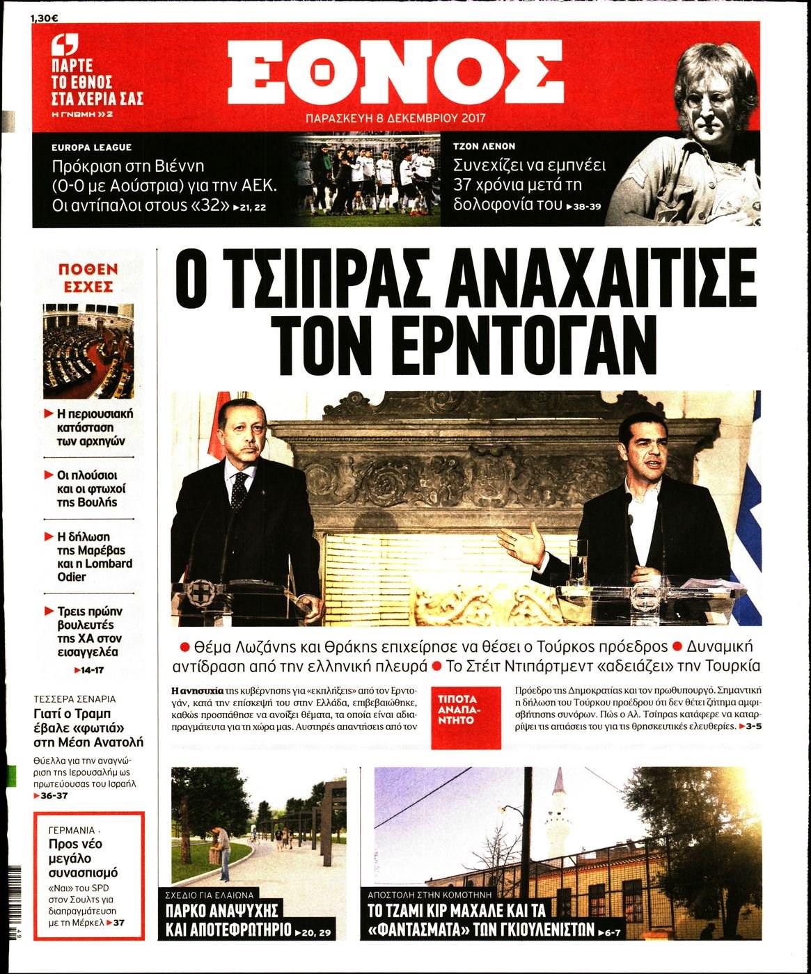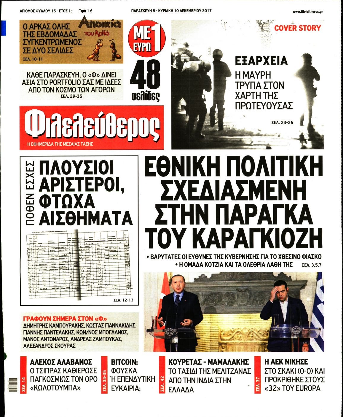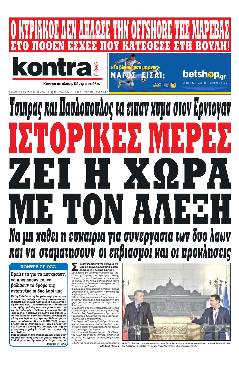 Οι πολιτικές εφημερίδες 8/12/2017 Enikos Newsroom 07:50, Παρασκευή 08 Δεκεμβρίου 2017 Media Διαβάστε τα σημερινά πρωτοσέλιδα των πολιτικών εφημερίδων: ΠΟΛΙΤΙΚΕΣ ΕΦΗΜΕΡΙΔΕΣ ΠΡΩΤΟΣΕΛΙΔΑ Μοιράσου το: σχολίασε κι εσύ (0 σχόλια) Ακολουθήστε το enikos.gr στο Google News και μάθετε πρώτοι όλες τις ειδήσεις Δείτε όλες τις τελευταίες ειδήσεις από την Ελλάδα και τον Κόσμο στο enikos.gr Ειδήσεις Ροή Ειδήσεων 1 ώρα πριν Χριστούγεννα στα μπλόκα: Επιμένουν στις κινητοποιήσεις τους οι αγρότες – Ανοίγουν τα διόδια το Σαββατοκύριακο 2 ώρες πριν Ουκρανία: Η άνευ προηγουμένου επίθεση σε ρωσικό τάνκερ στη Μεσόγειο και το μήνυμα προς στον Πούτιν – Το «μακρύ χέρι» του Κιέβου 1 ώρα πριν Πούτιν: Τα μηνύματα σε Ευρώπη και ΝΑΤΟ από το μαραθώνιο «σόου» του – Η απαίτηση για «σεβασμό» και η ειρήνη «με τους όρους» της Μόσχας 2 ώρες πριν Τραμπ: Δεν αποκλείει την πιθανότητα ενός πολέμου στη Βενεζουέλα – «Ο Μαδούρο ξέρει καλύτερα από τον καθένα τι ακριβώς θέλω» 3 ώρες πριν Συνεχίζει να προκαλεί ο Μίτσκοσκι: «Για μένα το όνομα Μακεδονία είναι ιερό» 1 ώρα πριν Ανακαλύφθηκαν αρχαία χρυσά νομίσματα 2.200 ετών που απεικονίζουν τον θεό Απόλλωνα – Η άγνωστη σύνδεση με τον Φίλιππο Β΄ της Μακεδονίας 2 ώρες πριν Ύπνος: Μια κρυφή κατάσταση του εγκεφάλου πριν από τον ύπνο μπορεί να είναι το “κλειδί” για υψηλή ευφυΐα και δημιουργικότητα 3 ώρες πριν Αριθμολογία: Οι άνθρωποι που έχουν γεννηθεί αυτές τις 4 ημερομηνίες, συχνά παρεξηγούνται – «Η καλοσύνη τους κρύβει τεράστια δύναμη» 4 ώρες πριν Ξεχάστε το καθάρισμα το Σαββατοκύριακο: Ο «κανόνας των 20 λεπτών» που θα σας λύσει τα χέρια 5 λεπτά πριν Πόλεμος στην Ουκρανία: Εφτά νεκροί από ρωσική πυραυλική επίθεση στο λιμάνι της Οδησσού 9 λεπτά πριν ΗΠΑ: Η κυβέρνηση του Ντόναλντ Τραμπ άρχισε να δημοσιοποιεί τα αρχεία Έπσταϊν 21 λεπτά πριν Σάμος: Άνοιξε το μπλόκο των αγροτών στον κόμβο Κοκκαρίου – Σε νέα συνεδρίαση θα καθορίσουν την στάση τους 29 λεπτά πριν Άνω Λιόσια: Πυροβολισμοί σε επιχείρηση με χαλιά – Εντοπίστηκαν 10 κάλυκες 36 λεπτά πριν Γάζα: Ισραηλινό πλήγμα σε σχολείο που είχαν καταφύγει εκτοπισμένοι – Τουλάχιστον έξι νεκροί ENIKOS NETWORK Το ΕΚΑΒ τιμήθηκε από την Ακαδημία Αθηνών για τα 40 χρόνια προσφοράς του Έχετε πραγματικά μεγάλη καρδιά; 10 χαρακτηριστικά όσων έχουν καλοσύνη Αναστολή μέτρων αναγκαστικής εκτέλεσης για κτηνοτρόφους που πλήττονται από την ευλογιά των αιγοπροβάτων Πλήρης επάρκεια προϊόντων στις λαϊκές της Αττικής, παρά τις αγροτικές κινητοποιήσεις – Τι απαντούν οι πωλητές Χαρτογραφώντας το «σημείο χωρίς επιστροφή»: Για πρώτη φορά αποκαλύπτεται με λεπτομέρεια το ακανθώδες όριο της ατμόσφαιρας τ... Η Google καταργεί τη λειτουργία «dark web report» – Πώς θα μπορούν οι χρήστες να διαγράφουν τα δεδομένα τους περισσότερα 22:42 , Παρασκευή 19 Δεκεμβρίου 2025 Γιώργος Γιαννόπουλος για “Το σόι σου”: “Είναι ευτυχία και ευλογία αυτή η σειρά” «Είναι ευτυχία και ευλογία η συγκυρία αυτής της σειράς», θα πει ο Γιώργος Γιαννόπουλος -ο αγαπ... 20:37 , Παρασκευή 19 Δεκεμβρίου 2025 Don’t Forget The Lyrics: Η Έλλη Κοκκίνου υποδέχεται 4 παίκτες που θα κάνουν τα πάντα για να μη χάσουν ούτε… μισή λέξη από τους στίχους Το «Don’t Forget The Lyrics» επιστρέφει απόψε, Παρασκευή 19 Δεκεμβρίου, στις 21:00 με νέο επει... 19:31 , Παρασκευή 19 Δεκεμβρίου 2025 GNTM: Απόψε ο μεγάλος τελικός για τους 4 φιναλίστ Έπειτα από μήνες γεμάτους μόδα, δημιουργία και έντονες αναμετρήσεις, το GNTM 2025 κορυφώνεται,... 18:11 , Παρασκευή 19 Δεκεμβρίου 2025 Το σόι σου: 