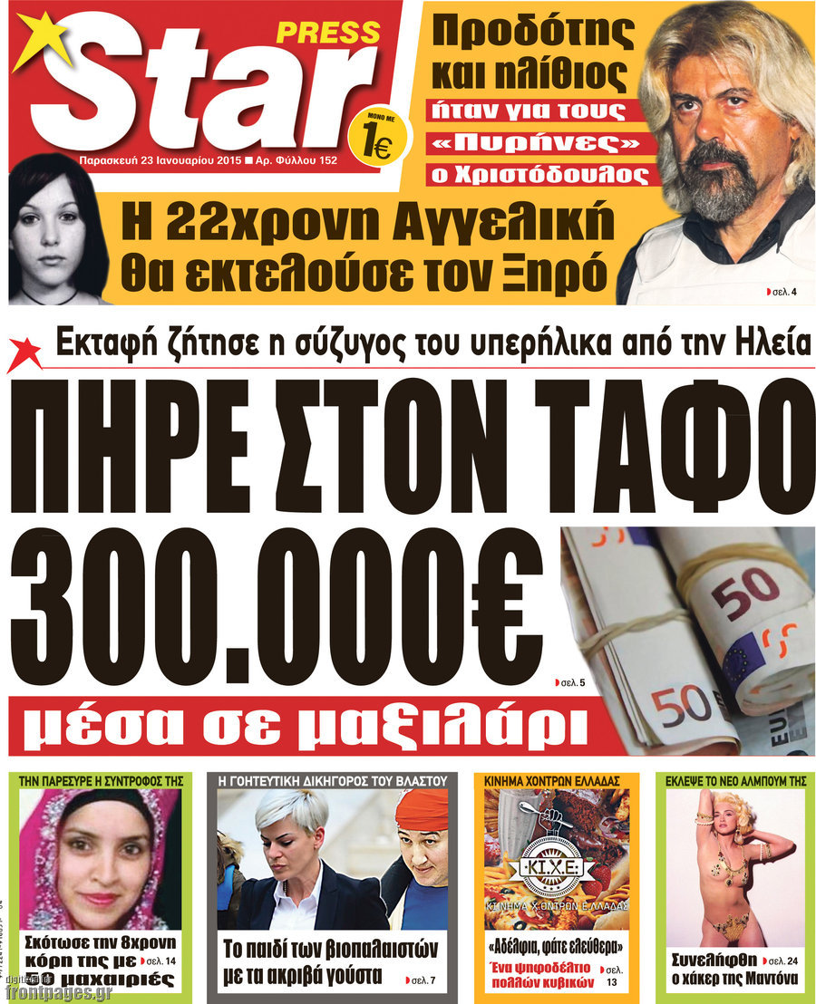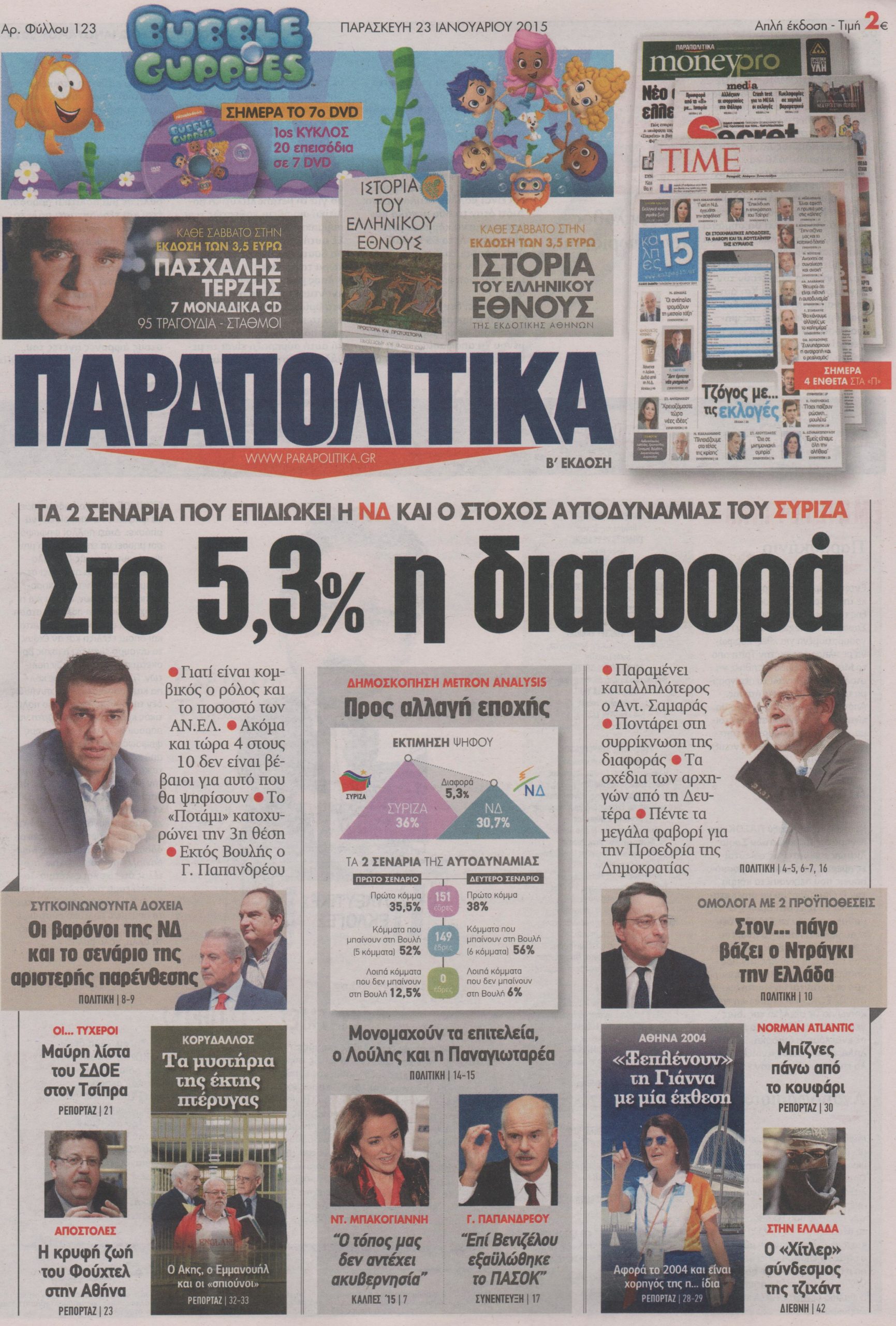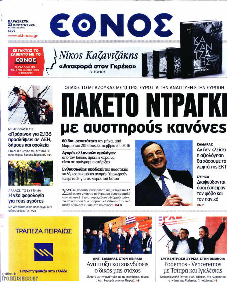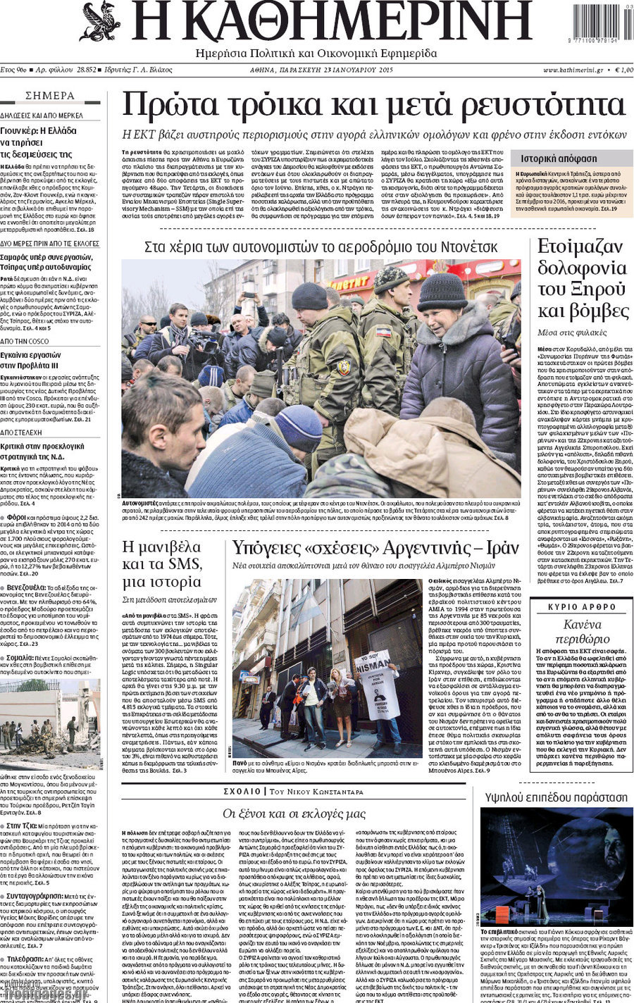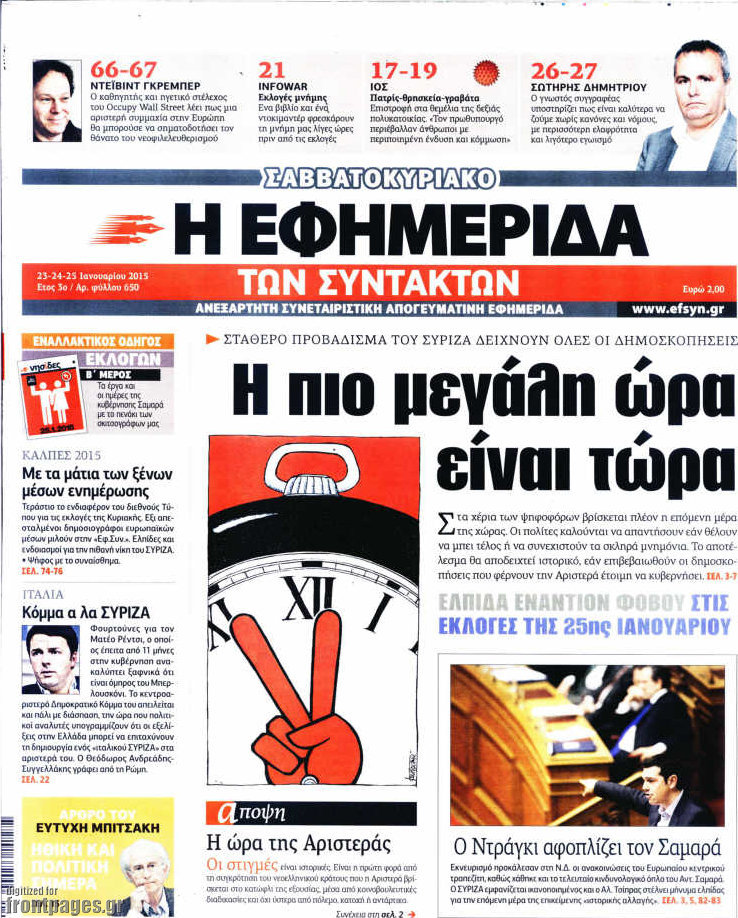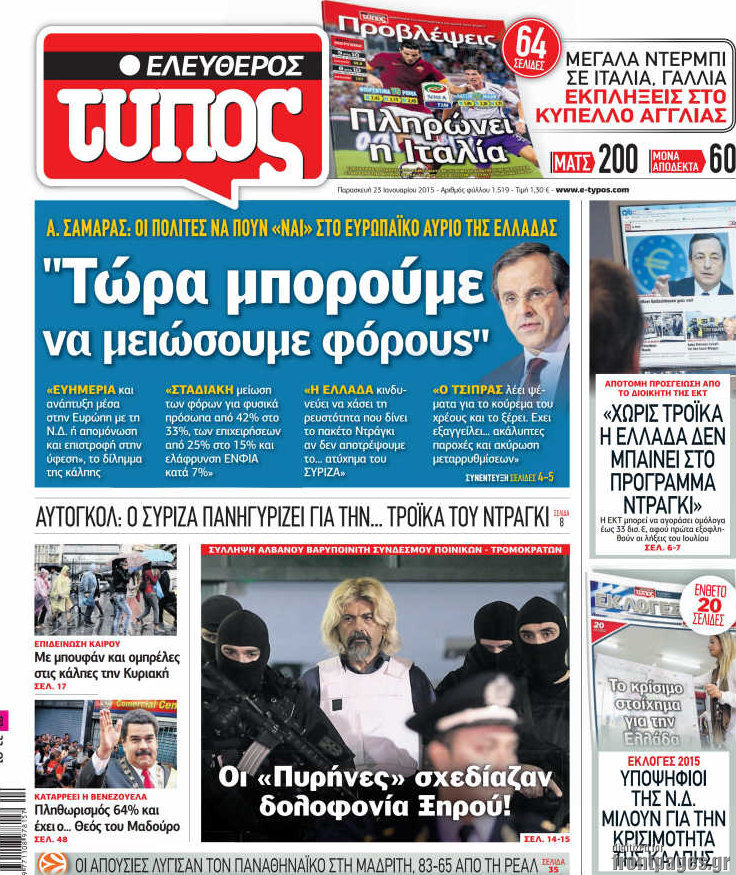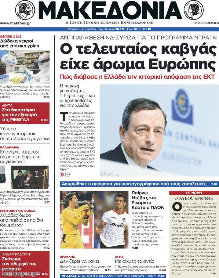 Οι πολιτικές εφημερίδες Enikos Newsroom 08:05, Παρασκευή 23 Ιανουαρίου 2015 Media Διαβάστε τα πρωτοσέλιδα των πολιτικών εφημερίδων: ΠΟΛΙΤΙΚΕΣ ΕΦΗΜΕΡΙΔΕΣ ΠΡΩΤΟΣΕΛΙΔΑ Μοιράσου το: σχολίασε κι εσύ (0 σχόλια) Ακολουθήστε το enikos.gr στο Google News και μάθετε πρώτοι όλες τις ειδήσεις Δείτε όλες τις τελευταίες ειδήσεις από την Ελλάδα και τον Κόσμο στο enikos.gr Ειδήσεις Ροή Ειδήσεων 8 ώρες πριν Χριστούγεννα στα μπλόκα: Επιμένουν στις κινητοποιήσεις τους οι αγρότες – Ανοίγουν τα διόδια το Σαββατοκύριακο 8 ώρες πριν Ουκρανία: Η άνευ προηγουμένου επίθεση σε ρωσικό τάνκερ στη Μεσόγειο και το μήνυμα προς στον Πούτιν – Το «μακρύ χέρι» του Κιέβου 8 ώρες πριν Πούτιν: Τα μηνύματα σε Ευρώπη και ΝΑΤΟ από το μαραθώνιο «σόου» του – Η απαίτηση για «σεβασμό» και η ειρήνη «με τους όρους» της Μόσχας 7 ώρες πριν ΗΠΑ: Η κυβέρνηση του Ντόναλντ Τραμπ άρχισε να δημοσιοποιεί τα αρχεία Έπσταϊν 7 ώρες πριν Άνω Λιόσια: Πυροβολισμοί σε επιχείρηση με χαλιά – Εντοπίστηκαν 10 κάλυκες 33 λεπτά πριν Αυγά: Πόσα μπορείτε να τρώτε την ημέρα με ασφάλεια για μέγιστη πρόσληψη πρωτεΐνης 1 ώρα πριν Τα ζώδια σήμερα, Σάββατο 20 Δεκεμβρίου: Παρθένοι, το σύμπαν σας δίνει το κλειδί 8 ώρες πριν Ανακαλύφθηκαν αρχαία χρυσά νομίσματα 2.200 ετών που απεικονίζουν τον θεό Απόλλωνα – Η άγνωστη σύνδεση με τον Φίλιππο Β΄ της Μακεδονίας 9 ώρες πριν Ύπνος: Μια κρυφή κατάσταση του εγκεφάλου πριν από τον ύπνο μπορεί να είναι το “κλειδί” για υψηλή ευφυΐα και δημιουργικότητα 9 λεπτά πριν Κολομβία: Είκοσι χρόνια κάθειρξη σε πρώην ανώτερο αξιωματικό για 72 εκτελέσεις αμάχων 17 λεπτά πριν Οπτική ψευδαίσθηση: Μόνο αν είσαι ο Σέρλοκ Χολμς θα βρεις τον αριθμό «87» σε 7 δευτερόλεπτα 24 λεπτά πριν Σαρωτικοί οι έλεγχοι στους δρόμους ενόψει εορτών – Μπλόκα της τροχαίας σε κεντρικές αρτηρίες της Αττικής 33 λεπτά πριν Αυγά: Πόσα μπορείτε να τρώτε την ημέρα με ασφάλεια για μέγιστη πρόσληψη πρωτεΐνης 39 λεπτά πριν Σαν σήμερα 20 Δεκεμβρίου: Τα σημαντικότερα γεγονότα της ημέρας ENIKOS NETWORK Το ΕΚΑΒ τιμήθηκε από την Ακαδημία Αθηνών για τα 40 χρόνια προσφοράς του Έχετε πραγματικά μεγάλη καρδιά; 10 χαρακτηριστικά όσων έχουν καλοσύνη Αναστολή μέτρων αναγκαστικής εκτέλεσης για κτηνοτρόφους που πλήττονται από την ευλογιά των αιγοπροβάτων Πλήρης επάρκεια προϊόντων στις λαϊκές της Αττικής, παρά τις αγροτικές κινητοποιήσεις – Τι απαντούν οι πωλητές Χαρτογραφώντας το «σημείο χωρίς επιστροφή»: Για πρώτη φορά αποκαλύπτεται με λεπτομέρεια το ακανθώδες όριο της ατμόσφαιρας τ... Η Google καταργεί τη λειτουργία «dark web report» – Πώς θα μπορούν οι χρήστες να διαγράφουν τα δεδομένα τους περισσότερα 05:48 , Σάββατο 20 Δεκεμβρίου 2025 Οι οικονομικές εφημερίδες 20/12/2025 Διαβάστε τα πρωτοσέλιδα από τις οικονομικές εφημερίδες, σήμερα 20/12/2025. 05:43 , Σάββατο 20 Δεκεμβρίου 2025 Οι αθλητικές εφημερίδες 20/12/2025 Διαβάστε τα πρωτοσέλιδα από τις αθλητικές εφημερίδες, σήμερα 20/12/2025. 05:38 , Σάββατο 20 Δεκεμβρίου 2025 Οι πολιτικές εφημερίδες 20/12/2025 Διαβάστε τα πρωτοσέλιδα από τις πολιτικές εφημερίδες, σήμερα 20/12/2025. 04:20 , Σάββατο 20 Δεκεμβρίου 2025 Αγγελική Νικολούλη: Τα συλλυπητήρια για την απώλεια της Ειρήνης Μαρινάκη Τα συλληπητήρια στον πρόεδρο του Mega, τον Βαγγέλη Μαρινάκη, για την απώλεια της μητέρας του Ε... ΤΕΛΕΥΤΑΙΕΣ ΕΙΔΗΣΕΙΣ 9 λεπτά πριν Κολομβία: Είκοσι χρόνια κάθειρξη σε πρώην ανώτερο... 17 λεπτά πριν Οπτική ψευδαίσθηση: Μόνο αν είσαι ο Σέρλοκ Χολμς θα... 24 λεπτά πριν Σαρωτικοί οι έλεγχοι στους δρόμους ενόψει εορ