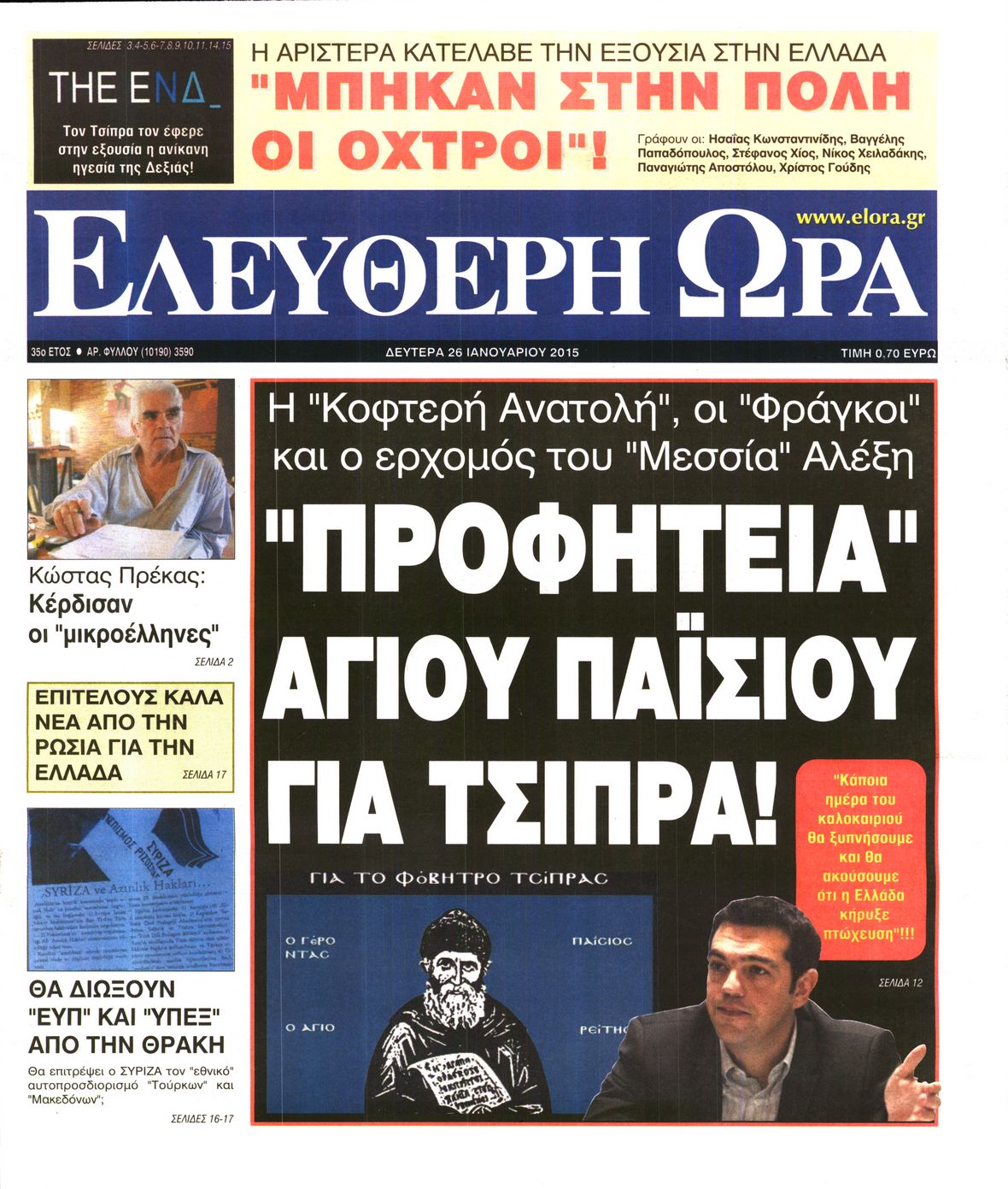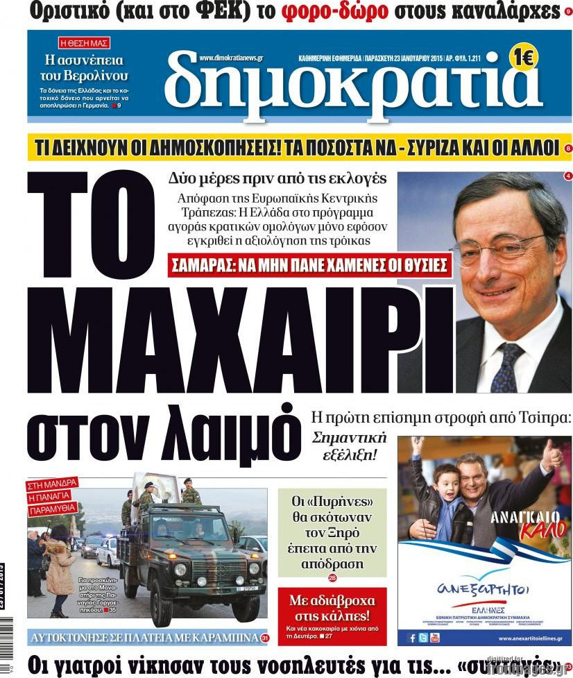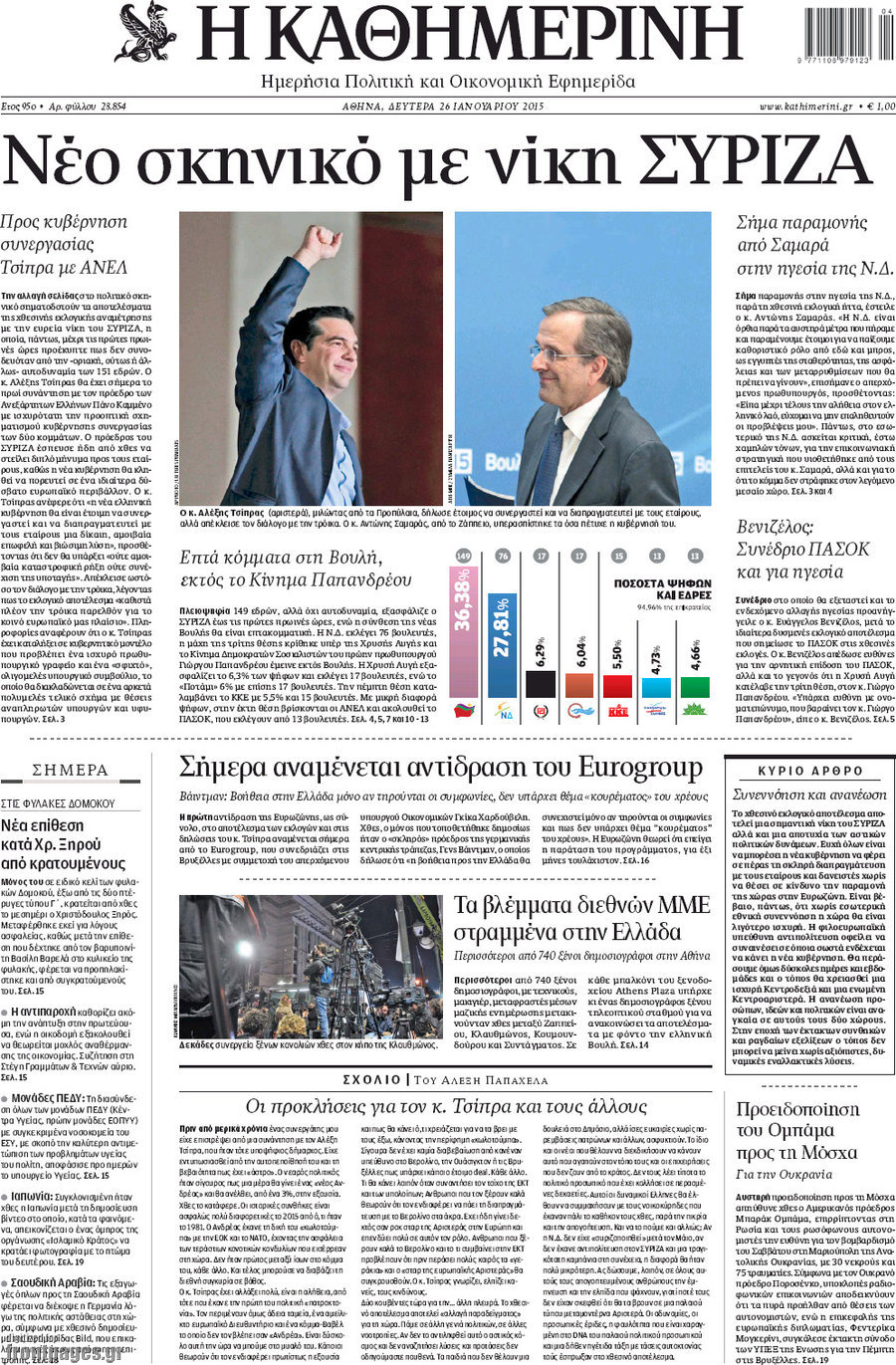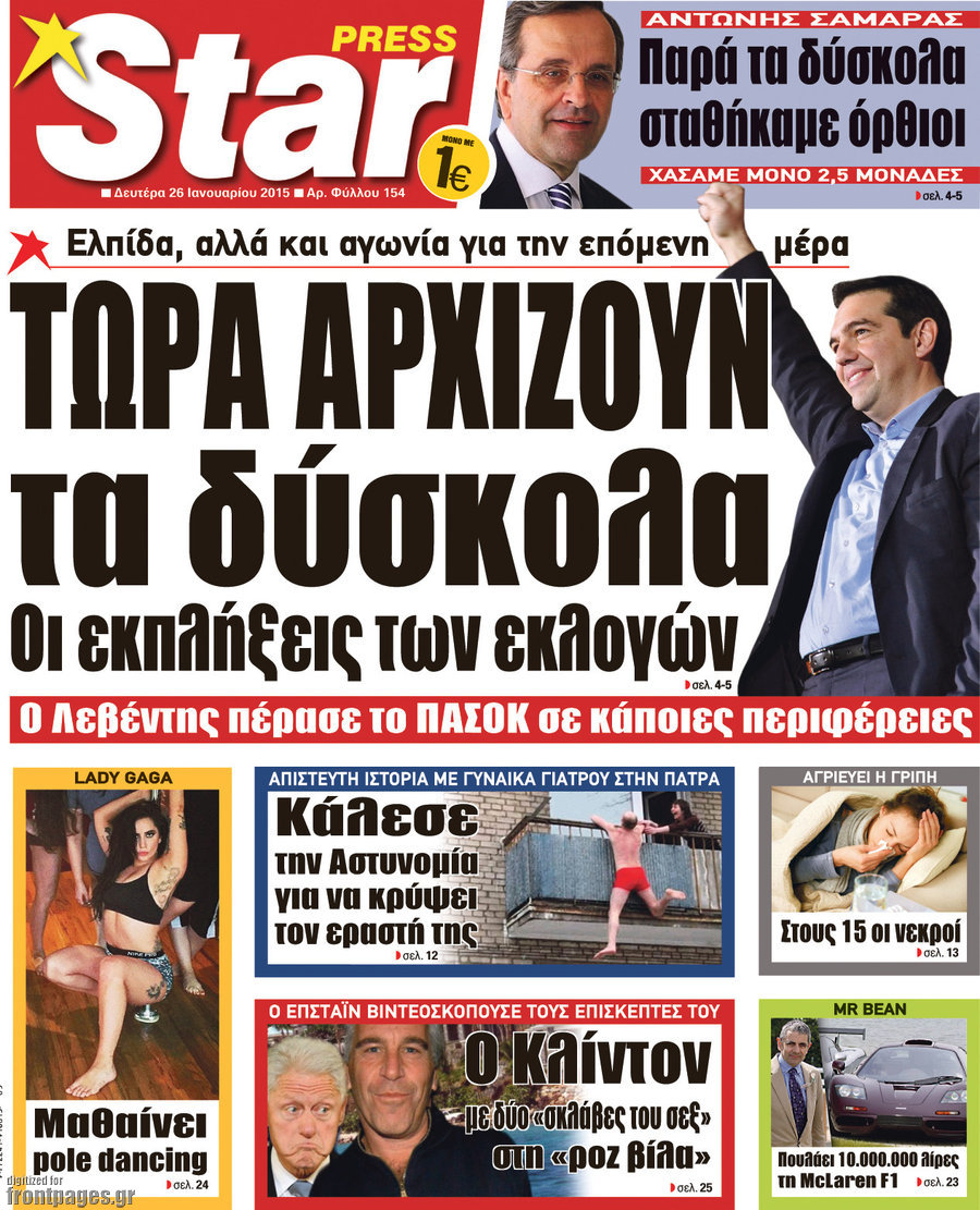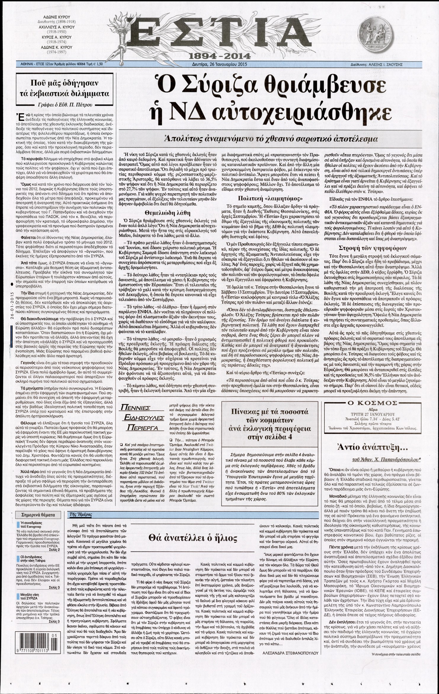 Οι πολιτικές εφημερίδες Enikos Newsroom 07:57, Δευτέρα 26 Ιανουαρίου 2015 Media Διαβάστε τα πρωτοσέλιδα των πολιτικών εφημερίδων: ΕΦΗΜΕΡΙΔΕΣ ΠΟΛΙΤΙΚΕΣ ΕΦΗΜΕΡΙΔΕΣ ΠΡΩΤΟΣΕΛΙΔΑ Μοιράσου το: σχολίασε κι εσύ (0 σχόλια) Ακολουθήστε το enikos.gr στο Google News και μάθετε πρώτοι όλες τις ειδήσεις Δείτε όλες τις τελευταίες ειδήσεις από την Ελλάδα και τον Κόσμο στο enikos.gr Ειδήσεις Ροή Ειδήσεων 5 ώρες πριν Χριστούγεννα στα μπλόκα: Επιμένουν στις κινητοποιήσεις τους οι αγρότες – Ανοίγουν τα διόδια το Σαββατοκύριακο 5 ώρες πριν Ουκρανία: Η άνευ προηγουμένου επίθεση σε ρωσικό τάνκερ στη Μεσόγειο και το μήνυμα προς στον Πούτιν – Το «μακρύ χέρι» του Κιέβου 4 ώρες πριν Πούτιν: Τα μηνύματα σε Ευρώπη και ΝΑΤΟ από το μαραθώνιο «σόου» του – Η απαίτηση για «σεβασμό» και η ειρήνη «με τους όρους» της Μόσχας 5 ώρες πριν Τραμπ: Δεν αποκλείει την πιθανότητα ενός πολέμου στη Βενεζουέλα – «Ο Μαδούρο ξέρει καλύτερα από τον καθένα τι ακριβώς θέλω» 6 ώρες πριν Συνεχίζει να προκαλεί ο Μίτσκοσκι: «Για μένα το όνομα Μακεδονία είναι ιερό» 5 ώρες πριν Ανακαλύφθηκαν αρχαία χρυσά νομίσματα 2.200 ετών που απεικονίζουν τον θεό Απόλλωνα – Η άγνωστη σύνδεση με τον Φίλιππο Β΄ της Μακεδονίας 5 ώρες πριν Ύπνος: Μια κρυφή κατάσταση του εγκεφάλου πριν από τον ύπνο μπορεί να είναι το “κλειδί” για υψηλή ευφυΐα και δημιουργικότητα 6 ώρες πριν Αριθμολογία: Οι άνθρωποι που έχουν γεννηθεί αυτές τις 4 ημερομηνίες, συχνά παρεξηγούνται – «Η καλοσύνη τους κρύβει τεράστια δύναμη» 7 ώρες πριν Ξεχάστε το καθάρισμα το Σαββατοκύριακο: Ο «κανόνας των 20 λεπτών» που θα σας λύσει τα χέρια 10 λεπτά πριν Ταμίλα Κουλίεβα: «Δεν θέλω να είμαι κάποια που πορεύεται συνεχώς με τις ίδιες αναφορές» 25 λεπτά πριν Η Ελλάδα προσχωρεί στη Διεθνή Επιτροπή Αποζημιώσεων για την Ουκρανία 40 λεπτά πριν GNTM: Η Ξένια Τσίρκοβα αναδείχθηκε μεγάλη νικήτρια και πήρε τις 50.000 ευρώ – Ποιος βρέθηκε σε απόσταση αναπνοής; 55 λεπτά πριν Θεσσαλονίκη: Εξαφανίστηκε 13χρονος από χώρο φιλοξενίας ασυνόδευτων ανηλίκων στο Ωραιόκαστρο 1 ώρα πριν Ντόναλντ Τραμπ: «Πολύ βαριά αντίποινα» στη Συρία – «Πλήττουμε πολύ δυνατά οχυρά του Ισλαμικού Κράτους» ENIKOS NETWORK Το ΕΚΑΒ τιμήθηκε από την Ακαδημία Αθηνών για τα 40 χρόνια προσφοράς του Έχετε πραγματικά μεγάλη καρδιά; 10 χαρακτηριστικά όσων έχουν καλοσύνη Αναστολή μέτρων αναγκαστικής εκτέλεσης για κτηνοτρόφους που πλήττονται από την ευλογιά των αιγοπροβάτων Πλήρης επάρκεια προϊόντων στις λαϊκές της Αττικής, παρά τις αγροτικές κινητοποιήσεις – Τι απαντούν οι πωλητές Χαρτογραφώντας το «σημείο χωρίς επιστροφή»: Για πρώτη φορά αποκαλύπτεται με λεπτομέρεια το ακανθώδες όριο της ατμόσφαιρας τ... Η Google καταργεί τη λειτουργία «dark web report» – Πώς θα μπορούν οι χρήστες να διαγράφουν τα δεδομένα τους περισσότερα 02:50 , Σάββατο 20 Δεκεμβρίου 2025 GNTM: Η Ξένια Τσίρκοβα αναδείχθηκε μεγάλη νικήτρια και πήρε τις 50.000 ευρώ – Ποιος βρέθηκε σε απόσταση αναπνοής; Με φαντασμαγορικό τρόπο ολοκληρώθηκε το βράδυ της Παρασκευής ο μεγάλος τελικός του GNTM, μέσα ... 22:42 , Παρασκευή 19 Δεκεμβρίου 2025 Γιώργος Γιαννόπουλος για “Το σόι σου”: “Είναι ευτυχία και ευλογία αυτή η σειρά” «Είναι ευτυχία και ευλογία η συγκυρία αυτής της σειράς», θα πει ο Γιώργος Γιαννόπουλος -ο αγαπ... 20:37 , Παρασκευή 19 Δεκεμβρίου 2025 Don’t Forget The Lyrics: Η Έλλη Κοκκίνου υποδέχεται 4 παίκτες που θα κάνουν τα πάντα για να μη χάσουν ούτε… μισή λέξη από τους στίχους Το «Don’t Forget The Lyrics» επιστρέφει απόψε, Πα