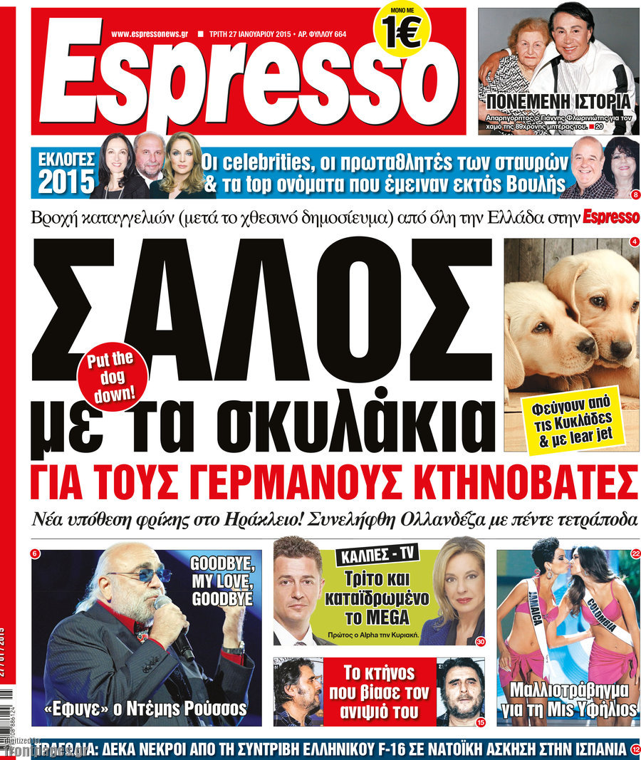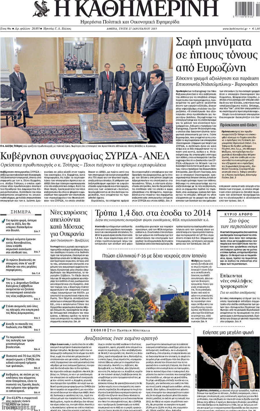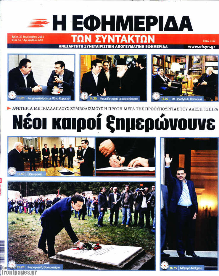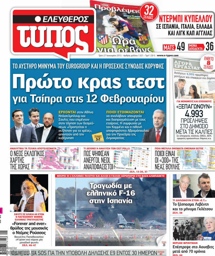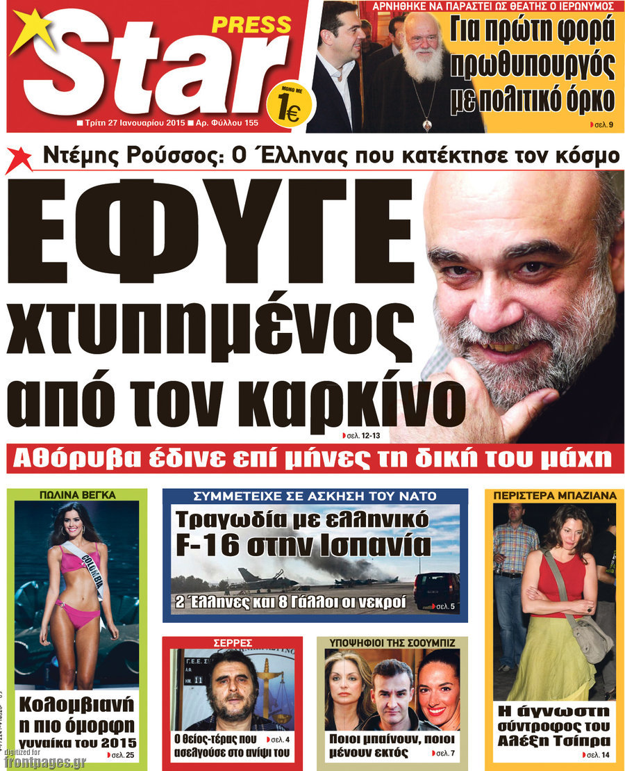 Οι πολιτικές εφημερίδες Enikos Newsroom 07:45, Τρίτη 27 Ιανουαρίου 2015 Media ΠΟΛΙΤΙΚΕΣ ΕΦΗΜΕΡΙΔΕΣ ΠΡΩΤΟΣΕΛΙΔΑ Μοιράσου το: σχολίασε κι εσύ (0 σχόλια) Ακολουθήστε το enikos.gr στο Google News και μάθετε πρώτοι όλες τις ειδήσεις Δείτε όλες τις τελευταίες ειδήσεις από την Ελλάδα και τον Κόσμο στο enikos.gr Ειδήσεις Ροή Ειδήσεων 2 ώρες πριν Μπλόκα: Οι αγρότες σηκώνουν τις μπάρες σε διόδια για τους εκδρομείς των Χριστουγέννων και μοιράζουν προϊόντα – Βίντεο 3 ώρες πριν Τσιάρας προς αγρότες: Τα μπλόκα και τα πείσματα δεν ωφελούν – Οι λύσεις περνούν μέσα από τον διάλογο 4 ώρες πριν Αρχεία Έπσταϊν: Οι συγκλονιστικές φωτογραφίες – Ο Μάικλ Τζάκσον, ο Μικ Τζάγκερ και ο Κέβιν Σπέισι ανάμεσα στους διάσημους που απεικονίζονται 2 ώρες πριν Μαθητές διακινούσαν κοκαΐνη και χασίς σε σχολείο της Αττικής – 12 συλλήψεις 2 ώρες πριν Βέλγιο: Άγνωστοι έριξαν κόκκινη μπογιά στο προξενείο της Πολωνίας στις Βρυξέλλες 6 ώρες πριν Μία νέα «χρυσή» περίοδος αρχίζει για 3 ζώδια από σήμερα – «Μία αναπάντεχη ευκαιρία οδηγεί στην επιτυχία» 4 ώρες πριν Διαιτολόγος αποκαλύπτει 9 πρωινές συνήθειες που «λιώνουν» το κοιλιακό λίπος – «Υποστηρίζουν την υγιεινή απώλεια βάρους» 5 ώρες πριν Οι 7 φράσεις που δεν λένε ποτέ οι συναισθηματικά έξυπνοι άνθρωποι κατά τη διάρκεια ενός καβγά 7 ώρες πριν Enerwave: Το νέο «ρεύμα» στη λιανική ενέργειας που αλλάζει την εμπειρία του καταναλωτή 13 λεπτά πριν Στο νοσοκομείο ο Λευτέρης Πανταζής – Τι συνέβη 22 λεπτά πριν Super League: Με Κηφισιά ο Ολυμπιακός για να «κλείσει» το 2025 στην κορυφή – Αναλυτικά το πρόγραμμα της 15ης αγωνιστικής 27 λεπτά πριν ΕΛΑΣ: Συνελήφθησαν Υπαρχιπυροσβέστης και δύο ακόμη άτομα για κατοχή και διακίνηση ναρκωτικών ουσιών – Η καταγγελία και ο τιμοκατάλογος 35 λεπτά πριν Πακιστάν: Σε κάθειρξη 17 ετών καταδικάστηκαν ο πρώην πρωθυπουργός Ίμραν Χαν και η σύζυγός του 43 λεπτά πριν Μαρινάκης στον Realfm 97,8: Η κυβέρνηση σέβεται κάθε λογική διεκδίκηση των αγροτών, αλλά και το αίτημα των πολιτών να μην ταλαιπωρούνται ENIKOS NETWORK Η αποχή από την αναπαραγωγή παρατείνει τη ζωή στα ζώα, σύμφωνα με μελέτη – Τι ισχύει για τους ανθρώπους; Σημαντικές επαφές στις ΗΠΑ είχε ο υπουργός Υγείας Άδωνις Γεωργιάδης Επιτροπή Ανταγωνισμού: Στο μικροσκόπιο σχολικές τσάντες και επώνυμα brands – Τι ερευνάται Ευλογιά αιγοπροβάτων: Παρατεταμένη επιζωοτία, αυστηρά μέτρα – Τι ισχύει για τον εμβολιασμό και την ανασύσταση του ζωικού κε... Χαρτογραφώντας το «σημείο χωρίς επιστροφή»: Για πρώτη φορά αποκαλύπτεται με λεπτομέρεια το ακανθώδες όριο της ατμόσφαιρας τ... Η Google καταργεί τη λειτουργία «dark web report» – Πώς θα μπορούν οι χρήστες να διαγράφουν τα δεδομένα τους περισσότερα 14:04 , Σάββατο 20 Δεκεμβρίου 2025 Η Realnews αυτής της Κυριακής (21/12/2025) Με τίτλο: «Ασπίδα προστασίας για την Ελλάδα» κυκλοφορεί, αυτήν την Κυριακή, η Realnews. Σημαντ... 12:53 , Σάββατο 20 Δεκεμβρίου 2025 Να μ’ αγαπάς: Το παρελθόν έρχεται στο φως – Καταιγιστικές εξελίξεις στα τελευταία επεισόδια του 2025 Ο Άγγελος αποκαλύπτεται, η Φωτεινή ανησυχεί για τον Λευτέρη και η Ζωή έρχεται αντιμέτωπη με το... 11:41 , Σάββατο 20 Δεκεμβρίου 2025 «Η αγάπη δεν χάνεται ποτέ»: Η μικρού μήκους ταινία κινουμένων σχεδίων που θέτει ερωτήματα για τη ζωή και τον θάνατο Ο θάνατος είναι ένα από τα πιο σκληρά θέματα που καλείται να διαχειριστεί κάποιος στη διάρκεια... 09:30 , Σάββατο 20 Δεκεμβρίου 2025 «Porto Leone: Στη γειτονιά με τα κόκκινα φανάρια» – Ο Χρόνης αποκαλύπτει στην Αλεξάνδρα το μυστικό 