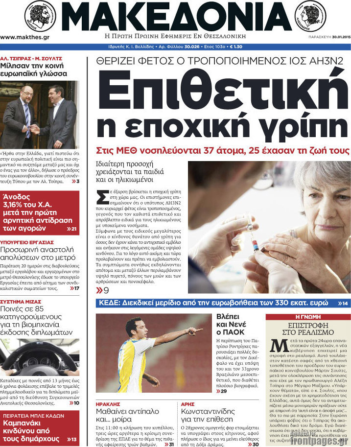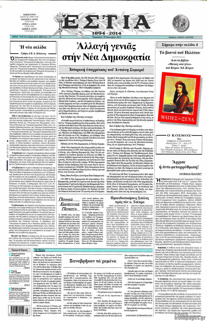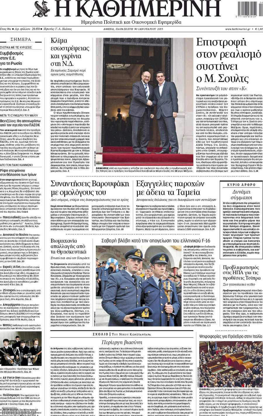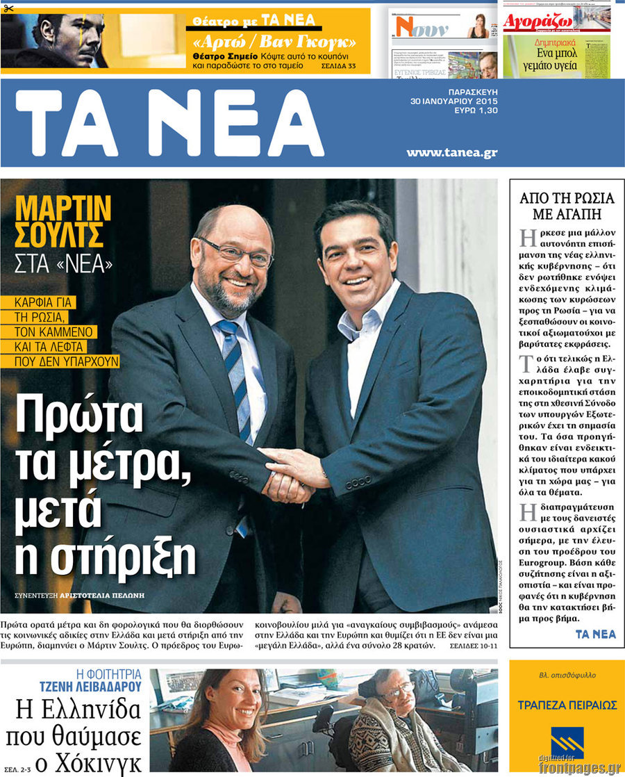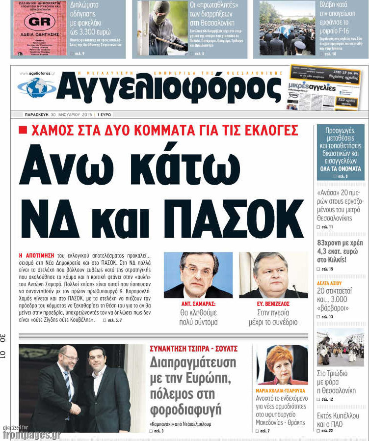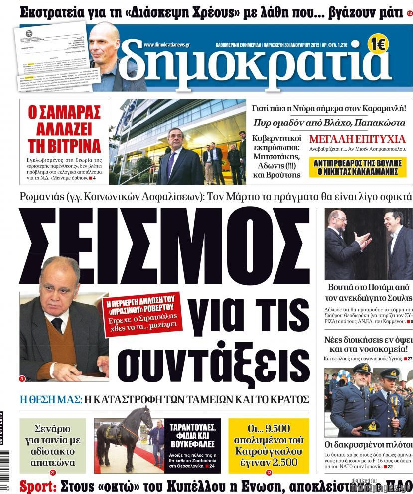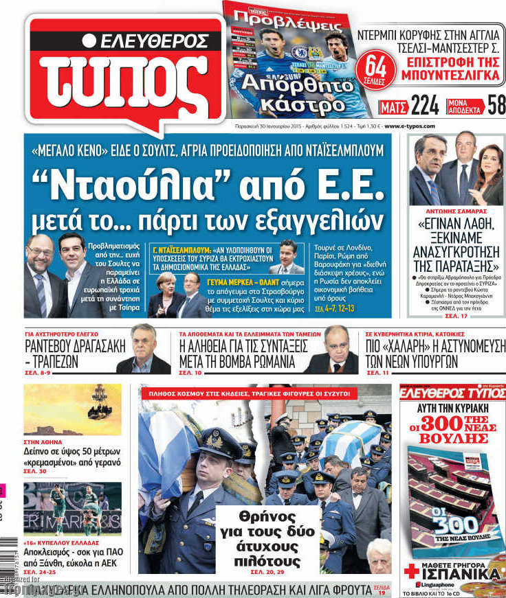 Οι πολιτικές εφημερίδες Enikos Newsroom 07:58, Παρασκευή 30 Ιανουαρίου 2015 Media Διαβάστε τα πρωτοσέλιδα των πολιτικών εφημερίδων: ΠΟΛΙΤΙΚΕΣ ΕΦΗΜΕΡΙΔΕΣ ΠΡΩΤΟΣΕΛΙΔΑ Μοιράσου το: σχολίασε κι εσύ (0 σχόλια) Ακολουθήστε το enikos.gr στο Google News και μάθετε πρώτοι όλες τις ειδήσεις Δείτε όλες τις τελευταίες ειδήσεις από την Ελλάδα και τον Κόσμο στο enikos.gr Ειδήσεις Ροή Ειδήσεων 3 ώρες πριν Υπόθεση Έπσταϊν: Το Υπουργείο Δικαιοσύνης δημοσιοποίησε μια σειρά από εξαιρετικά επεξεργασμένα αρχεία – «Λείπουν τα πιο σημαντικά έγγραφα», λένε οι Δημοκρατικοί 28 λεπτά πριν Γιορτές με μπλόκα για τους αγρότες: Ανοίγουν διόδια και μοιράζουν προϊόντα στους ταξιδιώτες 1 ώρα πριν Εξαφάνιση 33χρονου γιατρού στην Κρήτη: «Άναψα τα φώτα, τρόμαξε και άρχισε να τρέχει στα χωράφια» – Η τελευταία διαδρομή και η μαρτυρία «κλειδί» 2 ώρες πριν Ο «χάρτης» με τις αυξήσεις και τις φοροελαφρύνσεις του 2026 – Ποιοι και πόσα κερδίζουν 44 λεπτά πριν Τα αρχεία του Έπσταϊν αποκαλύπτουν φωτογραφία του έκπτωτου πρίγκιπα Άντριου – Είναι ξαπλωμένος στην αγκαλιά 5 γυναικών 51 λεπτά πριν Μία νέα «χρυσή» περίοδος αρχίζει για 3 ζώδια από σήμερα – «Μία αναπάντεχη ευκαιρία οδηγεί στην επιτυχία» 5 ώρες πριν Αυγά: Πόσα μπορείτε να τρώτε την ημέρα με ασφάλεια για μέγιστη πρόσληψη πρωτεΐνης 3 ώρες πριν Αρχαιολόγοι ανακάλυψαν σε χωράφι απεικόνιση 600 ετών ενός Αγίου – Τα στοιχεία που δείχνουν ότι μαρτύρησε 2 ώρες πριν Αγχώνεται για το χριστουγεννιάτικο δώρο που πήρε στην πλούσια σύντροφό του – «Φοβάμαι πως θα το βρει φθηνιάρικο, φοράει βραχιόλια Cartier» 1 λεπτό πριν Οι 7 φράσεις που δεν λένε ποτέ οι συναισθηματικά έξυπνοι άνθρωποι κατά τη διάρκεια ενός καβγά 5 λεπτά πριν Τηλεθέαση (19/12): Ανατροπές και πρωτιές στην πρωινή ζώνη 12 λεπτά πριν Πώς η κλιματική αλλαγή επηρεάζει εγκύους και βρέφη – Οι επιπτώσεις των υψηλών θερμοκρασιών 20 λεπτά πριν e-ΕΦΚΑ και ΔΥΠΑ: Οι πληρωμές από 22 έως 24 Δεκεμβρίου – Ποιοι θα δουν χρήματα στους λογαριασμούς τους 28 λεπτά πριν Συνελήφθη οδηγός μηχανής που έτρεχε με 161 χλμ στη Συγγρού – Τον έπιασε το ραντάρ της Τροχαίας ENIKOS NETWORK Είστε μόνιμα απρόσεκτοι; 3 σημάδια που δείχνουν ότι μπορεί να είναι σύμπτωμα πάθησης Πόσα κιλά παίρνουμε πραγματικά τα Χριστούγεννα, σύμφωνα με την επιστήμη – Πώς να το αποτρέψουμε; Επίδομα παιδιού: Τι αλλάζει από το 2026 – Το όφελος από τις φορολογικές ελαφρύνσεις Mega χριστουγεννιάτικη φορολοταρία: «Κλείδωσε» η ημερομηνία για την κλήρωση – Ερωτήσεις και απαντήσεις Χαρτογραφώντας το «σημείο χωρίς επιστροφή»: Για πρώτη φορά αποκαλύπτεται με λεπτομέρεια το ακανθώδες όριο της ατμόσφαιρας τ... Η Google καταργεί τη λειτουργία «dark web report» – Πώς θα μπορούν οι χρήστες να διαγράφουν τα δεδομένα τους περισσότερα 09:30 , Σάββατο 20 Δεκεμβρίου 2025 «Porto Leone: Στη γειτονιά με τα κόκκινα φανάρια» – Ο Χρόνης αποκαλύπτει στην Αλεξάνδρα το μυστικό για το παιδί της Λένας Η μεγάλη δραματική σειρά του Apha «Porto Leone: Στη γειτονιά με τα κόκκινα φανάρια» μας μεταφέ... 08:14 , Σάββατο 20 Δεκεμβρίου 2025 Τρομεροί γονείς: Η Μαρία Καβογιάννη εισβάλλει στο σπίτι της οικογένειας Στεφανίδη Όσα θα δούμε στο νέο διπλό επεισόδιο της σειράς «Τρομεροί γονείς», σήμερα Σάββατο 20 Δεκεμβρίο... 05:48 , Σάββατο 20 Δεκεμβρίου 2025 Οι οικονομικές εφημερίδες 20/12/2025 Διαβάστε τα πρωτοσέλιδα από τις οικονομικές εφημερίδες, σήμερα 20/12/2025. 05:43 , Σάββατο 20 Δεκεμβρίου 2025 Οι αθλητικές εφημερίδες 20/12/2025 Διαβάστε τα πρωτοσέλιδα από τις αθλητικές εφημερ