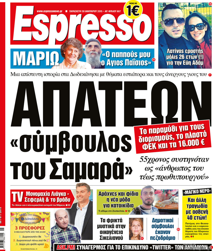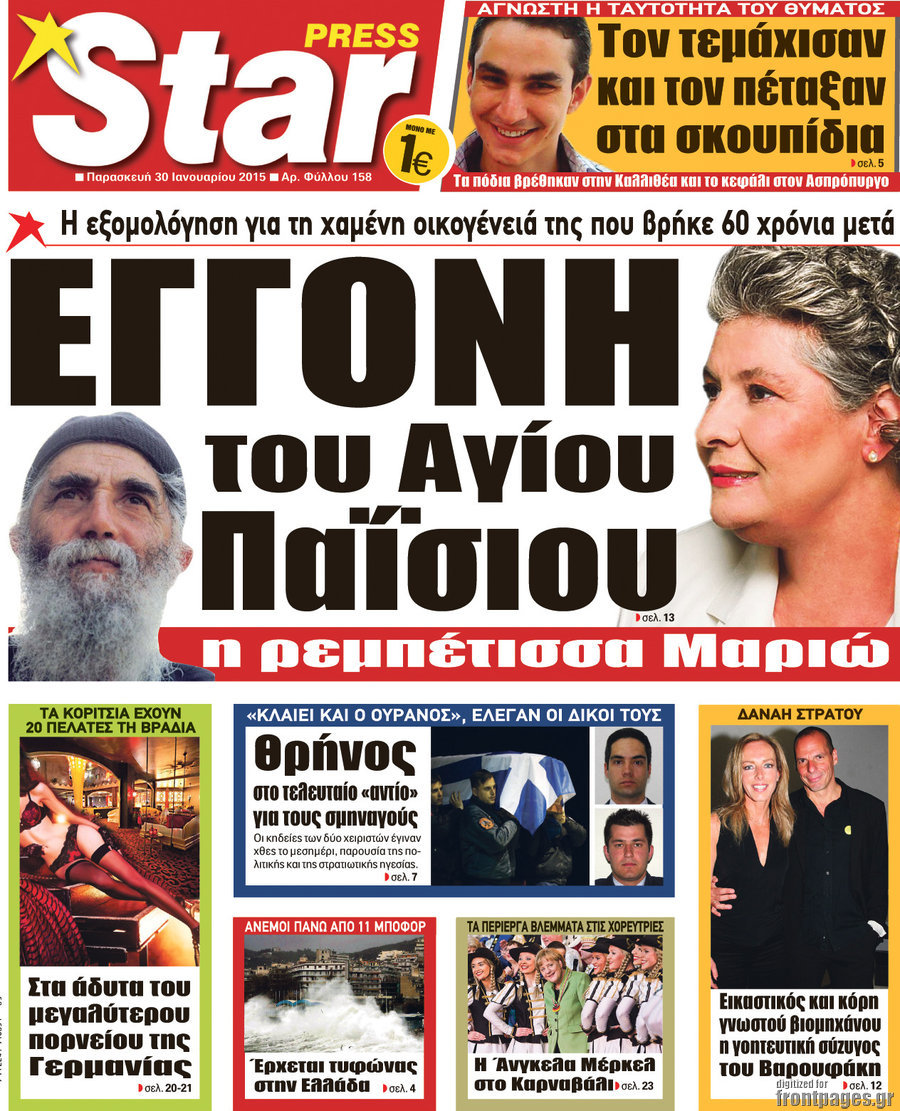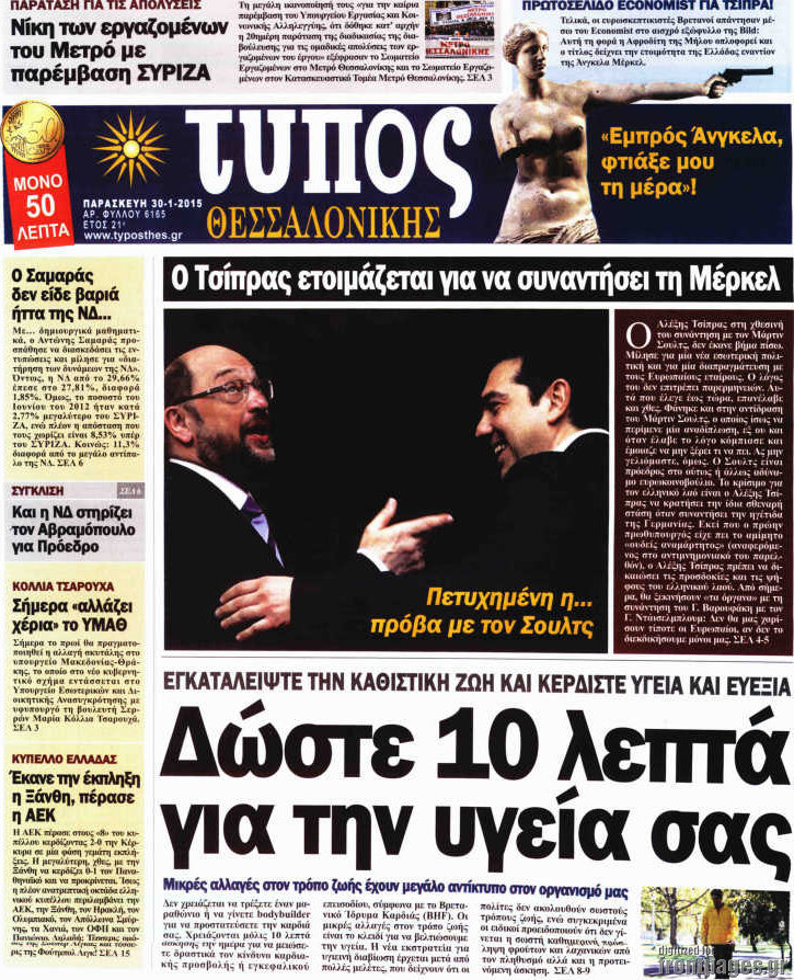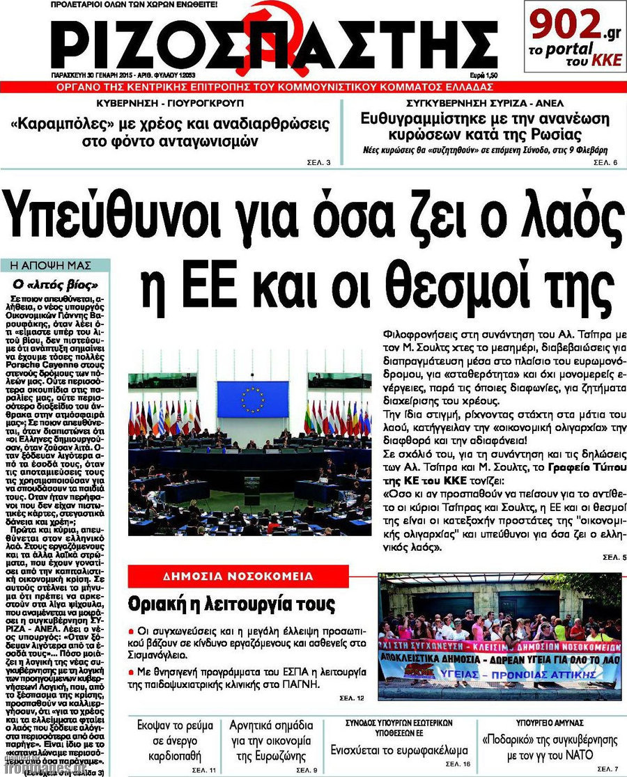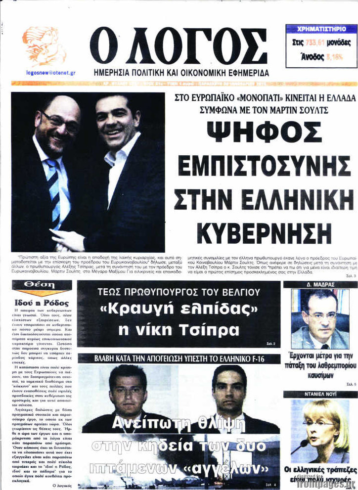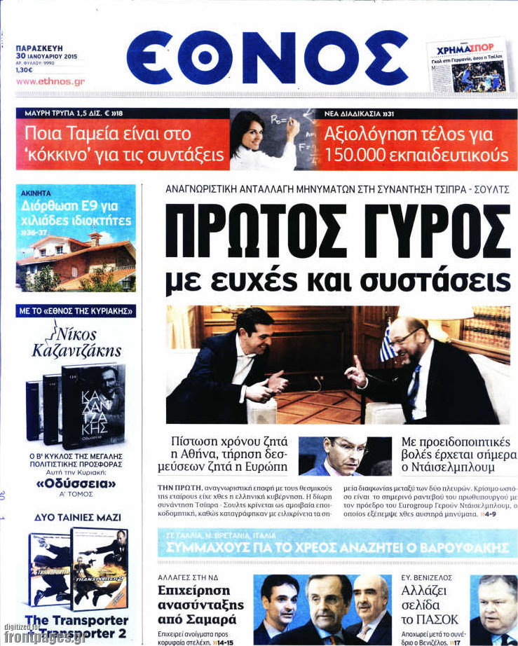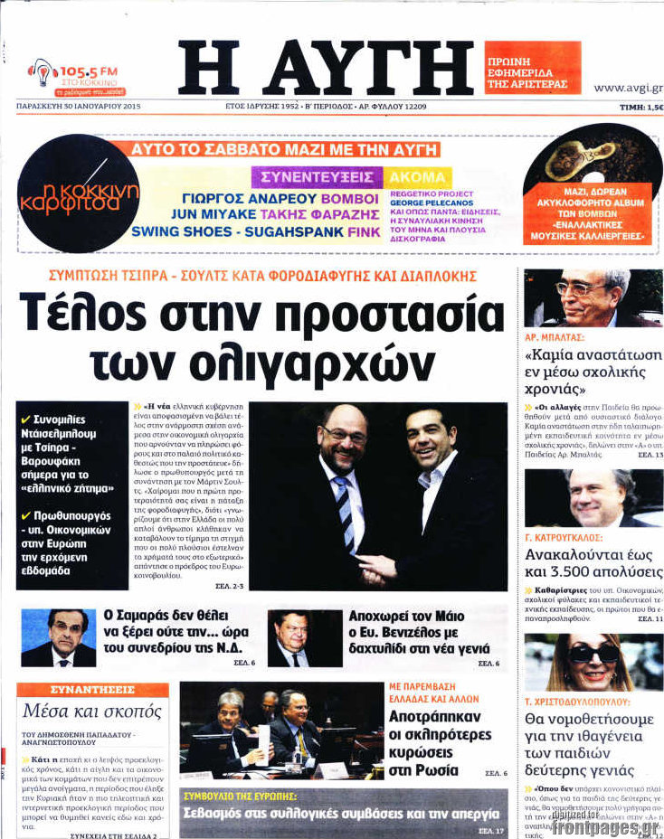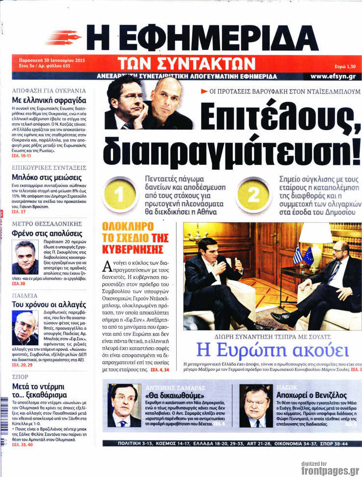 Οι πολιτικές εφημερίδες Enikos Newsroom 07:58, Παρασκευή 30 Ιανουαρίου 2015 Media Διαβάστε τα πρωτοσέλιδα των πολιτικών εφημερίδων: ΠΟΛΙΤΙΚΕΣ ΕΦΗΜΕΡΙΔΕΣ ΠΡΩΤΟΣΕΛΙΔΑ Μοιράσου το: σχολίασε κι εσύ (0 σχόλια) Ακολουθήστε το enikos.gr στο Google News και μάθετε πρώτοι όλες τις ειδήσεις Δείτε όλες τις τελευταίες ειδήσεις από την Ελλάδα και τον Κόσμο στο enikos.gr Ειδήσεις Ροή Ειδήσεων 3 ώρες πριν Υπόθεση Έπσταϊν: Το Υπουργείο Δικαιοσύνης δημοσιοποίησε μια σειρά από εξαιρετικά επεξεργασμένα αρχεία – «Λείπουν τα πιο σημαντικά έγγραφα», λένε οι Δημοκρατικοί 28 λεπτά πριν Γιορτές με μπλόκα για τους αγρότες: Ανοίγουν διόδια και μοιράζουν προϊόντα στους ταξιδιώτες 1 ώρα πριν Εξαφάνιση 33χρονου γιατρού στην Κρήτη: «Άναψα τα φώτα, τρόμαξε και άρχισε να τρέχει στα χωράφια» – Η τελευταία διαδρομή και η μαρτυρία «κλειδί» 2 ώρες πριν Ο «χάρτης» με τις αυξήσεις και τις φοροελαφρύνσεις του 2026 – Ποιοι και πόσα κερδίζουν 44 λεπτά πριν Τα αρχεία του Έπσταϊν αποκαλύπτουν φωτογραφία του έκπτωτου πρίγκιπα Άντριου – Είναι ξαπλωμένος στην αγκαλιά 5 γυναικών 51 λεπτά πριν Μία νέα «χρυσή» περίοδος αρχίζει για 3 ζώδια από σήμερα – «Μία αναπάντεχη ευκαιρία οδηγεί στην επιτυχία» 5 ώρες πριν Αυγά: Πόσα μπορείτε να τρώτε την ημέρα με ασφάλεια για μέγιστη πρόσληψη πρωτεΐνης 3 ώρες πριν Αρχαιολόγοι ανακάλυψαν σε χωράφι απεικόνιση 600 ετών ενός Αγίου – Τα στοιχεία που δείχνουν ότι μαρτύρησε 2 ώρες πριν Αγχώνεται για το χριστουγεννιάτικο δώρο που πήρε στην πλούσια σύντροφό του – «Φοβάμαι πως θα το βρει φθηνιάρικο, φοράει βραχιόλια Cartier» 1 λεπτό πριν Οι 7 φράσεις που δεν λένε ποτέ οι συναισθηματικά έξυπνοι άνθρωποι κατά τη διάρκεια ενός καβγά 5 λεπτά πριν Τηλεθέαση (19/12): Ανατροπές και πρωτιές στην πρωινή ζώνη 12 λεπτά πριν Πώς η κλιματική αλλαγή επηρεάζει εγκύους και βρέφη – Οι επιπτώσεις των υψηλών θερμοκρασιών 20 λεπτά πριν e-ΕΦΚΑ και ΔΥΠΑ: Οι πληρωμές από 22 έως 24 Δεκεμβρίου – Ποιοι θα δουν χρήματα στους λογαριασμούς τους 28 λεπτά πριν Συνελήφθη οδηγός μηχανής που έτρεχε με 161 χλμ στη Συγγρού – Τον έπιασε το ραντάρ της Τροχαίας ENIKOS NETWORK Είστε μόνιμα απρόσεκτοι; 3 σημάδια που δείχνουν ότι μπορεί να είναι σύμπτωμα πάθησης Πόσα κιλά παίρνουμε πραγματικά τα Χριστούγεννα, σύμφωνα με την επιστήμη – Πώς να το αποτρέψουμε; Επίδομα παιδιού: Τι αλλάζει από το 2026 – Το όφελος από τις φορολογικές ελαφρύνσεις Mega χριστουγεννιάτικη φορολοταρία: «Κλείδωσε» η ημερομηνία για την κλήρωση – Ερωτήσεις και απαντήσεις Χαρτογραφώντας το «σημείο χωρίς επιστροφή»: Για πρώτη φορά αποκαλύπτεται με λεπτομέρεια το ακανθώδες όριο της ατμόσφαιρας τ... Η Google καταργεί τη λειτουργία «dark web report» – Πώς θα μπορούν οι χρήστες να διαγράφουν τα δεδομένα τους περισσότερα 09:30 , Σάββατο 20 Δεκεμβρίου 2025 «Porto Leone: Στη γειτονιά με τα κόκκινα φανάρια» – Ο Χρόνης αποκαλύπτει στην Αλεξάνδρα το μυστικό για το παιδί της Λένας Η μεγάλη δραματική σειρά του Apha «Porto Leone: Στη γειτονιά με τα κόκκινα φανάρια» μας μεταφέ... 08:14 , Σάββατο 20 Δεκεμβρίου 2025 Τρομεροί γονείς: Η Μαρία Καβογιάννη εισβάλλει στο σπίτι της οικογένειας Στεφανίδη Όσα θα δούμε στο νέο διπλό επεισόδιο της σειράς «Τρομεροί γονείς», σήμερα Σάββατο 20 Δεκεμβρίο... 05:48 , Σάββατο 20 Δεκεμβρίου 2025 Οι οικονομικές εφημερίδες 20/12/2025 Διαβάστε τα πρωτοσέλιδα από τις οικονομικές εφημερίδες, σήμερα 20/12/2025. 05:43 , Σάββατο 20 Δεκεμβρίου 2025 Οι αθλητικές εφημερίδες 20/12/2025 Διαβάστε τα πρωτοσέλιδα από τις αθλητικές εφημερ