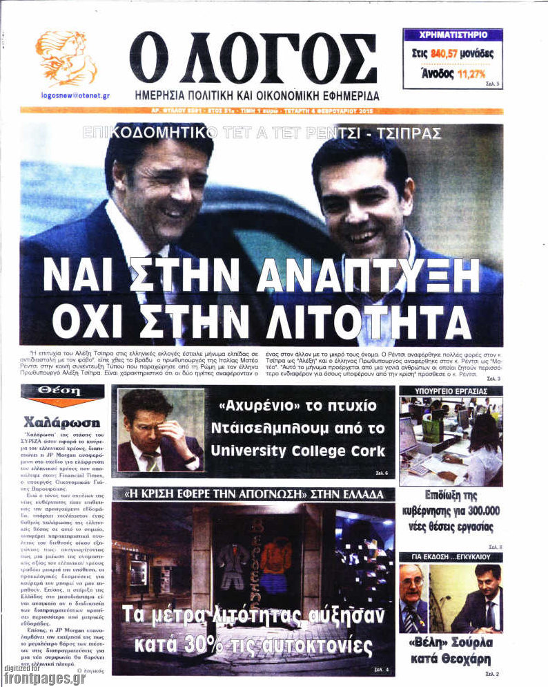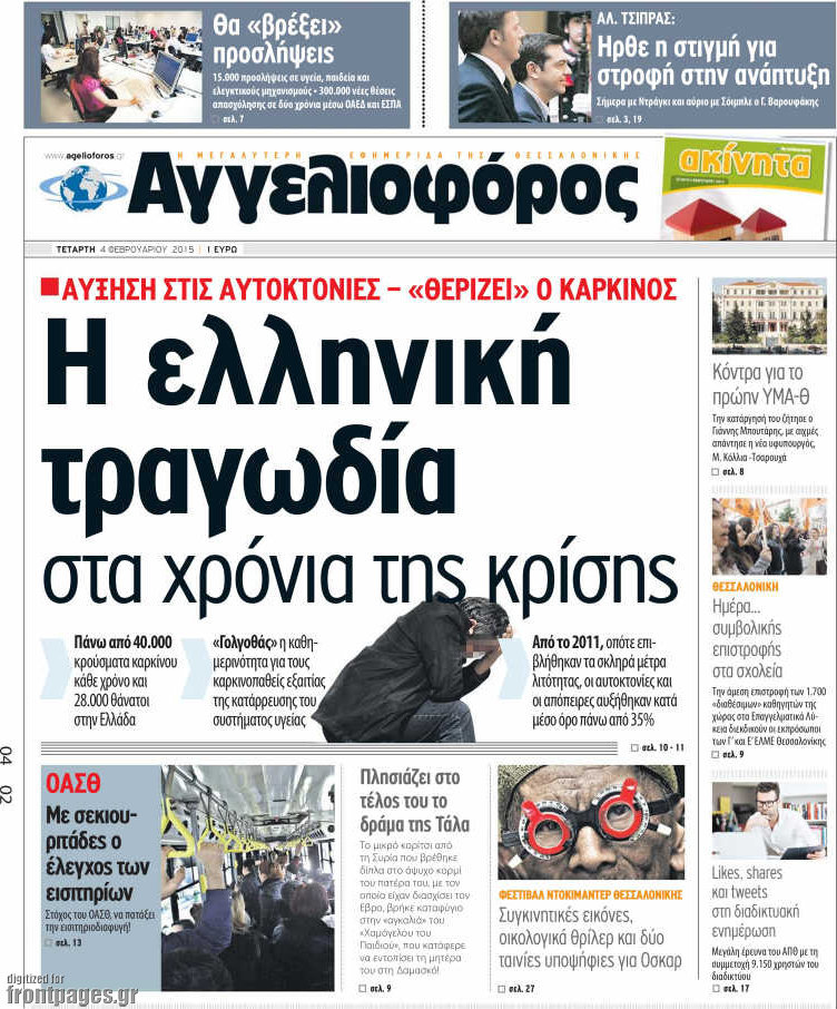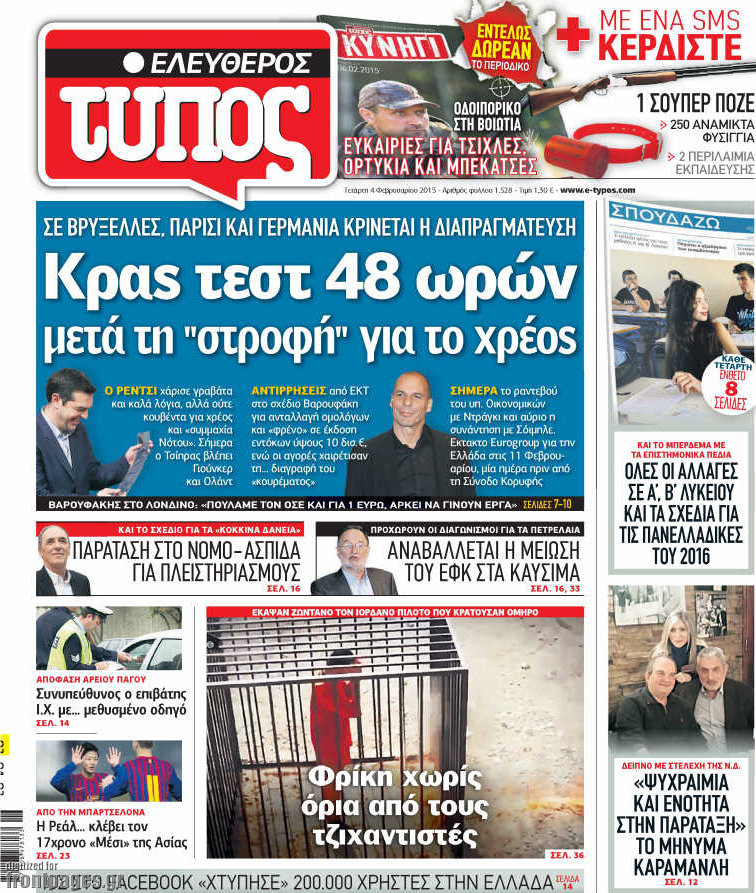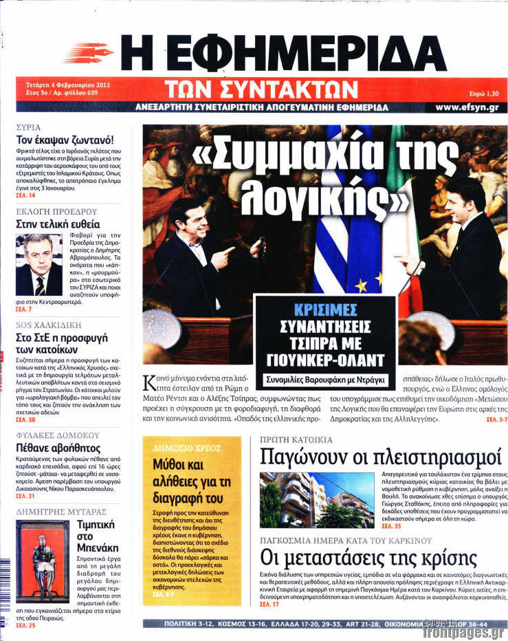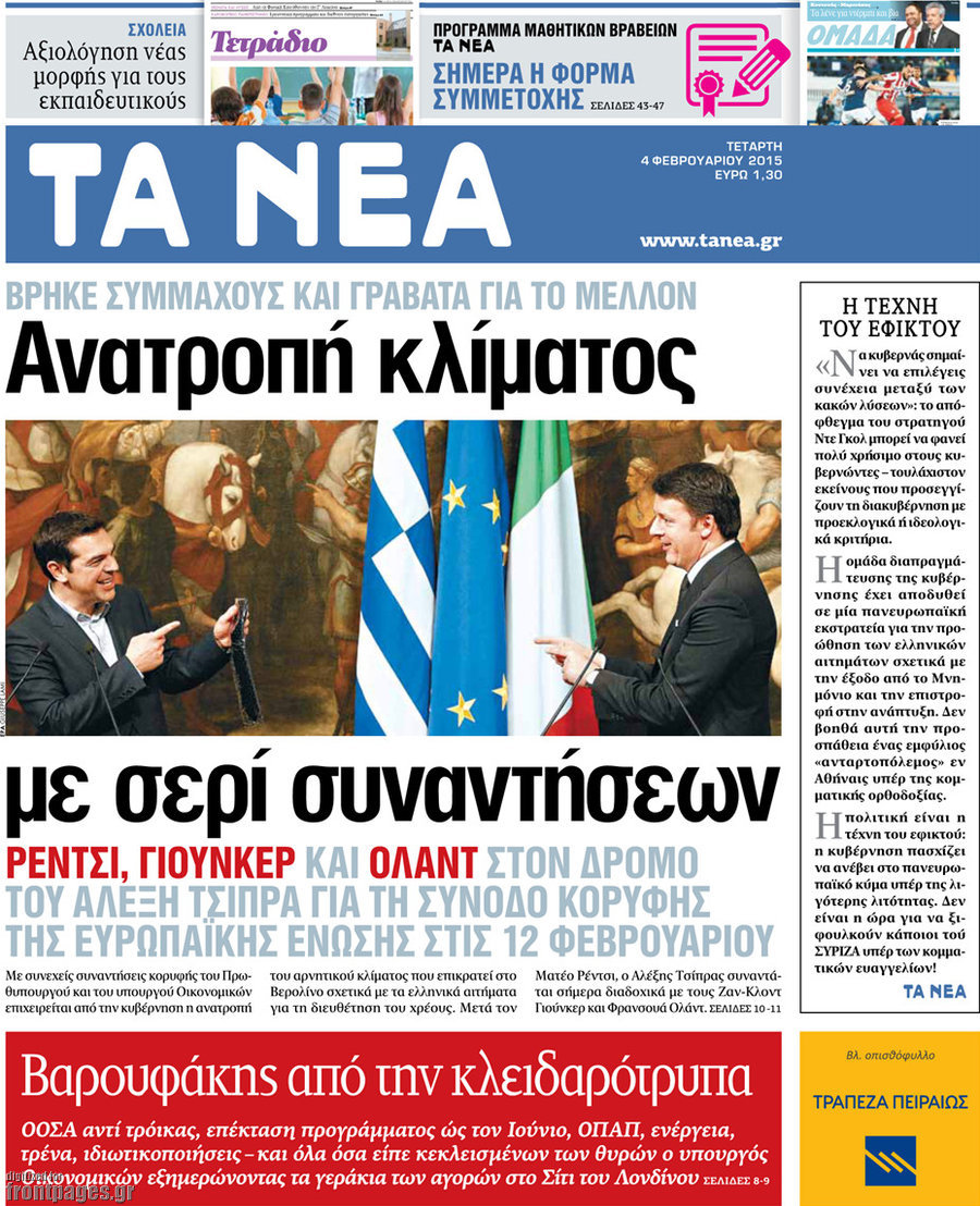 Οι πολιτικές εφημερίδες Enikos Newsroom 07:54, Τετάρτη 04 Φεβρουαρίου 2015 Media Διαβάστε τα πρωτοσέλιδα των πολιτικών εφημερίδων: ΠΟΛΙΤΙΚΕΣ ΕΦΗΜΕΡΙΔΕΣ ΠΡΩΤΟΣΕΛΙΔΑ Μοιράσου το: σχολίασε κι εσύ (0 σχόλια) Ακολουθήστε το enikos.gr στο Google News και μάθετε πρώτοι όλες τις ειδήσεις Δείτε όλες τις τελευταίες ειδήσεις από την Ελλάδα και τον Κόσμο στο enikos.gr Ειδήσεις Ροή Ειδήσεων 43 λεπτά πριν Υπόθεση Έπσταϊν: Το Υπουργείο Δικαιοσύνης δημοσιοποίησε μια σειρά από εξαιρετικά επεξεργασμένα αρχεία – «Λείπουν τα πιο σημαντικά έγγραφα», λένε οι Δημοκρατικοί 2 ώρες πριν Σαρωτικοί οι έλεγχοι στους δρόμους ενόψει εορτών – Μπλόκα της τροχαίας σε κεντρικές αρτηρίες της Αττικής 54 λεπτά πριν ΟΝΕΧ – MEGATUGS: Ξεκίνησε η ναυπήγηση ρυμουλκών στην Ελλάδα – Προθάλαμος πολεμικών πλοίων – Δείτε φωτογραφίες και βίντεο 46 λεπτά πριν Καιρός: Αλλαγή σκηνικού σήμερα με βροχές και πτώση της θερμοκρασίας – Οι προβλέψεις των μετεωρολόγων για τα Χριστούγεννα 10 ώρες πριν Χριστούγεννα στα μπλόκα: Επιμένουν στις κινητοποιήσεις τους οι αγρότες – Ανοίγουν τα διόδια το Σαββατοκύριακο 2 ώρες πριν Αυγά: Πόσα μπορείτε να τρώτε την ημέρα με ασφάλεια για μέγιστη πρόσληψη πρωτεΐνης 3 ώρες πριν Τα ζώδια σήμερα, Σάββατο 20 Δεκεμβρίου: Παρθένοι, το σύμπαν σας δίνει το κλειδί 2 ώρες πριν Οπτική ψευδαίσθηση: Μόνο αν είσαι ο Σέρλοκ Χολμς θα βρεις τον αριθμό «87» σε 7 δευτερόλεπτα 23 λεπτά πριν Αρχαιολόγοι ανακάλυψαν σε χωράφι απεικόνιση 600 ετών ενός Αγίου – Τα στοιχεία που δείχνουν ότι μαρτύρησε 7 λεπτά πριν MyHealth App: Τα στοιχεία για τον Προσωπικό Βοηθό Υγείας Πολίτη – Τι ερωτήματα έγιναν μέσα σε 7 ημέρες 15 λεπτά πριν Τρομεροί γονείς: Η Μαρία Καβογιάννη εισβάλλει στο σπίτι της οικογένειας Στεφανίδη 23 λεπτά πριν Αρχαιολόγοι ανακάλυψαν σε χωράφι απεικόνιση 600 ετών ενός Αγίου – Τα στοιχεία που δείχνουν ότι μαρτύρησε 31 λεπτά πριν Mega χριστουγεννιάτικη φορολοταρία: «Κλείδωσε» η ημερομηνία για την κλήρωση – Ερωτήσεις και απαντήσεις 38 λεπτά πριν ΗΠΑ: Τέσσερις μετανάστες πέθαναν σε κέντρα κράτησης – Αύξηση θανάτων σε επίπεδο ρεκόρ το 2025 ENIKOS NETWORK Το τεστ των 10 δευτερολέπτων που μπορεί να προβλέψει το προσδόκιμο ζωής σας – Τι λέει ειδικός του Cleveland Επιλέξτε καρέκλα για να μάθετε ποια είναι τα κρυφά χαρακτηριστικά σας – Τι αποκάλυψε για εσάς αυτό το τεστ προσωπικότητας; Mega χριστουγεννιάτικη φορολοταρία: «Κλείδωσε» η ημερομηνία για την κλήρωση – Ερωτήσεις και απαντήσεις Αναστολή μέτρων αναγκαστικής εκτέλεσης για κτηνοτρόφους που πλήττονται από την ευλογιά των αιγοπροβάτων Χαρτογραφώντας το «σημείο χωρίς επιστροφή»: Για πρώτη φορά αποκαλύπτεται με λεπτομέρεια το ακανθώδες όριο της ατμόσφαιρας τ... Η Google καταργεί τη λειτουργία «dark web report» – Πώς θα μπορούν οι χρήστες να διαγράφουν τα δεδομένα τους περισσότερα 08:14 , Σάββατο 20 Δεκεμβρίου 2025 Τρομεροί γονείς: Η Μαρία Καβογιάννη εισβάλλει στο σπίτι της οικογένειας Στεφανίδη Όσα θα δούμε στο νέο διπλό επεισόδιο της σειράς «Τρομεροί γονείς», σήμερα Σάββατο 20 Δεκεμβρίο... 05:48 , Σάββατο 20 Δεκεμβρίου 2025 Οι οικονομικές εφημερίδες 20/12/2025 Διαβάστε τα πρωτοσέλιδα από τις οικονομικές εφημερίδες, σήμερα 20/12/2025. 05:43 , Σάββατο 20 Δεκεμβρίου 2025 Οι αθλητικές εφημερίδες 20/12/2025 Διαβάστε τα πρωτοσέλιδα από τις αθλητικές εφημερίδες, σήμερα 20/12/2025. 05:38 , Σάββατο 20 Δεκεμβρίου 2025 Οι πολιτικές εφημερίδες 20/12/2025 Διαβάστε τα πρωτοσέλιδα από τις πολιτικές εφημερίδες, σήμερα 20/12/2025. ΤΕΛΕΥΤΑΙΕΣ ΕΙΔΗΣΕΙΣ 7 λεπ