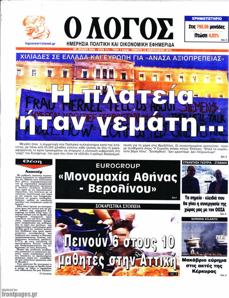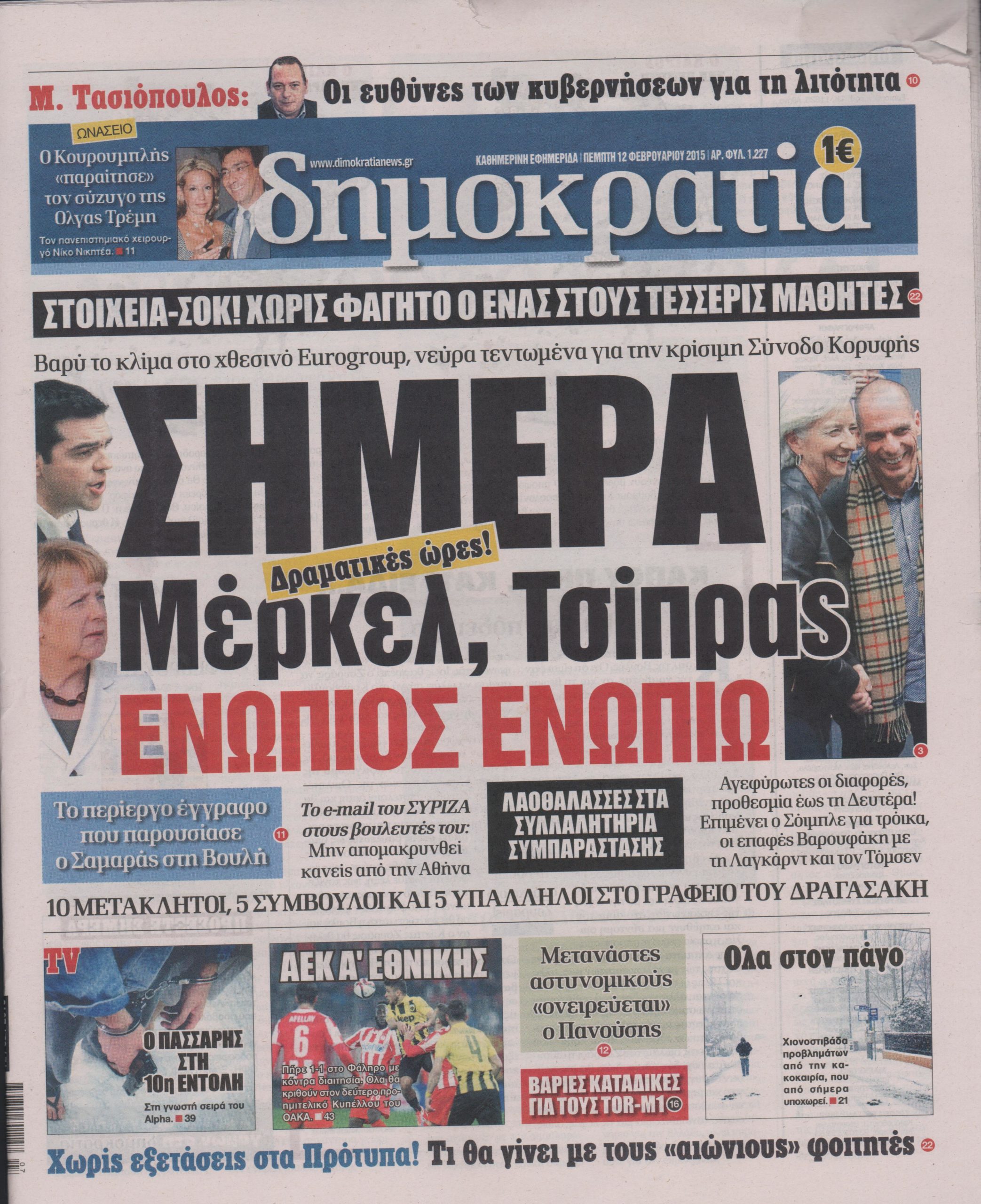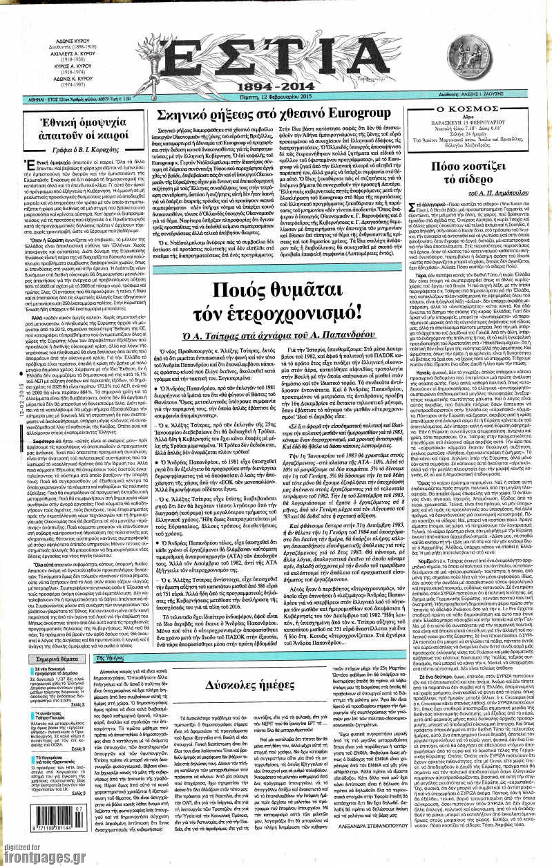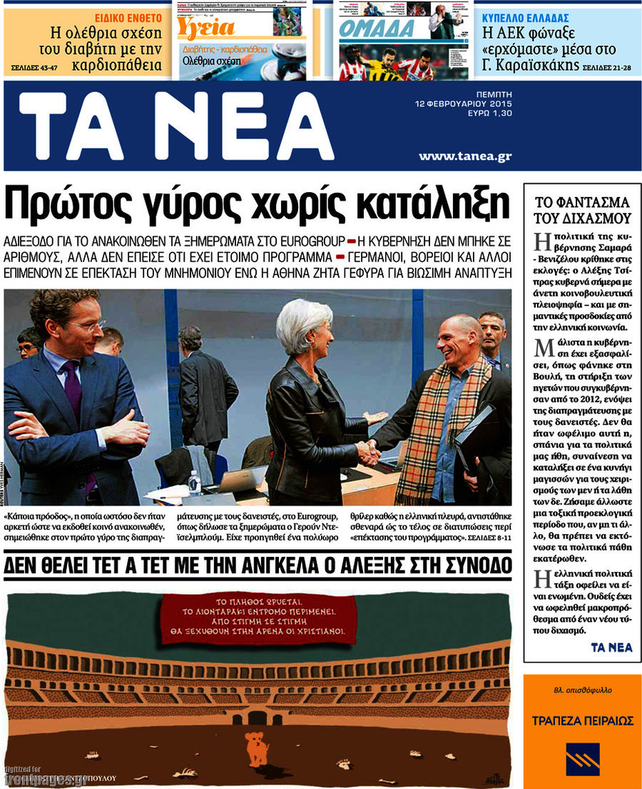 Οι πολιτικές εφημερίδες Enikos Newsroom 07:38, Πέμπτη 12 Φεβρουαρίου 2015 Media ΠΟΛΙΤΙΚΕΣ ΕΦΗΜΕΡΙΔΕΣ ΠΡΩΤΟΣΕΛΙΔΑ Μοιράσου το: σχολίασε κι εσύ (0 σχόλια) Ακολουθήστε το enikos.gr στο Google News και μάθετε πρώτοι όλες τις ειδήσεις Δείτε όλες τις τελευταίες ειδήσεις από την Ελλάδα και τον Κόσμο στο enikos.gr Ειδήσεις Ροή Ειδήσεων 4 ώρες πριν Χριστούγεννα στα μπλόκα: Επιμένουν στις κινητοποιήσεις τους οι αγρότες – Ανοίγουν τα διόδια το Σαββατοκύριακο 4 ώρες πριν Ουκρανία: Η άνευ προηγουμένου επίθεση σε ρωσικό τάνκερ στη Μεσόγειο και το μήνυμα προς στον Πούτιν – Το «μακρύ χέρι» του Κιέβου 3 ώρες πριν Πούτιν: Τα μηνύματα σε Ευρώπη και ΝΑΤΟ από το μαραθώνιο «σόου» του – Η απαίτηση για «σεβασμό» και η ειρήνη «με τους όρους» της Μόσχας 4 ώρες πριν Τραμπ: Δεν αποκλείει την πιθανότητα ενός πολέμου στη Βενεζουέλα – «Ο Μαδούρο ξέρει καλύτερα από τον καθένα τι ακριβώς θέλω» 5 ώρες πριν Συνεχίζει να προκαλεί ο Μίτσκοσκι: «Για μένα το όνομα Μακεδονία είναι ιερό» 3 ώρες πριν Ανακαλύφθηκαν αρχαία χρυσά νομίσματα 2.200 ετών που απεικονίζουν τον θεό Απόλλωνα – Η άγνωστη σύνδεση με τον Φίλιππο Β΄ της Μακεδονίας 4 ώρες πριν Ύπνος: Μια κρυφή κατάσταση του εγκεφάλου πριν από τον ύπνο μπορεί να είναι το “κλειδί” για υψηλή ευφυΐα και δημιουργικότητα 5 ώρες πριν Αριθμολογία: Οι άνθρωποι που έχουν γεννηθεί αυτές τις 4 ημερομηνίες, συχνά παρεξηγούνται – «Η καλοσύνη τους κρύβει τεράστια δύναμη» 6 ώρες πριν Ξεχάστε το καθάρισμα το Σαββατοκύριακο: Ο «κανόνας των 20 λεπτών» που θα σας λύσει τα χέρια 15 λεπτά πριν ΗΠΑ: Τραγωδία στην Αλαμπάμα – Σκότωσε την δημοσιογράφο σύζυγό του και αυτοκτόνησε μπροστά στον 3χρονο γιο τους 29 λεπτά πριν Πρόταση γάμου στο ΣΕΦ κατά την διάρκεια του αγώνα Ολυμπιακός-Βιλερμπάν – Δείτε βίντεο 44 λεπτά πριν Euroleague: Επέστρεψε στις νίκες ο Ολυμπιακός, πήρε την ματσάρα της χρονιάς η Μπάρτσα – Τα αποτελέσματα και η βαθμολογία 59 λεπτά πριν Συρία: Μαζικά πλήγματα των ΗΠΑ σε θέσεις του Ισλαμικού Κράτους – Χέγκσεθ: «Δεν είναι αρχή πολέμου, είναι μια δήλωση εκδίκησης» για το θάνατο των στρατιωτών μας 1 ώρα πριν Ουκρανία: Ολοκληρώθηκαν οι συνομιλίες με τους Αμερικανούς κι Ευρωπαίους διαπραγματευτές ENIKOS NETWORK Το ΕΚΑΒ τιμήθηκε από την Ακαδημία Αθηνών για τα 40 χρόνια προσφοράς του Έχετε πραγματικά μεγάλη καρδιά; 10 χαρακτηριστικά όσων έχουν καλοσύνη Αναστολή μέτρων αναγκαστικής εκτέλεσης για κτηνοτρόφους που πλήττονται από την ευλογιά των αιγοπροβάτων Πλήρης επάρκεια προϊόντων στις λαϊκές της Αττικής, παρά τις αγροτικές κινητοποιήσεις – Τι απαντούν οι πωλητές Χαρτογραφώντας το «σημείο χωρίς επιστροφή»: Για πρώτη φορά αποκαλύπτεται με λεπτομέρεια το ακανθώδες όριο της ατμόσφαιρας τ... Η Google καταργεί τη λειτουργία «dark web report» – Πώς θα μπορούν οι χρήστες να διαγράφουν τα δεδομένα τους περισσότερα 22:42 , Παρασκευή 19 Δεκεμβρίου 2025 Γιώργος Γιαννόπουλος για “Το σόι σου”: “Είναι ευτυχία και ευλογία αυτή η σειρά” «Είναι ευτυχία και ευλογία η συγκυρία αυτής της σειράς», θα πει ο Γιώργος Γιαννόπουλος -ο αγαπ... 20:37 , Παρασκευή 19 Δεκεμβρίου 2025 Don’t Forget The Lyrics: Η Έλλη Κοκκίνου υποδέχεται 4 παίκτες που θα κάνουν τα πάντα για να μη χάσουν ούτε… μισή λέξη από τους στίχους Το «Don’t Forget The Lyrics» επιστρέφει απόψε, Παρασκευή 19 Δεκεμβρίου, στις 21:00 με νέο επει... 19:31 , Παρασκευή 19 Δεκεμβρίου 2025 GNTM: Απόψε ο μεγάλος τελικός για τους 4 φιναλίστ Έπειτα από μήνες γεμάτους μόδα, δημιουργία και έντονες αναμετρήσεις, το GNTM