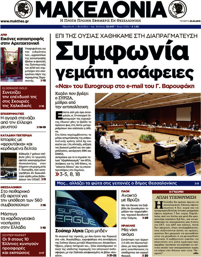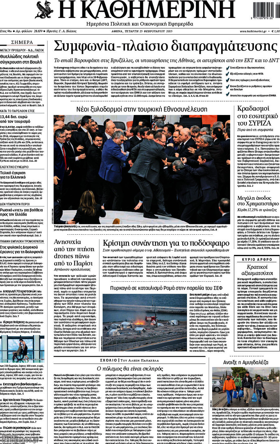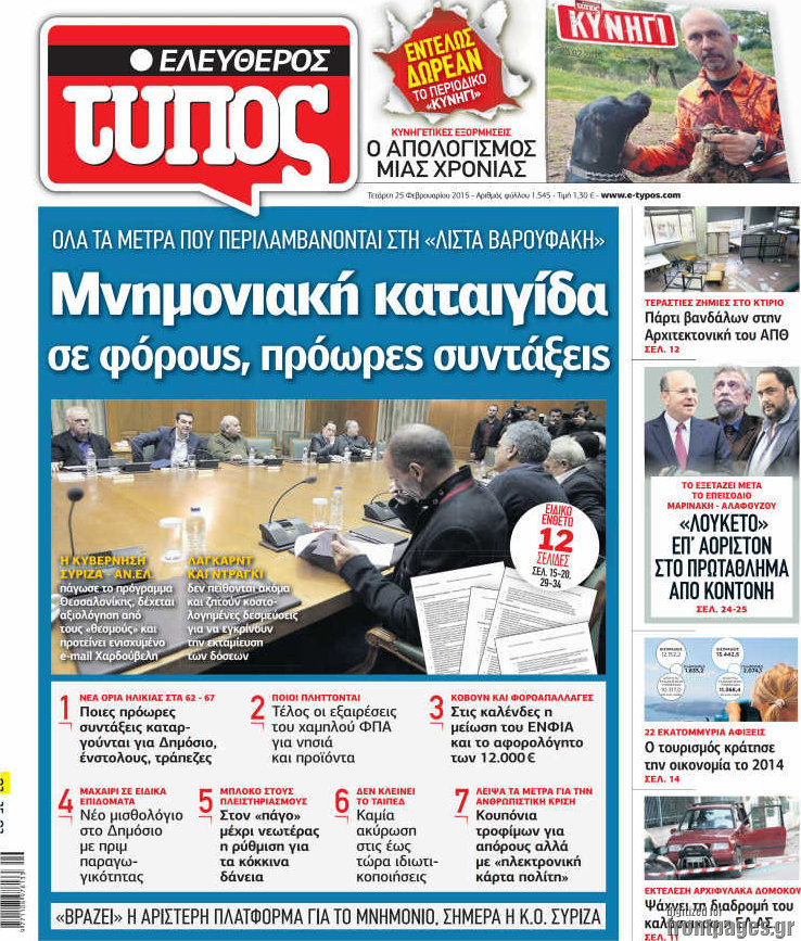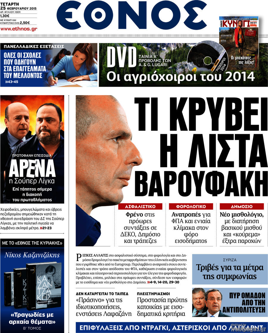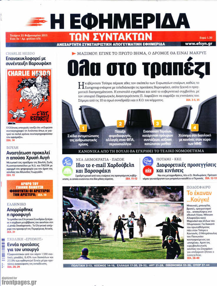Οι πολιτικές εφημερίδες Enikos Newsroom 07:53, Τετάρτη 25 Φεβρουαρίου 2015 Media Διαβάστε τα σημερινά πρωτοσέλιδα των πολιτικών εφημερίδων: ΕΦΗΜΕΡΙΔΕΣ ΠΟΛΙΤΙΚΕΣ ΕΦΗΜΕΡΙΔΕΣ ΠΡΩΤΟΣΕΛΙΔΑ Μοιράσου το: σχολίασε κι εσύ (0 σχόλια) Ακολουθήστε το enikos.gr στο Google News και μάθετε πρώτοι όλες τις ειδήσεις Δείτε όλες τις τελευταίες ειδήσεις από την Ελλάδα και τον Κόσμο στο enikos.gr Ειδήσεις Ροή Ειδήσεων 4 ώρες πριν Υπόθεση Έπσταϊν: Το Υπουργείο Δικαιοσύνης δημοσιοποίησε μια σειρά από εξαιρετικά επεξεργασμένα αρχεία – «Λείπουν τα πιο σημαντικά έγγραφα», λένε οι Δημοκρατικοί 56 λεπτά πριν Γιορτές με μπλόκα για τους αγρότες: Ανοίγουν διόδια και μοιράζουν προϊόντα στους ταξιδιώτες 1 ώρα πριν Εξαφάνιση 33χρονου γιατρού στην Κρήτη: «Άναψα τα φώτα, τρόμαξε και άρχισε να τρέχει στα χωράφια» – Η τελευταία διαδρομή και η μαρτυρία «κλειδί» 3 ώρες πριν Ο «χάρτης» με τις αυξήσεις και τις φοροελαφρύνσεις του 2026 – Ποιοι και πόσα κερδίζουν 1 ώρα πριν Τα αρχεία του Έπσταϊν αποκαλύπτουν φωτογραφία του έκπτωτου πρίγκιπα Άντριου – Είναι ξαπλωμένος στην αγκαλιά 5 γυναικών 1 ώρα πριν Μία νέα «χρυσή» περίοδος αρχίζει για 3 ζώδια από σήμερα – «Μία αναπάντεχη ευκαιρία οδηγεί στην επιτυχία» 6 ώρες πριν Αυγά: Πόσα μπορείτε να τρώτε την ημέρα με ασφάλεια για μέγιστη πρόσληψη πρωτεΐνης 3 ώρες πριν Αρχαιολόγοι ανακάλυψαν σε χωράφι απεικόνιση 600 ετών ενός Αγίου – Τα στοιχεία που δείχνουν ότι μαρτύρησε 2 ώρες πριν Αγχώνεται για το χριστουγεννιάτικο δώρο που πήρε στην πλούσια σύντροφό του – «Φοβάμαι πως θα το βρει φθηνιάρικο, φοράει βραχιόλια Cartier» 5 λεπτά πριν Τραγωδία στην άσφαλτο στα Χανιά: Νεκρός 37χρονος οδηγός ΙΧ – Τον βρήκαν ώρες μετά το τροχαίο 13 λεπτά πριν Τα Labubu «μετακομίζουν» στο Χόλιγουντ: Η Sony Pictures ετοιμάζει live-action ταινία με τον σκηνοθέτη του «Wonka» 21 λεπτά πριν Νέες ταυτότητες: Μεγάλη αναμονή για ραντεβού στην Αττική – Τέλος τα ταξίδια εκτός Ελλάδος από τον Αύγουστο για όσους δεν έχουν αλλάξει 29 λεπτά πριν Οι 7 φράσεις που δεν λένε ποτέ οι συναισθηματικά έξυπνοι άνθρωποι κατά τη διάρκεια ενός καβγά 33 λεπτά πριν Τηλεθέαση (19/12): Ανατροπές και πρωτιές στην πρωινή ζώνη ENIKOS NETWORK Είστε μόνιμα απρόσεκτοι; 3 σημάδια που δείχνουν ότι μπορεί να είναι σύμπτωμα πάθησης Πόσα κιλά παίρνουμε πραγματικά τα Χριστούγεννα, σύμφωνα με την επιστήμη – Πώς να το αποτρέψουμε; e-ΕΦΚΑ και ΔΥΠΑ: Έρχονται νέες πληρωμές έως τις 24 Δεκεμβρίου – Ποιοι πάνε ταμείο Επίδομα παιδιού: Τι αλλάζει από το 2026 – Το όφελος από τις φορολογικές ελαφρύνσεις Χαρτογραφώντας το «σημείο χωρίς επιστροφή»: Για πρώτη φορά αποκαλύπτεται με λεπτομέρεια το ακανθώδες όριο της ατμόσφαιρας τ... Η Google καταργεί τη λειτουργία «dark web report» – Πώς θα μπορούν οι χρήστες να διαγράφουν τα δεδομένα τους περισσότερα 09:30 , Σάββατο 20 Δεκεμβρίου 2025 «Porto Leone: Στη γειτονιά με τα κόκκινα φανάρια» – Ο Χρόνης αποκαλύπτει στην Αλεξάνδρα το μυστικό για το παιδί της Λένας Η μεγάλη δραματική σειρά του Apha «Porto Leone: Στη γειτονιά με τα κόκκινα φανάρια» μας μεταφέ... 08:14 , Σάββατο 20 Δεκεμβρίου 2025 Τρομεροί γονείς: Η Μαρία Καβογιάννη εισβάλλει στο σπίτι της οικογένειας Στεφανίδη Όσα θα δούμε στο νέο διπλό επεισόδιο της σειράς «Τρομεροί γονείς», σήμερα Σάββατο 20 Δεκεμβρίο... 05:48 , Σάββατο 20 Δεκεμβρίου 2025 Οι οικονομικές εφημερίδες 20/12/2025 Διαβάστε τα πρωτοσέλιδα από τις οικονομικές εφημερίδες, σήμερα 20/12/2025. 05:43 , Σάββατο 20 Δεκεμβρίου 2025 Οι αθλητικές εφημερίδες 20/12/2025 Διαβάστε τα πρωτοσ