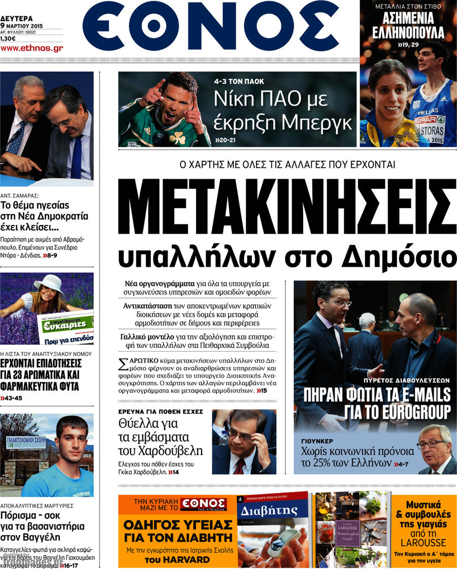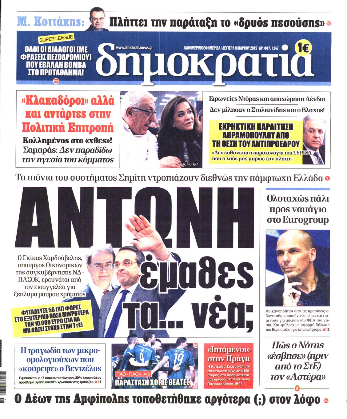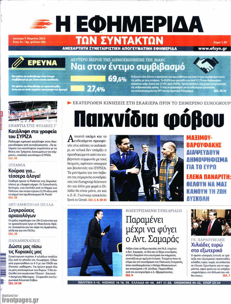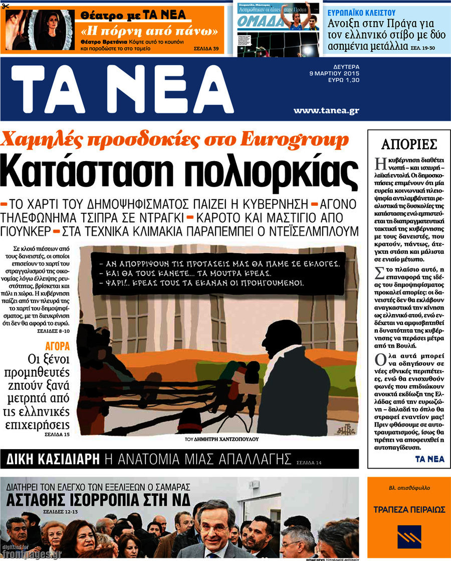 Οι πολιτικές εφημερίδες Enikos Newsroom 07:41, Δευτέρα 09 Μαρτίου 2015 Media Διαβάστε τα σημερινά πρωτοσέλιδα των πολιτικών εφημερίδων: ΕΦΗΜΕΡΙΔΕΣ ΠΟΛΙΤΙΚΕΣ ΕΦΗΜΕΡΙΔΕΣ ΠΡΩΤΟΣΕΛΙΔΑ Μοιράσου το: σχολίασε κι εσύ (0 σχόλια) Ακολουθήστε το enikos.gr στο Google News και μάθετε πρώτοι όλες τις ειδήσεις Δείτε όλες τις τελευταίες ειδήσεις από την Ελλάδα και τον Κόσμο στο enikos.gr Ειδήσεις Ροή Ειδήσεων 2 ώρες πριν Κυριάκος Μητσοτάκης: «Κάποιοι αγρότες δεν αισθάνονται την ανάγκη να διαφωνήσουν με τις προτάσεις της κυβέρνησης, η Ευρώπη στέκεται στο πλευρό της Ουκρανίας» 7 ώρες πριν ΟΠΕΚΕΠΕ: Προφυλακιστέος ο φερόμενος αρχηγός και ο λογιστής της εγκληματικής οργάνωσης 8 ώρες πριν Αυξάνουν την πίεση προς την κυβέρνηση οι αγρότες: Κλείνουν παρακαμπτήριους και ανοίγουν διόδια – Τι θα γίνει τις γιορτές 8 ώρες πριν Φοινικούντα: Το Σάββατο απολογείται ο 30χρονος γιος γνωστού επιχειρηματία της Πλάκας που παραδόθηκε – Όσα είπε στους αστυνομικούς και ο ρόλος του στο έγκλημα 7 ώρες πριν ΑΕΚ – Κραϊόβα 3-2: Επική ανατροπή και πρόκριση στους «16» του Conference League η Ένωση 8 ώρες πριν Αρχαιολόγοι ανακάλυψαν ρωμαϊκά τεχνουργήματα από μια πόλη που δεν υπήρξε ποτέ – Τα τρία εντυπωσιακά κτίρια και ο αμφορέας με τις… σαρδέλες 9 ώρες πριν Ύπνος: Η απλή βραδινή ρουτίνα για να προστατεύσετε τα μαλλιά σας από το κρύο κατά τη διάρκεια του χειμώνα 10 ώρες πριν Manifesting: Πώς να συναντήσετε τον σύντροφο της ζωής σας, ανάλογα με τον μήνα γέννησής σας 2 ημέρες πριν 20 χρόνια τα Χριστούγεννα ξεκινούν στα Public με μεγάλη ποικιλία σε δώρα! 10 λεπτά πριν Φρίντριχ Μερτς: Χορήγηση άτοκου δανείου στην Ουκρανία συμφώνησαν τα κράτη – μέλη της ΕΕ 18 λεπτά πριν Απειλή για το Προϋπολογισμό τα ληξιπρόθεσμα χρέη των ιδιωτών προς την εφορία 18 λεπτά πριν Πέντε νεκροί σε πλήγματα των ΗΠΑ κατά δύο σκαφών που φέρεται να μετέφεραν ναρκωτικά στον Ανατολικό Ειρηνικό 26 λεπτά πριν ΕΥΔΑΠ: Αλλάζουν τα τιμολόγια του νερού 34 λεπτά πριν Οπτική ψευδαίσθηση: Μόνο αν έχεις αετίσια ματιά θα βρεις τον παπαγάλο σε 12 δευτερόλεπτα ENIKOS NETWORK Σε περίοδο αυξημένης δραστηριότητας η γρίπη στην Ελλάδα-Μέτρα προστασίας από τον ΕΟΔΥ Σκέφτεστε συνέχεια συζητήσεις που έχετε κάνει; Τι σημαίνει αυτό, σύμφωνα με ειδικό Στεγαστικό: Τι λέει η ΠΟΜΙΔΑ για τα νέα μέτρα που ανακοίνωσε ο Κυριάκος Μητσοτάκης Λαγκάρντ: Αισιόδοξη για την ανάπτυξη της Ευρωζώνης, αβέβαιη για τον πληθωρισμό Χαρτογραφώντας το «σημείο χωρίς επιστροφή»: Για πρώτη φορά αποκαλύπτεται με λεπτομέρεια το ακανθώδες όριο της ατμόσφαιρας τ... Η Google καταργεί τη λειτουργία «dark web report» – Πώς θα μπορούν οι χρήστες να διαγράφουν τα δεδομένα τους περισσότερα 05:48 , Παρασκευή 19 Δεκεμβρίου 2025 Οι οικονομικές εφημερίδες 19/12/2025 Διαβάστε τα πρωτοσέλιδα από τις οικονομικές εφημερίδες, σήμερα 19/12/2025. 05:43 , Παρασκευή 19 Δεκεμβρίου 2025 Οι αθλητικές εφημερίδες 19/12/2025 Διαβάστε τα πρωτοσέλιδα από τις αθλητικές εφημερίδες, σήμερα 19/12/2025. 05:38 , Παρασκευή 19 Δεκεμβρίου 2025 Οι πολιτικές εφημερίδες 19/12/2025 Διαβάστε τα πρωτοσέλιδα από τις πολιτικές εφημερίδες, σήμερα 19/12/2025. 02:50 , Παρασκευή 19 Δεκεμβρίου 2025 GNTM: «Κλείδωσαν» οι τέσσερις φιναλίστ – Μεγάλη ανατροπή στις τελευταίες αποχωρήσεις Για προτελευταία φορά εμφανίστηκαν στο πλατό του GNTM οι φιναλίστ του φετινού κύκλου, το βράδυ... ΤΕΛΕΥΤΑΙΕΣ ΕΙΔΗΣΕΙΣ 10 λεπτά πριν Φρίντριχ Μερτς: Χορήγηση άτοκου δανείου στην Ουκρανία... 18 λεπτά πριν Απειλή για το Προϋπολογισμό τα ληξιπρόθεσμα χρέη των... 18 λ