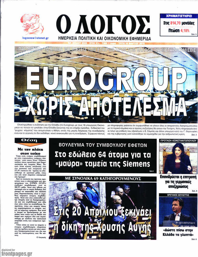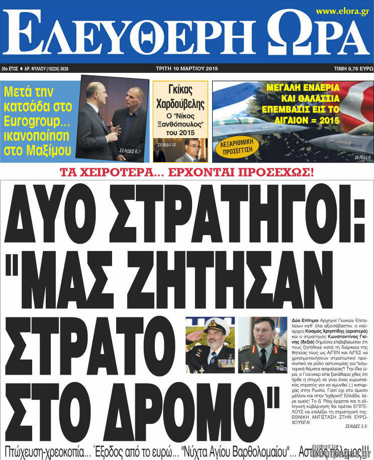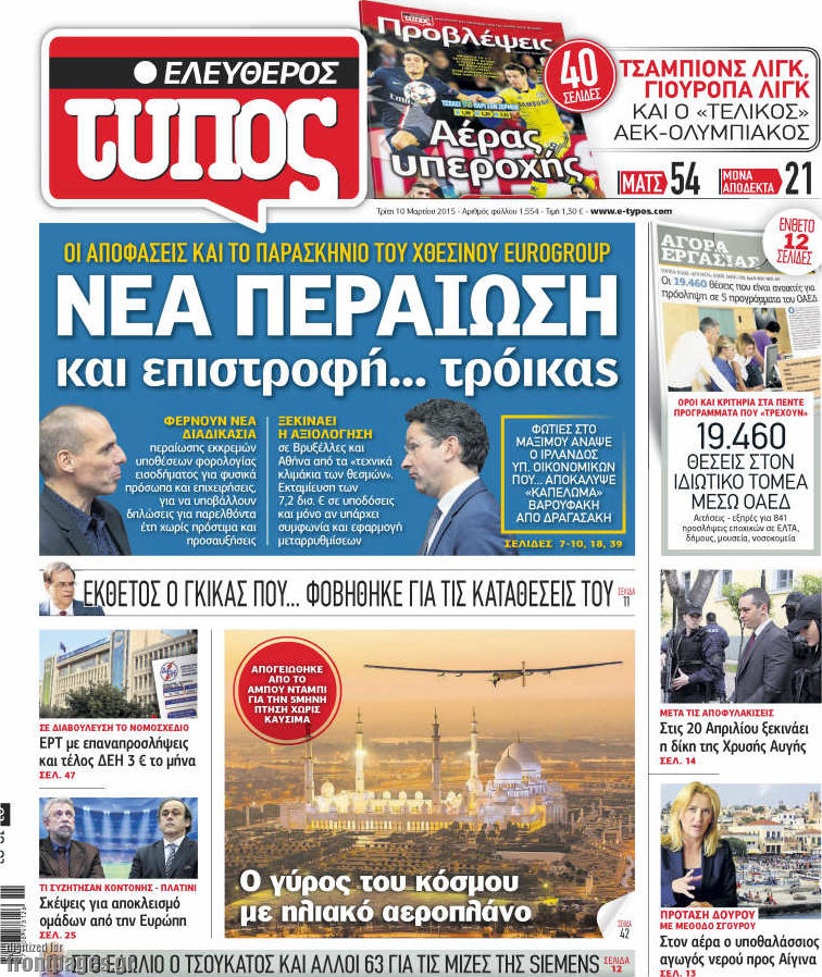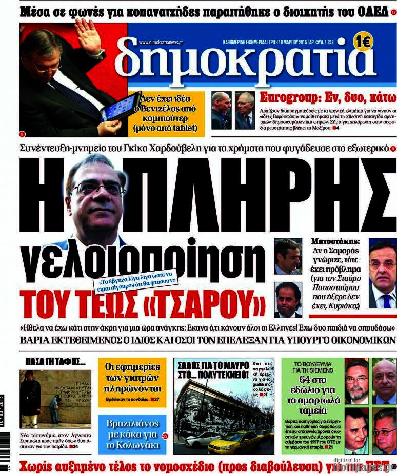 Οι πολιτικές εφημερίδες Enikos Newsroom 08:07, Τρίτη 10 Μαρτίου 2015 Media Διαβάστε τα σημερινά πρωτοσέλιδα των πολιτικών εφημερίδων: ΠΟΛΙΤΙΚΕΣ ΕΦΗΜΕΡΙΔΕΣ ΠΡΩΤΟΣΕΛΙΔΑ Μοιράσου το: σχολίασε κι εσύ (0 σχόλια) Ακολουθήστε το enikos.gr στο Google News και μάθετε πρώτοι όλες τις ειδήσεις Δείτε όλες τις τελευταίες ειδήσεις από την Ελλάδα και τον Κόσμο στο enikos.gr Ειδήσεις Ροή Ειδήσεων 5 ώρες πριν Χριστούγεννα στα μπλόκα: Επιμένουν στις κινητοποιήσεις τους οι αγρότες – Ανοίγουν τα διόδια το Σαββατοκύριακο 5 ώρες πριν Ουκρανία: Η άνευ προηγουμένου επίθεση σε ρωσικό τάνκερ στη Μεσόγειο και το μήνυμα προς στον Πούτιν – Το «μακρύ χέρι» του Κιέβου 4 ώρες πριν Πούτιν: Τα μηνύματα σε Ευρώπη και ΝΑΤΟ από το μαραθώνιο «σόου» του – Η απαίτηση για «σεβασμό» και η ειρήνη «με τους όρους» της Μόσχας 5 ώρες πριν Τραμπ: Δεν αποκλείει την πιθανότητα ενός πολέμου στη Βενεζουέλα – «Ο Μαδούρο ξέρει καλύτερα από τον καθένα τι ακριβώς θέλω» 6 ώρες πριν Συνεχίζει να προκαλεί ο Μίτσκοσκι: «Για μένα το όνομα Μακεδονία είναι ιερό» 4 ώρες πριν Ανακαλύφθηκαν αρχαία χρυσά νομίσματα 2.200 ετών που απεικονίζουν τον θεό Απόλλωνα – Η άγνωστη σύνδεση με τον Φίλιππο Β΄ της Μακεδονίας 5 ώρες πριν Ύπνος: Μια κρυφή κατάσταση του εγκεφάλου πριν από τον ύπνο μπορεί να είναι το “κλειδί” για υψηλή ευφυΐα και δημιουργικότητα 6 ώρες πριν Αριθμολογία: Οι άνθρωποι που έχουν γεννηθεί αυτές τις 4 ημερομηνίες, συχνά παρεξηγούνται – «Η καλοσύνη τους κρύβει τεράστια δύναμη» 7 ώρες πριν Ξεχάστε το καθάρισμα το Σαββατοκύριακο: Ο «κανόνας των 20 λεπτών» που θα σας λύσει τα χέρια 6 λεπτά πριν Ταμίλα Κουλίεβα: «Δεν θέλω να είμαι κάποια που πορεύεται συνεχώς με τις ίδιες αναφορές» 21 λεπτά πριν Η Ελλάδα προσχωρεί στη Διεθνή Επιτροπή Αποζημιώσεων για την Ουκρανία 36 λεπτά πριν GNTM: Η Ξένια Τσίρκοβα αναδείχθηκε μεγάλη νικήτρια και πήρε τις 50.000 ευρώ – Ποιος βρέθηκε σε απόσταση αναπνοής; 51 λεπτά πριν Θεσσαλονίκη: Εξαφανίστηκε 13χρονος από χώρο φιλοξενίας ασυνόδευτων ανηλίκων στο Ωραιόκαστρο 1 ώρα πριν Ντόναλντ Τραμπ: «Πολύ βαριά αντίποινα» στη Συρία – «Πλήττουμε πολύ δυνατά οχυρά του Ισλαμικού Κράτους» ENIKOS NETWORK Το ΕΚΑΒ τιμήθηκε από την Ακαδημία Αθηνών για τα 40 χρόνια προσφοράς του Έχετε πραγματικά μεγάλη καρδιά; 10 χαρακτηριστικά όσων έχουν καλοσύνη Αναστολή μέτρων αναγκαστικής εκτέλεσης για κτηνοτρόφους που πλήττονται από την ευλογιά των αιγοπροβάτων Πλήρης επάρκεια προϊόντων στις λαϊκές της Αττικής, παρά τις αγροτικές κινητοποιήσεις – Τι απαντούν οι πωλητές Χαρτογραφώντας το «σημείο χωρίς επιστροφή»: Για πρώτη φορά αποκαλύπτεται με λεπτομέρεια το ακανθώδες όριο της ατμόσφαιρας τ... Η Google καταργεί τη λειτουργία «dark web report» – Πώς θα μπορούν οι χρήστες να διαγράφουν τα δεδομένα τους περισσότερα 02:50 , Σάββατο 20 Δεκεμβρίου 2025 GNTM: Η Ξένια Τσίρκοβα αναδείχθηκε μεγάλη νικήτρια και πήρε τις 50.000 ευρώ – Ποιος βρέθηκε σε απόσταση αναπνοής; Με φαντασμαγορικό τρόπο ολοκληρώθηκε το βράδυ της Παρασκευής ο μεγάλος τελικός του GNTM, μέσα ... 22:42 , Παρασκευή 19 Δεκεμβρίου 2025 Γιώργος Γιαννόπουλος για “Το σόι σου”: “Είναι ευτυχία και ευλογία αυτή η σειρά” «Είναι ευτυχία και ευλογία η συγκυρία αυτής της σειράς», θα πει ο Γιώργος Γιαννόπουλος -ο αγαπ... 20:37 , Παρασκευή 19 Δεκεμβρίου 2025 Don’t Forget The Lyrics: Η Έλλη Κοκκίνου υποδέχεται 4 παίκτες που θα κάνουν τα πάντα για να μη χάσουν ούτε… μισή λέξη από τους στίχους Το «Don’t Forget The Lyrics» επιστρέφει απόψε, Παρασκευή 