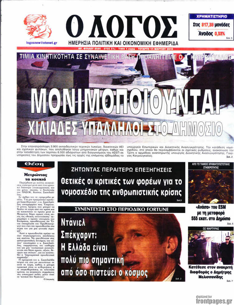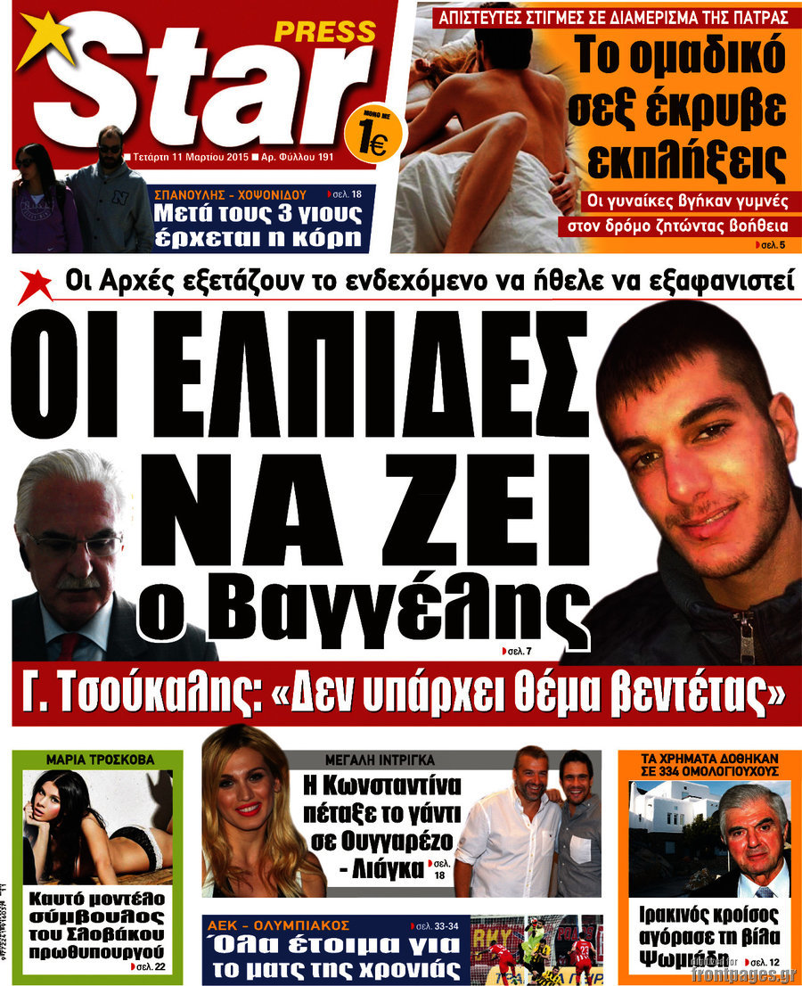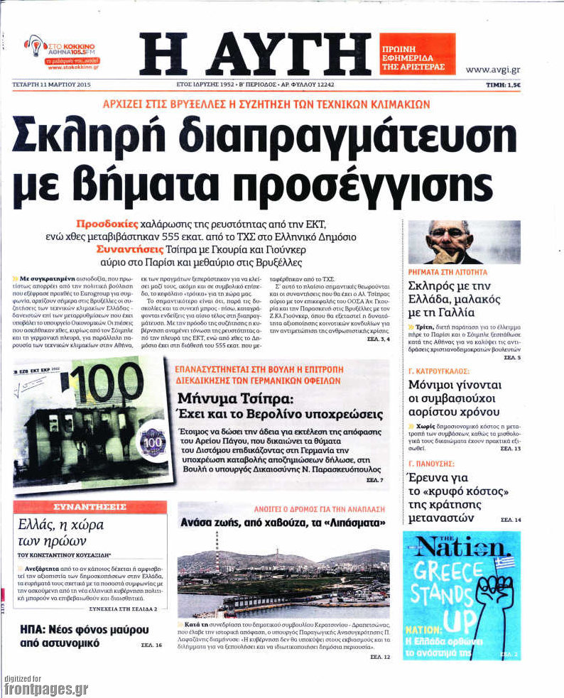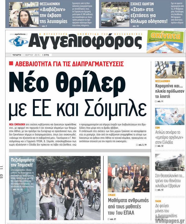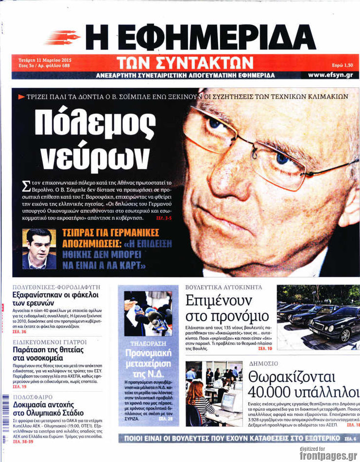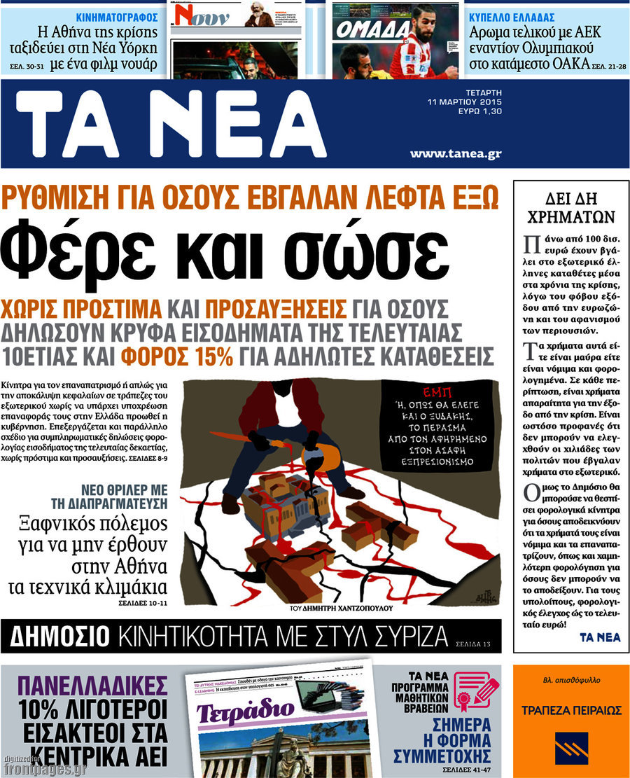Οι πολιτικές εφημερίδες Enikos Newsroom 08:07, Τετάρτη 11 Μαρτίου 2015 Media Διαβάστε τα σημερινά πρωτοσέλιδα των πολιτικών εφημερίδων: ΠΟΛΙΤΙΚΕΣ ΕΦΗΜΕΡΙΔΕΣ ΠΡΩΤΟΣΕΛΙΔΑ Μοιράσου το: σχολίασε κι εσύ (0 σχόλια) Ακολουθήστε το enikos.gr στο Google News και μάθετε πρώτοι όλες τις ειδήσεις Δείτε όλες τις τελευταίες ειδήσεις από την Ελλάδα και τον Κόσμο στο enikos.gr Ειδήσεις Ροή Ειδήσεων 2 ώρες πριν Μπλόκα: Οι αγρότες σηκώνουν τις μπάρες σε διόδια για τους εκδρομείς των Χριστουγέννων και μοιράζουν προϊόντα – Βίντεο 2 ώρες πριν Τσιάρας προς αγρότες: Τα μπλόκα και τα πείσματα δεν ωφελούν – Οι λύσεις περνούν μέσα από τον διάλογο 3 ώρες πριν Αρχεία Έπσταϊν: Οι συγκλονιστικές φωτογραφίες – Ο Μάικλ Τζάκσον, ο Μικ Τζάγκερ και ο Κέβιν Σπέισι ανάμεσα στους διάσημους που απεικονίζονται 60 λεπτά πριν Μαθητές διακινούσαν κοκαΐνη και χασίς σε σχολείο της Αττικής – 12 συλλήψεις 1 ώρα πριν Βέλγιο: Άγνωστοι έριξαν κόκκινη μπογιά στο προξενείο της Πολωνίας στις Βρυξέλλες 5 ώρες πριν Μία νέα «χρυσή» περίοδος αρχίζει για 3 ζώδια από σήμερα – «Μία αναπάντεχη ευκαιρία οδηγεί στην επιτυχία» 4 ώρες πριν Διαιτολόγος αποκαλύπτει 9 πρωινές συνήθειες που «λιώνουν» το κοιλιακό λίπος – «Υποστηρίζουν την υγιεινή απώλεια βάρους» 5 ώρες πριν Οι 7 φράσεις που δεν λένε ποτέ οι συναισθηματικά έξυπνοι άνθρωποι κατά τη διάρκεια ενός καβγά 7 ώρες πριν Enerwave: Το νέο «ρεύμα» στη λιανική ενέργειας που αλλάζει την εμπειρία του καταναλωτή 9 λεπτά πριν Μαρινάκης στον Realfm 97,8: Η κυβέρνηση σέβεται κάθε λογική διεκδίκηση των αγροτών, αλλά και το αίτημα των πολιτών να μην ταλαιπωρούνται 15 λεπτά πριν O Πάντερ MVP της 17ης αγωνιστικής στην Euroleague 23 λεπτά πριν Πέθανε η τραγουδίστρια Κλαούντια Ντελμέρ 31 λεπτά πριν Μία ανεκμετάλλευτη πηγή θα μπορούσε να προσφέρει ανεξάντλητη ενέργεια – Οι επιστήμονες ίσως γνωρίζουν πώς να την ξεκλειδώσουν 40 λεπτά πριν Θεσσαλονίκη: Ανήλικος που είχε εξαφανιστεί βρέθηκε στο σπίτι Τούρκων μετά από αστυνομική επιχείρηση ENIKOS NETWORK Η αποχή από την αναπαραγωγή παρατείνει τη ζωή στα ζώα, σύμφωνα με μελέτη – Τι ισχύει για τους ανθρώπους; Σημαντικές επαφές στις ΗΠΑ είχε ο υπουργός Υγείας Άδωνις Γεωργιάδης Ευλογιά αιγοπροβάτων: Παρατεταμένη επιζωοτία, αυστηρά μέτρα – Τι ισχύει για τον εμβολιασμό και την ανασύσταση του ζωικού κε... Τσιάρας προς αγρότες: Έχει ικανοποιηθεί το 74% των αιτημάτων – Τα μπλόκα και τα πείσματα δεν ωφελούν Χαρτογραφώντας το «σημείο χωρίς επιστροφή»: Για πρώτη φορά αποκαλύπτεται με λεπτομέρεια το ακανθώδες όριο της ατμόσφαιρας τ... Η Google καταργεί τη λειτουργία «dark web report» – Πώς θα μπορούν οι χρήστες να διαγράφουν τα δεδομένα τους περισσότερα 14:04 , Σάββατο 20 Δεκεμβρίου 2025 Η Realnews αυτής της Κυριακής (21/12/2025) Με τίτλο: «Ασπίδα προστασίας για την Ελλάδα» κυκλοφορεί, αυτήν την Κυριακή, η Realnews. Σημαντ... 12:53 , Σάββατο 20 Δεκεμβρίου 2025 Να μ’ αγαπάς: Το παρελθόν έρχεται στο φως – Καταιγιστικές εξελίξεις στα τελευταία επεισόδια του 2025 Ο Άγγελος αποκαλύπτεται, η Φωτεινή ανησυχεί για τον Λευτέρη και η Ζωή έρχεται αντιμέτωπη με το... 11:41 , Σάββατο 20 Δεκεμβρίου 2025 «Η αγάπη δεν χάνεται ποτέ»: Η μικρού μήκους ταινία κινουμένων σχεδίων που θέτει ερωτήματα για τη ζωή και τον θάνατο Ο θάνατος είναι ένα από τα πιο σκληρά θέματα που καλείται να διαχειριστεί κάποιος στη διάρκεια... 09:30 , Σάββατο 20 Δεκεμβρίου 2025 «Porto Leone: Στη γειτονιά με τα κόκκινα φανάρια» – Ο Χρόνης αποκαλύπτει στην Αλεξάνδρα το μυστικό για το