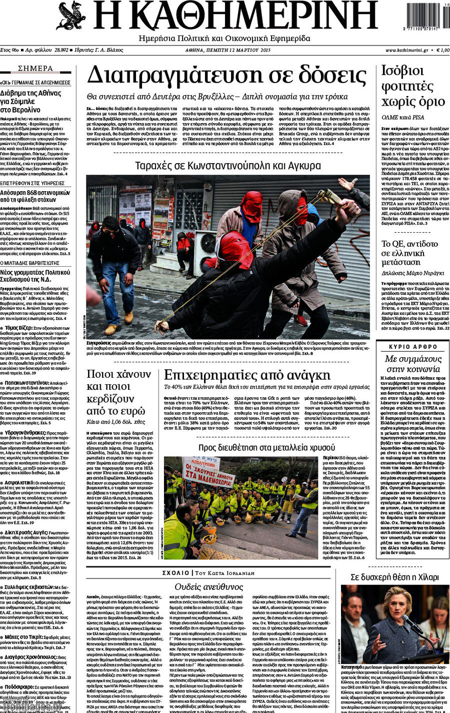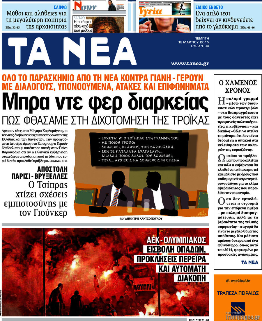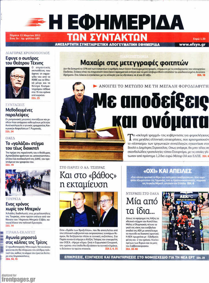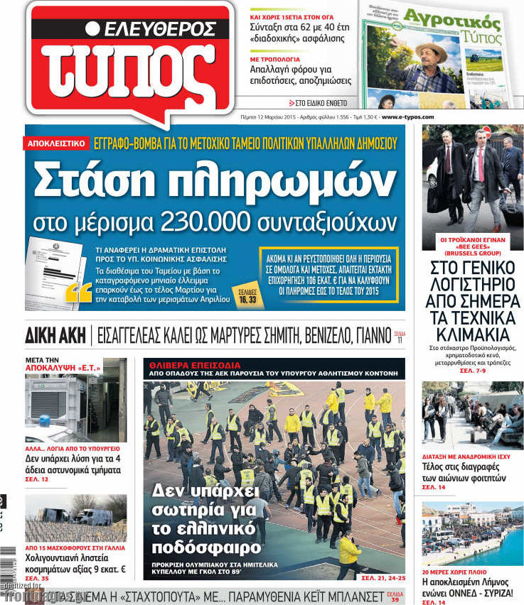 Οι πολιτικές εφημερίδες Enikos Newsroom 08:12, Πέμπτη 12 Μαρτίου 2015 Media Διαβάστε τα σημερινά πρωτοσέλιδα των πολιτικών εφημερίδων: ΠΟΛΙΤΙΚΕΣ ΕΦΗΜΕΡΙΔΕΣ ΠΡΩΤΟΣΕΛΙΔΑ Μοιράσου το: σχολίασε κι εσύ (0 σχόλια) Ακολουθήστε το enikos.gr στο Google News και μάθετε πρώτοι όλες τις ειδήσεις Δείτε όλες τις τελευταίες ειδήσεις από την Ελλάδα και τον Κόσμο στο enikos.gr Ειδήσεις Ροή Ειδήσεων 2 ώρες πριν Μπλόκα: Οι αγρότες σηκώνουν τις μπάρες σε διόδια για τους εκδρομείς των Χριστουγέννων και μοιράζουν προϊόντα – Βίντεο 3 ώρες πριν Τσιάρας προς αγρότες: Τα μπλόκα και τα πείσματα δεν ωφελούν – Οι λύσεις περνούν μέσα από τον διάλογο 4 ώρες πριν Αρχεία Έπσταϊν: Οι συγκλονιστικές φωτογραφίες – Ο Μάικλ Τζάκσον, ο Μικ Τζάγκερ και ο Κέβιν Σπέισι ανάμεσα στους διάσημους που απεικονίζονται 2 ώρες πριν Μαθητές διακινούσαν κοκαΐνη και χασίς σε σχολείο της Αττικής – 12 συλλήψεις 2 ώρες πριν Βέλγιο: Άγνωστοι έριξαν κόκκινη μπογιά στο προξενείο της Πολωνίας στις Βρυξέλλες 6 ώρες πριν Μία νέα «χρυσή» περίοδος αρχίζει για 3 ζώδια από σήμερα – «Μία αναπάντεχη ευκαιρία οδηγεί στην επιτυχία» 4 ώρες πριν Διαιτολόγος αποκαλύπτει 9 πρωινές συνήθειες που «λιώνουν» το κοιλιακό λίπος – «Υποστηρίζουν την υγιεινή απώλεια βάρους» 5 ώρες πριν Οι 7 φράσεις που δεν λένε ποτέ οι συναισθηματικά έξυπνοι άνθρωποι κατά τη διάρκεια ενός καβγά 7 ώρες πριν Enerwave: Το νέο «ρεύμα» στη λιανική ενέργειας που αλλάζει την εμπειρία του καταναλωτή 13 λεπτά πριν Στο νοσοκομείο ο Λευτέρης Πανταζής – Τι συνέβη 22 λεπτά πριν Super League: Με Κηφισιά ο Ολυμπιακός για να «κλείσει» το 2025 στην κορυφή – Αναλυτικά το πρόγραμμα της 15ης αγωνιστικής 27 λεπτά πριν ΕΛΑΣ: Συνελήφθησαν Υπαρχιπυροσβέστης και δύο ακόμη άτομα για κατοχή και διακίνηση ναρκωτικών ουσιών – Η καταγγελία και ο τιμοκατάλογος 35 λεπτά πριν Πακιστάν: Σε κάθειρξη 17 ετών καταδικάστηκαν ο πρώην πρωθυπουργός Ίμραν Χαν και η σύζυγός του 44 λεπτά πριν Μαρινάκης στον Realfm 97,8: Η κυβέρνηση σέβεται κάθε λογική διεκδίκηση των αγροτών, αλλά και το αίτημα των πολιτών να μην ταλαιπωρούνται ENIKOS NETWORK Η αποχή από την αναπαραγωγή παρατείνει τη ζωή στα ζώα, σύμφωνα με μελέτη – Τι ισχύει για τους ανθρώπους; Σημαντικές επαφές στις ΗΠΑ είχε ο υπουργός Υγείας Άδωνις Γεωργιάδης Επιτροπή Ανταγωνισμού: Στο μικροσκόπιο σχολικές τσάντες και επώνυμα brands – Τι ερευνάται Ευλογιά αιγοπροβάτων: Παρατεταμένη επιζωοτία, αυστηρά μέτρα – Τι ισχύει για τον εμβολιασμό και την ανασύσταση του ζωικού κε... Χαρτογραφώντας το «σημείο χωρίς επιστροφή»: Για πρώτη φορά αποκαλύπτεται με λεπτομέρεια το ακανθώδες όριο της ατμόσφαιρας τ... Η Google καταργεί τη λειτουργία «dark web report» – Πώς θα μπορούν οι χρήστες να διαγράφουν τα δεδομένα τους περισσότερα 14:04 , Σάββατο 20 Δεκεμβρίου 2025 Η Realnews αυτής της Κυριακής (21/12/2025) Με τίτλο: «Ασπίδα προστασίας για την Ελλάδα» κυκλοφορεί, αυτήν την Κυριακή, η Realnews. Σημαντ... 12:53 , Σάββατο 20 Δεκεμβρίου 2025 Να μ’ αγαπάς: Το παρελθόν έρχεται στο φως – Καταιγιστικές εξελίξεις στα τελευταία επεισόδια του 2025 Ο Άγγελος αποκαλύπτεται, η Φωτεινή ανησυχεί για τον Λευτέρη και η Ζωή έρχεται αντιμέτωπη με το... 11:41 , Σάββατο 20 Δεκεμβρίου 2025 «Η αγάπη δεν χάνεται ποτέ»: Η μικρού μήκους ταινία κινουμένων σχεδίων που θέτει ερωτήματα για τη ζωή και τον θάνατο Ο θάνατος είναι ένα από τα πιο σκληρά θέματα που καλείται να διαχειριστεί κάποιος στη διάρκεια... 09:30 , Σάββατο 20 Δεκεμβρίου 2025 «Porto Leone: Στη γειτονιά με τα κόκκινα φ