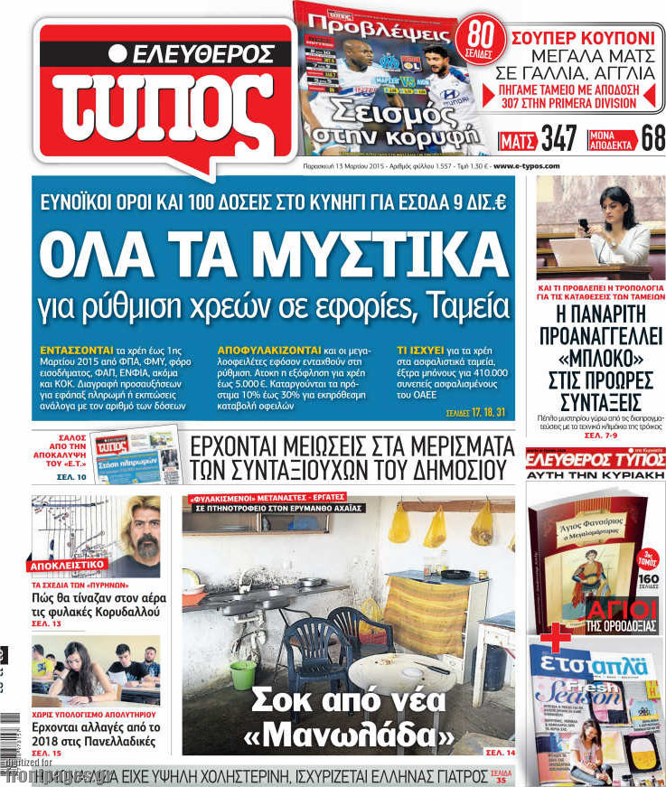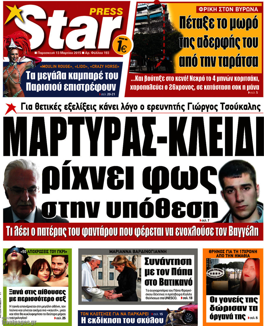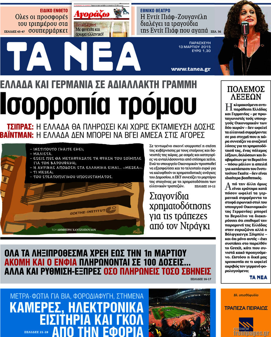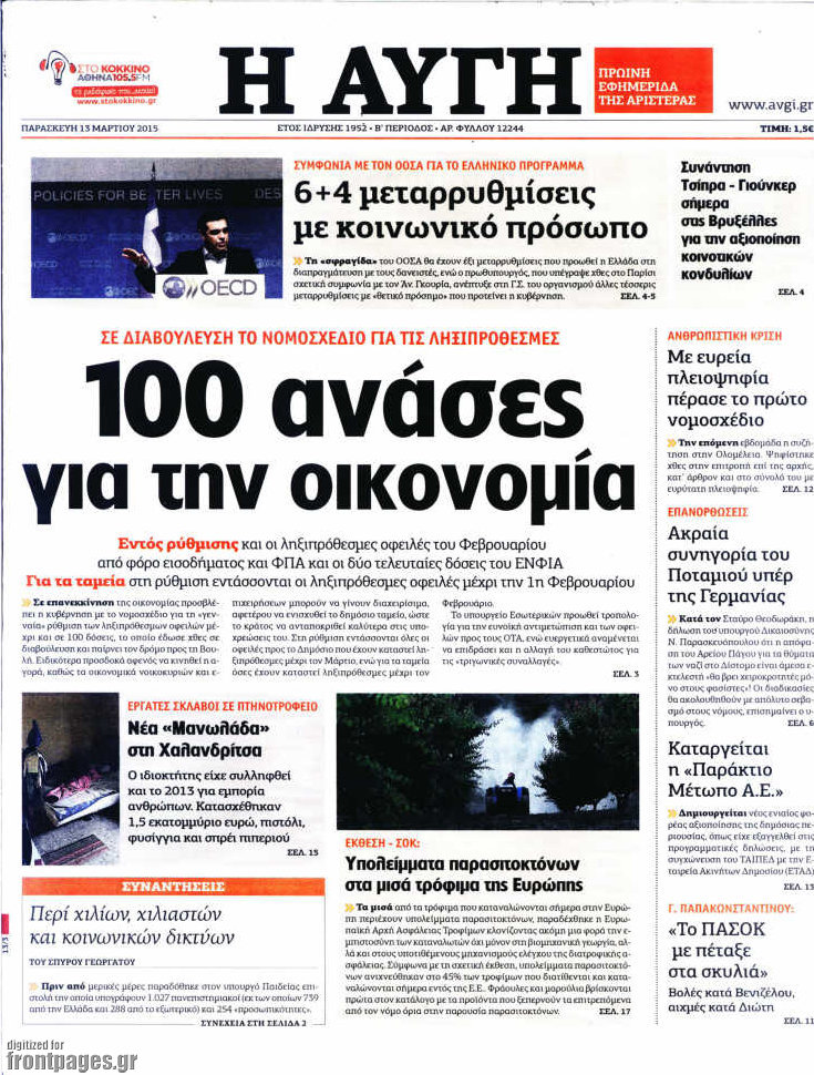 Οι πολιτικές εφημερίδες Enikos Newsroom 08:11, Παρασκευή 13 Μαρτίου 2015 Media Διαβάστε τα σημερινά πρωτοσέλιδα των πολιτικών εφημερίδων: ΠΟΛΙΤΙΚΕΣ ΕΦΗΜΕΡΙΔΕΣ ΠΡΩΤΟΣΕΛΙΔΑ Μοιράσου το: σχολίασε κι εσύ (0 σχόλια) Ακολουθήστε το enikos.gr στο Google News και μάθετε πρώτοι όλες τις ειδήσεις Δείτε όλες τις τελευταίες ειδήσεις από την Ελλάδα και τον Κόσμο στο enikos.gr Ειδήσεις Ροή Ειδήσεων 49 λεπτά πριν Μπλόκα: Οι αγρότες σηκώνουν τις μπάρες σε διόδια για τους εκδρομείς των Χριστουγέννων και μοιράζουν προϊόντα – Βίντεο 1 ώρα πριν Τσιάρας προς αγρότες: Τα μπλόκα και τα πείσματα δεν ωφελούν – Οι λύσεις περνούν μέσα από τον διάλογο 2 ώρες πριν Αρχεία Έπσταϊν: Οι συγκλονιστικές φωτογραφίες – Ο Μάικλ Τζάκσον, ο Μικ Τζάγκερ και ο Κέβιν Σπέισι ανάμεσα στους διάσημους που απεικονίζονται 7 λεπτά πριν Μαθητές διακινούσαν κοκαΐνη και χασίς σε σχολείο της Αττικής – 12 συλλήψεις 3 ώρες πριν Ινδία: Επτά ελέφαντες σκοτώθηκαν κατά τη σύγκρουση επιβατικού τρένου με κοπάδι 4 ώρες πριν Μία νέα «χρυσή» περίοδος αρχίζει για 3 ζώδια από σήμερα – «Μία αναπάντεχη ευκαιρία οδηγεί στην επιτυχία» 6 ώρες πριν Αγχώνεται για το χριστουγεννιάτικο δώρο που πήρε στην πλούσια σύντροφό του – «Φοβάμαι πως θα το βρει φθηνιάρικο, φοράει βραχιόλια Cartier» 3 ώρες πριν Διαιτολόγος αποκαλύπτει 9 πρωινές συνήθειες που «λιώνουν» το κοιλιακό λίπος – «Υποστηρίζουν την υγιεινή απώλεια βάρους» 4 ώρες πριν Οι 7 φράσεις που δεν λένε ποτέ οι συναισθηματικά έξυπνοι άνθρωποι κατά τη διάρκεια ενός καβγά 4 λεπτά πριν Γερμανού για Μαζωνάκη: «Η σχέση μας μετράει 30 χρόνια – Σαφώς και έχω άποψη» 7 λεπτά πριν Μαθητές διακινούσαν κοκαΐνη και χασίς σε σχολείο της Αττικής – 12 συλλήψεις 13 λεπτά πριν Βέλγιο: Άγνωστοι έριξαν κόκκινη μπογιά στο προξενείο της Πολωνίας στις Βρυξέλλες 21 λεπτά πριν Γρηγόρης Δημητριάδης: Χριστουγεννιάτικη συνάντηση με τα παιδιά της ΔΑΠ-ΝΔΦΚ και της ΟΝΝΕΔ 29 λεπτά πριν Στέφανος Παπαδόπουλος: Ξέσπασε σε κλάματα – «Θέλω να έρθει μπροστά μου και να μου πει ότι είμαι ψεύτης» ENIKOS NETWORK Η αποχή από την αναπαραγωγή παρατείνει τη ζωή στα ζώα, σύμφωνα με μελέτη – Τι ισχύει για τους ανθρώπους; Σημαντικές επαφές στις ΗΠΑ είχε ο υπουργός Υγείας Άδωνις Γεωργιάδης Τσιάρας προς αγρότες: Έχει ικανοποιηθεί το 74% των αιτημάτων – Τα μπλόκα και τα πείσματα δεν ωφελούν MyHealth App: Τα στοιχεία για τον Προσωπικό Βοηθό Υγείας Πολίτη – Τι ερωτήματα έγιναν μέσα σε 7 ημέρες Χαρτογραφώντας το «σημείο χωρίς επιστροφή»: Για πρώτη φορά αποκαλύπτεται με λεπτομέρεια το ακανθώδες όριο της ατμόσφαιρας τ... Η Google καταργεί τη λειτουργία «dark web report» – Πώς θα μπορούν οι χρήστες να διαγράφουν τα δεδομένα τους περισσότερα 14:04 , Σάββατο 20 Δεκεμβρίου 2025 Η Realnews αυτής της Κυριακής (21/12/2025) Με τίτλο: «Ασπίδα προστασίας για την Ελλάδα» κυκλοφορεί, αυτήν την Κυριακή, η Realnews. Σημαντ... 12:53 , Σάββατο 20 Δεκεμβρίου 2025 Να μ’ αγαπάς: Το παρελθόν έρχεται στο φως – Καταιγιστικές εξελίξεις στα τελευταία επεισόδια του 2025 Ο Άγγελος αποκαλύπτεται, η Φωτεινή ανησυχεί για τον Λευτέρη και η Ζωή έρχεται αντιμέτωπη με το... 11:41 , Σάββατο 20 Δεκεμβρίου 2025 «Η αγάπη δεν χάνεται ποτέ»: Η μικρού μήκους ταινία κινουμένων σχεδίων που θέτει ερωτήματα για τη ζωή και τον θάνατο Ο θάνατος είναι ένα από τα πιο σκληρά θέματα που καλείται να διαχειριστεί κάποιος στη διάρκεια... 09:30 , Σάββατο 20 Δεκεμβρίου 2025 «Porto Leone: Στη γειτονιά με τα κόκκινα φανάρια» – Ο Χρόνης αποκαλύπτει στην Αλεξάνδρα το μυστικό 