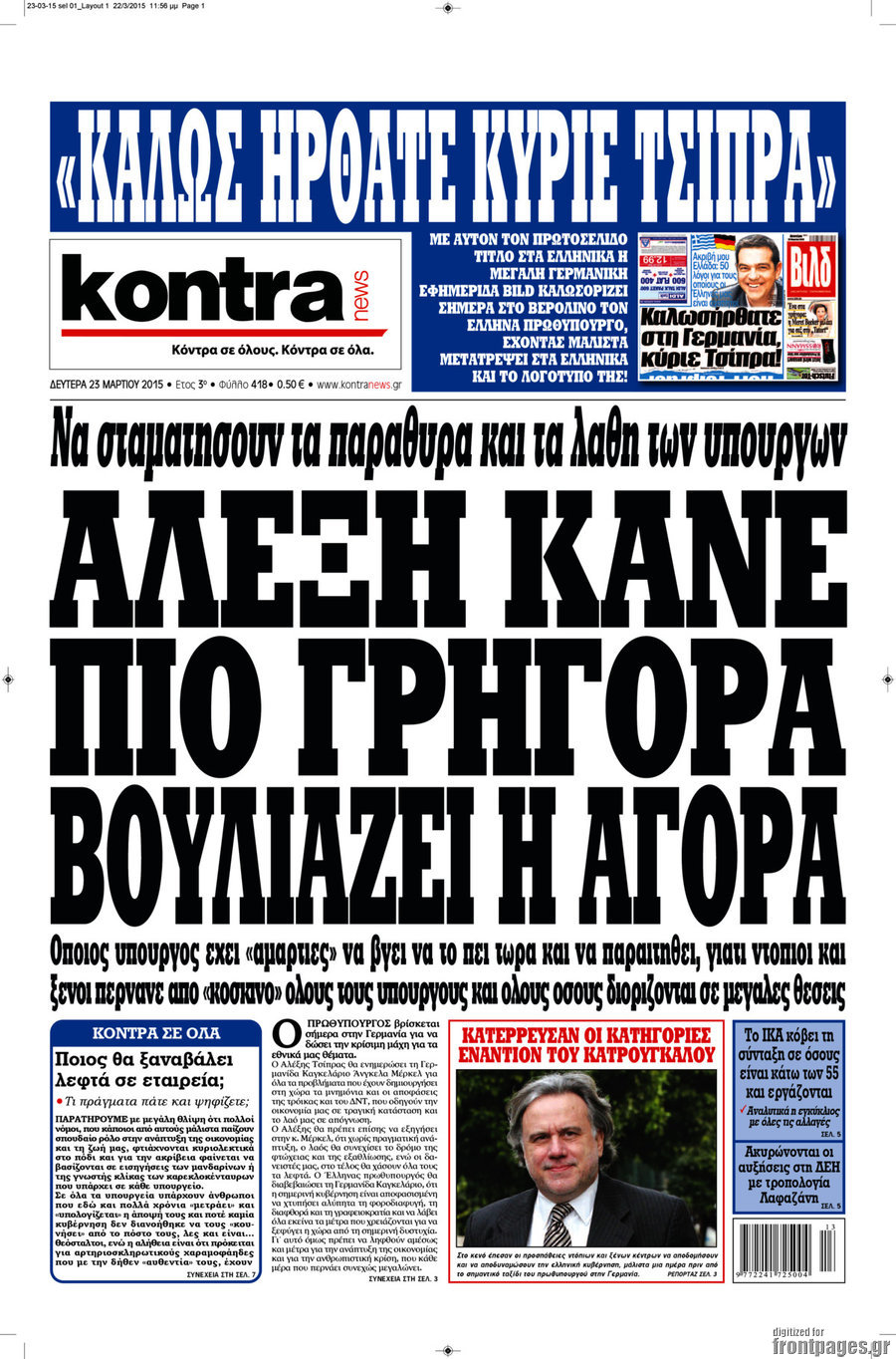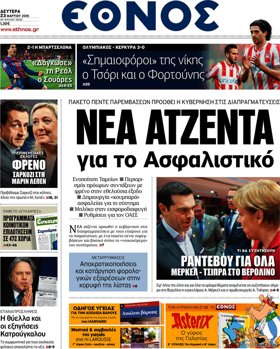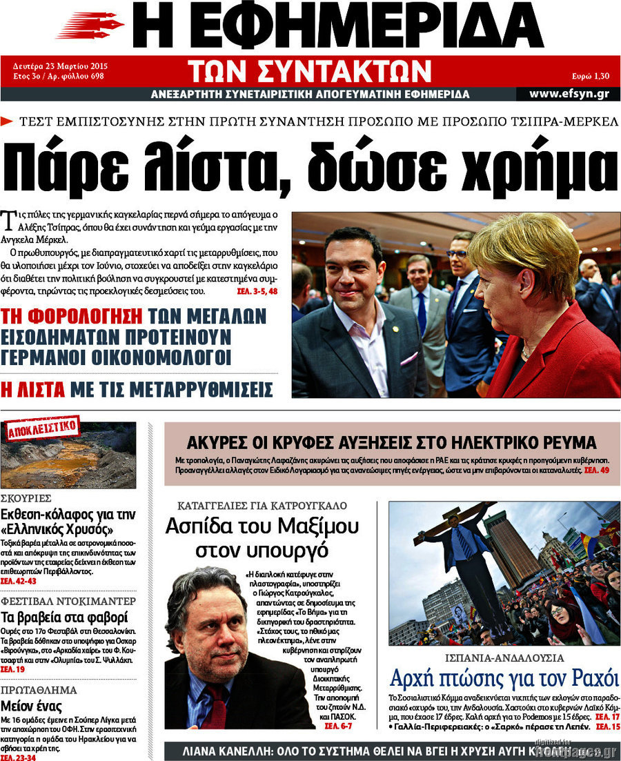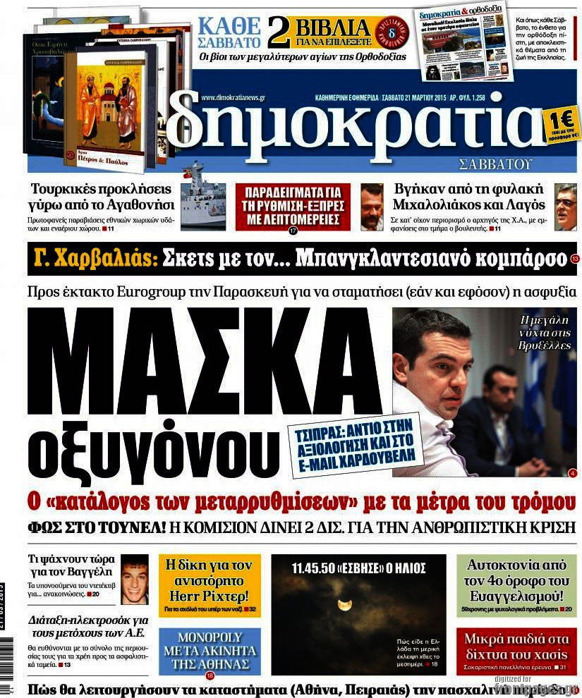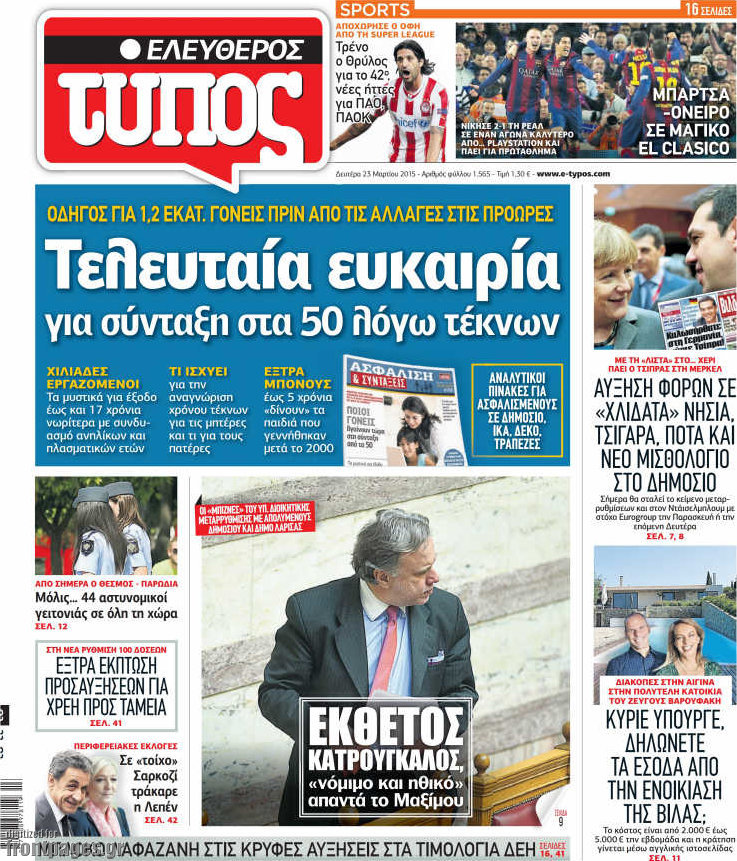 Οι πολιτικές εφημερίδες Enikos Newsroom 08:13, Δευτέρα 23 Μαρτίου 2015 Media Διαβάστε τα σημερινά πρωτοσέλιδα των πολιτικών εφημερίδων: ΠΟΛΙΤΙΚΕΣ ΕΦΗΜΕΡΙΔΕΣ ΠΡΩΤΟΣΕΛΙΔΑ Μοιράσου το: σχολίασε κι εσύ (0 σχόλια) Ακολουθήστε το enikos.gr στο Google News και μάθετε πρώτοι όλες τις ειδήσεις Δείτε όλες τις τελευταίες ειδήσεις από την Ελλάδα και τον Κόσμο στο enikos.gr Ειδήσεις Ροή Ειδήσεων 2 ώρες πριν Υπόθεση Έπσταϊν: Το Υπουργείο Δικαιοσύνης δημοσιοποίησε μια σειρά από εξαιρετικά επεξεργασμένα αρχεία – «Λείπουν τα πιο σημαντικά έγγραφα», λένε οι Δημοκρατικοί 43 λεπτά πριν Ο «χάρτης» με τις αυξήσεις και τις φοροελαφρύνσεις του 2026 – Ποιοι και πόσα κερδίζουν 11 ώρες πριν Χριστούγεννα στα μπλόκα: Επιμένουν στις κινητοποιήσεις τους οι αγρότες – Ανοίγουν τα διόδια το Σαββατοκύριακο 2 ώρες πριν ΟΝΕΧ – MEGATUGS: Ξεκίνησε η ναυπήγηση ρυμουλκών στην Ελλάδα – Προθάλαμος πολεμικών πλοίων – Δείτε φωτογραφίες και βίντεο 2 ώρες πριν Καιρός: Αλλαγή σκηνικού σήμερα με βροχές και πτώση της θερμοκρασίας – Οι προβλέψεις των μετεωρολόγων για τα Χριστούγεννα 3 ώρες πριν Αυγά: Πόσα μπορείτε να τρώτε την ημέρα με ασφάλεια για μέγιστη πρόσληψη πρωτεΐνης 4 ώρες πριν Τα ζώδια σήμερα, Σάββατο 20 Δεκεμβρίου: Παρθένοι, το σύμπαν σας δίνει το κλειδί 3 ώρες πριν Οπτική ψευδαίσθηση: Μόνο αν είσαι ο Σέρλοκ Χολμς θα βρεις τον αριθμό «87» σε 7 δευτερόλεπτα 1 ώρα πριν Αρχαιολόγοι ανακάλυψαν σε χωράφι απεικόνιση 600 ετών ενός Αγίου – Τα στοιχεία που δείχνουν ότι μαρτύρησε 6 λεπτά πριν Ουκρανία: Drones έπληξαν εξέδρα πετρελαίου και πολεμικό πλοίο της Ρωσίας στην Κασπία 15 λεπτά πριν Παιδική υπέρταση: Μια σιωπηλή απειλή που αυξάνεται διεθνώς 15 λεπτά πριν Αγχώνεται για το χριστουγεννιάτικο δώρο που πήρε στην πλούσια σύντροφό του – «Φοβάμαι πως θα το βρει φθηνιάρικο, φοράει βραχιόλια Cartier» 22 λεπτά πριν Enerwave: Το νέο «ρεύμα» στη λιανική ενέργειας που αλλάζει την εμπειρία του καταναλωτή 27 λεπτά πριν Γιώργος Μαζωνάκης: Τη Δευτέρα η μήνυση του τραγουδιστή κατά του 22χρονου ENIKOS NETWORK Πόσα κιλά παίρνουμε πραγματικά τα Χριστούγεννα, σύμφωνα με την επιστήμη – Πώς να το αποτρέψουμε; Το δημοφιλές ρόφημα που αυξάνει την πίεση πιο γρήγορα και από το αλάτι Mega χριστουγεννιάτικη φορολοταρία: «Κλείδωσε» η ημερομηνία για την κλήρωση – Ερωτήσεις και απαντήσεις Αναστολή μέτρων αναγκαστικής εκτέλεσης για κτηνοτρόφους που πλήττονται από την ευλογιά των αιγοπροβάτων Χαρτογραφώντας το «σημείο χωρίς επιστροφή»: Για πρώτη φορά αποκαλύπτεται με λεπτομέρεια το ακανθώδες όριο της ατμόσφαιρας τ... Η Google καταργεί τη λειτουργία «dark web report» – Πώς θα μπορούν οι χρήστες να διαγράφουν τα δεδομένα τους περισσότερα 08:14 , Σάββατο 20 Δεκεμβρίου 2025 Τρομεροί γονείς: Η Μαρία Καβογιάννη εισβάλλει στο σπίτι της οικογένειας Στεφανίδη Όσα θα δούμε στο νέο διπλό επεισόδιο της σειράς «Τρομεροί γονείς», σήμερα Σάββατο 20 Δεκεμβρίο... 05:48 , Σάββατο 20 Δεκεμβρίου 2025 Οι οικονομικές εφημερίδες 20/12/2025 Διαβάστε τα πρωτοσέλιδα από τις οικονομικές εφημερίδες, σήμερα 20/12/2025. 05:43 , Σάββατο 20 Δεκεμβρίου 2025 Οι αθλητικές εφημερίδες 20/12/2025 Διαβάστε τα πρωτοσέλιδα από τις αθλητικές εφημερίδες, σήμερα 20/12/2025. 05:38 , Σάββατο 20 Δεκεμβρίου 2025 Οι πολιτικές εφημερίδες 20/12/2025 Διαβάστε τα πρωτοσέλιδα από τις πολιτικές εφημερίδες, σήμερα 20/12/2025. ΤΕΛΕΥΤΑΙΕΣ ΕΙΔΗΣΕΙΣ 6 λεπτά πριν Ουκρανία: Drones έπληξαν εξέδρα πετρελαίου και πολεμικό... 15 λεπτά πριν Παιδική υπέρταση: Μια σιωπηλή απειλή που αυξάνεται.