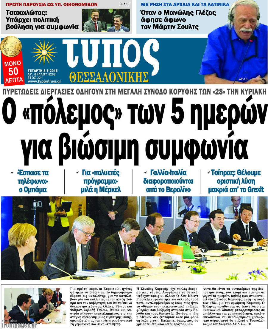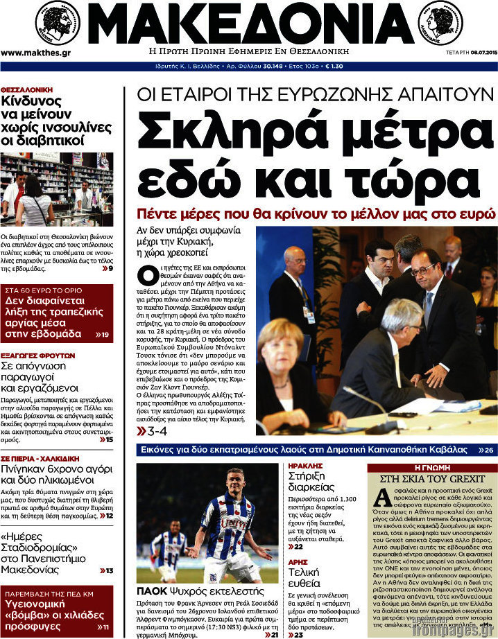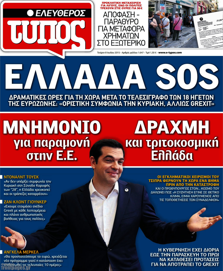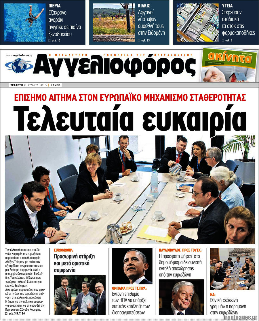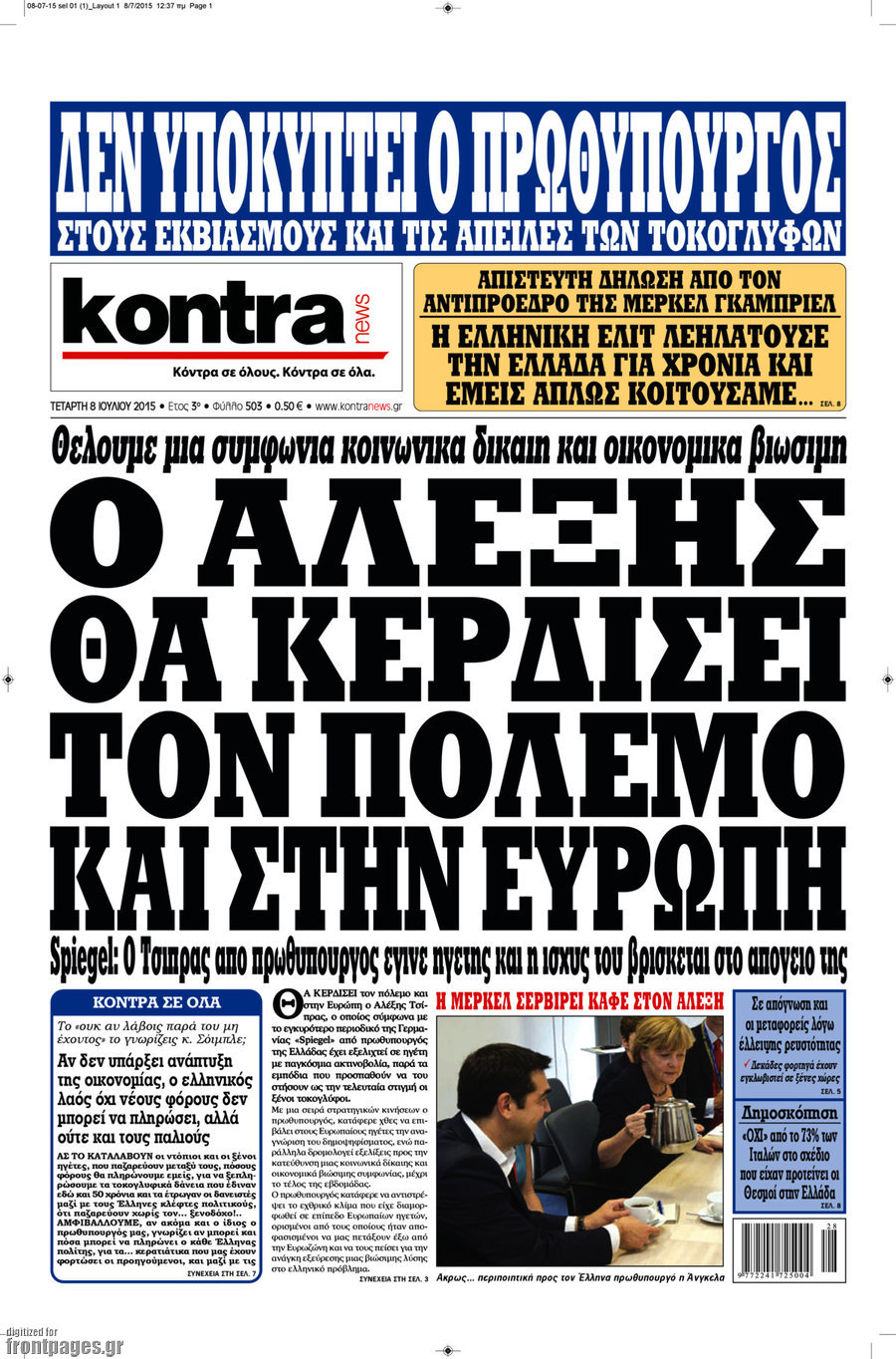 Οι πολιτικές εφημερίδες 8/7/2015 Enikos Newsroom 07:58, Τετάρτη 08 Ιουλίου 2015 Media Διαβάστε τα σημερινά πρωτοσέλιδα των σημερινών πολιτικών εφημερίδων: ΠΟΛΙΤΙΚΕΣ ΕΦΗΜΕΡΙΔΕΣ ΠΡΩΤΟΣΕΛΙΔΑ Μοιράσου το: σχολίασε κι εσύ (0 σχόλια) Ακολουθήστε το enikos.gr στο Google News και μάθετε πρώτοι όλες τις ειδήσεις Δείτε όλες τις τελευταίες ειδήσεις από την Ελλάδα και τον Κόσμο στο enikos.gr Ειδήσεις Ροή Ειδήσεων 4 ώρες πριν Χριστούγεννα στα μπλόκα: Επιμένουν στις κινητοποιήσεις τους οι αγρότες – Ανοίγουν τα διόδια το Σαββατοκύριακο 5 ώρες πριν Ουκρανία: Η άνευ προηγουμένου επίθεση σε ρωσικό τάνκερ στη Μεσόγειο και το μήνυμα προς στον Πούτιν – Το «μακρύ χέρι» του Κιέβου 4 ώρες πριν Πούτιν: Τα μηνύματα σε Ευρώπη και ΝΑΤΟ από το μαραθώνιο «σόου» του – Η απαίτηση για «σεβασμό» και η ειρήνη «με τους όρους» της Μόσχας 5 ώρες πριν Τραμπ: Δεν αποκλείει την πιθανότητα ενός πολέμου στη Βενεζουέλα – «Ο Μαδούρο ξέρει καλύτερα από τον καθένα τι ακριβώς θέλω» 5 ώρες πριν Συνεχίζει να προκαλεί ο Μίτσκοσκι: «Για μένα το όνομα Μακεδονία είναι ιερό» 4 ώρες πριν Ανακαλύφθηκαν αρχαία χρυσά νομίσματα 2.200 ετών που απεικονίζουν τον θεό Απόλλωνα – Η άγνωστη σύνδεση με τον Φίλιππο Β΄ της Μακεδονίας 5 ώρες πριν Ύπνος: Μια κρυφή κατάσταση του εγκεφάλου πριν από τον ύπνο μπορεί να είναι το “κλειδί” για υψηλή ευφυΐα και δημιουργικότητα 6 ώρες πριν Αριθμολογία: Οι άνθρωποι που έχουν γεννηθεί αυτές τις 4 ημερομηνίες, συχνά παρεξηγούνται – «Η καλοσύνη τους κρύβει τεράστια δύναμη» 7 ώρες πριν Ξεχάστε το καθάρισμα το Σαββατοκύριακο: Ο «κανόνας των 20 λεπτών» που θα σας λύσει τα χέρια 21 λεπτά πριν Θεσσαλονίκη: Εξαφανίστηκε 13χρονος από χώρο φιλοξενίας ασυνόδευτων ανηλίκων στο Ωραιόκαστρο 32 λεπτά πριν Ντόναλντ Τραμπ: «Πολύ βαριά αντίποινα» στη Συρία – «Πλήττουμε πολύ δυνατά οχυρά του Ισλαμικού Κράτους» 46 λεπτά πριν Εξάρχεια: Ένταση με μολότοφ, χημικά και κρότου λάμψης 1 ώρα πριν ΗΠΑ: Τραγωδία στην Αλαμπάμα – Σκότωσε την δημοσιογράφο σύζυγό του και αυτοκτόνησε μπροστά στον 3χρονο γιο τους 1 ώρα πριν Πρόταση γάμου στο ΣΕΦ κατά την διάρκεια του αγώνα Ολυμπιακός-Βιλερμπάν – Δείτε βίντεο ENIKOS NETWORK Το ΕΚΑΒ τιμήθηκε από την Ακαδημία Αθηνών για τα 40 χρόνια προσφοράς του Έχετε πραγματικά μεγάλη καρδιά; 10 χαρακτηριστικά όσων έχουν καλοσύνη Αναστολή μέτρων αναγκαστικής εκτέλεσης για κτηνοτρόφους που πλήττονται από την ευλογιά των αιγοπροβάτων Πλήρης επάρκεια προϊόντων στις λαϊκές της Αττικής, παρά τις αγροτικές κινητοποιήσεις – Τι απαντούν οι πωλητές Χαρτογραφώντας το «σημείο χωρίς επιστροφή»: Για πρώτη φορά αποκαλύπτεται με λεπτομέρεια το ακανθώδες όριο της ατμόσφαιρας τ... Η Google καταργεί τη λειτουργία «dark web report» – Πώς θα μπορούν οι χρήστες να διαγράφουν τα δεδομένα τους περισσότερα 22:42 , Παρασκευή 19 Δεκεμβρίου 2025 Γιώργος Γιαννόπουλος για “Το σόι σου”: “Είναι ευτυχία και ευλογία αυτή η σειρά” «Είναι ευτυχία και ευλογία η συγκυρία αυτής της σειράς», θα πει ο Γιώργος Γιαννόπουλος -ο αγαπ... 20:37 , Παρασκευή 19 Δεκεμβρίου 2025 Don’t Forget The Lyrics: Η Έλλη Κοκκίνου υποδέχεται 4 παίκτες που θα κάνουν τα πάντα για να μη χάσουν ούτε… μισή λέξη από τους στίχους Το «Don’t Forget The Lyrics» επιστρέφει απόψε, Παρασκευή 19 Δεκεμβρίου, στις 21:00 με νέο επει... 19:31 , Παρασκευή 19 Δεκεμβρίου 2025 GNTM: Απόψε ο μεγάλος τελικός για τους 4 φιναλίστ Έπειτα από μήνες γεμάτους μόδα, δημιουργία και έντονες αναμετρήσεις, το GNTM 2025 κορυφώνεται,... 18:11 , Παρασκευή 19 Δεκεμβρίο