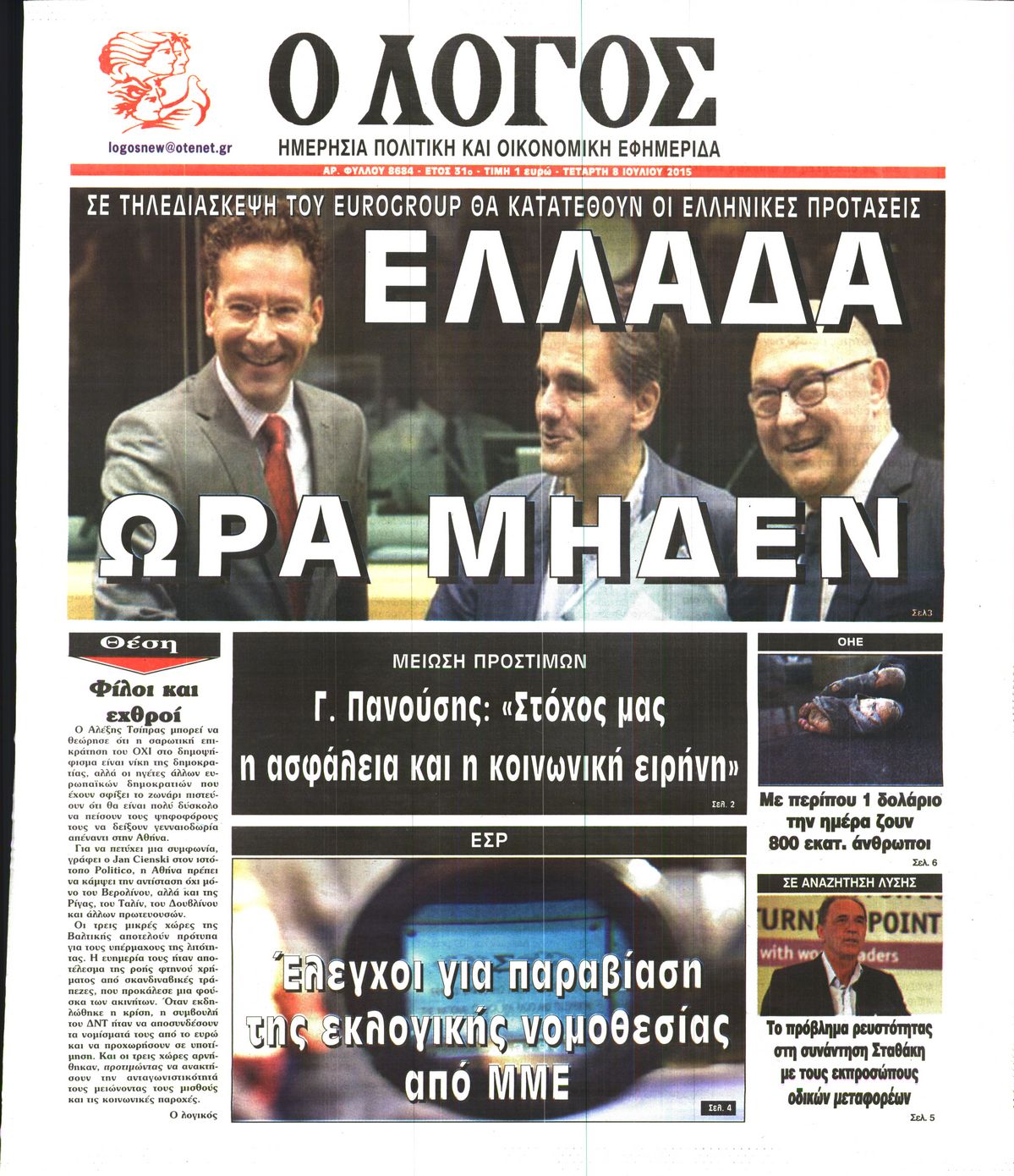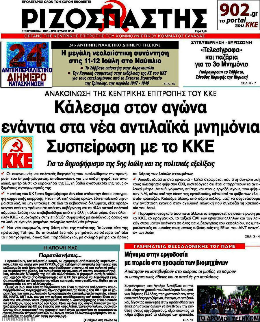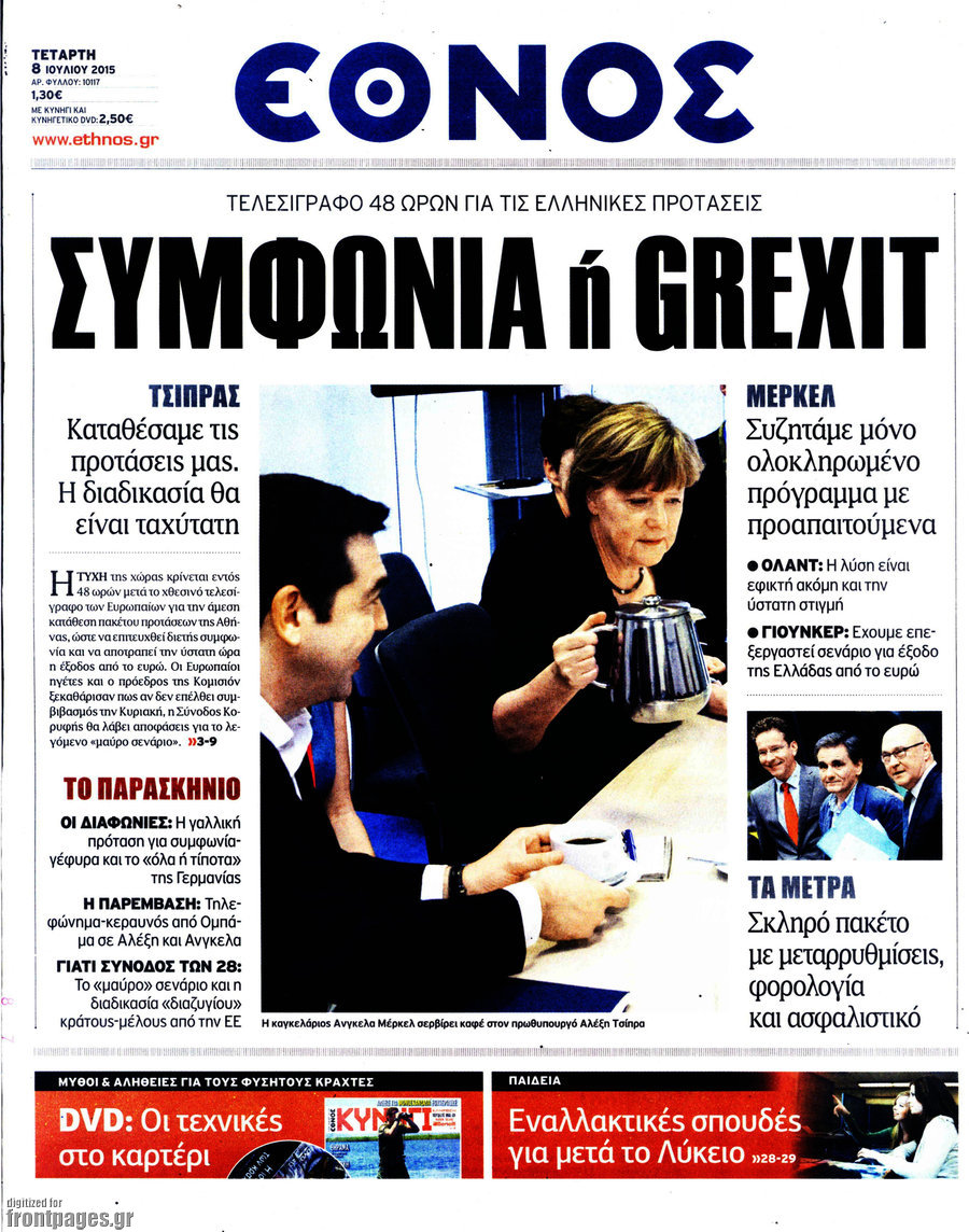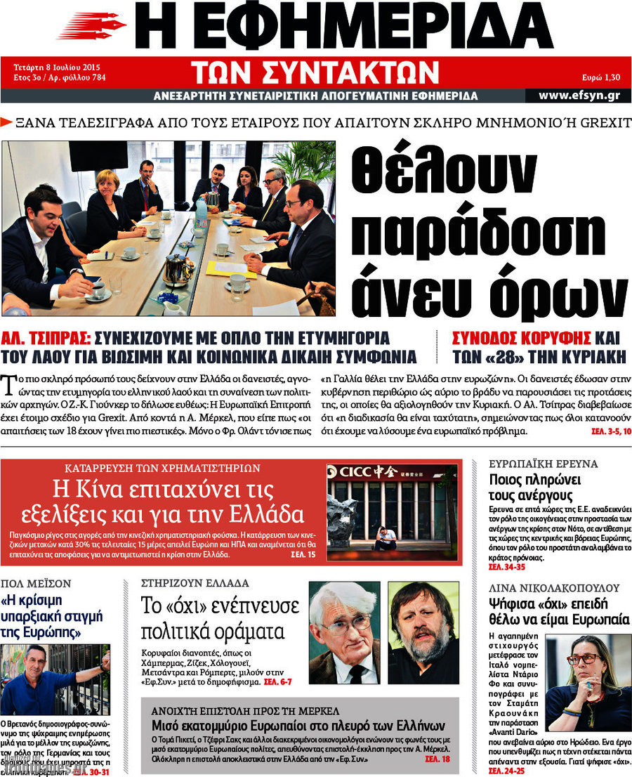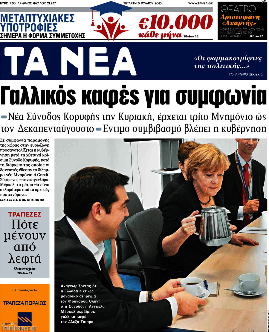 Οι πολιτικές εφημερίδες 8/7/2015 Enikos Newsroom 07:58, Τετάρτη 08 Ιουλίου 2015 Media Διαβάστε τα σημερινά πρωτοσέλιδα των σημερινών πολιτικών εφημερίδων: ΠΟΛΙΤΙΚΕΣ ΕΦΗΜΕΡΙΔΕΣ ΠΡΩΤΟΣΕΛΙΔΑ Μοιράσου το: σχολίασε κι εσύ (0 σχόλια) Ακολουθήστε το enikos.gr στο Google News και μάθετε πρώτοι όλες τις ειδήσεις Δείτε όλες τις τελευταίες ειδήσεις από την Ελλάδα και τον Κόσμο στο enikos.gr Ειδήσεις Ροή Ειδήσεων 4 ώρες πριν Χριστούγεννα στα μπλόκα: Επιμένουν στις κινητοποιήσεις τους οι αγρότες – Ανοίγουν τα διόδια το Σαββατοκύριακο 5 ώρες πριν Ουκρανία: Η άνευ προηγουμένου επίθεση σε ρωσικό τάνκερ στη Μεσόγειο και το μήνυμα προς στον Πούτιν – Το «μακρύ χέρι» του Κιέβου 4 ώρες πριν Πούτιν: Τα μηνύματα σε Ευρώπη και ΝΑΤΟ από το μαραθώνιο «σόου» του – Η απαίτηση για «σεβασμό» και η ειρήνη «με τους όρους» της Μόσχας 5 ώρες πριν Τραμπ: Δεν αποκλείει την πιθανότητα ενός πολέμου στη Βενεζουέλα – «Ο Μαδούρο ξέρει καλύτερα από τον καθένα τι ακριβώς θέλω» 5 ώρες πριν Συνεχίζει να προκαλεί ο Μίτσκοσκι: «Για μένα το όνομα Μακεδονία είναι ιερό» 4 ώρες πριν Ανακαλύφθηκαν αρχαία χρυσά νομίσματα 2.200 ετών που απεικονίζουν τον θεό Απόλλωνα – Η άγνωστη σύνδεση με τον Φίλιππο Β΄ της Μακεδονίας 5 ώρες πριν Ύπνος: Μια κρυφή κατάσταση του εγκεφάλου πριν από τον ύπνο μπορεί να είναι το “κλειδί” για υψηλή ευφυΐα και δημιουργικότητα 6 ώρες πριν Αριθμολογία: Οι άνθρωποι που έχουν γεννηθεί αυτές τις 4 ημερομηνίες, συχνά παρεξηγούνται – «Η καλοσύνη τους κρύβει τεράστια δύναμη» 7 ώρες πριν Ξεχάστε το καθάρισμα το Σαββατοκύριακο: Ο «κανόνας των 20 λεπτών» που θα σας λύσει τα χέρια 21 λεπτά πριν Θεσσαλονίκη: Εξαφανίστηκε 13χρονος από χώρο φιλοξενίας ασυνόδευτων ανηλίκων στο Ωραιόκαστρο 32 λεπτά πριν Ντόναλντ Τραμπ: «Πολύ βαριά αντίποινα» στη Συρία – «Πλήττουμε πολύ δυνατά οχυρά του Ισλαμικού Κράτους» 46 λεπτά πριν Εξάρχεια: Ένταση με μολότοφ, χημικά και κρότου λάμψης 1 ώρα πριν ΗΠΑ: Τραγωδία στην Αλαμπάμα – Σκότωσε την δημοσιογράφο σύζυγό του και αυτοκτόνησε μπροστά στον 3χρονο γιο τους 1 ώρα πριν Πρόταση γάμου στο ΣΕΦ κατά την διάρκεια του αγώνα Ολυμπιακός-Βιλερμπάν – Δείτε βίντεο ENIKOS NETWORK Το ΕΚΑΒ τιμήθηκε από την Ακαδημία Αθηνών για τα 40 χρόνια προσφοράς του Έχετε πραγματικά μεγάλη καρδιά; 10 χαρακτηριστικά όσων έχουν καλοσύνη Αναστολή μέτρων αναγκαστικής εκτέλεσης για κτηνοτρόφους που πλήττονται από την ευλογιά των αιγοπροβάτων Πλήρης επάρκεια προϊόντων στις λαϊκές της Αττικής, παρά τις αγροτικές κινητοποιήσεις – Τι απαντούν οι πωλητές Χαρτογραφώντας το «σημείο χωρίς επιστροφή»: Για πρώτη φορά αποκαλύπτεται με λεπτομέρεια το ακανθώδες όριο της ατμόσφαιρας τ... Η Google καταργεί τη λειτουργία «dark web report» – Πώς θα μπορούν οι χρήστες να διαγράφουν τα δεδομένα τους περισσότερα 22:42 , Παρασκευή 19 Δεκεμβρίου 2025 Γιώργος Γιαννόπουλος για “Το σόι σου”: “Είναι ευτυχία και ευλογία αυτή η σειρά” «Είναι ευτυχία και ευλογία η συγκυρία αυτής της σειράς», θα πει ο Γιώργος Γιαννόπουλος -ο αγαπ... 20:37 , Παρασκευή 19 Δεκεμβρίου 2025 Don’t Forget The Lyrics: Η Έλλη Κοκκίνου υποδέχεται 4 παίκτες που θα κάνουν τα πάντα για να μη χάσουν ούτε… μισή λέξη από τους στίχους Το «Don’t Forget The Lyrics» επιστρέφει απόψε, Παρασκευή 19 Δεκεμβρίου, στις 21:00 με νέο επει... 19:31 , Παρασκευή 19 Δεκεμβρίου 2025 GNTM: Απόψε ο μεγάλος τελικός για τους 4 φιναλίστ Έπειτα από μήνες γεμάτους μόδα, δημιουργία και έντονες αναμετρήσεις, το GNTM 2025 κορυφώνεται,... 18:11 , Παρασκευή 19 Δεκεμβρίο