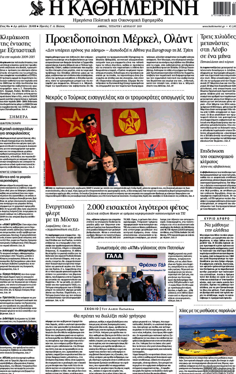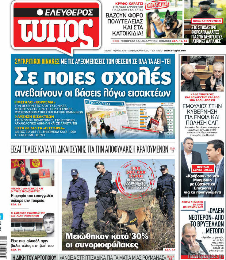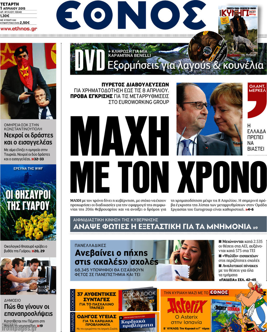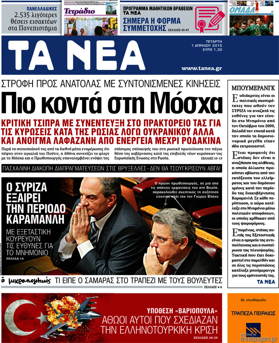 Οι πολιτικές εφημερίδες Enikos Newsroom 08:12, Τετάρτη 01 Απριλίου 2015 Media Διαβάστε τα σημερινά πρωτοσέλιδα των πολιτικών εφημερίδων: ΠΟΛΙΤΙΚΕΣ ΕΦΗΜΕΡΙΔΕΣ Μοιράσου το: σχολίασε κι εσύ (0 σχόλια) Ακολουθήστε το enikos.gr στο Google News και μάθετε πρώτοι όλες τις ειδήσεις Δείτε όλες τις τελευταίες ειδήσεις από την Ελλάδα και τον Κόσμο στο enikos.gr Ειδήσεις Ροή Ειδήσεων 3 ώρες πριν Διάλογοι-σοκ από το κύκλωμα που διακινούσε ναρκωτικά σε σχολεία – «Αν δεν είσαι εκεί σε 5 λεπτά, θα φας πολύ ξύλο μπρο» 4 ώρες πριν Αγρότες από το μπλόκο Νίκαιας κλείνουν τη Δευτέρα τις σήραγγες των Τεμπών για τα φορτηγά – Τι αποφάσισαν 2 ώρες πριν «Πλημμύρισε» με κόσμο η Ερμού ενόψει των Χριστουγέννων – Ουρές στα καταστήματα – ΦΩΤΟ και ΒΙΝΤΕΟ 4 ώρες πριν Ζελένσκι: Τάχθηκε σήμερα υπέρ της διεξαγωγής ευρύτερων διαβουλεύσεων με Ευρωπαίους εταίρους 2 ώρες πριν Super League 2: Ο Σεμπά πέτυχε το γκολ της χρονιάς με ανάποδο ψαλίδι – ΒΙΝΤΕΟ 2 ώρες πριν Αν ανήκετε σε ένα από αυτά τα 3 ζώδια, το 2026 θα είναι η χρονιά σας – «Η ζωή σας βελτιώνεται σε όλους τους τομείς» 6 ώρες πριν Οι άνθρωποι που στρώνουν το κρεβάτι τους κάθε πρωί, διαθέτουν αυτές τις 8 κρυφές δυνάμεις 3 ώρες πριν Ένα πλάσμα στα βάθη της θάλασσας απορροφά άνθρακα από την ατμόσφαιρα – «Δεν είχαμε ιδέα για την ύπαρξή του» 1 ημέρα πριν Enerwave: Το νέο «ρεύμα» στη λιανική ενέργειας που αλλάζει την εμπειρία του καταναλωτή 6 λεπτά πριν Θεσσαλονίκη: Συνελήφθη 27χρονος που έκανε επικίνδυνο ελιγμό για να αποφύγει έλεγχο και παραλίγο να τραυματίσει αστυνομικό 17 λεπτά πριν Εγκαινιάστηκε ο αρχαιολογικός χώρος του Ανακτόρου της Πέλλας – Παρουσιάστηκαν για πρώτη φορά δύο ελληνιστικά αγάλματα 31 λεπτά πριν Βλαδίμηρος Κυριακίδης για Έφη Μουρίκη: «Δεν υπάρχει ανταγωνισμός στη σχέση μας, αλλά συναγωνισμός» 43 λεπτά πριν Δήμος Αθηναίων: Ξεκινά τη Δευτέρα η επιστροφή πινακίδων οχημάτων από τη Δημοτική Αστυνομία 55 λεπτά πριν Μαρία Καρυστιανού: «Δόλιο χτύπημα της κυβέρνησης – Έφοδος της ΑΑΔΕ στα γραφεία του Συλλόγου Θυμάτων Τεμπών» ENIKOS NETWORK «Όσοι απατούν τους συντρόφους τους έχουν ένα κοινό χαρακτηριστικό» αποκαλύπτει ειδικός στις σχέσεις Ο εγκέφαλός μας ξεπερνά ακόμα σε εξυπνάδα το ΑΙ – Ποιο είναι αυτό στο οποίο είμαστε καλύτεροι Λειψυδρία: Πού βρισκόμαστε σήμερα και πώς προετοιμάζεται η ΕΥΔΑΠ για το επόμενο κρίσιμο διάστημα Έρχεται ο Μοναδικός Αριθμός Ταυτότητας για τα ακίνητα: Τι είναι και από πού θα αντλούνται πληροφορίες – Πώς θα αλλάξει τις ... Χαρτογραφώντας το «σημείο χωρίς επιστροφή»: Για πρώτη φορά αποκαλύπτεται με λεπτομέρεια το ακανθώδες όριο της ατμόσφαιρας τ... Η Google καταργεί τη λειτουργία «dark web report» – Πώς θα μπορούν οι χρήστες να διαγράφουν τα δεδομένα τους περισσότερα 17:18 , Κυριακή 21 Δεκεμβρίου 2025 «Η Μεγάλη Χίμαιρα»: Μάγεψε το κοινό κατά την avant-première της προβολής της Την Πρωτοχρονιά (Πέμπτη 1η Ιανουαρίου 2026) στο ERTFLIX θα γίνει η πρεμιέρα της πολυαναμενόμεν... 15:08 , Κυριακή 21 Δεκεμβρίου 2025 Μια νύχτα μόνο: Η Αρετή και ο Οδυσσέας έρχονται και πάλι κοντά Το νέο επεισόδιο της δραματικής σειράς του MEGA «Μια νύχτα μόνο», θα προβληθεί απόψε Κυριακή 2... 14:24 , Κυριακή 21 Δεκεμβρίου 2025 IQ 160: Ο φάκελος με το τεστ πατρότητας ανοίγει, απόψε στις 21:00 στο Star Ανατρεπτικό το νέο διπλό επεισόδιο της σειράς “IQ 160” στις 21:00 στο Star. Ο Τηλέ... 09:43 , Κυριακή 21 Δεκεμβρίου 2025 Το λάθος στην ταινία Die Hard που άφησε άναυδους τους θαυμαστές του Μπρους Γουίλις Ένας φανατικός των ταινιών άφησε 