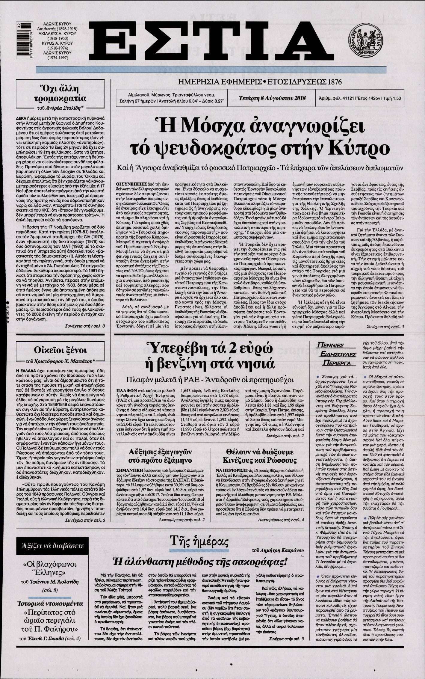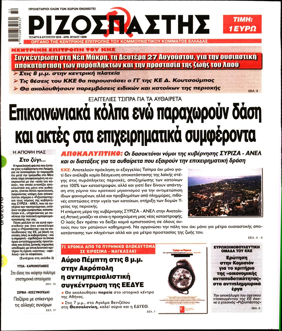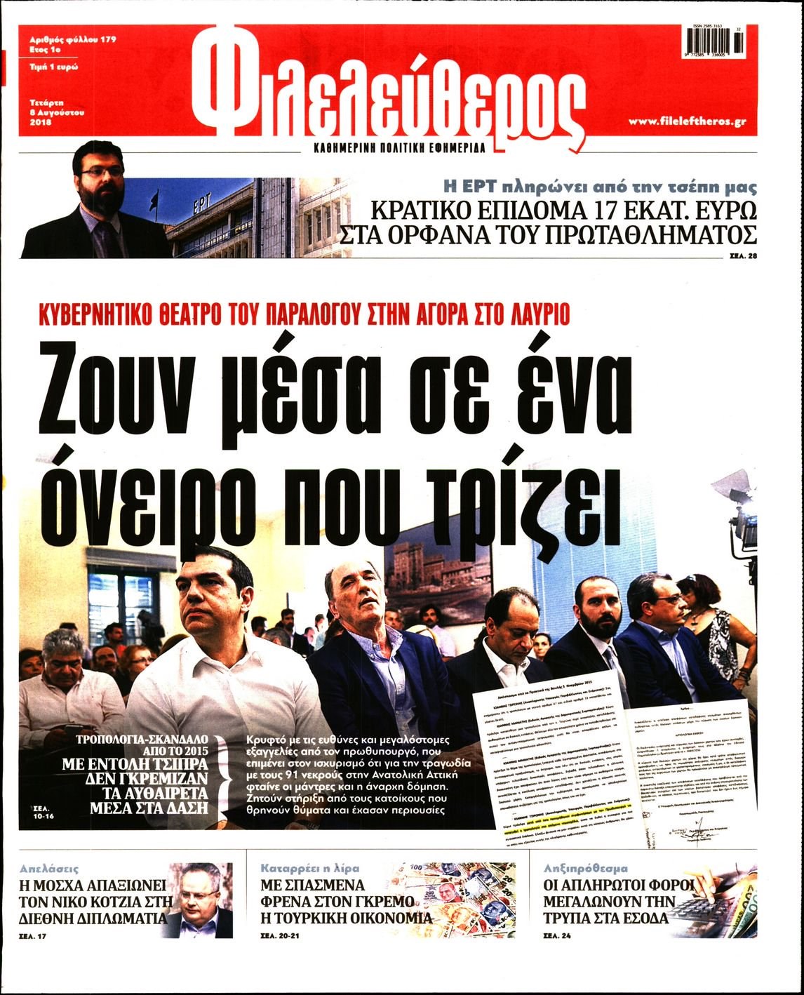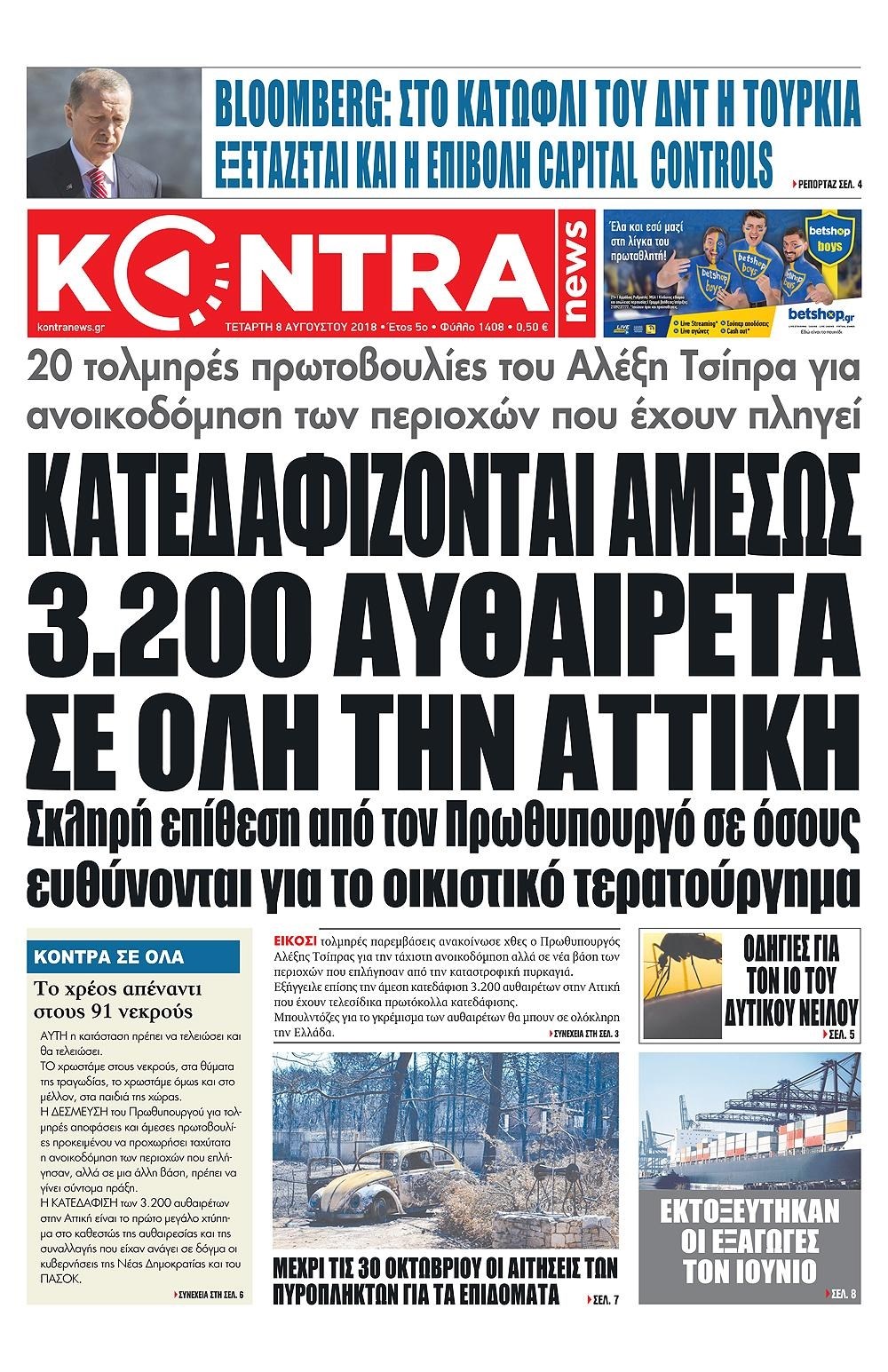 Οι πολιτικές εφημερίδες 8/8/2018 Enikos Newsroom 06:52, Τετάρτη 08 Αυγούστου 2018 Media Διαβάστε τα πρωτοσέλιδα. ΠΟΛΙΤΙΚΕΣ ΕΦΗΜΕΡΙΔΕΣ ΠΡΩΤΟΣΕΛΙΔΑ Μοιράσου το: σχολίασε κι εσύ (0 σχόλια) Ακολουθήστε το enikos.gr στο Google News και μάθετε πρώτοι όλες τις ειδήσεις Δείτε όλες τις τελευταίες ειδήσεις από την Ελλάδα και τον Κόσμο στο enikos.gr Ειδήσεις Ροή Ειδήσεων 5 ώρες πριν Συνεχίζουν τις κινητοποιήσεις οι αγρότες: Κλείνουν τις σήραγγες των Τεμπών για τα φορτηγά – Τι θα γίνει τα Χριστούγεννα 40 λεπτά πριν Από τα μέσα Ιανουαρίου τα πρώτα «ραβασάκια» στους οδηγούς από τις έξυπνες κάμερες – Τι δήλωσε ο Παπαστεργίου 1 ώρα πριν Μόσχα: Πιθανή εμπλοκή της Ουκρανίας στην έκρηξη βόμβας που σκότωσε Ρώσο στρατηγό 3 ώρες πριν Θεσσαλονίκη: Γρονθοκόπησαν 13χρονο σε αγώνα βόλεϊ γιατί τους… ενοχλούσε το τύμπανο 2 ώρες πριν Τουρκία: Χαοτικές σκηνές στη Βουλή με ξύλο μεταξύ βουλευτών στη συζήτηση για τον προϋπολογισμό – Βίντεο 3 ώρες πριν Τα 4 ζώδια που παίρνουν επιτέλους την αναγνώριση που τους αξίζει – «Απρόσμενες ευκαιρίες, που μοιάζουν με δώρα από το σύμπαν» 1 ώρα πριν Γυναίκα που έχασε 18 κιλά αποκαλύπτει τα μυστικά της επιτυχίας της: «Σταματήστε να γυμνάζεστε απλώς για να ολοκληρώσετε την προπόνηση» 2 ώρες πριν Έχετε κρατήσει αυτά 8 αντικείμενα από την παιδική ηλικία σας; Δείτε τι αποκαλύπτει για τον χαρακτήρα σας 2 ημέρες πριν Enerwave: Το νέο «ρεύμα» στη λιανική ενέργειας που αλλάζει την εμπειρία του καταναλωτή 3 λεπτά πριν Αγρότες: Έκλεισαν την σήραγγα των Τεμπών για τα φορτηγά – ΒΙΝΤΕΟ 9 λεπτά πριν Τουρκία: Επίσκεψη Φιντάν και Γκιουλέρ στη Δαμασκό – Στρατηγικές συνομιλίες για τις SDF και την ασφάλεια στη Συρία 14 λεπτά πριν Πηγές ΕΛ.ΑΣ. για μπλόκα: Δεν κλείνει κανένας δρόμος χωρίς λόγο 20 λεπτά πριν Κρήτη: Στη φυλακή ο 28χρονος για παιδική πορνογραφία – Η γνωριμία με 15χρονη μέσω social media, οι φωτογραφίες και η καταγγελία 27 λεπτά πριν Σαρκοζί: Από την «κόλαση» της φυλακής στον «παράδεισο» της Γουαδελούπης – Σε διακοπές με την Κάρλα Μπρούνι και την κόρη τους ENIKOS NETWORK Η χειμερινή δραστηριότητα που μπορεί να αυξήσει τον κίνδυνο καρδιακής προσβολής Χοληστερίνη: Το σημάδι στο δέρμα που μπορεί να δείχνει ότι είναι υπερβολικά υψηλή Χρυσός: Νέο ιστορικό υψηλό για την τιμή του – Τι λένε οι αναλυτές Επίδομα θέρμανσης: Ποιοι λαμβάνουν έως αύριο την προκαταβολή – Πότε ακολουθούν οι επόμενες πληρωμές Χαρτογραφώντας το «σημείο χωρίς επιστροφή»: Για πρώτη φορά αποκαλύπτεται με λεπτομέρεια το ακανθώδες όριο της ατμόσφαιρας τ... Η Google καταργεί τη λειτουργία «dark web report» – Πώς θα μπορούν οι χρήστες να διαγράφουν τα δεδομένα τους περισσότερα 12:25 , Δευτέρα 22 Δεκεμβρίου 2025 Χαμός on air ανάμεσα στις πρωινές εκπομπές του Open και του Mega – «Έχω να δω κάτι τέτοιο από τη δεκαετία του 90’» – «Κάποιοι να κοιτάνε και λίγο στον καθρέφτη» Κόντρα στον… αέρα είχαν οι ενημερωτικές εκπομπές της πρωινής ζώνης στο Open και το Mega,... 10:15 , Δευτέρα 22 Δεκεμβρίου 2025 Πρωτοχρονιάτικο δώρο της ΕΡΤ η «Μεγάλη χίμαιρα» – Διπλή πρεμιέρα για την ακριβότερη ελληνική σειρά Με πρωτότυπο τρόπο και σπαστή πρεμιέρα σε ΕΡΤflix και ΕΡΤ1 θα κάνει η δημόσια τηλεόραση το λαν... 09:45 , Δευτέρα 22 Δεκεμβρίου 2025 Ο χριστουγεννιάτικος τηλεμαραθώνιος αλληλεγγύης του ANT1 για τα παιδιά Ο ANT1 διοργανώνει Χριστουγεννιάτικο Τηλεμαραθώνιο για τα Παιδιά την 22η Δεκεμβρίου 2025, με σ... 09:30 , Δευτέρα 22 Δεκεμβρίου 2025 Eurovision 2026: Φαβορί η Μπέττυ Μαγγίρα Στην τελική ευθεία μπαίνει ο σχεδια