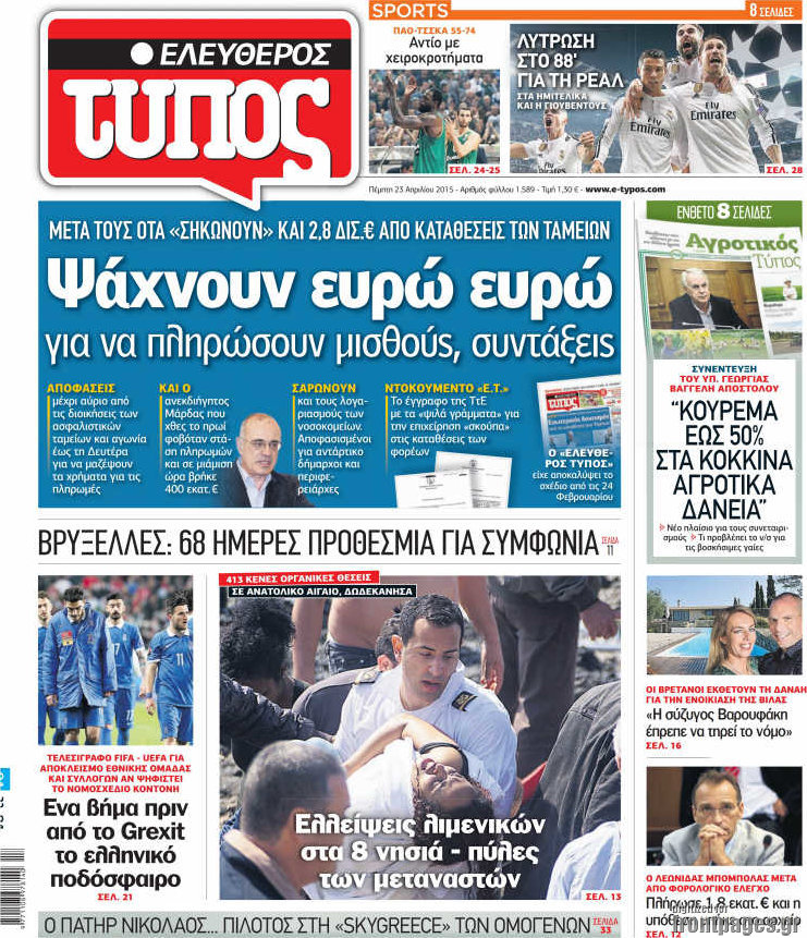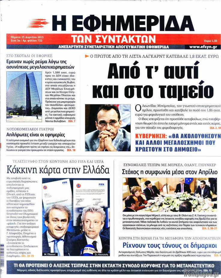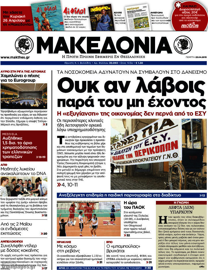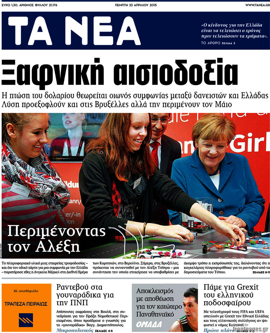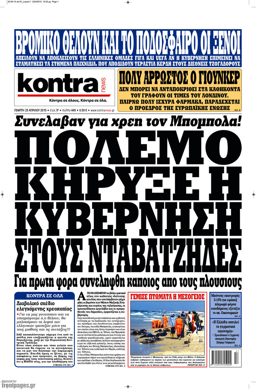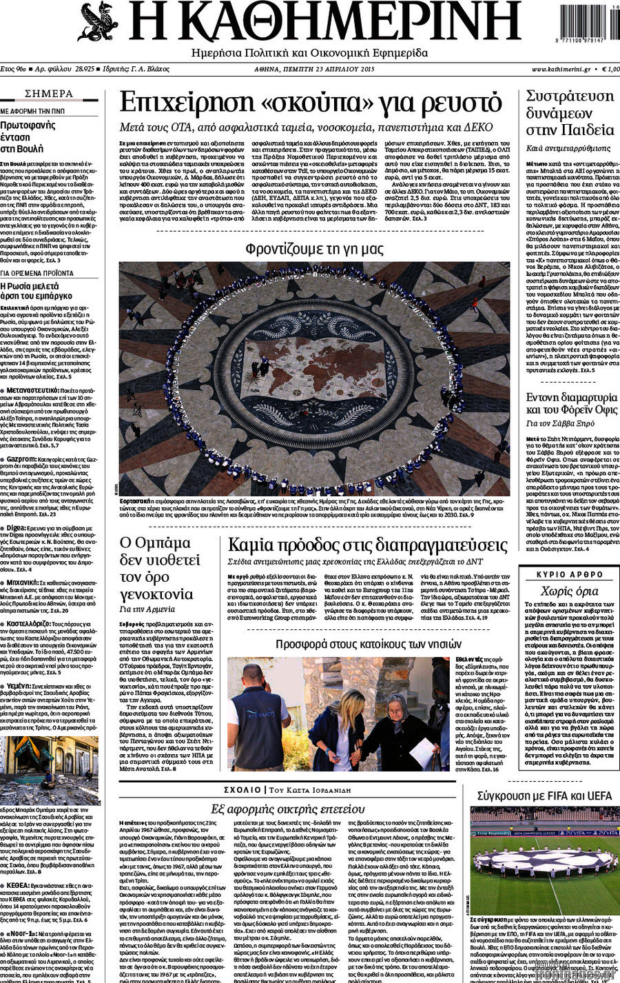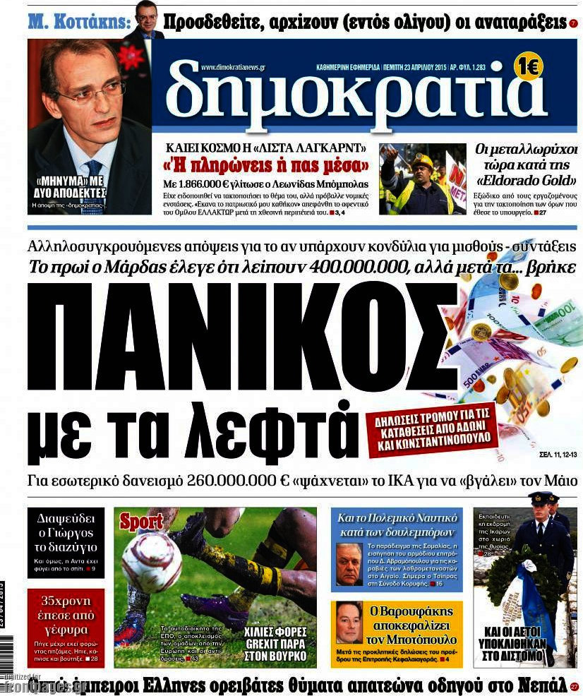 Οι πολιτικές εφημερίδες Enikos Newsroom 07:33, Πέμπτη 23 Απριλίου 2015 Media Διαβάστε τα σημερινά πρωτοσέλιδα των πολιτικών εφημερίδων: ΕΦΗΜΕΡΙΔΕΣ ΠΟΛΙΤΙΚΕΣ ΕΦΗΜΕΡΙΔΕΣ ΠΡΩΤΟΣΕΛΙΔΑ Μοιράσου το: σχολίασε κι εσύ (0 σχόλια) Ακολουθήστε το enikos.gr στο Google News και μάθετε πρώτοι όλες τις ειδήσεις Δείτε όλες τις τελευταίες ειδήσεις από την Ελλάδα και τον Κόσμο στο enikos.gr Ειδήσεις Ροή Ειδήσεων 2 ώρες πριν Μπλόκα: Οι αγρότες σηκώνουν τις μπάρες σε διόδια για τους εκδρομείς των Χριστουγέννων και μοιράζουν προϊόντα – Βίντεο 2 ώρες πριν Τσιάρας προς αγρότες: Τα μπλόκα και τα πείσματα δεν ωφελούν – Οι λύσεις περνούν μέσα από τον διάλογο 3 ώρες πριν Αρχεία Έπσταϊν: Οι συγκλονιστικές φωτογραφίες – Ο Μάικλ Τζάκσον, ο Μικ Τζάγκερ και ο Κέβιν Σπέισι ανάμεσα στους διάσημους που απεικονίζονται 59 λεπτά πριν Μαθητές διακινούσαν κοκαΐνη και χασίς σε σχολείο της Αττικής – 12 συλλήψεις 1 ώρα πριν Βέλγιο: Άγνωστοι έριξαν κόκκινη μπογιά στο προξενείο της Πολωνίας στις Βρυξέλλες 5 ώρες πριν Μία νέα «χρυσή» περίοδος αρχίζει για 3 ζώδια από σήμερα – «Μία αναπάντεχη ευκαιρία οδηγεί στην επιτυχία» 4 ώρες πριν Διαιτολόγος αποκαλύπτει 9 πρωινές συνήθειες που «λιώνουν» το κοιλιακό λίπος – «Υποστηρίζουν την υγιεινή απώλεια βάρους» 5 ώρες πριν Οι 7 φράσεις που δεν λένε ποτέ οι συναισθηματικά έξυπνοι άνθρωποι κατά τη διάρκεια ενός καβγά 7 ώρες πριν Enerwave: Το νέο «ρεύμα» στη λιανική ενέργειας που αλλάζει την εμπειρία του καταναλωτή 8 λεπτά πριν Μαρινάκης στον Realfm 97,8: Η κυβέρνηση σέβεται κάθε λογική διεκδίκηση των αγροτών, αλλά και το αίτημα των πολιτών να μην ταλαιπωρούνται 14 λεπτά πριν O Πάντερ MVP της 17ης αγωνιστικής στην Euroleague 23 λεπτά πριν Πέθανε η τραγουδίστρια Κλαούντια Ντελμέρ 30 λεπτά πριν Μία ανεκμετάλλευτη πηγή θα μπορούσε να προσφέρει ανεξάντλητη ενέργεια – Οι επιστήμονες ίσως γνωρίζουν πώς να την ξεκλειδώσουν 39 λεπτά πριν Θεσσαλονίκη: Ανήλικος που είχε εξαφανιστεί βρέθηκε στο σπίτι Τούρκων μετά από αστυνομική επιχείρηση ENIKOS NETWORK Η αποχή από την αναπαραγωγή παρατείνει τη ζωή στα ζώα, σύμφωνα με μελέτη – Τι ισχύει για τους ανθρώπους; Σημαντικές επαφές στις ΗΠΑ είχε ο υπουργός Υγείας Άδωνις Γεωργιάδης Ευλογιά αιγοπροβάτων: Παρατεταμένη επιζωοτία, αυστηρά μέτρα – Τι ισχύει για τον εμβολιασμό και την ανασύσταση του ζωικού κε... Τσιάρας προς αγρότες: Έχει ικανοποιηθεί το 74% των αιτημάτων – Τα μπλόκα και τα πείσματα δεν ωφελούν Χαρτογραφώντας το «σημείο χωρίς επιστροφή»: Για πρώτη φορά αποκαλύπτεται με λεπτομέρεια το ακανθώδες όριο της ατμόσφαιρας τ... Η Google καταργεί τη λειτουργία «dark web report» – Πώς θα μπορούν οι χρήστες να διαγράφουν τα δεδομένα τους περισσότερα 14:04 , Σάββατο 20 Δεκεμβρίου 2025 Η Realnews αυτής της Κυριακής (21/12/2025) Με τίτλο: «Ασπίδα προστασίας για την Ελλάδα» κυκλοφορεί, αυτήν την Κυριακή, η Realnews. Σημαντ... 12:53 , Σάββατο 20 Δεκεμβρίου 2025 Να μ’ αγαπάς: Το παρελθόν έρχεται στο φως – Καταιγιστικές εξελίξεις στα τελευταία επεισόδια του 2025 Ο Άγγελος αποκαλύπτεται, η Φωτεινή ανησυχεί για τον Λευτέρη και η Ζωή έρχεται αντιμέτωπη με το... 11:41 , Σάββατο 20 Δεκεμβρίου 2025 «Η αγάπη δεν χάνεται ποτέ»: Η μικρού μήκους ταινία κινουμένων σχεδίων που θέτει ερωτήματα για τη ζωή και τον θάνατο Ο θάνατος είναι ένα από τα πιο σκληρά θέματα που καλείται να διαχειριστεί κάποιος στη διάρκεια... 09:30 , Σάββατο 20 Δεκεμβρίου 2025 «Porto Leone: Στη γειτονιά με τα κόκκινα φανάρια» – Ο Χρόνης αποκαλύπτει στην Αλεξάνδρα το μυ