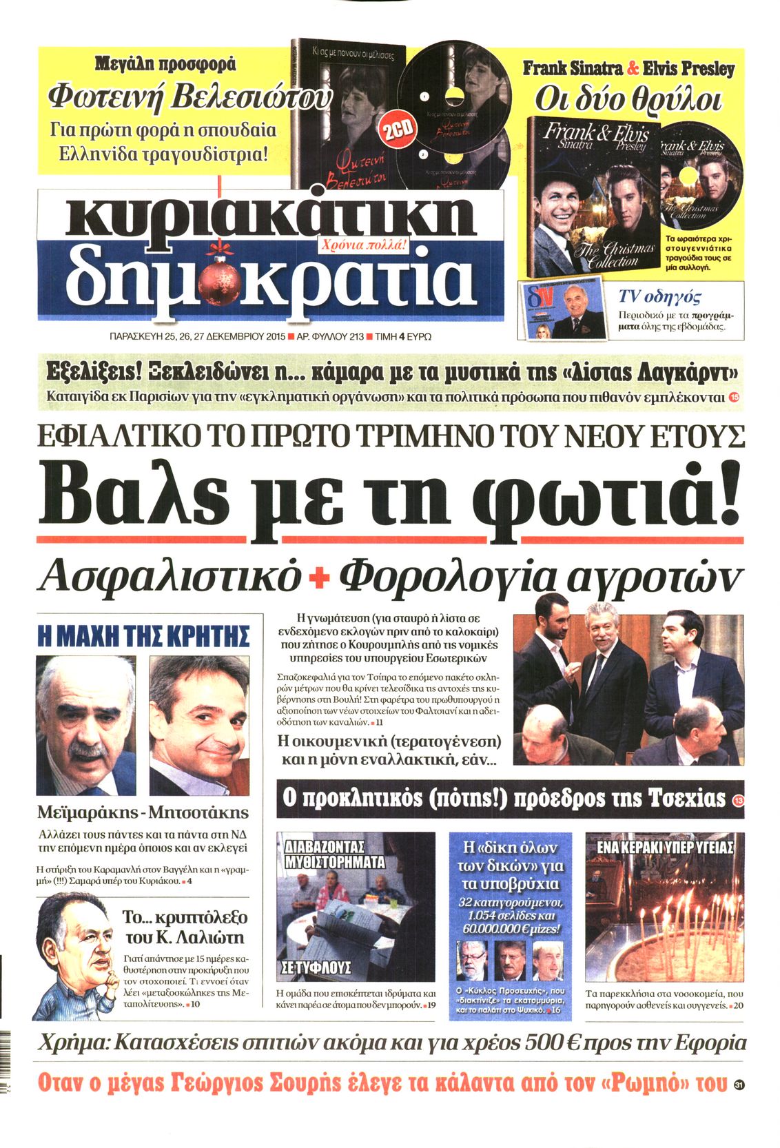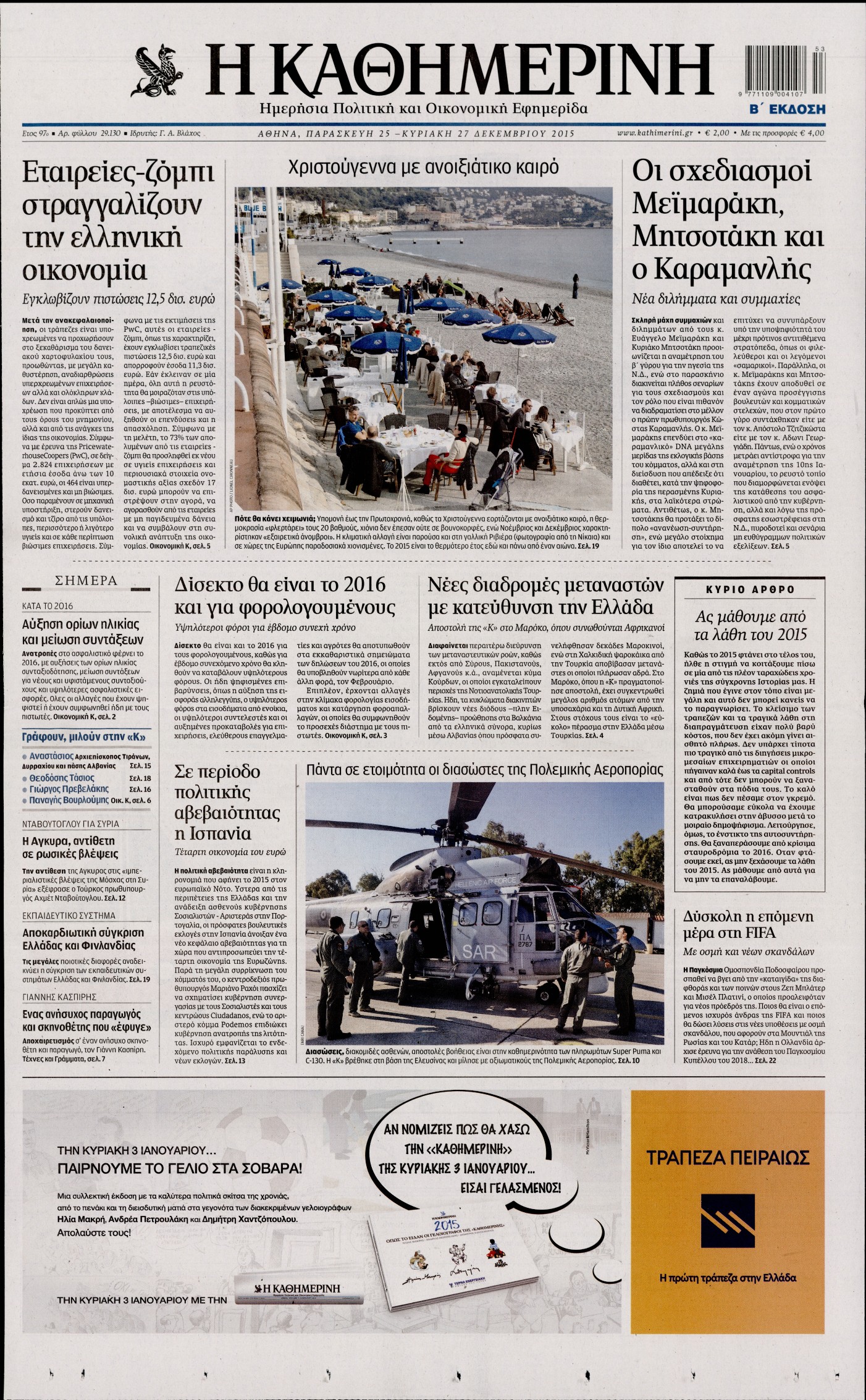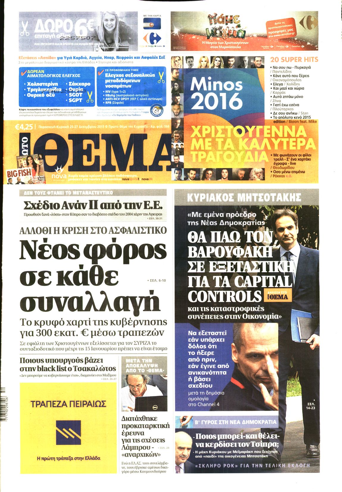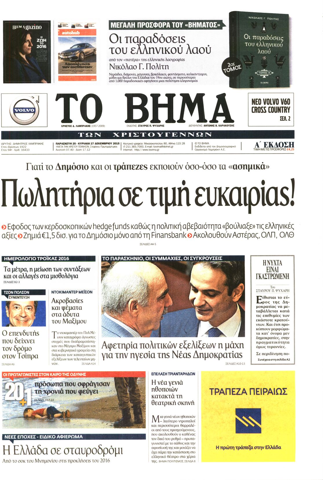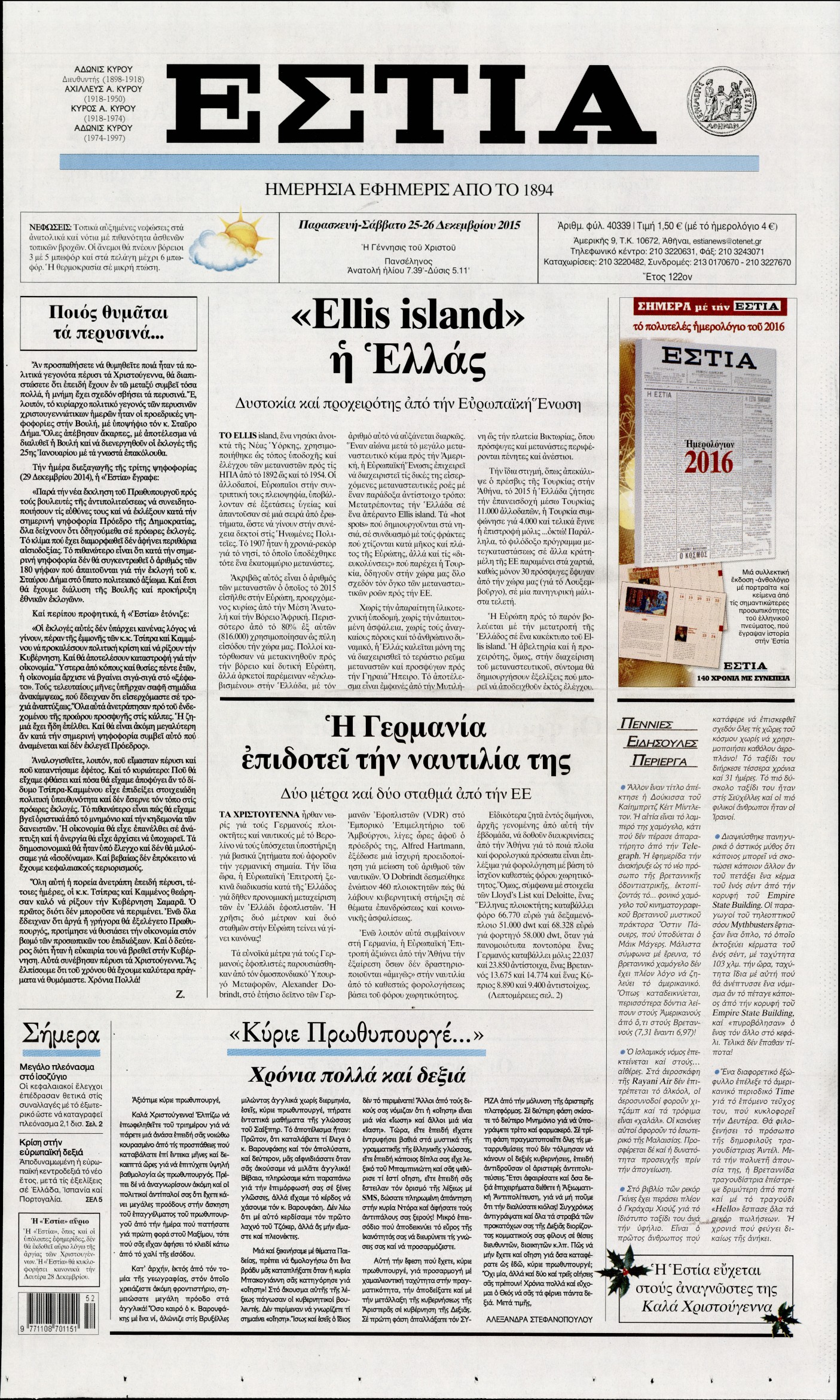 Οι πολιτικές εφημερίδες Enikos Newsroom 06:28, Παρασκευή 25 Δεκεμβρίου 2015 Media Διαβάστε τα πρωτοσέλιδα των πολιτικών εφημερίδων: ΠΟΛΙΤΙΚΕΣ ΕΦΗΜΕΡΙΔΕΣ ΠΡΩΤΟΣΕΛΙΔΑ Μοιράσου το: σχολίασε κι εσύ (0 σχόλια) Ακολουθήστε το enikos.gr στο Google News και μάθετε πρώτοι όλες τις ειδήσεις Δείτε όλες τις τελευταίες ειδήσεις από την Ελλάδα και τον Κόσμο στο enikos.gr Ειδήσεις Ροή Ειδήσεων 2 ώρες πριν Χριστούγεννα στα μπλόκα: Επιμένουν στις κινητοποιήσεις τους οι αγρότες – Ανοίγουν τα διόδια το Σαββατοκύριακο 2 ώρες πριν Ουκρανία: Η άνευ προηγουμένου επίθεση σε ρωσικό τάνκερ στη Μεσόγειο και το μήνυμα προς στον Πούτιν – Το «μακρύ χέρι» του Κιέβου 1 ώρα πριν Πούτιν: Τα μηνύματα σε Ευρώπη και ΝΑΤΟ από το μαραθώνιο «σόου» του – Η απαίτηση για «σεβασμό» και η ειρήνη «με τους όρους» της Μόσχας 2 ώρες πριν Τραμπ: Δεν αποκλείει την πιθανότητα ενός πολέμου στη Βενεζουέλα – «Ο Μαδούρο ξέρει καλύτερα από τον καθένα τι ακριβώς θέλω» 3 ώρες πριν Συνεχίζει να προκαλεί ο Μίτσκοσκι: «Για μένα το όνομα Μακεδονία είναι ιερό» 1 ώρα πριν Ανακαλύφθηκαν αρχαία χρυσά νομίσματα 2.200 ετών που απεικονίζουν τον θεό Απόλλωνα – Η άγνωστη σύνδεση με τον Φίλιππο Β΄ της Μακεδονίας 2 ώρες πριν Ύπνος: Μια κρυφή κατάσταση του εγκεφάλου πριν από τον ύπνο μπορεί να είναι το “κλειδί” για υψηλή ευφυΐα και δημιουργικότητα 3 ώρες πριν Αριθμολογία: Οι άνθρωποι που έχουν γεννηθεί αυτές τις 4 ημερομηνίες, συχνά παρεξηγούνται – «Η καλοσύνη τους κρύβει τεράστια δύναμη» 4 ώρες πριν Ξεχάστε το καθάρισμα το Σαββατοκύριακο: Ο «κανόνας των 20 λεπτών» που θα σας λύσει τα χέρια 6 λεπτά πριν Βασίλης Σπανούλης: Δεν εμφανίστηκε ούτε ένας δημοσιογράφος στην συνέντευξη Τύπου – «Καλησπέρα στον… κανέναν», δείτε βίντεο 17 λεπτά πριν Πόλεμος στην Ουκρανία: Εφτά νεκροί από ρωσική πυραυλική επίθεση στο λιμάνι της Οδησσού 20 λεπτά πριν ΗΠΑ: Η κυβέρνηση του Ντόναλντ Τραμπ άρχισε να δημοσιοποιεί τα αρχεία Έπσταϊν 32 λεπτά πριν Σάμος: Άνοιξε το μπλόκο των αγροτών στον κόμβο Κοκκαρίου – Σε νέα συνεδρίαση θα καθορίσουν την στάση τους 40 λεπτά πριν Άνω Λιόσια: Πυροβολισμοί σε επιχείρηση με χαλιά – Εντοπίστηκαν 10 κάλυκες ENIKOS NETWORK Το ΕΚΑΒ τιμήθηκε από την Ακαδημία Αθηνών για τα 40 χρόνια προσφοράς του Έχετε πραγματικά μεγάλη καρδιά; 10 χαρακτηριστικά όσων έχουν καλοσύνη Αναστολή μέτρων αναγκαστικής εκτέλεσης για κτηνοτρόφους που πλήττονται από την ευλογιά των αιγοπροβάτων Πλήρης επάρκεια προϊόντων στις λαϊκές της Αττικής, παρά τις αγροτικές κινητοποιήσεις – Τι απαντούν οι πωλητές Χαρτογραφώντας το «σημείο χωρίς επιστροφή»: Για πρώτη φορά αποκαλύπτεται με λεπτομέρεια το ακανθώδες όριο της ατμόσφαιρας τ... Η Google καταργεί τη λειτουργία «dark web report» – Πώς θα μπορούν οι χρήστες να διαγράφουν τα δεδομένα τους περισσότερα 22:42 , Παρασκευή 19 Δεκεμβρίου 2025 Γιώργος Γιαννόπουλος για “Το σόι σου”: “Είναι ευτυχία και ευλογία αυτή η σειρά” «Είναι ευτυχία και ευλογία η συγκυρία αυτής της σειράς», θα πει ο Γιώργος Γιαννόπουλος -ο αγαπ... 20:37 , Παρασκευή 19 Δεκεμβρίου 2025 Don’t Forget The Lyrics: Η Έλλη Κοκκίνου υποδέχεται 4 παίκτες που θα κάνουν τα πάντα για να μη χάσουν ούτε… μισή λέξη από τους στίχους Το «Don’t Forget The Lyrics» επιστρέφει απόψε, Παρασκευή 19 Δεκεμβρίου, στις 21:00 με νέο επει... 19:31 , Παρασκευή 19 Δεκεμβρίου 2025 GNTM: Απόψε ο μεγάλος τελικός για τους 4 φιναλίστ Έπειτα από μήνες γεμάτους μόδα, δημιουργία και έντονες αναμετρήσεις, το GNTM 2025 κορυφώνεται,... 18:11 , Παρασκευή 19 Δεκεμβ