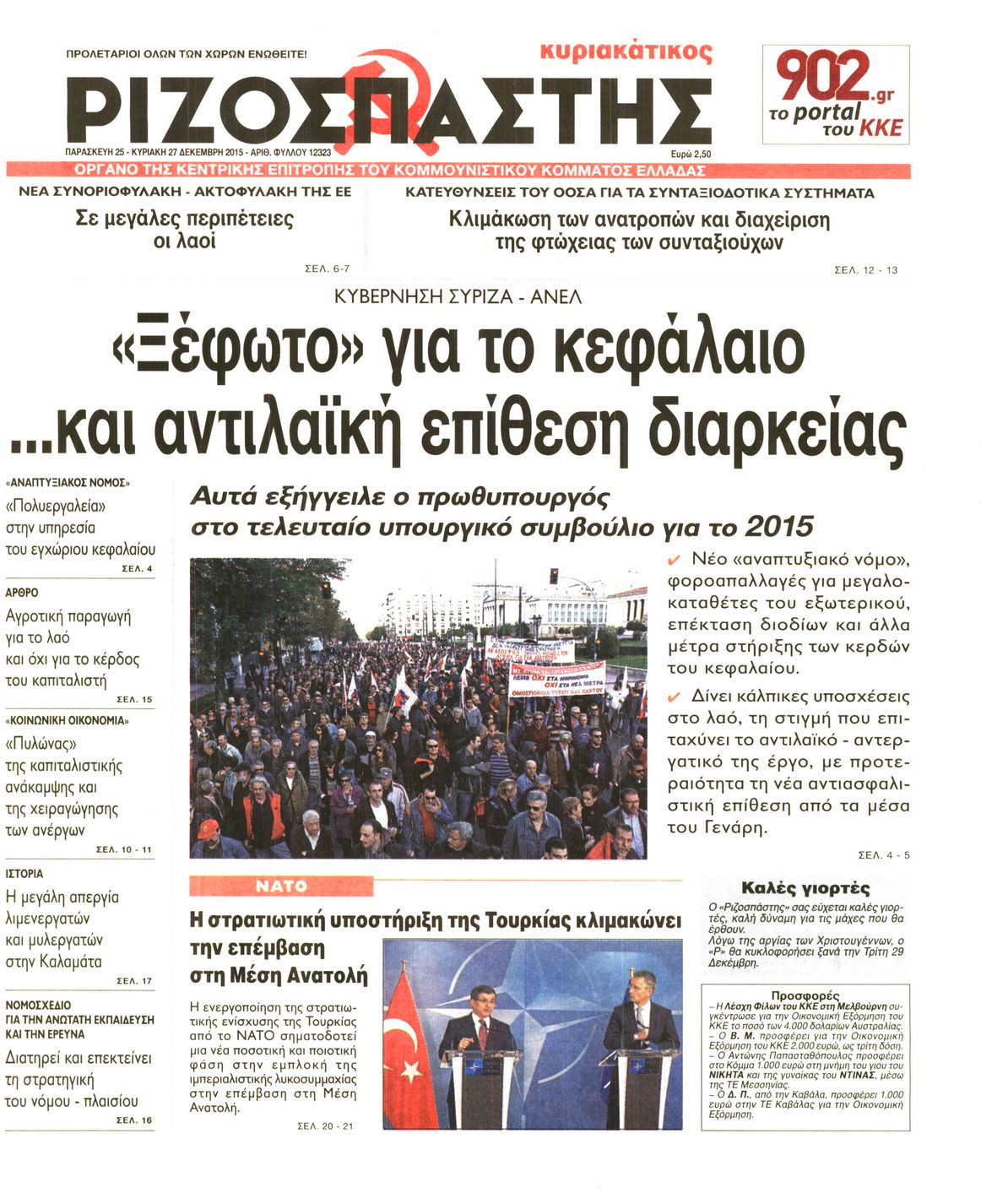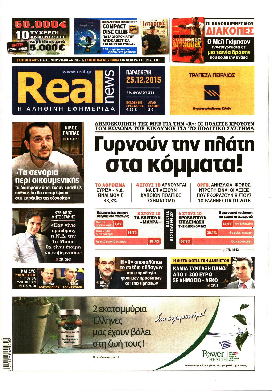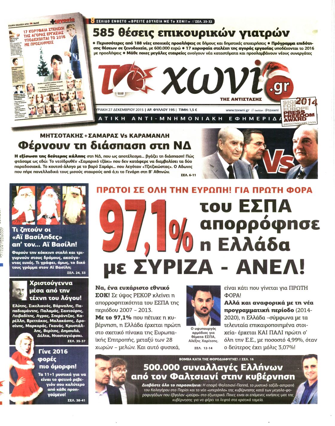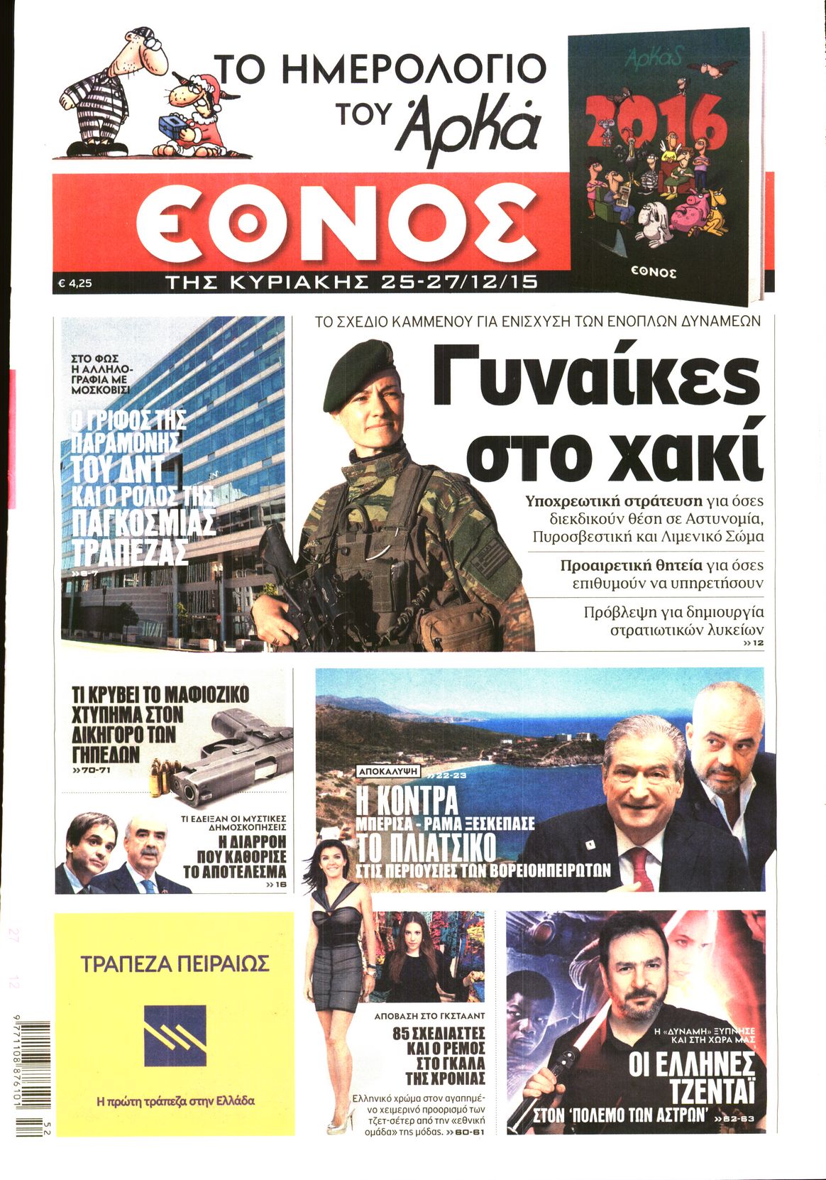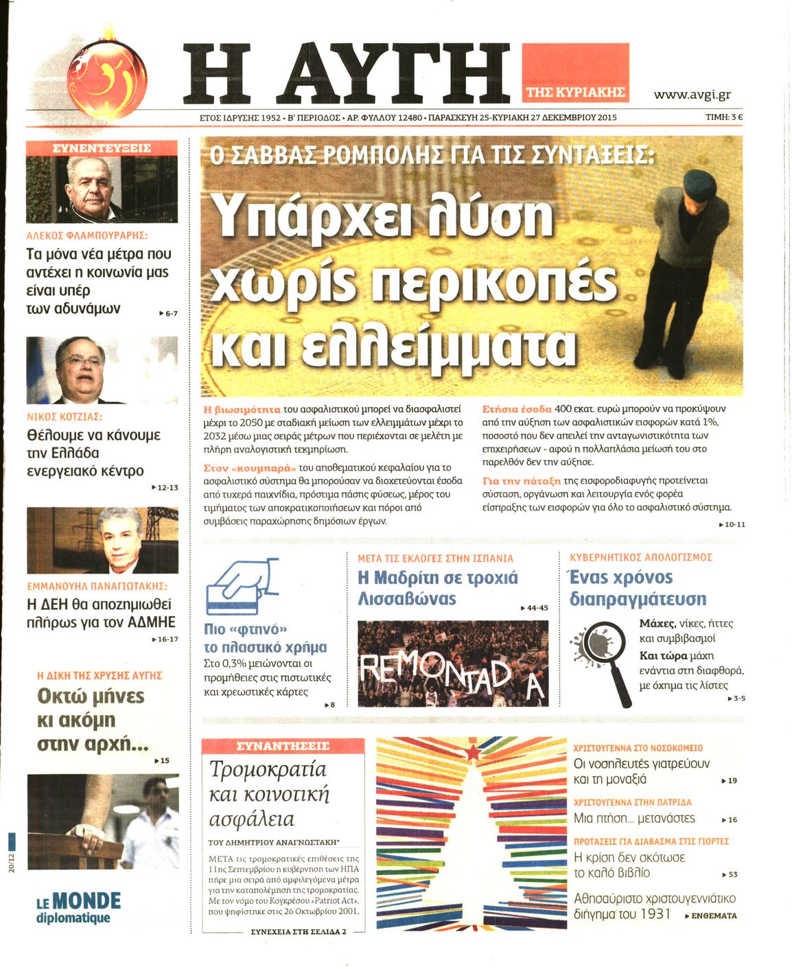 Οι πολιτικές εφημερίδες Enikos Newsroom 06:28, Παρασκευή 25 Δεκεμβρίου 2015 Media Διαβάστε τα πρωτοσέλιδα των πολιτικών εφημερίδων: ΠΟΛΙΤΙΚΕΣ ΕΦΗΜΕΡΙΔΕΣ ΠΡΩΤΟΣΕΛΙΔΑ Μοιράσου το: σχολίασε κι εσύ (0 σχόλια) Ακολουθήστε το enikos.gr στο Google News και μάθετε πρώτοι όλες τις ειδήσεις Δείτε όλες τις τελευταίες ειδήσεις από την Ελλάδα και τον Κόσμο στο enikos.gr Ειδήσεις Ροή Ειδήσεων 2 ώρες πριν Χριστούγεννα στα μπλόκα: Επιμένουν στις κινητοποιήσεις τους οι αγρότες – Ανοίγουν τα διόδια το Σαββατοκύριακο 2 ώρες πριν Ουκρανία: Η άνευ προηγουμένου επίθεση σε ρωσικό τάνκερ στη Μεσόγειο και το μήνυμα προς στον Πούτιν – Το «μακρύ χέρι» του Κιέβου 1 ώρα πριν Πούτιν: Τα μηνύματα σε Ευρώπη και ΝΑΤΟ από το μαραθώνιο «σόου» του – Η απαίτηση για «σεβασμό» και η ειρήνη «με τους όρους» της Μόσχας 2 ώρες πριν Τραμπ: Δεν αποκλείει την πιθανότητα ενός πολέμου στη Βενεζουέλα – «Ο Μαδούρο ξέρει καλύτερα από τον καθένα τι ακριβώς θέλω» 3 ώρες πριν Συνεχίζει να προκαλεί ο Μίτσκοσκι: «Για μένα το όνομα Μακεδονία είναι ιερό» 1 ώρα πριν Ανακαλύφθηκαν αρχαία χρυσά νομίσματα 2.200 ετών που απεικονίζουν τον θεό Απόλλωνα – Η άγνωστη σύνδεση με τον Φίλιππο Β΄ της Μακεδονίας 2 ώρες πριν Ύπνος: Μια κρυφή κατάσταση του εγκεφάλου πριν από τον ύπνο μπορεί να είναι το “κλειδί” για υψηλή ευφυΐα και δημιουργικότητα 3 ώρες πριν Αριθμολογία: Οι άνθρωποι που έχουν γεννηθεί αυτές τις 4 ημερομηνίες, συχνά παρεξηγούνται – «Η καλοσύνη τους κρύβει τεράστια δύναμη» 4 ώρες πριν Ξεχάστε το καθάρισμα το Σαββατοκύριακο: Ο «κανόνας των 20 λεπτών» που θα σας λύσει τα χέρια 6 λεπτά πριν Βασίλης Σπανούλης: Δεν εμφανίστηκε ούτε ένας δημοσιογράφος στην συνέντευξη Τύπου – «Καλησπέρα στον… κανέναν», δείτε βίντεο 17 λεπτά πριν Πόλεμος στην Ουκρανία: Εφτά νεκροί από ρωσική πυραυλική επίθεση στο λιμάνι της Οδησσού 20 λεπτά πριν ΗΠΑ: Η κυβέρνηση του Ντόναλντ Τραμπ άρχισε να δημοσιοποιεί τα αρχεία Έπσταϊν 32 λεπτά πριν Σάμος: Άνοιξε το μπλόκο των αγροτών στον κόμβο Κοκκαρίου – Σε νέα συνεδρίαση θα καθορίσουν την στάση τους 40 λεπτά πριν Άνω Λιόσια: Πυροβολισμοί σε επιχείρηση με χαλιά – Εντοπίστηκαν 10 κάλυκες ENIKOS NETWORK Το ΕΚΑΒ τιμήθηκε από την Ακαδημία Αθηνών για τα 40 χρόνια προσφοράς του Έχετε πραγματικά μεγάλη καρδιά; 10 χαρακτηριστικά όσων έχουν καλοσύνη Αναστολή μέτρων αναγκαστικής εκτέλεσης για κτηνοτρόφους που πλήττονται από την ευλογιά των αιγοπροβάτων Πλήρης επάρκεια προϊόντων στις λαϊκές της Αττικής, παρά τις αγροτικές κινητοποιήσεις – Τι απαντούν οι πωλητές Χαρτογραφώντας το «σημείο χωρίς επιστροφή»: Για πρώτη φορά αποκαλύπτεται με λεπτομέρεια το ακανθώδες όριο της ατμόσφαιρας τ... Η Google καταργεί τη λειτουργία «dark web report» – Πώς θα μπορούν οι χρήστες να διαγράφουν τα δεδομένα τους περισσότερα 22:42 , Παρασκευή 19 Δεκεμβρίου 2025 Γιώργος Γιαννόπουλος για “Το σόι σου”: “Είναι ευτυχία και ευλογία αυτή η σειρά” «Είναι ευτυχία και ευλογία η συγκυρία αυτής της σειράς», θα πει ο Γιώργος Γιαννόπουλος -ο αγαπ... 20:37 , Παρασκευή 19 Δεκεμβρίου 2025 Don’t Forget The Lyrics: Η Έλλη Κοκκίνου υποδέχεται 4 παίκτες που θα κάνουν τα πάντα για να μη χάσουν ούτε… μισή λέξη από τους στίχους Το «Don’t Forget The Lyrics» επιστρέφει απόψε, Παρασκευή 19 Δεκεμβρίου, στις 21:00 με νέο επει... 19:31 , Παρασκευή 19 Δεκεμβρίου 2025 GNTM: Απόψε ο μεγάλος τελικός για τους 4 φιναλίστ Έπειτα από μήνες γεμάτους μόδα, δημιουργία και έντονες αναμετρήσεις, το GNTM 2025 κορυφώνεται,... 18:11 , Παρασκευή 19 Δεκεμβ