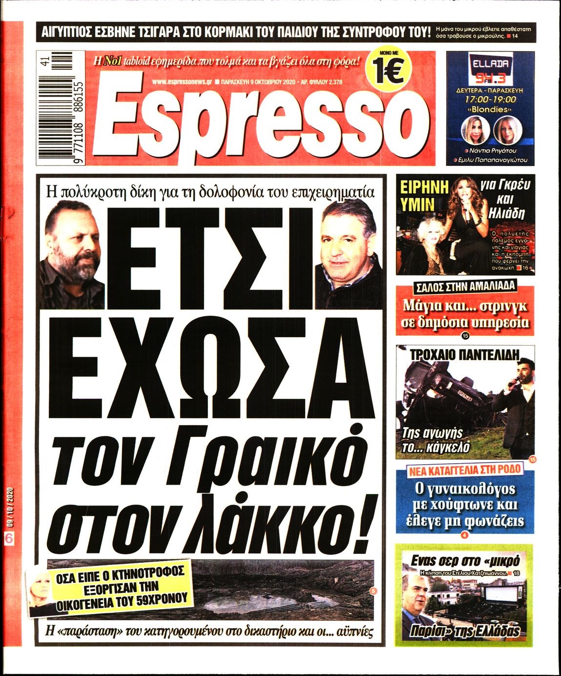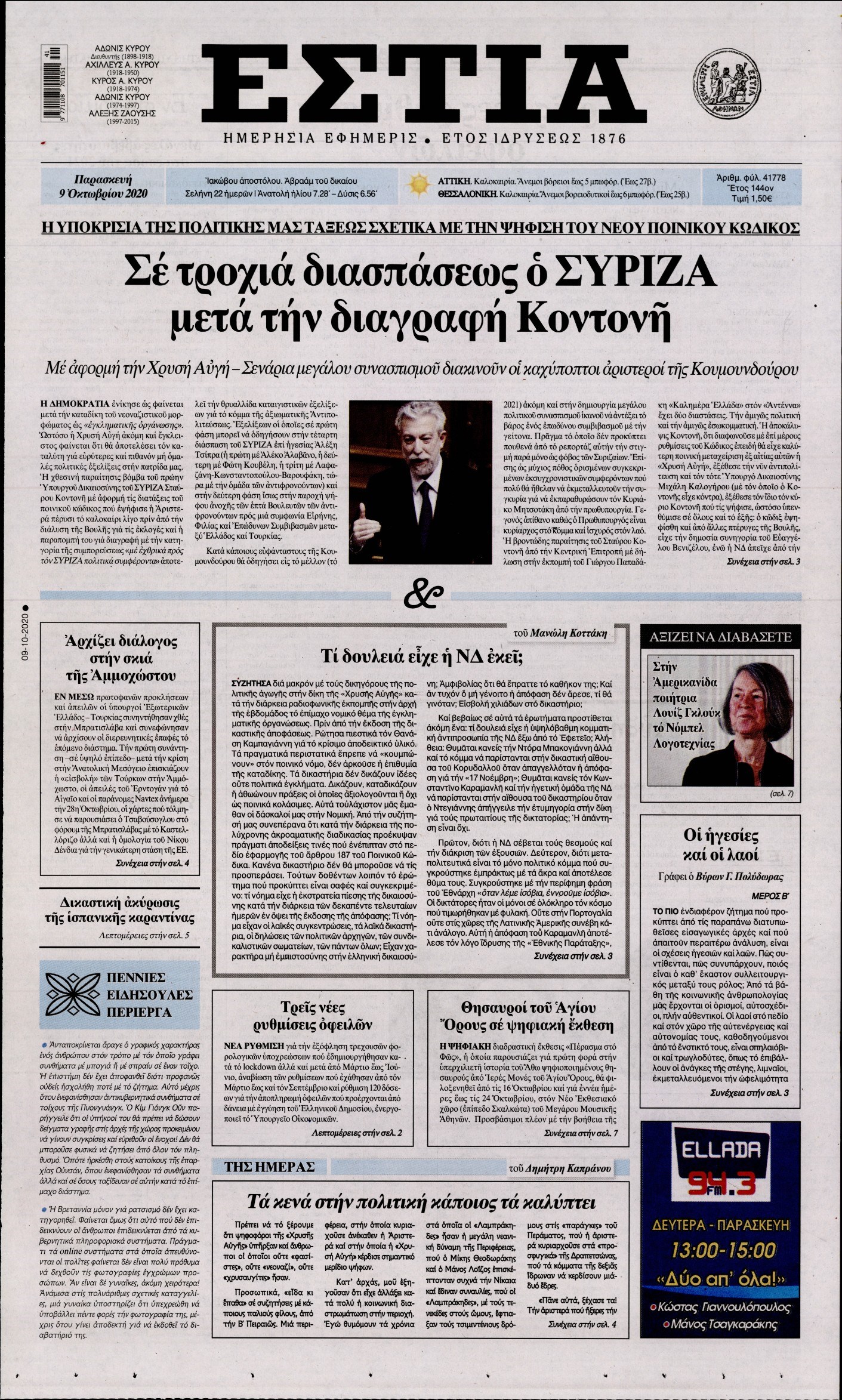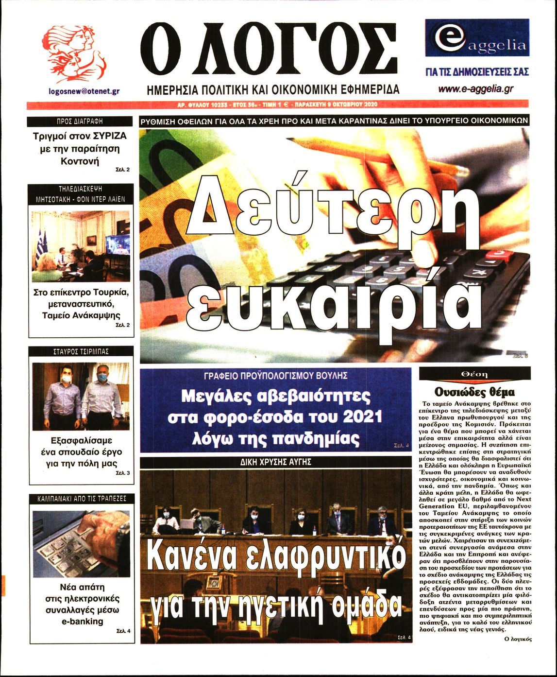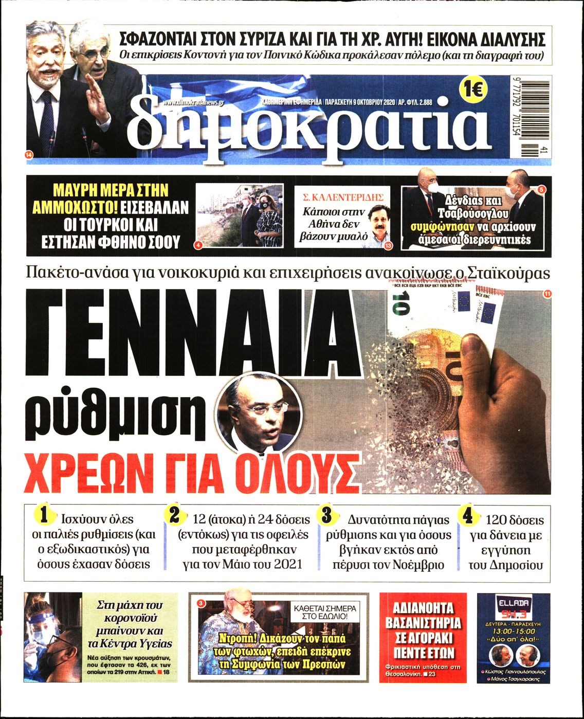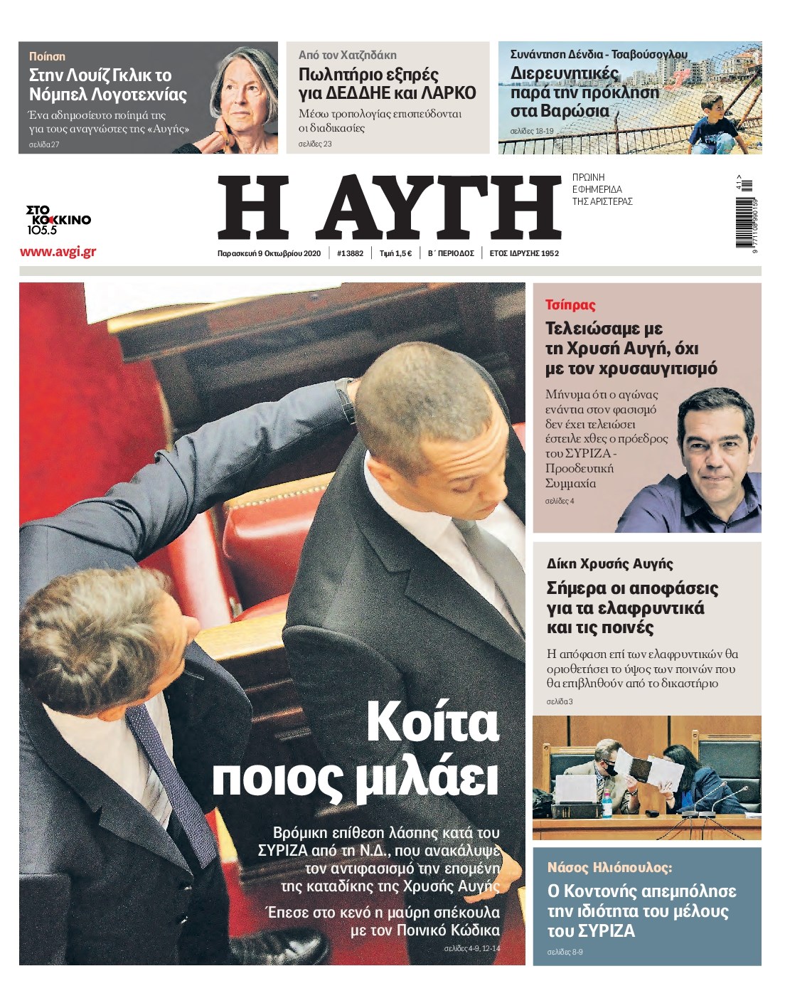 Οι πολιτικές εφημερίδες 9/10/2020 Διονύσης Νίκκας 06:08, Παρασκευή 09 Οκτωβρίου 2020 Media Διαβάστε τα πρωτοσέλιδα των πολιτικών εφημερίδων… ΠΟΛΙΤΙΚΕΣ ΕΦΗΜΕΡΙΔΕΣ ΠΡΩΤΟΣΕΛΙΔΑ Μοιράσου το: σχολίασε κι εσύ (0 σχόλια) Ακολουθήστε το enikos.gr στο Google News και μάθετε πρώτοι όλες τις ειδήσεις Δείτε όλες τις τελευταίες ειδήσεις από την Ελλάδα και τον Κόσμο στο enikos.gr Ειδήσεις Ροή Ειδήσεων 2 ώρες πριν Χριστούγεννα στα μπλόκα: Επιμένουν στις κινητοποιήσεις τους οι αγρότες – Ανοίγουν τα διόδια το Σαββατοκύριακο 2 ώρες πριν Ουκρανία: Η άνευ προηγουμένου επίθεση σε ρωσικό τάνκερ στη Μεσόγειο και το μήνυμα προς στον Πούτιν – Το «μακρύ χέρι» του Κιέβου 2 ώρες πριν Πούτιν: Τα μηνύματα σε Ευρώπη και ΝΑΤΟ από το μαραθώνιο «σόου» του – Η απαίτηση για «σεβασμό» και η ειρήνη «με τους όρους» της Μόσχας 3 ώρες πριν Τραμπ: Δεν αποκλείει την πιθανότητα ενός πολέμου στη Βενεζουέλα – «Ο Μαδούρο ξέρει καλύτερα από τον καθένα τι ακριβώς θέλω» 3 ώρες πριν Συνεχίζει να προκαλεί ο Μίτσκοσκι: «Για μένα το όνομα Μακεδονία είναι ιερό» 2 ώρες πριν Ανακαλύφθηκαν αρχαία χρυσά νομίσματα 2.200 ετών που απεικονίζουν τον θεό Απόλλωνα – Η άγνωστη σύνδεση με τον Φίλιππο Β΄ της Μακεδονίας 3 ώρες πριν Ύπνος: Μια κρυφή κατάσταση του εγκεφάλου πριν από τον ύπνο μπορεί να είναι το “κλειδί” για υψηλή ευφυΐα και δημιουργικότητα 4 ώρες πριν Αριθμολογία: Οι άνθρωποι που έχουν γεννηθεί αυτές τις 4 ημερομηνίες, συχνά παρεξηγούνται – «Η καλοσύνη τους κρύβει τεράστια δύναμη» 5 ώρες πριν Ξεχάστε το καθάρισμα το Σαββατοκύριακο: Ο «κανόνας των 20 λεπτών» που θα σας λύσει τα χέρια 14 λεπτά πριν Φαίη Σκορδά: «Παλιότερα τα κομπλιμέντα τα προσπερνούσα, τώρα τα έχω ανάγκη» 30 λεπτά πριν Βασίλης Σπανούλης: Δεν εμφανίστηκε ούτε ένας δημοσιογράφος στην συνέντευξη Τύπου – «Καλησπέρα στον… κανέναν», δείτε βίντεο 41 λεπτά πριν Πόλεμος στην Ουκρανία: Εφτά νεκροί από ρωσική πυραυλική επίθεση στο λιμάνι της Οδησσού 45 λεπτά πριν ΗΠΑ: Η κυβέρνηση του Ντόναλντ Τραμπ άρχισε να δημοσιοποιεί τα αρχεία Έπσταϊν 56 λεπτά πριν Σάμος: Άνοιξε το μπλόκο των αγροτών στον κόμβο Κοκκαρίου – Σε νέα συνεδρίαση θα καθορίσουν την στάση τους ENIKOS NETWORK Το ΕΚΑΒ τιμήθηκε από την Ακαδημία Αθηνών για τα 40 χρόνια προσφοράς του Έχετε πραγματικά μεγάλη καρδιά; 10 χαρακτηριστικά όσων έχουν καλοσύνη Αναστολή μέτρων αναγκαστικής εκτέλεσης για κτηνοτρόφους που πλήττονται από την ευλογιά των αιγοπροβάτων Πλήρης επάρκεια προϊόντων στις λαϊκές της Αττικής, παρά τις αγροτικές κινητοποιήσεις – Τι απαντούν οι πωλητές Χαρτογραφώντας το «σημείο χωρίς επιστροφή»: Για πρώτη φορά αποκαλύπτεται με λεπτομέρεια το ακανθώδες όριο της ατμόσφαιρας τ... Η Google καταργεί τη λειτουργία «dark web report» – Πώς θα μπορούν οι χρήστες να διαγράφουν τα δεδομένα τους περισσότερα 22:42 , Παρασκευή 19 Δεκεμβρίου 2025 Γιώργος Γιαννόπουλος για “Το σόι σου”: “Είναι ευτυχία και ευλογία αυτή η σειρά” «Είναι ευτυχία και ευλογία η συγκυρία αυτής της σειράς», θα πει ο Γιώργος Γιαννόπουλος -ο αγαπ... 20:37 , Παρασκευή 19 Δεκεμβρίου 2025 Don’t Forget The Lyrics: Η Έλλη Κοκκίνου υποδέχεται 4 παίκτες που θα κάνουν τα πάντα για να μη χάσουν ούτε… μισή λέξη από τους στίχους Το «Don’t Forget The Lyrics» επιστρέφει απόψε, Παρασκευή 19 Δεκεμβρίου, στις 21:00 με νέο επει... 19:31 , Παρασκευή 19 Δεκεμβρίου 2025 GNTM: Απόψε ο μεγάλος τελικός για τους 4 φιναλίστ Έπειτα από μήνες γεμάτους μόδα, δημιουργία και έντονες αναμετρήσεις, το GNTM 2025 κορυφώνεται,... 18:11 , 