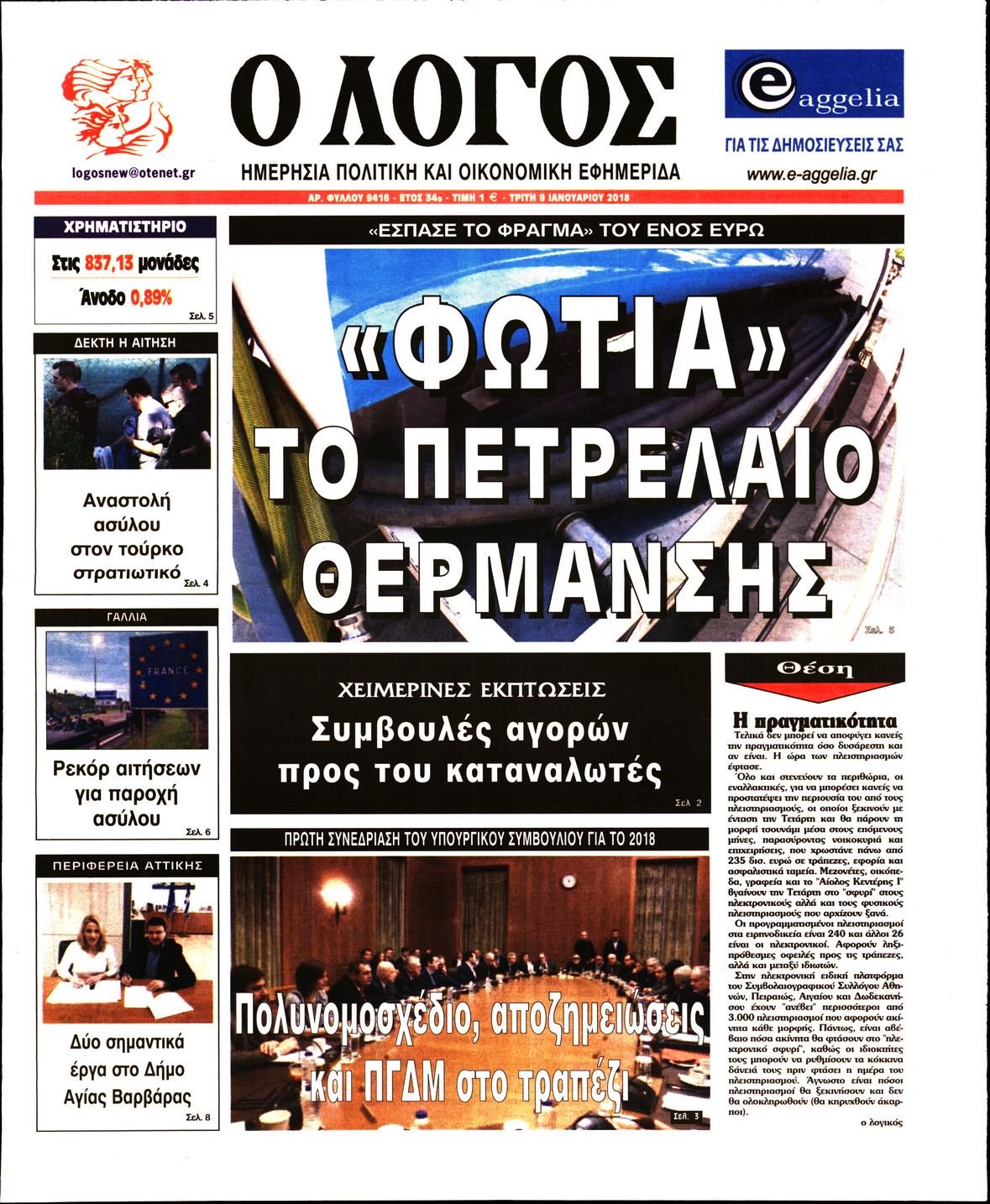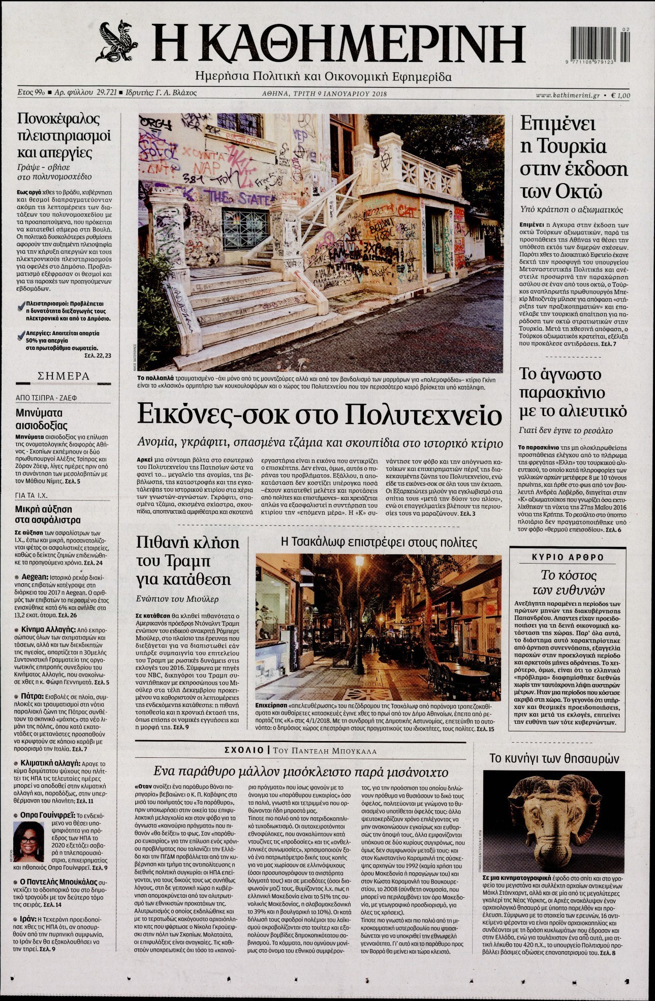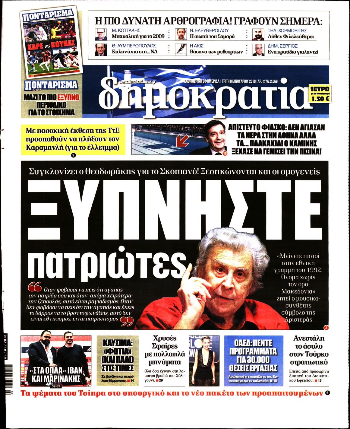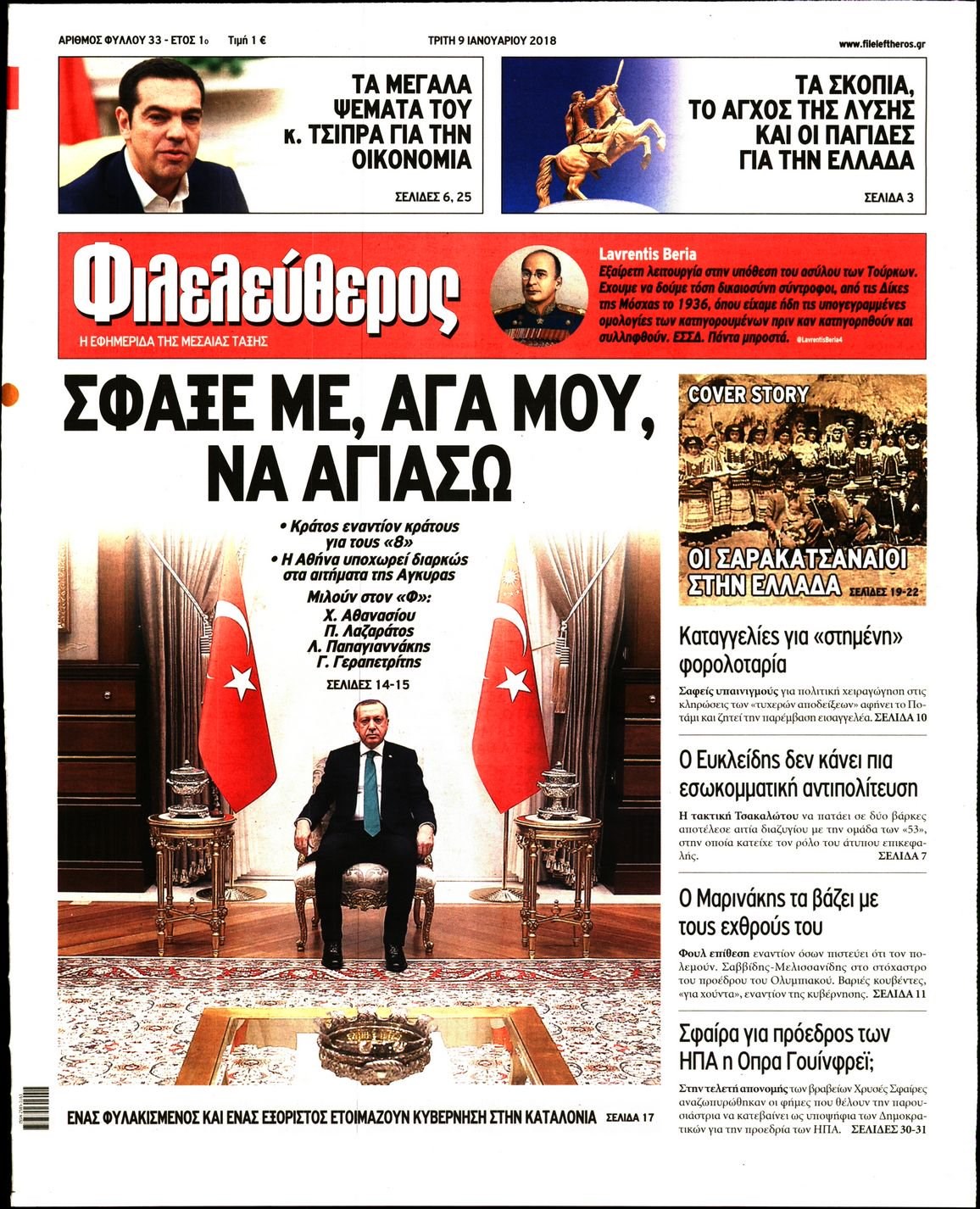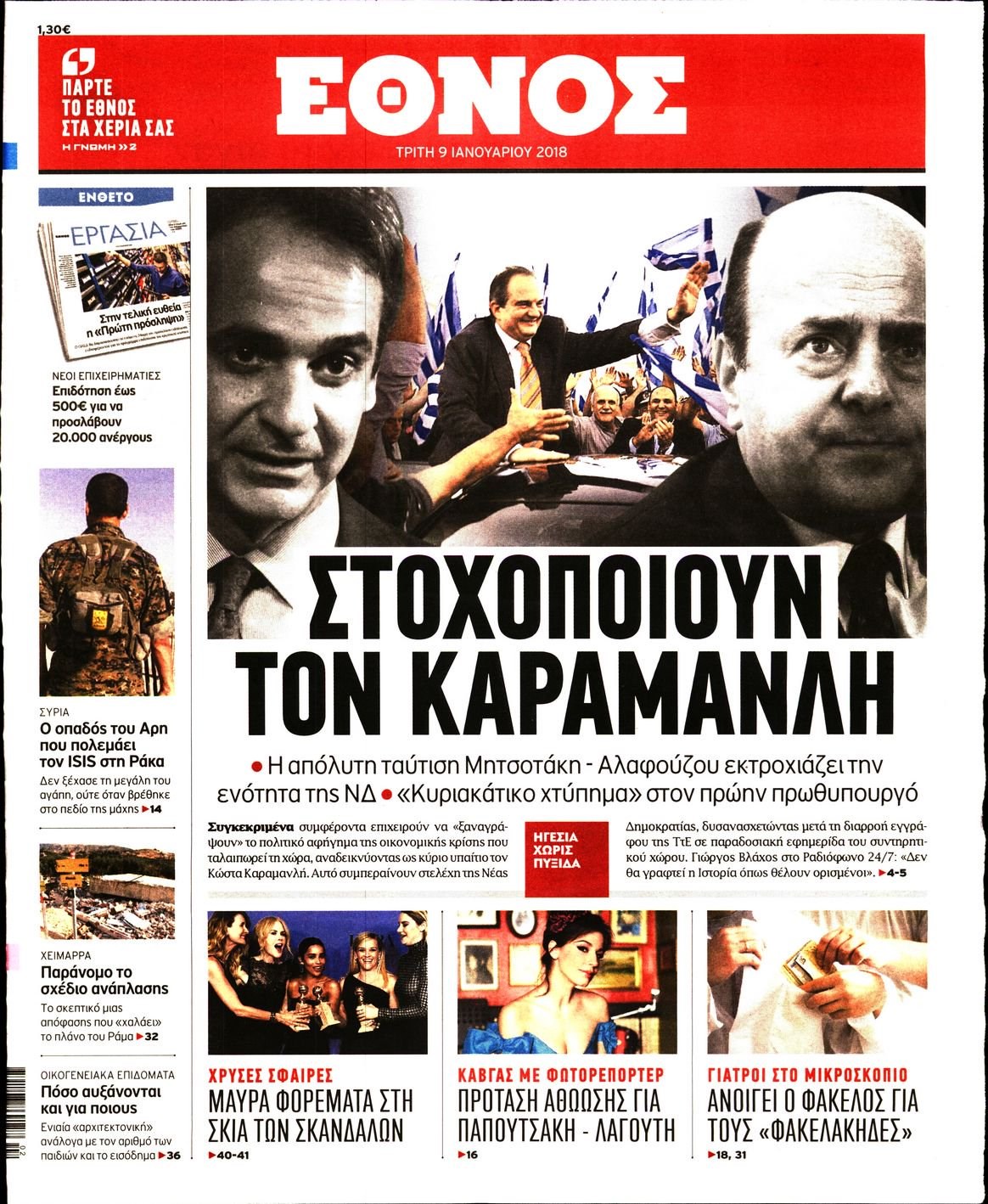 Οι πολιτικές εφημερίδες 9/1/2018 Enikos Newsroom 07:28, Τρίτη 09 Ιανουαρίου 2018 Media Διαβάστε τα σημερινά πρωτοσέλιδα των πολιτικών εφημερίδων: ΠΟΛΙΤΙΚΕΣ ΕΦΗΜΕΡΙΔΕΣ ΠΡΩΤΟΣΕΛΙΔΑ Μοιράσου το: σχολίασε κι εσύ (0 σχόλια) Ακολουθήστε το enikos.gr στο Google News και μάθετε πρώτοι όλες τις ειδήσεις Δείτε όλες τις τελευταίες ειδήσεις από την Ελλάδα και τον Κόσμο στο enikos.gr Ειδήσεις Ροή Ειδήσεων 4 ώρες πριν Χριστούγεννα στα μπλόκα: Επιμένουν στις κινητοποιήσεις τους οι αγρότες – Ανοίγουν τα διόδια το Σαββατοκύριακο 4 ώρες πριν Ουκρανία: Η άνευ προηγουμένου επίθεση σε ρωσικό τάνκερ στη Μεσόγειο και το μήνυμα προς στον Πούτιν – Το «μακρύ χέρι» του Κιέβου 4 ώρες πριν Πούτιν: Τα μηνύματα σε Ευρώπη και ΝΑΤΟ από το μαραθώνιο «σόου» του – Η απαίτηση για «σεβασμό» και η ειρήνη «με τους όρους» της Μόσχας 4 ώρες πριν Τραμπ: Δεν αποκλείει την πιθανότητα ενός πολέμου στη Βενεζουέλα – «Ο Μαδούρο ξέρει καλύτερα από τον καθένα τι ακριβώς θέλω» 5 ώρες πριν Συνεχίζει να προκαλεί ο Μίτσκοσκι: «Για μένα το όνομα Μακεδονία είναι ιερό» 4 ώρες πριν Ανακαλύφθηκαν αρχαία χρυσά νομίσματα 2.200 ετών που απεικονίζουν τον θεό Απόλλωνα – Η άγνωστη σύνδεση με τον Φίλιππο Β΄ της Μακεδονίας 5 ώρες πριν Ύπνος: Μια κρυφή κατάσταση του εγκεφάλου πριν από τον ύπνο μπορεί να είναι το “κλειδί” για υψηλή ευφυΐα και δημιουργικότητα 6 ώρες πριν Αριθμολογία: Οι άνθρωποι που έχουν γεννηθεί αυτές τις 4 ημερομηνίες, συχνά παρεξηγούνται – «Η καλοσύνη τους κρύβει τεράστια δύναμη» 7 ώρες πριν Ξεχάστε το καθάρισμα το Σαββατοκύριακο: Ο «κανόνας των 20 λεπτών» που θα σας λύσει τα χέρια 6 λεπτά πριν Ντόναλντ Τραμπ: «Πολύ βαριά αντίποινα» στη Συρία – «Πλήττουμε πολύ δυνατά οχυρά του Ισλαμικού Κράτους» 21 λεπτά πριν Εξάρχεια: Ένταση με μολότοφ, χημικά και κρότου λάμψης 36 λεπτά πριν ΗΠΑ: Τραγωδία στην Αλαμπάμα – Σκότωσε την δημοσιογράφο σύζυγό του και αυτοκτόνησε μπροστά στον 3χρονο γιο τους 51 λεπτά πριν Πρόταση γάμου στο ΣΕΦ κατά την διάρκεια του αγώνα Ολυμπιακός-Βιλερμπάν – Δείτε βίντεο 1 ώρα πριν Euroleague: Επέστρεψε στις νίκες ο Ολυμπιακός, πήρε την ματσάρα της χρονιάς η Μπάρτσα – Τα αποτελέσματα και η βαθμολογία ENIKOS NETWORK Το ΕΚΑΒ τιμήθηκε από την Ακαδημία Αθηνών για τα 40 χρόνια προσφοράς του Έχετε πραγματικά μεγάλη καρδιά; 10 χαρακτηριστικά όσων έχουν καλοσύνη Αναστολή μέτρων αναγκαστικής εκτέλεσης για κτηνοτρόφους που πλήττονται από την ευλογιά των αιγοπροβάτων Πλήρης επάρκεια προϊόντων στις λαϊκές της Αττικής, παρά τις αγροτικές κινητοποιήσεις – Τι απαντούν οι πωλητές Χαρτογραφώντας το «σημείο χωρίς επιστροφή»: Για πρώτη φορά αποκαλύπτεται με λεπτομέρεια το ακανθώδες όριο της ατμόσφαιρας τ... Η Google καταργεί τη λειτουργία «dark web report» – Πώς θα μπορούν οι χρήστες να διαγράφουν τα δεδομένα τους περισσότερα 22:42 , Παρασκευή 19 Δεκεμβρίου 2025 Γιώργος Γιαννόπουλος για “Το σόι σου”: “Είναι ευτυχία και ευλογία αυτή η σειρά” «Είναι ευτυχία και ευλογία η συγκυρία αυτής της σειράς», θα πει ο Γιώργος Γιαννόπουλος -ο αγαπ... 20:37 , Παρασκευή 19 Δεκεμβρίου 2025 Don’t Forget The Lyrics: Η Έλλη Κοκκίνου υποδέχεται 4 παίκτες που θα κάνουν τα πάντα για να μη χάσουν ούτε… μισή λέξη από τους στίχους Το «Don’t Forget The Lyrics» επιστρέφει απόψε, Παρασκευή 19 Δεκεμβρίου, στις 21:00 με νέο επει... 19:31 , Παρασκευή 19 Δεκεμβρίου 2025 GNTM: Απόψε ο μεγάλος τελικός για τους 4 φιναλίστ Έπειτα από μήνες γεμάτους μόδα, δημιουργία και έντονες αναμετρήσεις, το GNTM 2025 κορυφώνεται,... 18:11 , Παρασκ