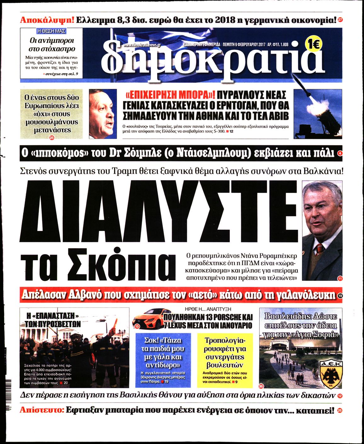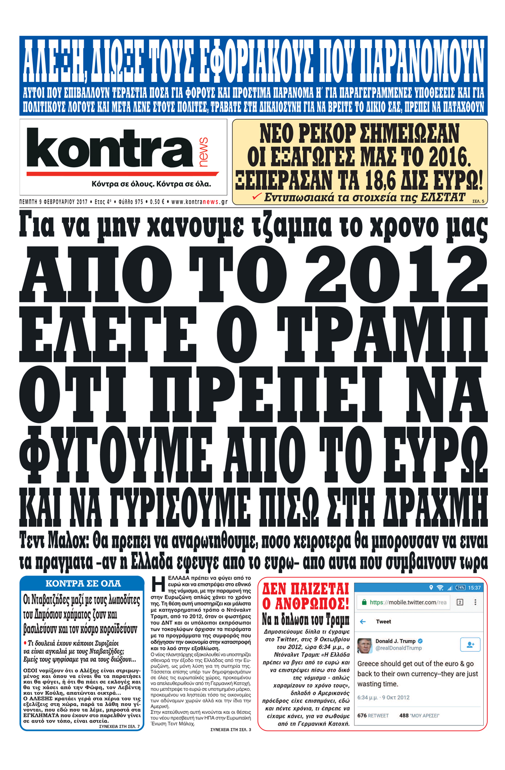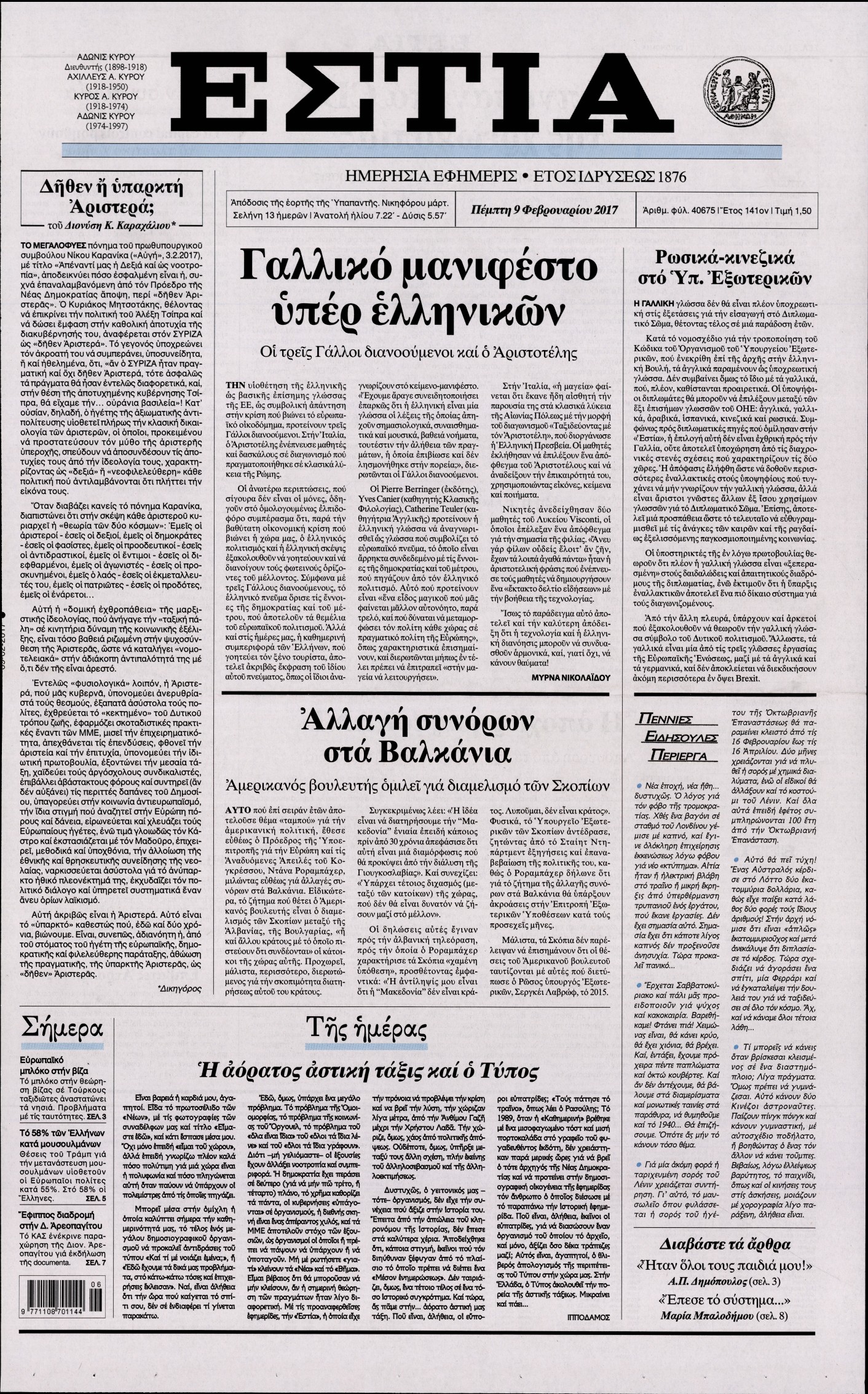 Οι πολιτικές εφημερίδες 9/2/2017 Enikos Newsroom 02:00, Πέμπτη 09 Φεβρουαρίου 2017 Media Διαβάστε τα σημερινά πρωτοσέλιδα των πολιτικών εφημερίδων: ΠΟΛΙΤΙΚΕΣ ΕΦΗΜΕΡΙΔΕΣ ΠΡΩΤΟΣΕΛΙΔΑ Μοιράσου το: σχολίασε κι εσύ (0 σχόλια) Ακολουθήστε το enikos.gr στο Google News και μάθετε πρώτοι όλες τις ειδήσεις Δείτε όλες τις τελευταίες ειδήσεις από την Ελλάδα και τον Κόσμο στο enikos.gr Ειδήσεις Ροή Ειδήσεων 4 ώρες πριν Εκτός ευρωομάδας ΣΥΡΙΖΑ ο Νίκος Παππάς μετά την επίθεση στον δημοσιογράφο Νίκο Γιαννόπουλο – Η μήνυση και οι νέες δηλώσεις 4 ώρες πριν «Αγριεύουν» οι αγρότες: «Δεν συντρέχει λόγος συνάντησης με τον πρωθυπουργό» – Ώρα αποφάσεων στη σύσκεψη της Πέμπτης 4 ώρες πριν Κυψέλη: Χωρίς την οικογένειά της δίπλα της απολογήθηκε η 16χρονη – «Της είχε επιτεθεί κάποιος για να την βιάσει, φοβήθηκε και κυκλοφορούσε με μαχαίρι» 4 ώρες πριν Politico: Το πρόβλημα της Ευρώπης δεν είναι το Βέλγιο αλλά ο Ντόναλντ Τραμπ 6 ώρες πριν Αλεξανδρούπολη: Πολυοργανική ανεπάρκεια λόγω υποσιτισμού η αιτία θανάτου του 3χρονου αγοριού 4 ώρες πριν Μυστήριο με τεράστιες κυκλικές πέτρες 200 κιλών – Ανακαλύφθηκαν τυχαία κατά τη διάρκεια οδικών έργων και κανείς δεν ξέρει από πού προέρχονται 5 ώρες πριν Ύπνος: Ειδικός εξηγεί τον πραγματικό λόγο που ξυπνάτε στις 4 τα ξημερώματα – Ο ρόλος των ορμονών και του κιρκάδιου ρυθμού 6 ώρες πριν Αριθμολογία: Οι άνθρωποι που έχουν γεννηθεί αυτές τις 4 ημερομηνίες, είναι τρυφεροί και αγαπούν ανιδιοτελώς 18 ώρες πριν 20 χρόνια τα Χριστούγεννα ξεκινούν στα Public με μεγάλη ποικιλία σε δώρα! 21 λεπτά πριν Σουδάν: Επιδρομή drone σε χωριό του Νότιου Κορντοφάν – Οκτώ νεκροί 37 λεπτά πριν Αλ Τσαντίρι Νιουζ: Η κόρη της Πάολα στο κοινό – Η ατάκα Λαζόπουλου που την έκανε να «κοκκινήσει» 51 λεπτά πριν Ρωσία: Ουκρανικές δυνάμεις έπληξαν πλοίο στο λιμάνι του Ροστόφ – Αναφορές για θύματα 1 ώρα πριν Βρυξέλλες: Νυχτερινό… μπλόκο αγροτών μπροστά από το κτίριο της Ευρωπαϊκής Επιτροπής – Πάνω από 100 τρακτέρ απέκλεισαν την λεωφόρο 1 ώρα πριν Euroleague: Απρόσμενη ήττα για την Μονακό του Βασίλη Σπανούλη – Η βαθμολογία μετά το τέλος της 16ης αγωνιστικής ENIKOS NETWORK Αϋπνία: Το κόλπο που θα σας βοηθήσει να κοιμηθείτε απόψε – Είναι απλό και έχει αποτέλεσμα 2,6 εκατομμύρια πολίτες έχουν ήδη εμβολιαστεί κατά της γρίπης ΕΛΣΤΑΤ: Τι δείχνουν τα νέα στοιχεία για τις ηλεκτρονικές παραγγελίες των επιχειρήσεων ΚΕΠΕ: Οι 3 διακριτές συμβολές των ΜμΕ και της μεταποίησης στην ελληνική οικονομία Χαρτογραφώντας το «σημείο χωρίς επιστροφή»: Για πρώτη φορά αποκαλύπτεται με λεπτομέρεια το ακανθώδες όριο της ατμόσφαιρας τ... Η Google καταργεί τη λειτουργία «dark web report» – Πώς θα μπορούν οι χρήστες να διαγράφουν τα δεδομένα τους περισσότερα 02:30 , Πέμπτη 18 Δεκεμβρίου 2025 Αλ Τσαντίρι Νιουζ: Η κόρη της Πάολα στο κοινό – Η ατάκα Λαζόπουλου που την έκανε να «κοκκινήσει» Γιορτινή διάθεση και ευχάριστες στιγμές γέμισε η αποψινή, τελευταία για το 2025, εκπομπή του «... 22:24 , Τετάρτη 17 Δεκεμβρίου 2025 Το Σπίτι Δίπλα Στο Ποτάμι: Σε κίνδυνο η υγεία του Απόστολου – Τι θα δούμε απόψε “Το Σπίτι Δίπλα στο Ποτάμι” ξετυλίγει το νήμα της ζωής των πέντε αδελφών με καταισ... 21:14 , Τετάρτη 17 Δεκεμβρίου 2025 Παιχνίδια Εκδίκησης: Θα καταφέρει ο Χρήστος να κλονίσει την εμπιστοσύνη της Μάγιας απέναντι στον Άγη; Τα «Παιχνίδια Εκδίκησης» έρχονται απόψε στις 22:30, στον Αντ1, με το τελευταίο επεισόδιο της χ... 20:57 , Τετάρτη 17 Δεκεμβρίου 2025 Άγιος Έρωτας: Η Χλόη καταθέτει εναντίον του πατέ