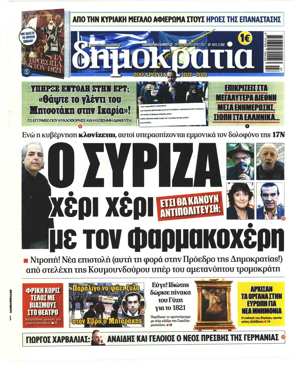 Οι πολιτικές εφημερίδες 9/2/2021 Σήφης Γαρυφαλάκης 06:30, Τρίτη 09 Φεβρουαρίου 2021 Media Διαβάστε τα πρωτοσέλιδα των πολιτικών εφημερίδων… ΕΦΗΜΕΡΙΔΕΣ ΠΟΛΙΤΙΚΕΣ ΕΦΗΜΕΡΙΔΕΣ ΠΡΩΤΟΣΕΛΙΔΑ ΠΡΩΤΟΣΕΛΙΔΑ ΕΦΗΜΕΡΙΔΩΝ Μοιράσου το: σχολίασε κι εσύ (0 σχόλια) Ακολουθήστε το enikos.gr στο Google News και μάθετε πρώτοι όλες τις ειδήσεις Δείτε όλες τις τελευταίες ειδήσεις από την Ελλάδα και τον Κόσμο στο enikos.gr Ειδήσεις Ροή Ειδήσεων 3 ώρες πριν Αυξάνουν την πίεση προς την κυβέρνηση οι αγρότες: Κλείνουν παρακαμπτήριους και ανοίγουν διόδια – Τι θα γίνει τις γιορτές 2 ώρες πριν ΟΠΕΚΕΠΕ: Προφυλακιστέος ο φερόμενος αρχηγός και ο λογιστής της εγκληματικής οργάνωσης 3 ώρες πριν Φοινικούντα: Το Σάββατο απολογείται ο 30χρονος γιος γνωστού επιχειρηματία της Πλάκας που παραδόθηκε – Όσα είπε στους αστυνομικούς και ο ρόλος του στο έγκλημα 2 ώρες πριν Μπορεί ο Μαδούρο να αντέξει τον αποκλεισμό του Τραμπ; Τι θα χρειαστεί η Ουάσινγκτον για να τον ανατρέψει 4 ώρες πριν Πρίγκιπας Ουίλιαμ – Κέιτ: Η νέα οικογενειακή φωτογραφία για τις Χριστουγεννιάτικες κάρτες του 2025 3 ώρες πριν Ύπνος: Η απλή βραδινή ρουτίνα για να προστατεύσετε τα μαλλιά σας από το κρύο κατά τη διάρκεια του χειμώνα 4 ώρες πριν Manifesting: Πώς να συναντήσετε τον σύντροφο της ζωής σας, ανάλογα με τον μήνα γέννησής σας 2 ημέρες πριν 20 χρόνια τα Χριστούγεννα ξεκινούν στα Public με μεγάλη ποικιλία σε δώρα! 2 ώρες πριν Αρχαιολόγοι ανακάλυψαν ρωμαϊκά τεχνουργήματα από μια πόλη που δεν υπήρξε ποτέ – Τα τρία εντυπωσιακά κτίρια και ο αμφορέας με τις… σαρδέλες 22 δευτερόλεπτα πριν Σύνοδος Κορυφής στις Βρυξέλλες: Ακόμη πιο κοντά σε διέξοδο για τη χρηματοδότηση της Ουκρανίας 9 λεπτά πριν ΟΗΕ: Iστορική επίσκεψη του Συμβουλίου Ασφαλείας στη Δαμασκό – Mήνυμα Ελλάδας για συμπερίληψη και λογοδοσία 16 λεπτά πριν Νέος πρέσβης της Μεγάλης Βρετανίας στις ΗΠΑ ο Κρίστιαν Τέρνερ 19 λεπτά πριν Conference League: Με Νόα, Ντρίτα, Άλκμααρ ή Τσέλιε στους «16» η ΑΕΚ 28 λεπτά πριν Conference League: Απευθείας στους «16» η ΑΕΚ Λάρνακας και η Ρακόβ των Σβάρνα και Κωνσταντόπουλου – Τα αποτελέσματα και η βαθμολογία, 3η η ΑΕΚ ENIKOS NETWORK Σε περίοδο αυξημένης δραστηριότητας η γρίπη στην Ελλάδα-Μέτρα προστασίας από τον ΕΟΔΥ Σκέφτεστε συνέχεια συζητήσεις που έχετε κάνει; Τι σημαίνει αυτό, σύμφωνα με ειδικό Στεγαστικό: Τι λέει η ΠΟΜΙΔΑ για τα νέα μέτρα που ανακοίνωσε ο Κυριάκος Μητσοτάκης Λαγκάρντ: Αισιόδοξη για την ανάπτυξη της Ευρωζώνης, αβέβαιη για τον πληθωρισμό Χαρτογραφώντας το «σημείο χωρίς επιστροφή»: Για πρώτη φορά αποκαλύπτεται με λεπτομέρεια το ακανθώδες όριο της ατμόσφαιρας τ... Η Google καταργεί τη λειτουργία «dark web report» – Πώς θα μπορούν οι χρήστες να διαγράφουν τα δεδομένα τους περισσότερα 17:45 , Πέμπτη 18 Δεκεμβρίου 2025 ROUK ZOUK: Εορταστικό επεισόδιο με καλεσμένους τους πρωταγωνιστές του «Γιατί ρε πατέρα» Το Σάββατο 20 Δεκεμβρίου στις 21:00, η Ζέτα Μακρυπούλια υποδέχεται εκλεκτούς ηθοποιούς που όλο... 17:20 , Πέμπτη 18 Δεκεμβρίου 2025 Άγιος έρωτας: Η Χριστίνα εξομολογείται στον πατέρα Νικόλαο, απόψε στις 21:00 στον Alpha Η Νότα αποφασίζει να εκδικηθεί τον Πέτρο και τον Στέφανο, για χάρη του Λούη, όμως τα πράγματα ... 16:50 , Πέμπτη 18 Δεκεμβρίου 2025 Να μ’ αγαπάς: Ζωή και Φωτεινή συμφιλιώνονται ως μάνα με κόρη, απόψε στις 20:00 Η ταυτότητα του Άγγελου αποκαλύπτεται στο νέο επεισόδιο της σειράς “Να μ’ αγαπάς... 15:52 , Πέμπτη 18 Δεκεμβρίου 2025 Το Σπίτι Δίπλα Στο Ποτάμι: Το καθηλωτικό τελευταίο επεισόδιο για το 2025 απόψε στι