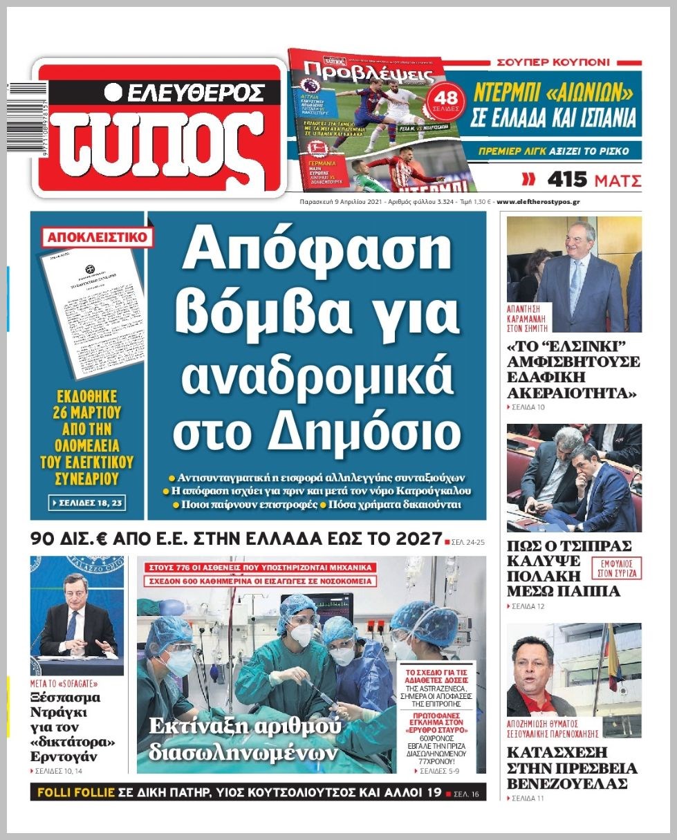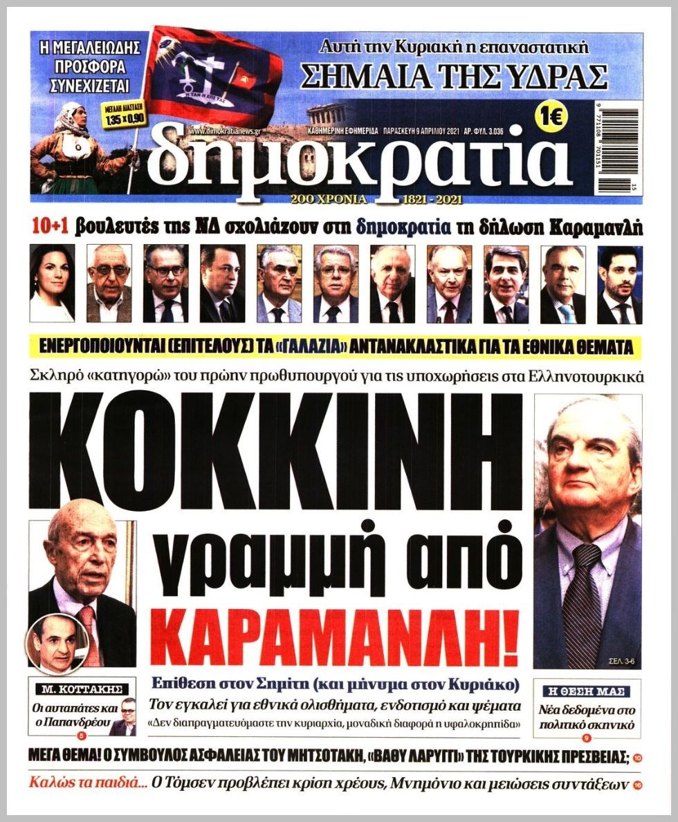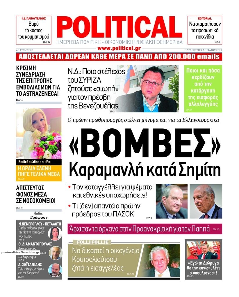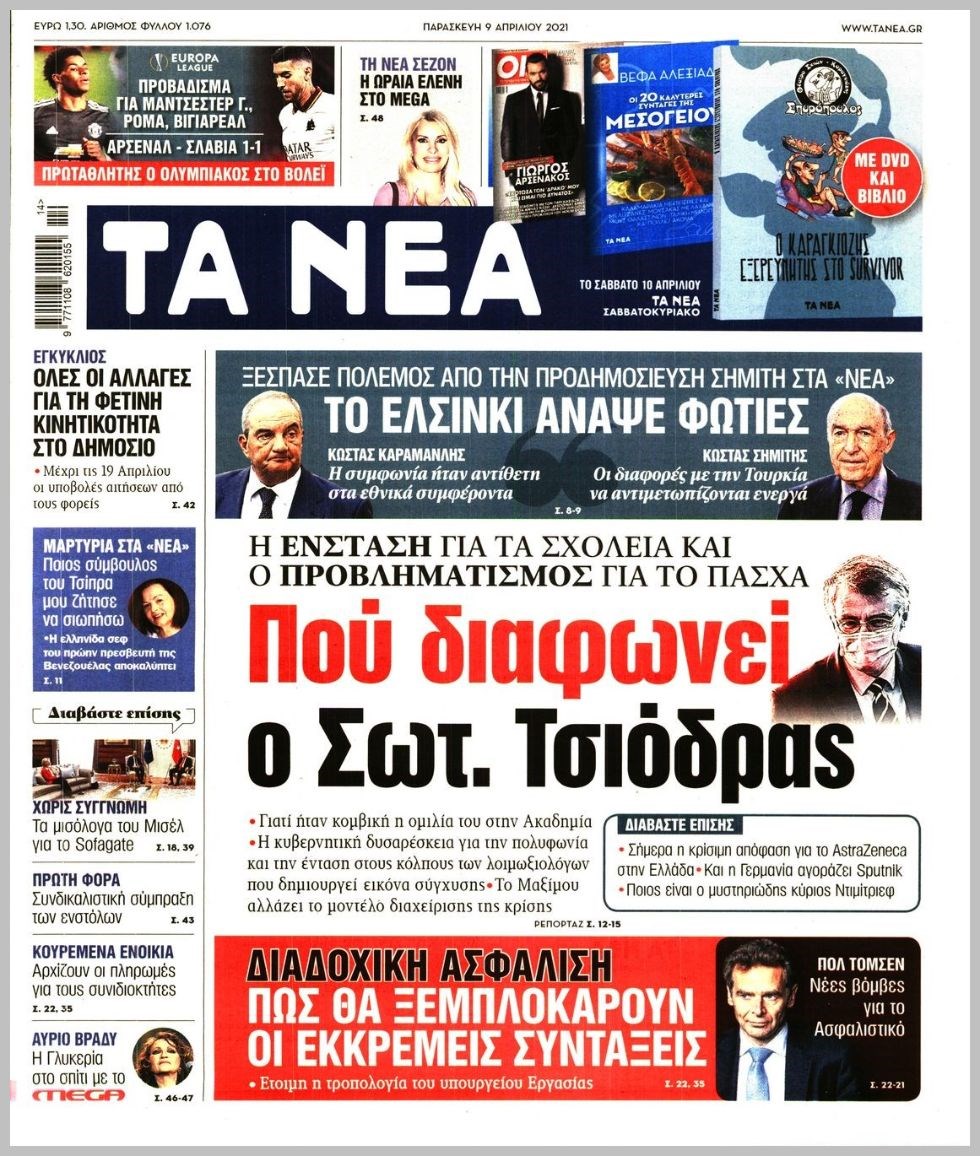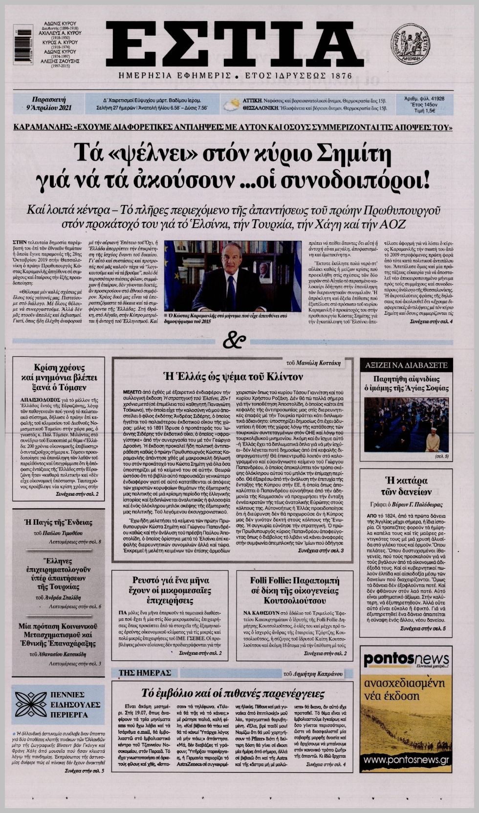 Οι πολιτικές εφημερίδες 9/4/2021 Διονύσης Νίκκας 06:06, Παρασκευή 09 Απριλίου 2021 Media Διαβάστε τα πρωτοσέλιδα των πολιτικών εφημερίδων… ΕΦΗΜΕΡΙΔΕΣ ΠΡΩΤΟΣΕΛΙΔΑ Μοιράσου το: σχολίασε κι εσύ (0 σχόλια) Ακολουθήστε το enikos.gr στο Google News και μάθετε πρώτοι όλες τις ειδήσεις Δείτε όλες τις τελευταίες ειδήσεις από την Ελλάδα και τον Κόσμο στο enikos.gr Ειδήσεις Ροή Ειδήσεων 2 ώρες πριν Γιορτές με μπλόκα για τους αγρότες: Ανοίγουν διόδια και μοιράζουν προϊόντα στους ταξιδιώτες 3 ώρες πριν Τα αρχεία του Έπσταϊν αποκαλύπτουν φωτογραφία του έκπτωτου πρίγκιπα Άντριου – Είναι ξαπλωμένος στην αγκαλιά 5 γυναικών 2 ώρες πριν Νέες ταυτότητες: Μεγάλη αναμονή για ραντεβού στην Αττική – Τέλος τα ταξίδια εκτός Ελλάδος από τον Αύγουστο για όσους δεν έχουν αλλάξει 3 ώρες πριν Εξαφάνιση 33χρονου γιατρού στην Κρήτη: «Άναψα τα φώτα, τρόμαξε και άρχισε να τρέχει στα χωράφια» – Η τελευταία διαδρομή και η μαρτυρία «κλειδί» 51 λεπτά πριν Ινδία: Επτά ελέφαντες σκοτώθηκαν κατά τη σύγκρουση επιβατικού τρένου με κοπάδι 3 ώρες πριν Μία νέα «χρυσή» περίοδος αρχίζει για 3 ζώδια από σήμερα – «Μία αναπάντεχη ευκαιρία οδηγεί στην επιτυχία» 5 ώρες πριν Αρχαιολόγοι ανακάλυψαν σε χωράφι απεικόνιση 600 ετών ενός Αγίου – Τα στοιχεία που δείχνουν ότι μαρτύρησε 4 ώρες πριν Αγχώνεται για το χριστουγεννιάτικο δώρο που πήρε στην πλούσια σύντροφό του – «Φοβάμαι πως θα το βρει φθηνιάρικο, φοράει βραχιόλια Cartier» 49 λεπτά πριν Διαιτολόγος αποκαλύπτει 9 πρωινές συνήθειες που «λιώνουν» το κοιλιακό λίπος – «Υποστηρίζουν την υγιεινή απώλεια βάρους» 5 λεπτά πριν Τσιάρας για αγρότες: Ικανοποιείται το αίτημα για αφορολόγητο πετρέλαιο στη μάνικα, πρόθεσή μας να μειωθεί ακόμη περισσότερο η τιμή στο ρεύμα 12 λεπτά πριν Η Ζιζέλ Μπούντχεν παντρεύτηκε τον δάσκαλο ζίου-ζίτσου, Χοακίμ Βαλέντε 19 λεπτά πριν Αρχεία Έπσταϊν: Οι συγκλονιστικές φωτογραφίες – Ο Μάικλ Τζάκσον, ο Μικ Τζάγκερ και ο Κέβιν Σπέισι ανάμεσα στους διάσημους που απεικονίζονται 28 λεπτά πριν Χρήστος Μάντακας: «Θα μπορούσα να είχα φύγει από τη ζωή, δεν μπορούσα να περπατήσω…» 35 λεπτά πριν Εντυπωσιακό βίντεο από «τσουνάμι» πάγου στη Σιβηρία – Πώς προκαλείται το σπάνιο φαινόμενο ENIKOS NETWORK Είστε μόνιμα απρόσεκτοι; 3 σημάδια που δείχνουν ότι μπορεί να είναι σύμπτωμα πάθησης Πόσα κιλά παίρνουμε πραγματικά τα Χριστούγεννα, σύμφωνα με την επιστήμη – Πώς να το αποτρέψουμε; Χρήστος Δήμας: Στα 2,5 εκατ. ευρώ την ημέρα το κόστος από το άνοιγμα των διοδίων από τους αγρότες – Θα αξιώσουν αποζημίωση ... Χριστούγεννα και Πρωτοχρονιά: Πώς αμείβονται όσοι εργαστούν Χαρτογραφώντας το «σημείο χωρίς επιστροφή»: Για πρώτη φορά αποκαλύπτεται με λεπτομέρεια το ακανθώδες όριο της ατμόσφαιρας τ... Η Google καταργεί τη λειτουργία «dark web report» – Πώς θα μπορούν οι χρήστες να διαγράφουν τα δεδομένα τους περισσότερα 11:41 , Σάββατο 20 Δεκεμβρίου 2025 «Η αγάπη δεν χάνεται ποτέ»: Η μικρού μήκους ταινία κινουμένων σχεδίων που θέτει ερωτήματα για τη ζωή και τον θάνατο Ο θάνατος είναι ένα από τα πιο σκληρά θέματα που καλείται να διαχειριστεί κάποιος στη διάρκεια... 09:30 , Σάββατο 20 Δεκεμβρίου 2025 «Porto Leone: Στη γειτονιά με τα κόκκινα φανάρια» – Ο Χρόνης αποκαλύπτει στην Αλεξάνδρα το μυστικό για το παιδί της Λένας Η μεγάλη δραματική σειρά του Apha «Porto Leone: Στη γειτονιά με τα κόκκινα φανάρια» μας μεταφέ... 08:14 , Σάββατο 20 Δεκεμβρίου 2025 Τρομεροί γονείς: Η Μαρία Καβογιάννη εισβάλλει στο σπίτι της οικογένειας Σ